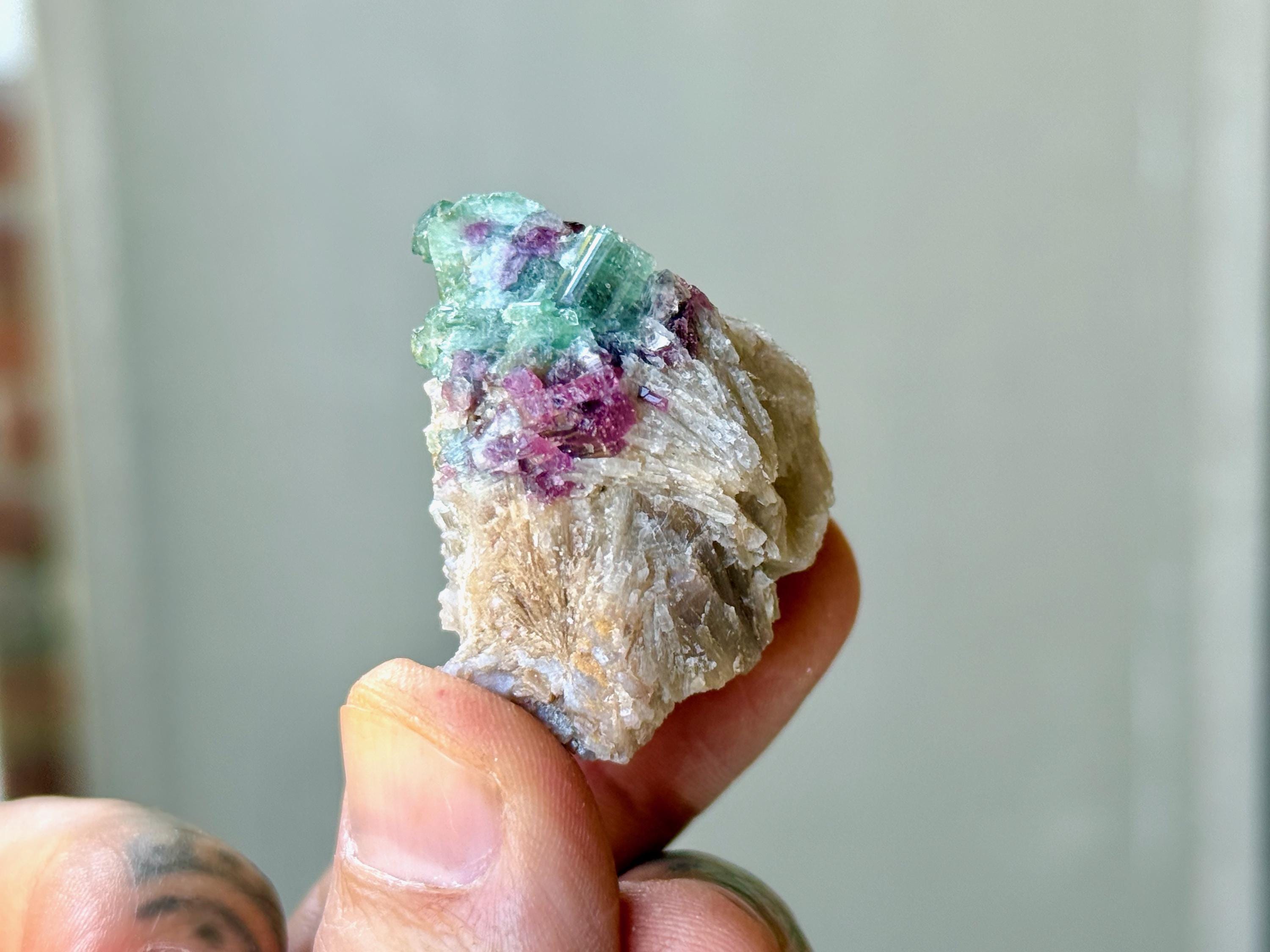 The crystals from this find include unique combinations of Quartz, Lepidolite, Citrine, Cleavelandite, Albite and Feldspar, with vividly colored Tourmalines in lovely hues of green, pink, purple and blue. Crystals with combinations of these minerals are sometimes referred to as "Unicorn Stones."