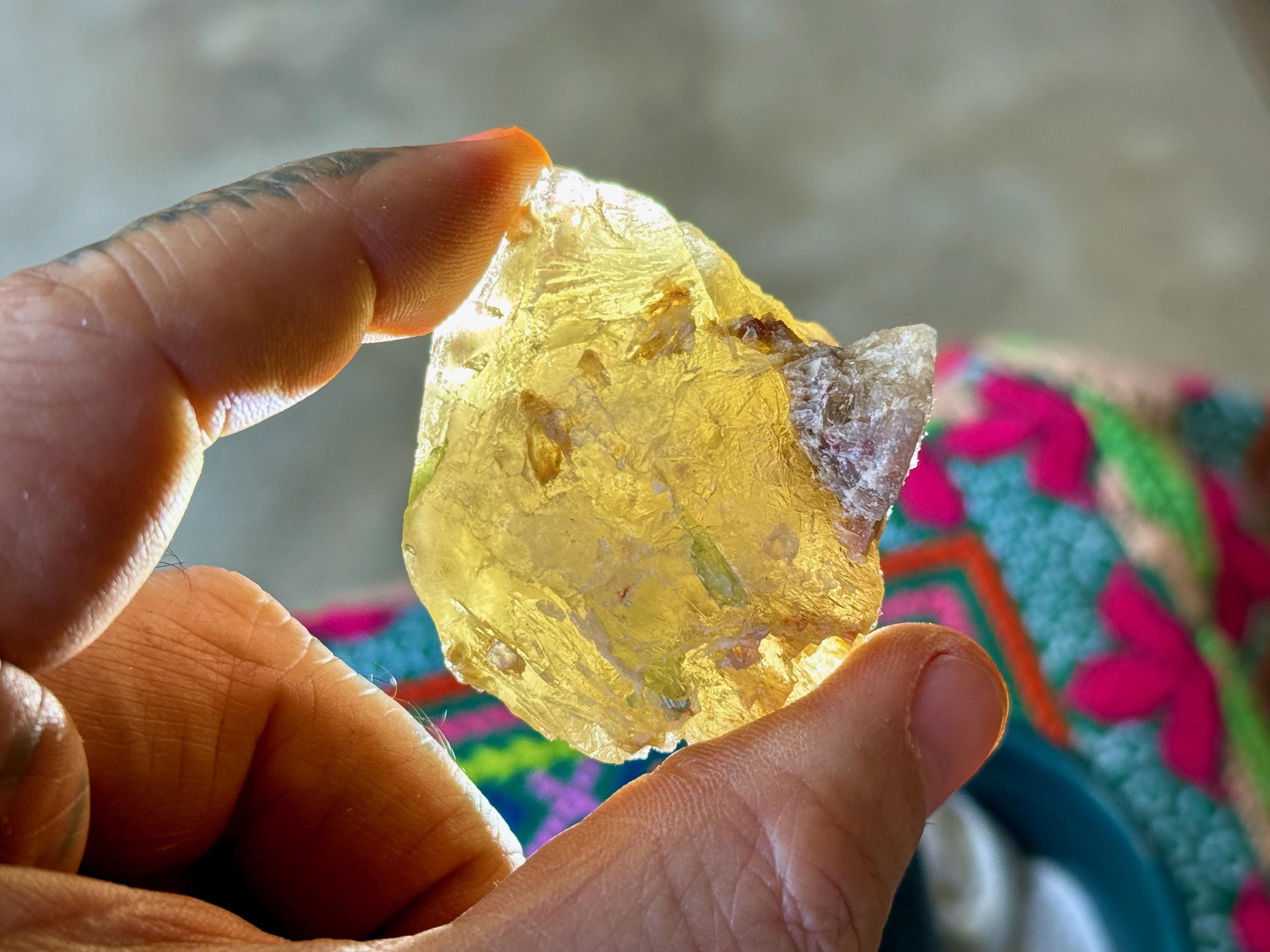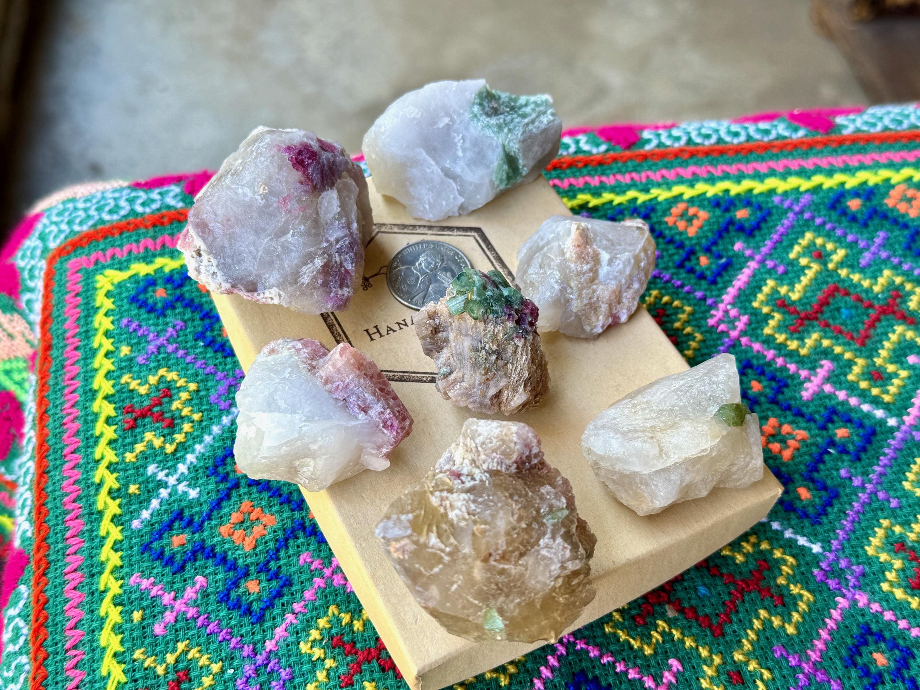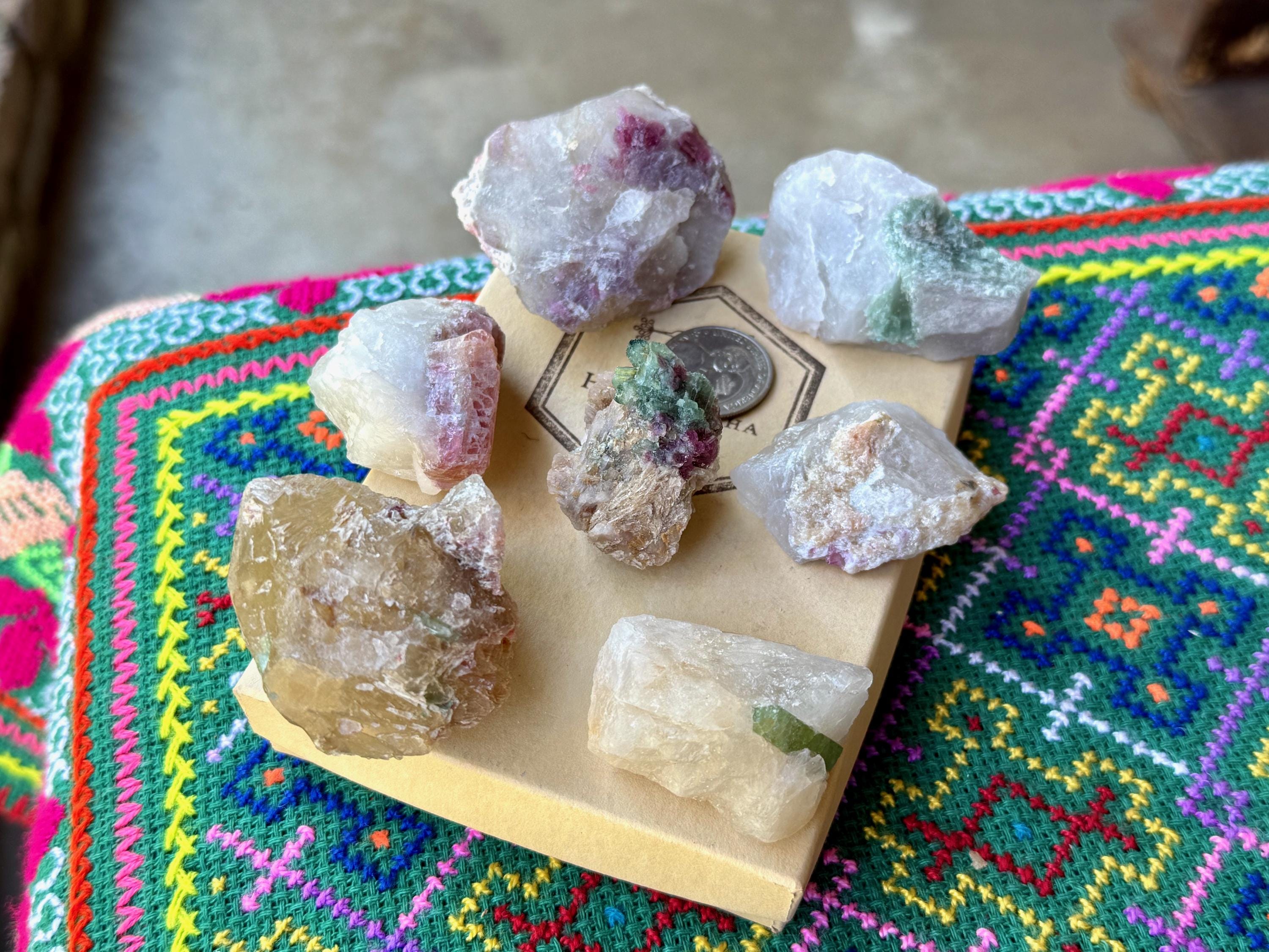 This 7-piece lot of vibrant Unicorn Stone Quartz with Citrine, Pink & Green Tourmaline inclusions comes from the area of Coronel Murta, Minas Gerais, Brazil