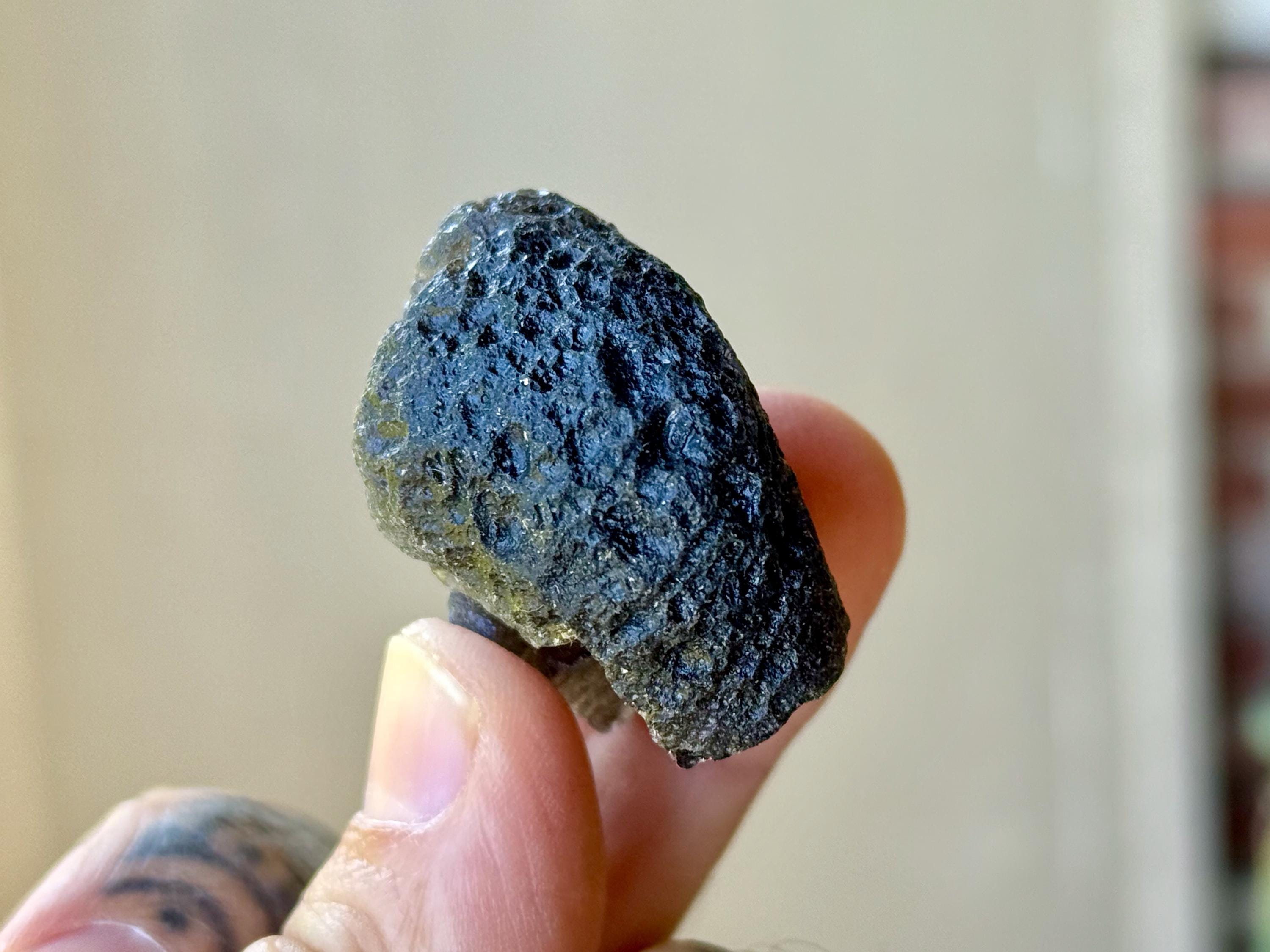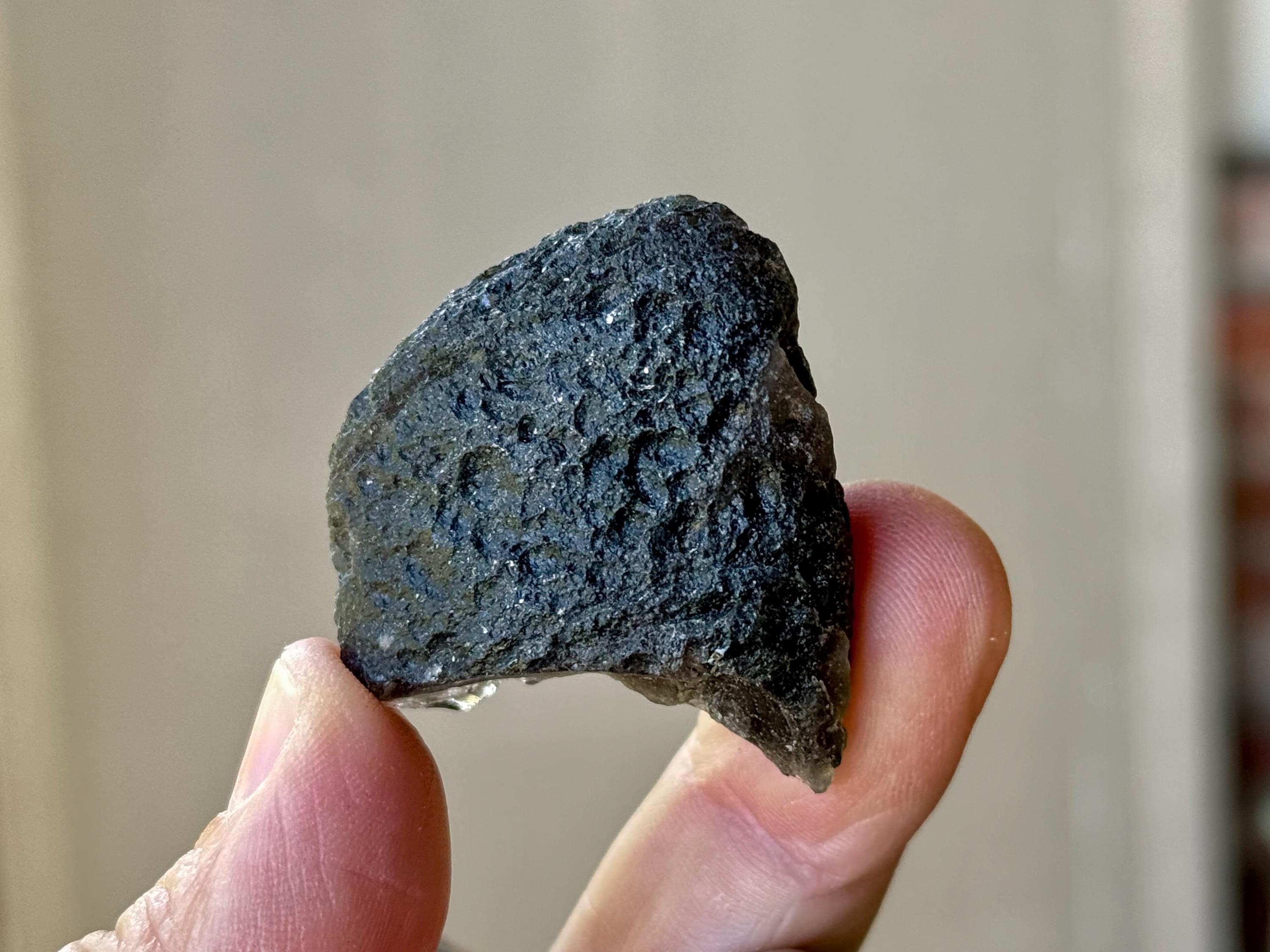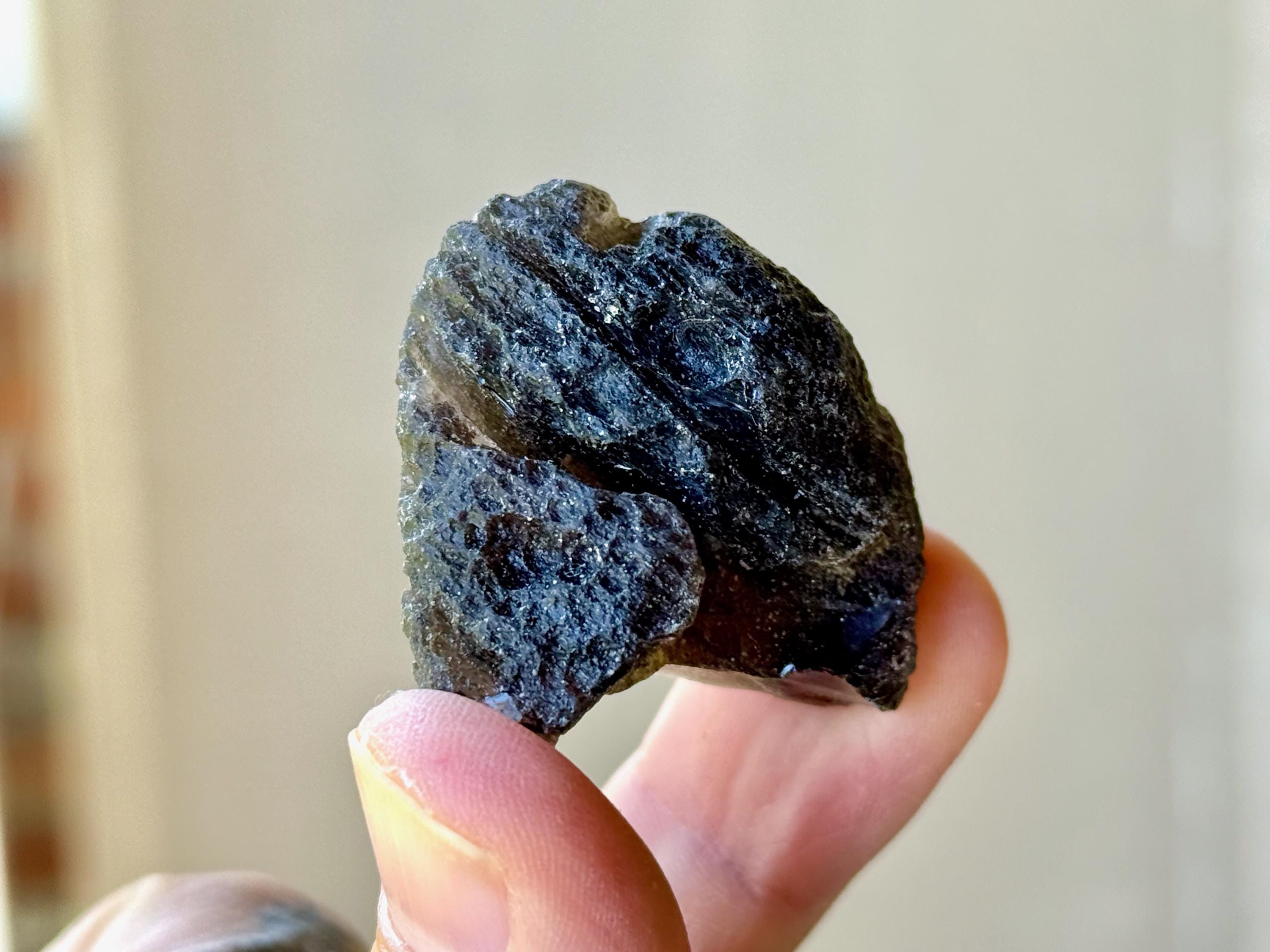 A deep black color and beautiful pitted textures on this natural Agni Manitite stone. When backlit, we can see just how brilliantly it lights up! (Photos 3-6). The base is self-healed and has one minor chip (Photo 8). Beautiful!