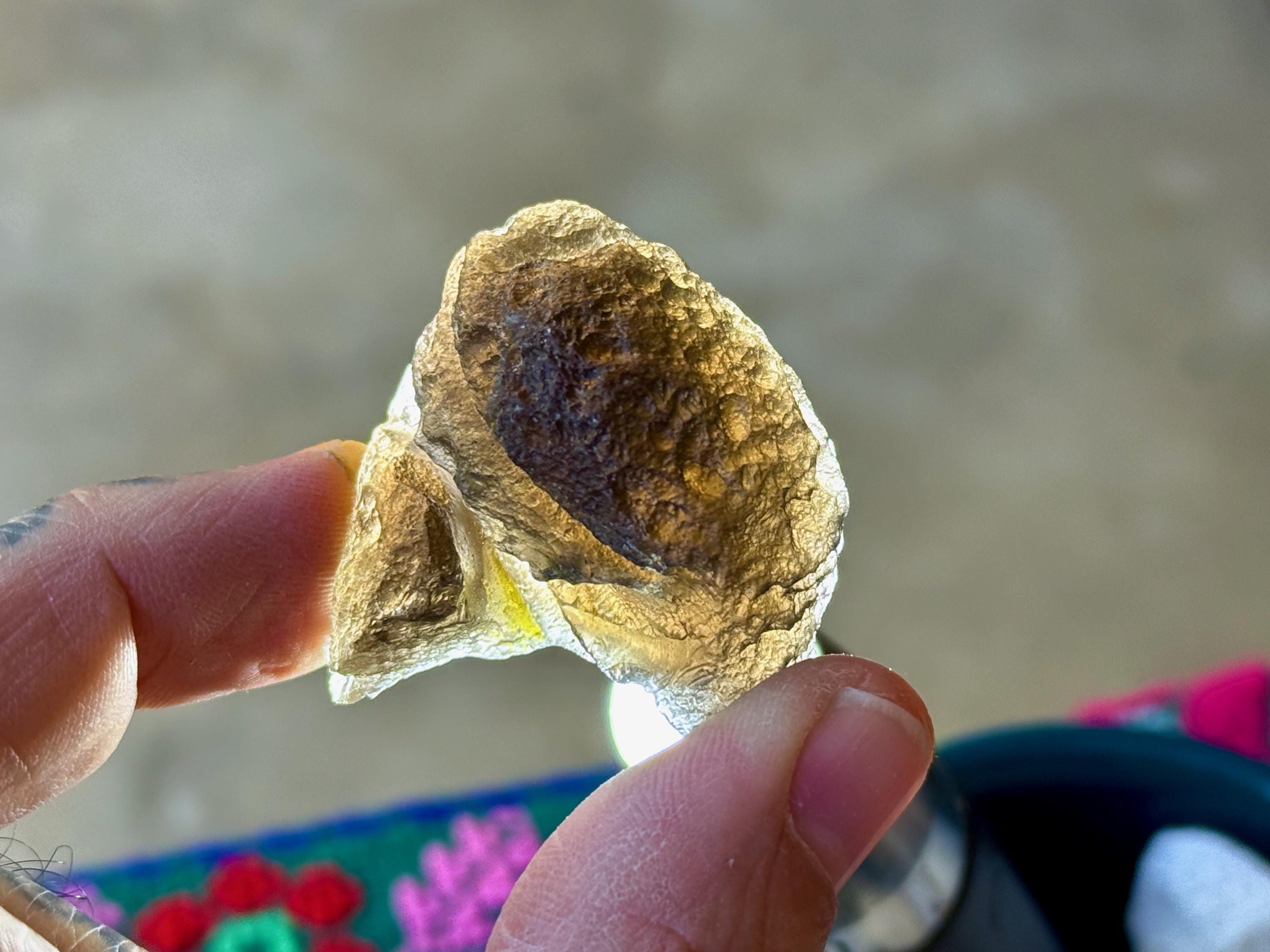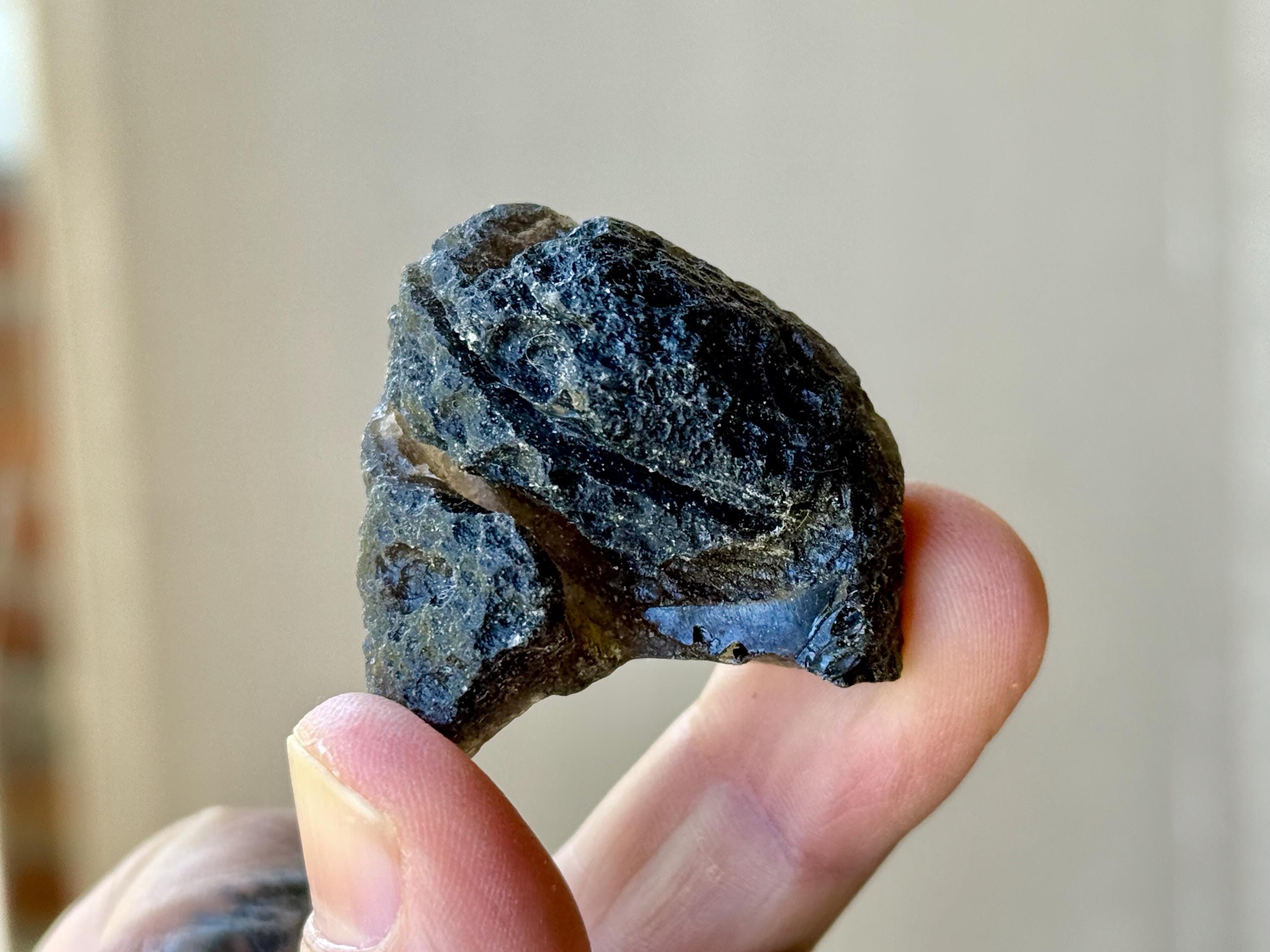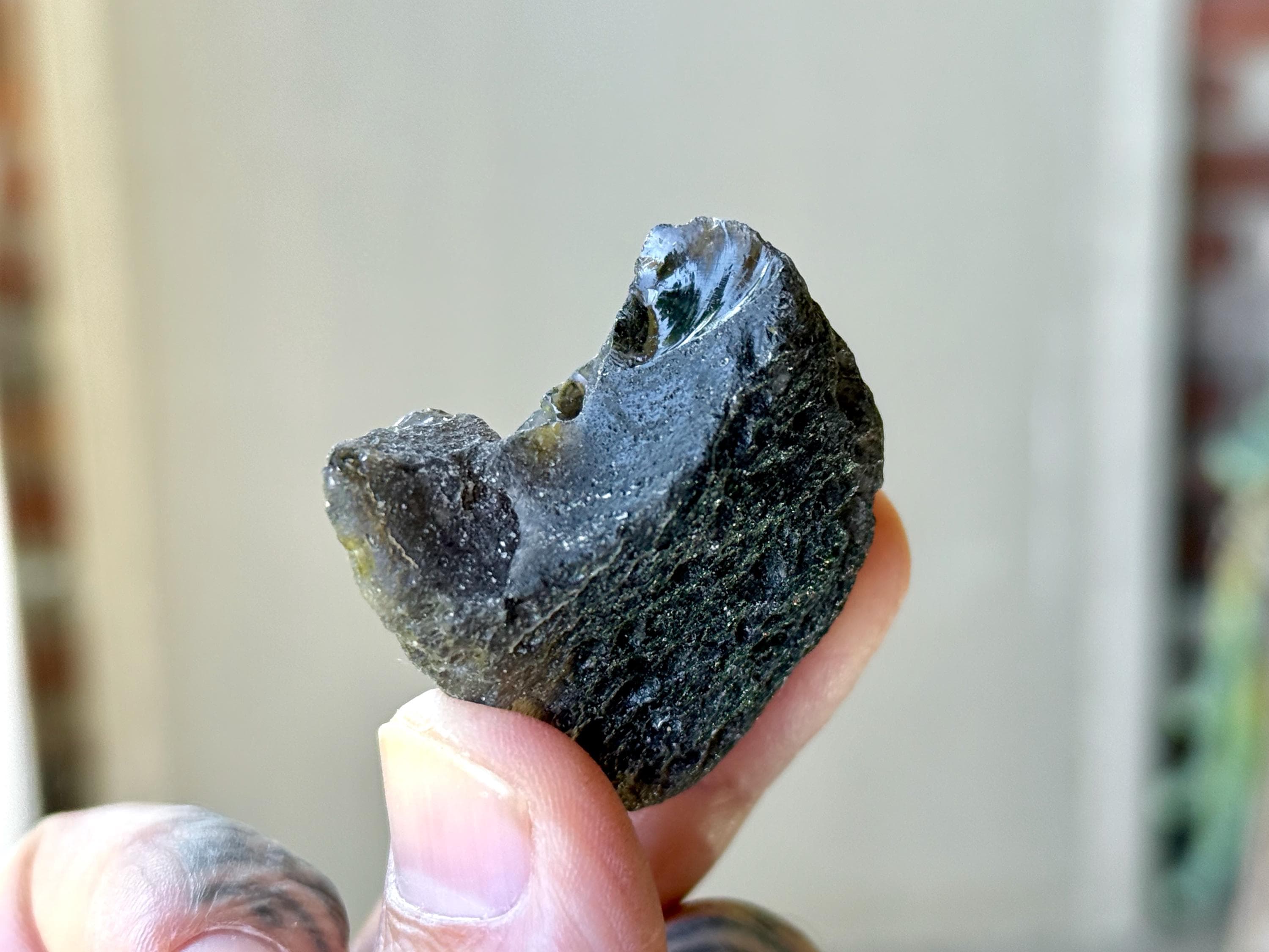 A deep black color and beautiful pitted textures on this natural Agni Manitite stone. When backlit, we can see just how brilliantly it lights up! (Photos 3-6). The base is self-healed and has one minor chip (Photo 8). Beautiful!