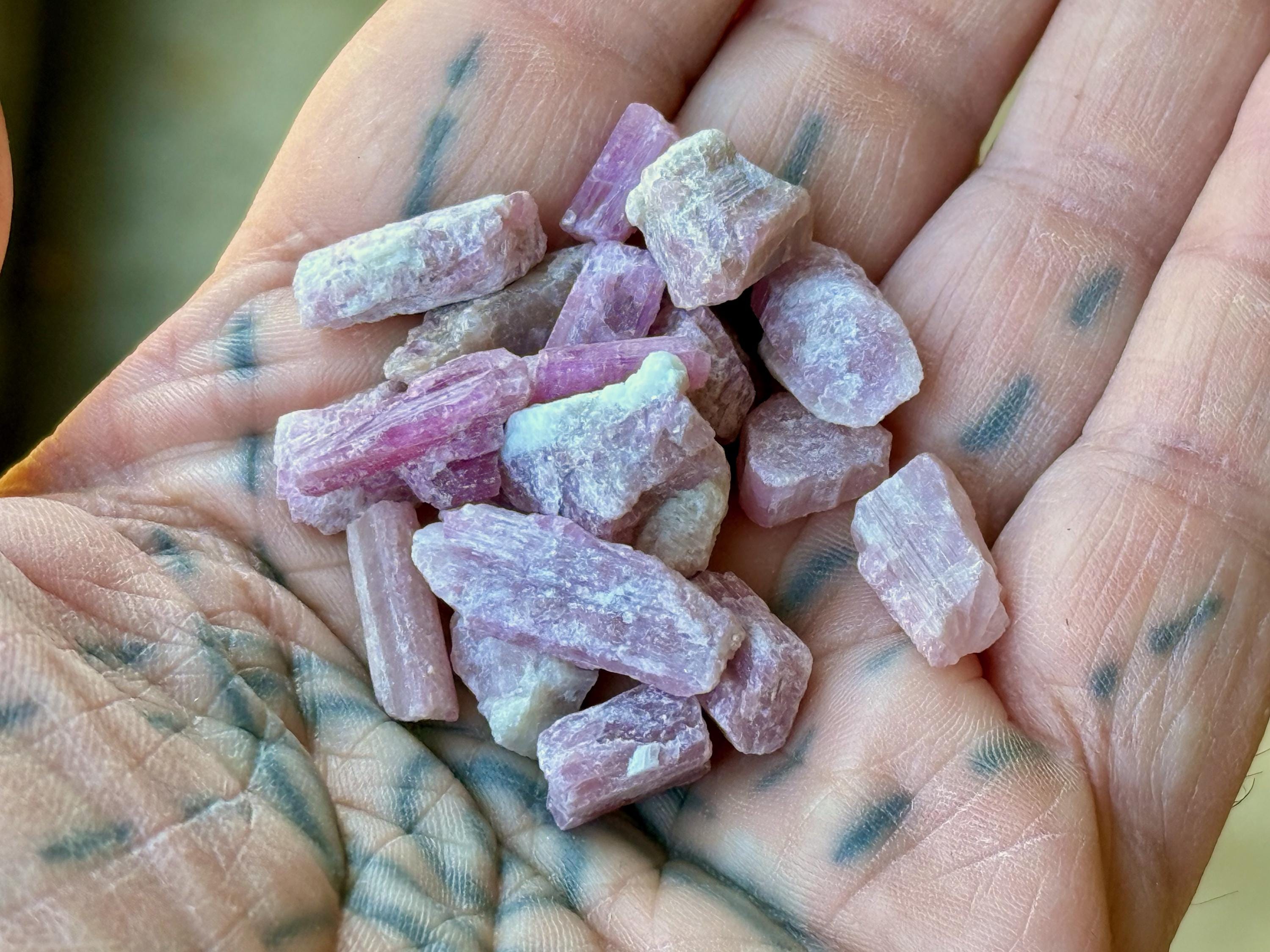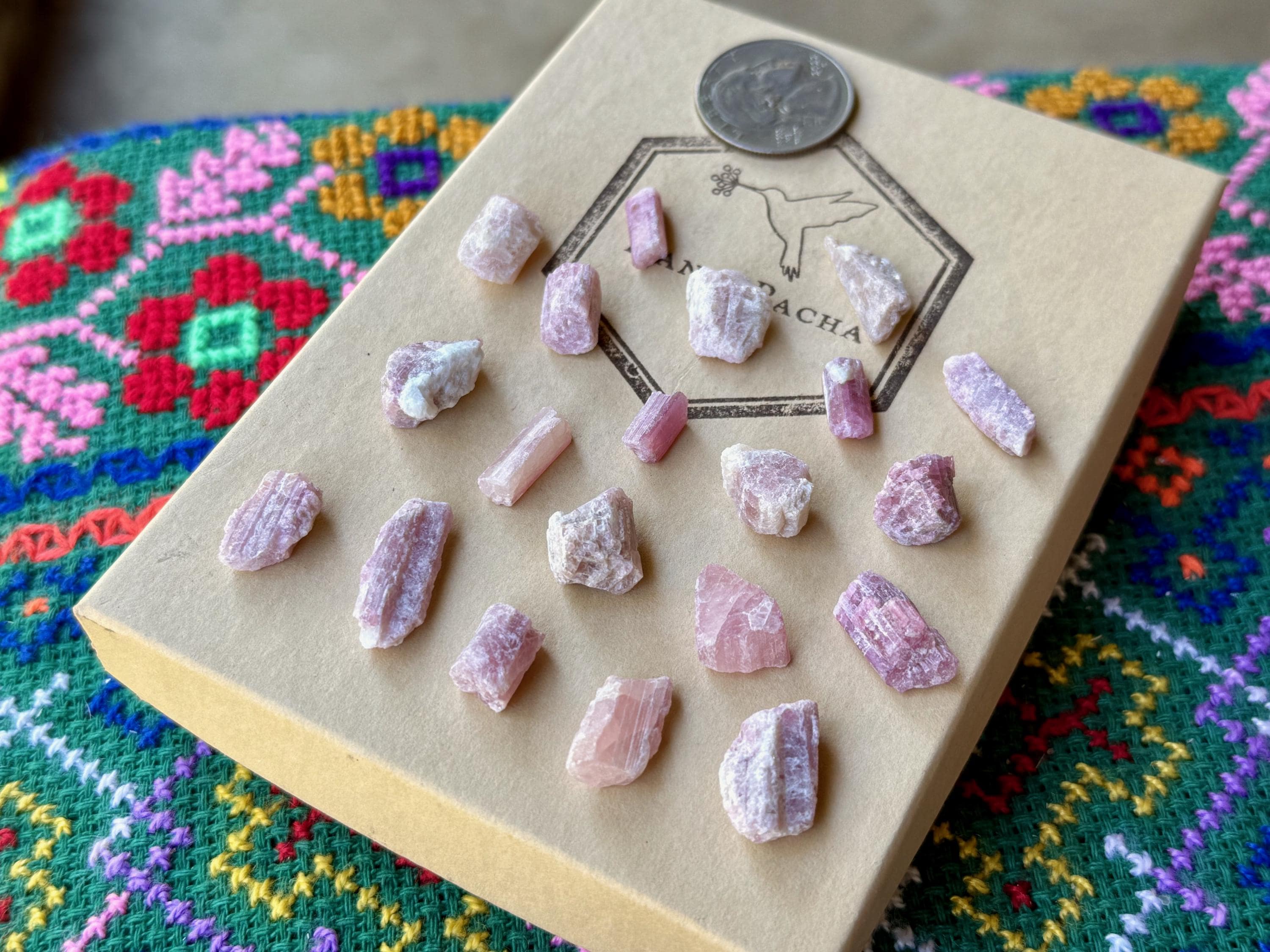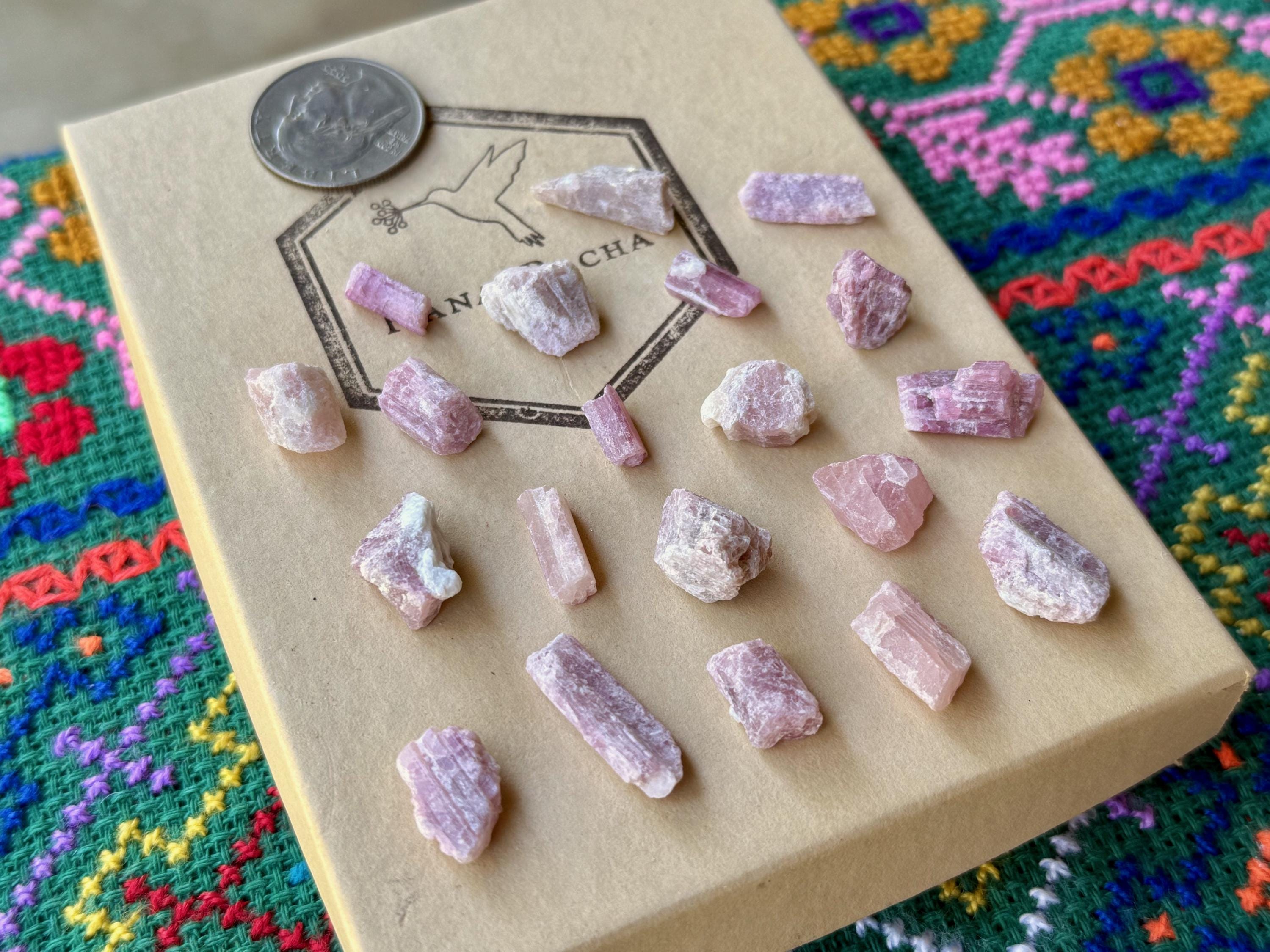 This lot of 20 small Pink Tourmaline crystals comes from a recent find in Aracuai, Minas Gerais, Brazil. Pink Tourmaline is a beautiful Heart Chakra crystal.