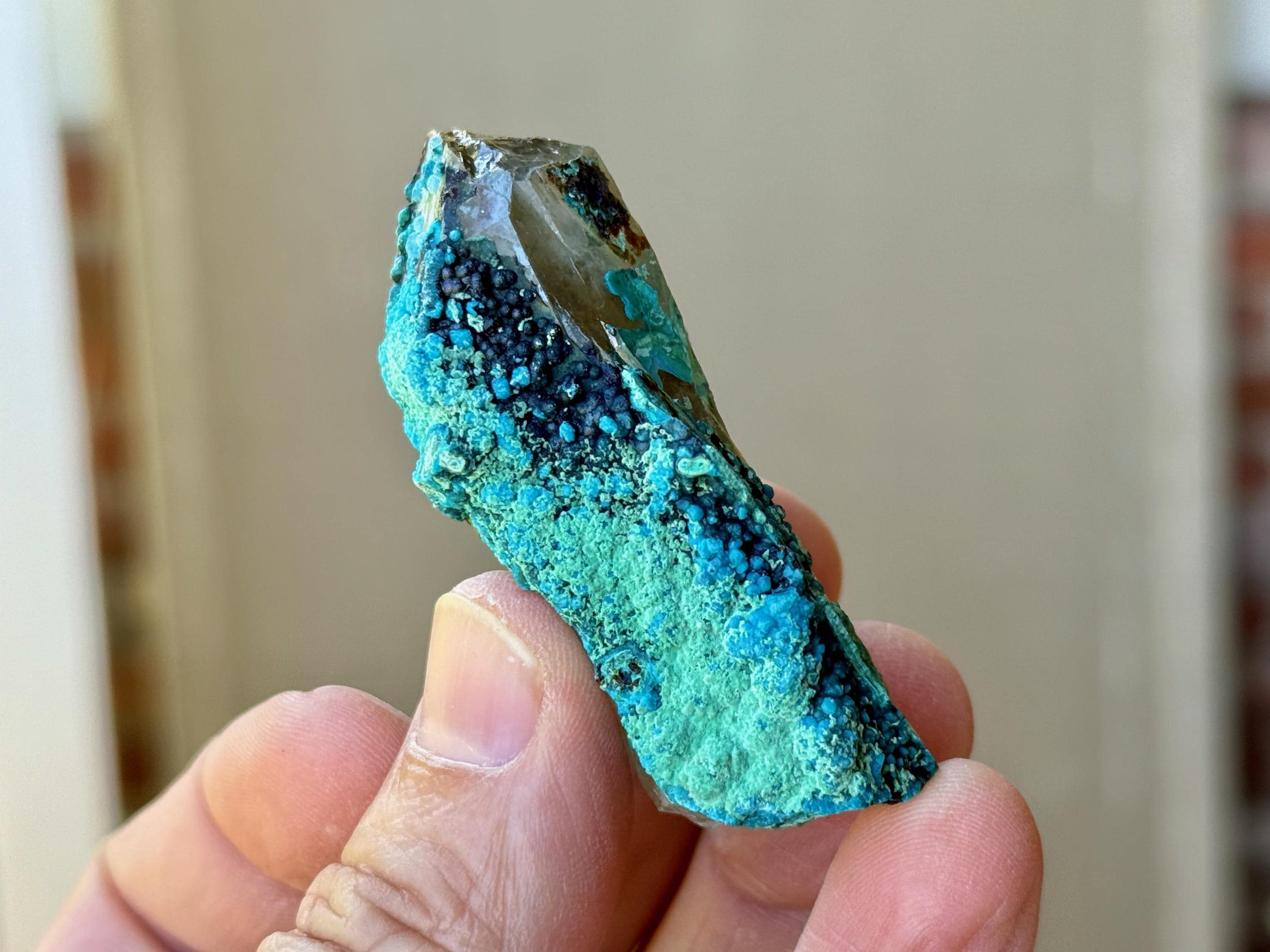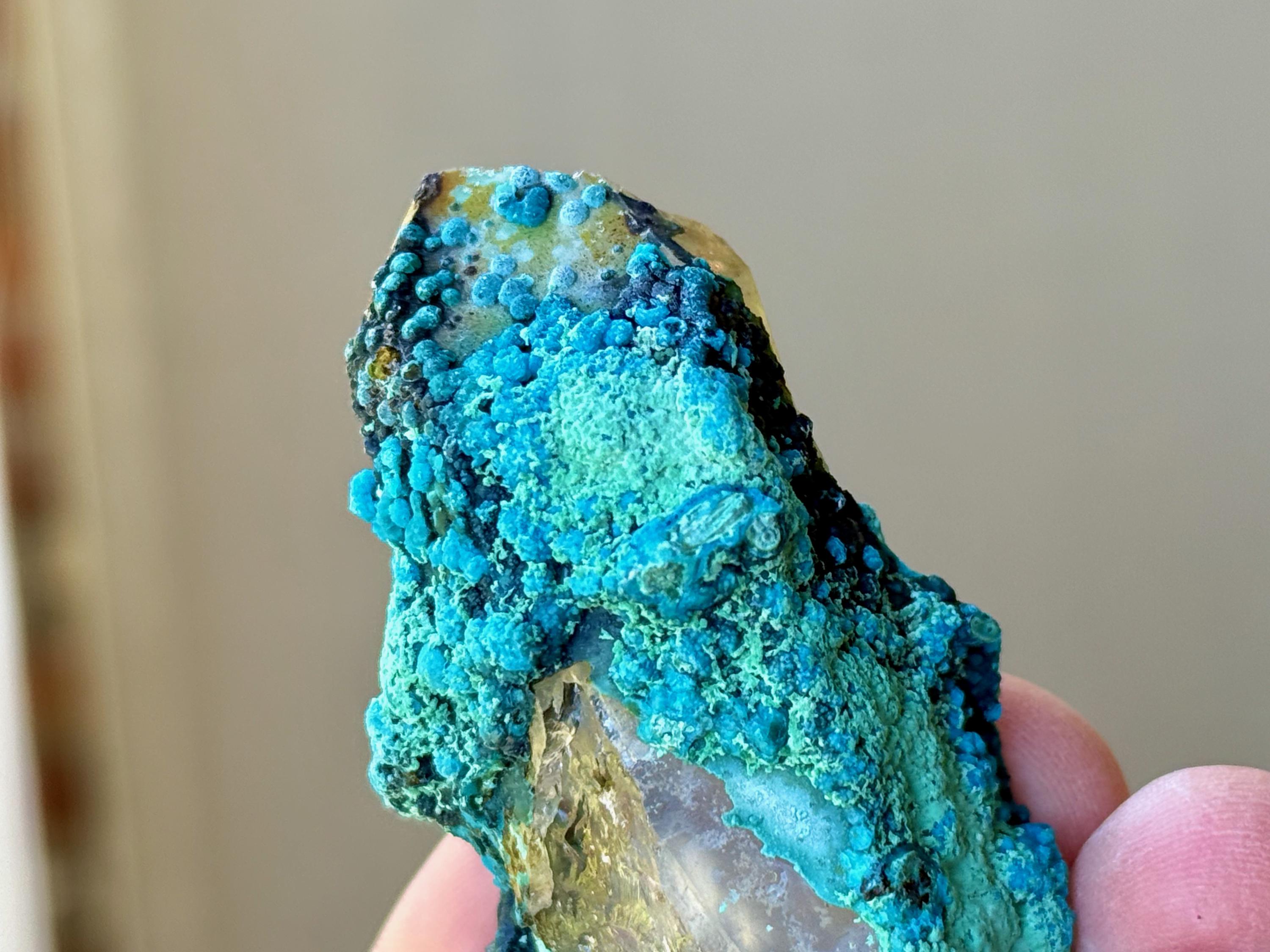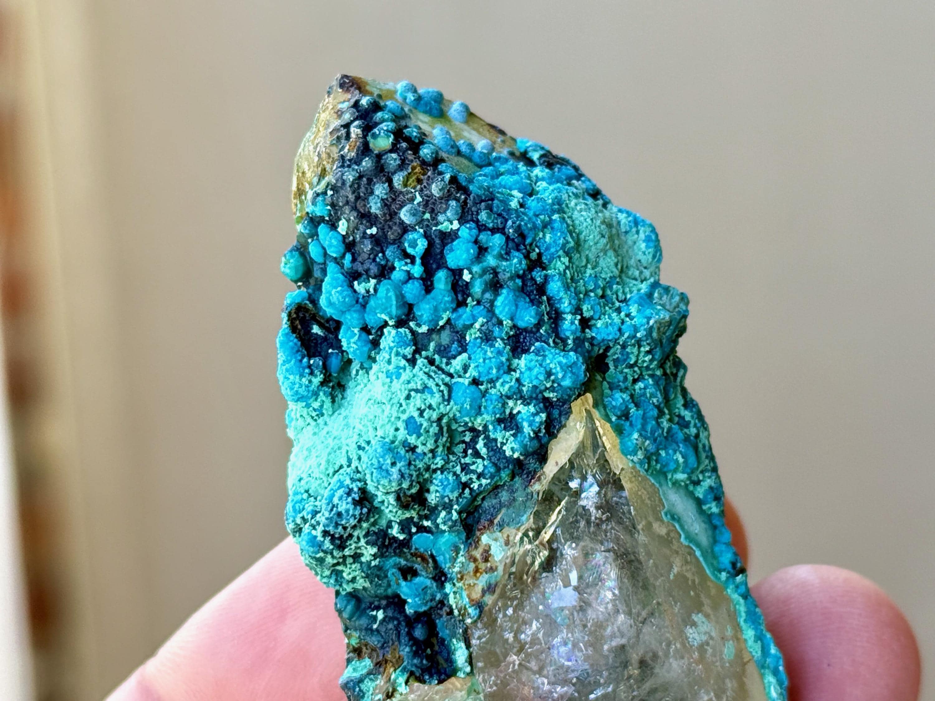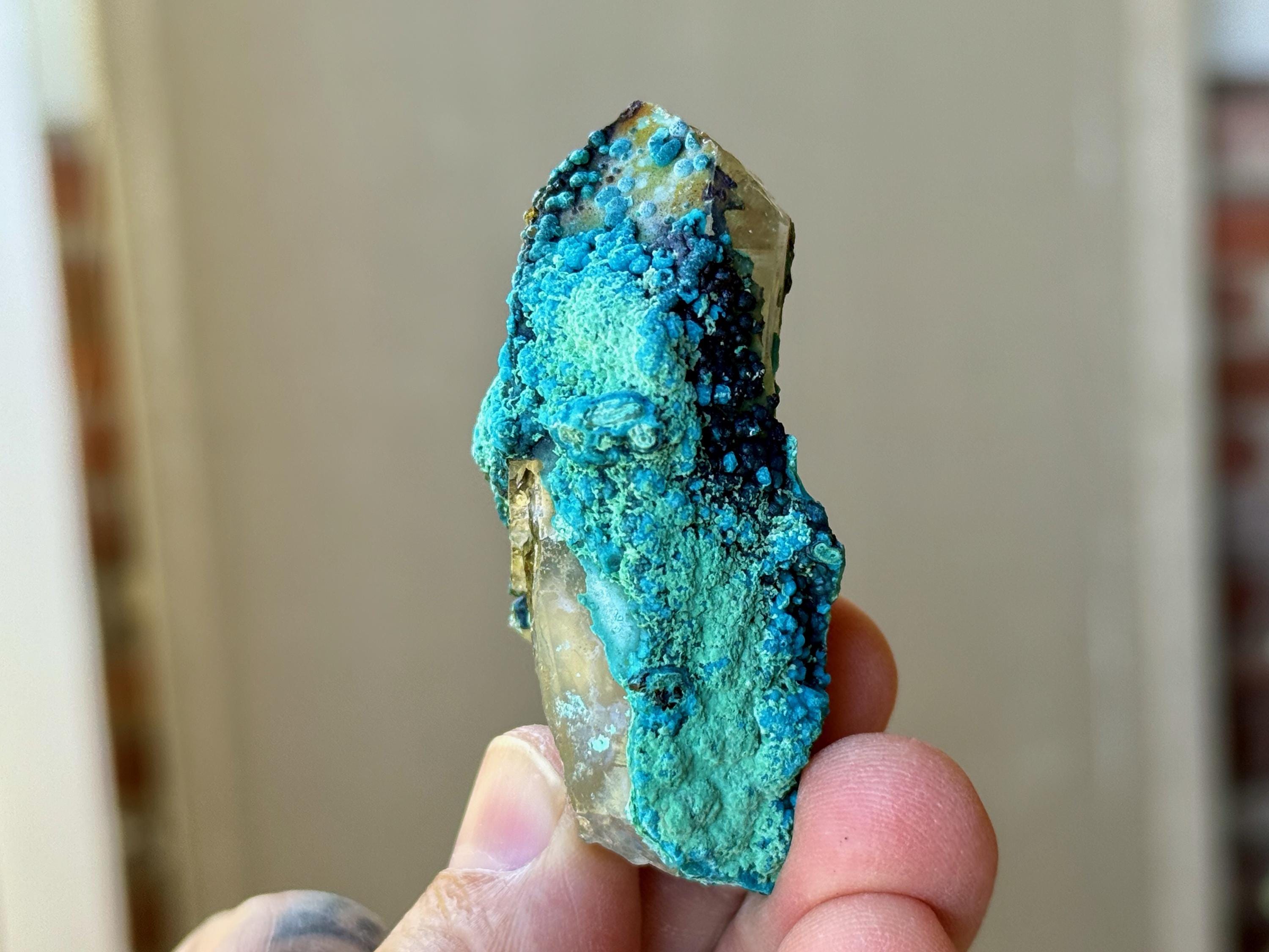 Vibrant teal blue hues to this exquisite Chrysocolla Quartz crystal! This crystal features a fully formed Quartz point with stunning inclusion of Chrysocolla covering its cap, as well as most of its body. We love the tiny, "bubbly" botryoidal forms of the Chrysocolla, as well as the milder seafoam green Malachite that is present here as well.