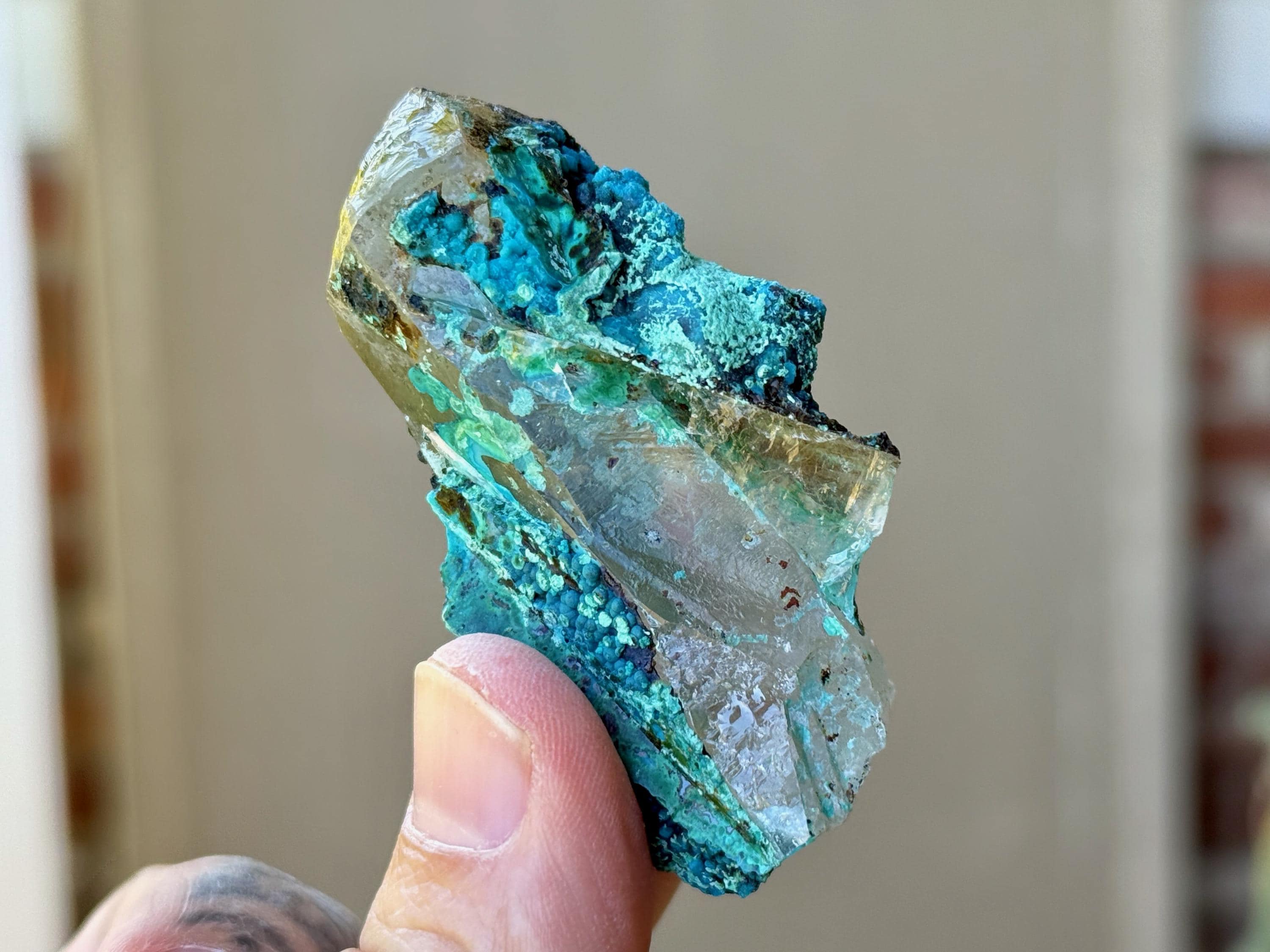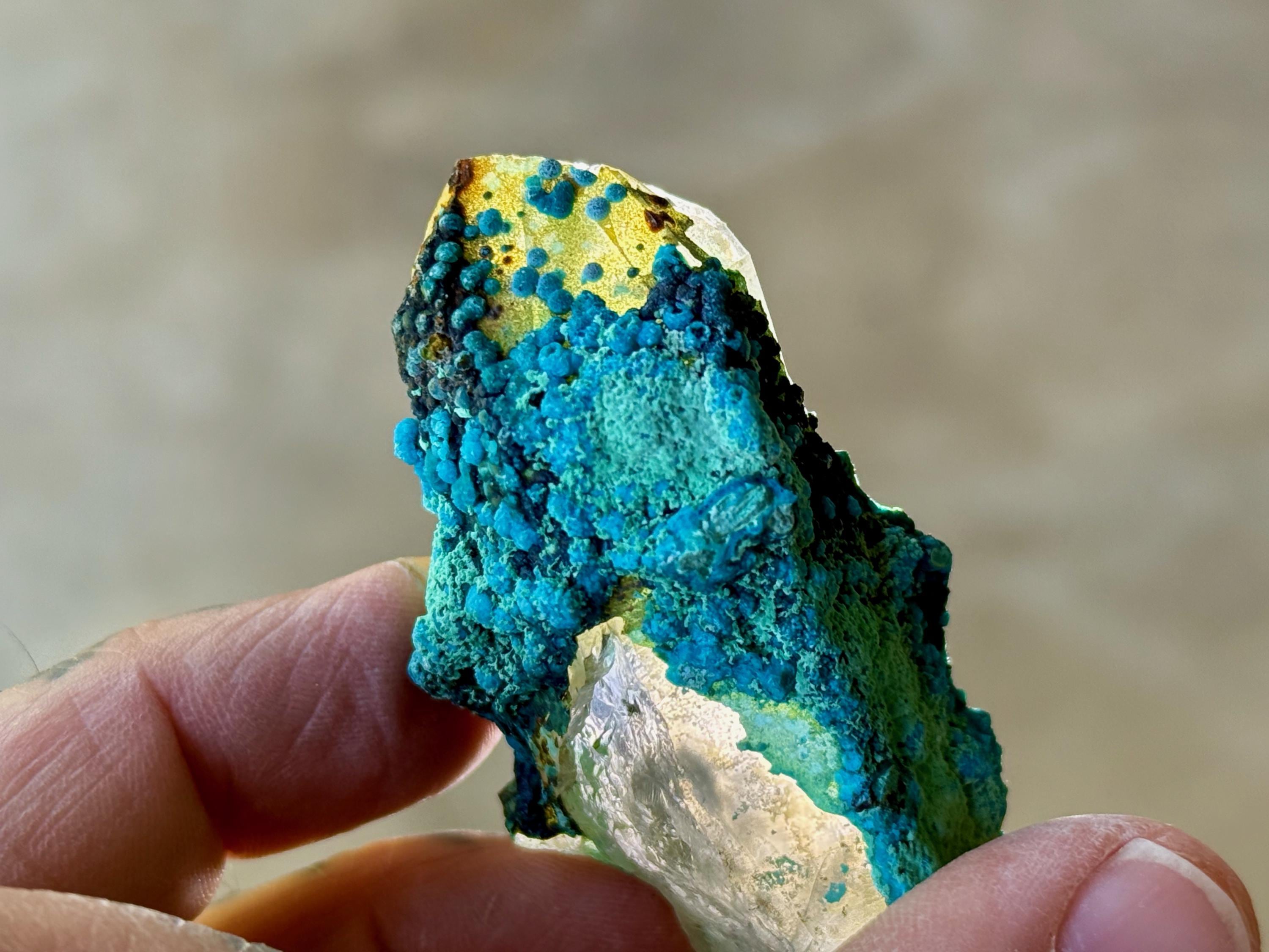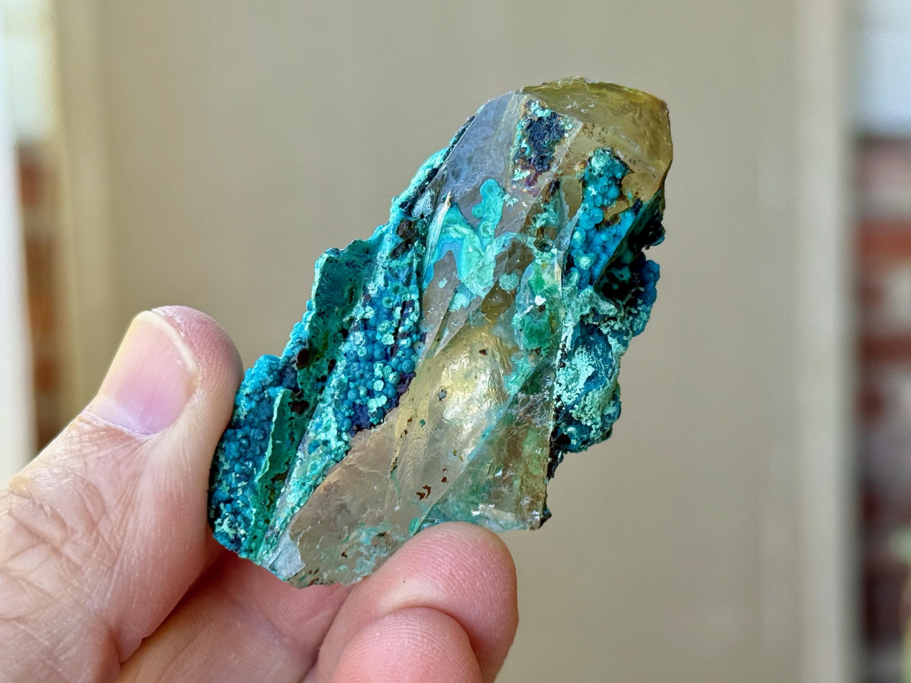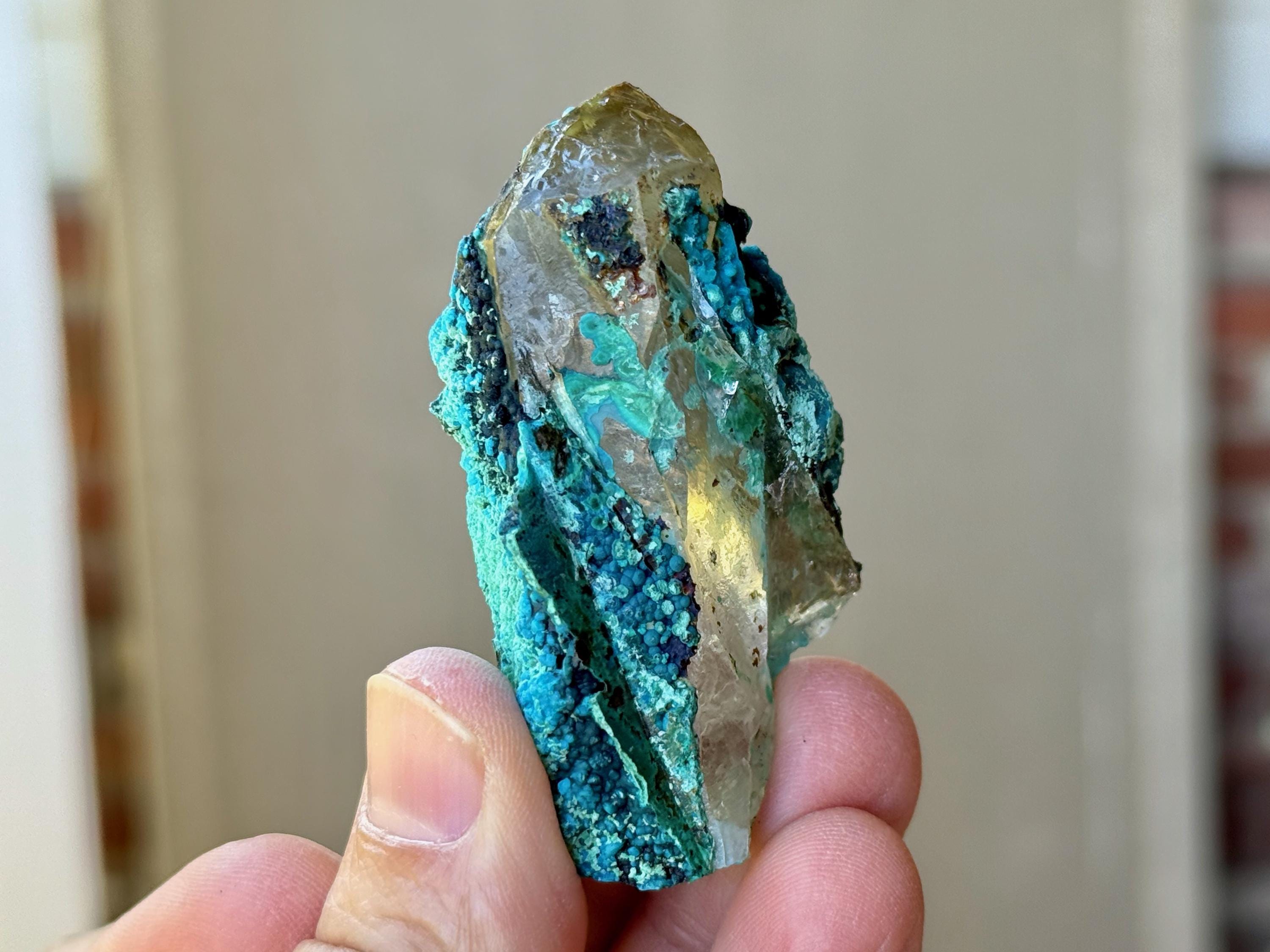 Vibrant teal blue hues to this exquisite Chrysocolla Quartz crystal! This crystal features a fully formed Quartz point with stunning inclusion of Chrysocolla covering its cap, as well as most of its body. We love the tiny, "bubbly" botryoidal forms of the Chrysocolla, as well as the milder seafoam green Malachite that is present here as well.