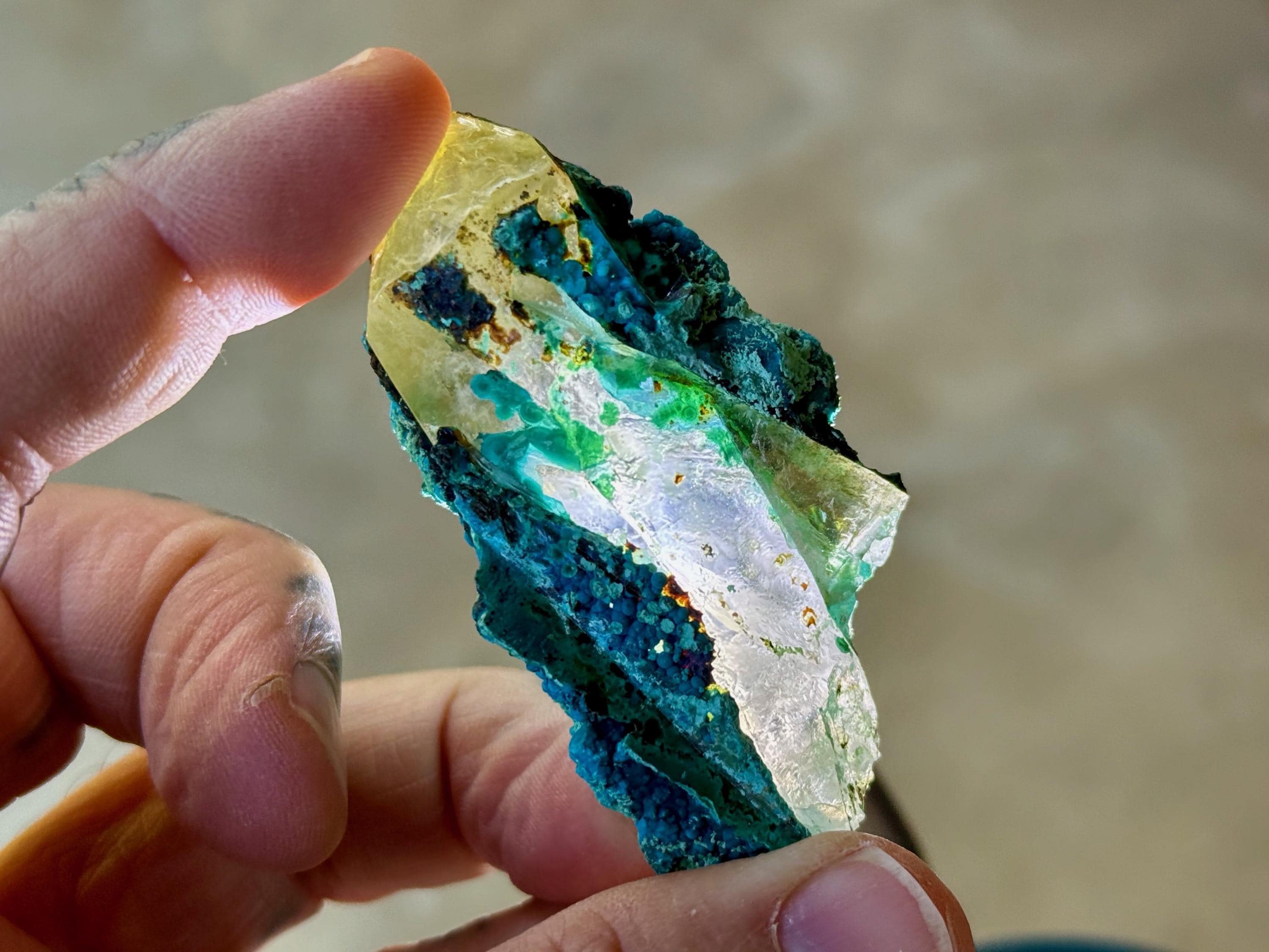 This superb Chrysocolla Quartz comes from a recent find in the famed Tentadora Mine, Tricapo District, Huancavelica, Peru. Chrysocolla is considered to be one of the most powerful communication crystals, encouraging self-expression, empowerment and compassion.