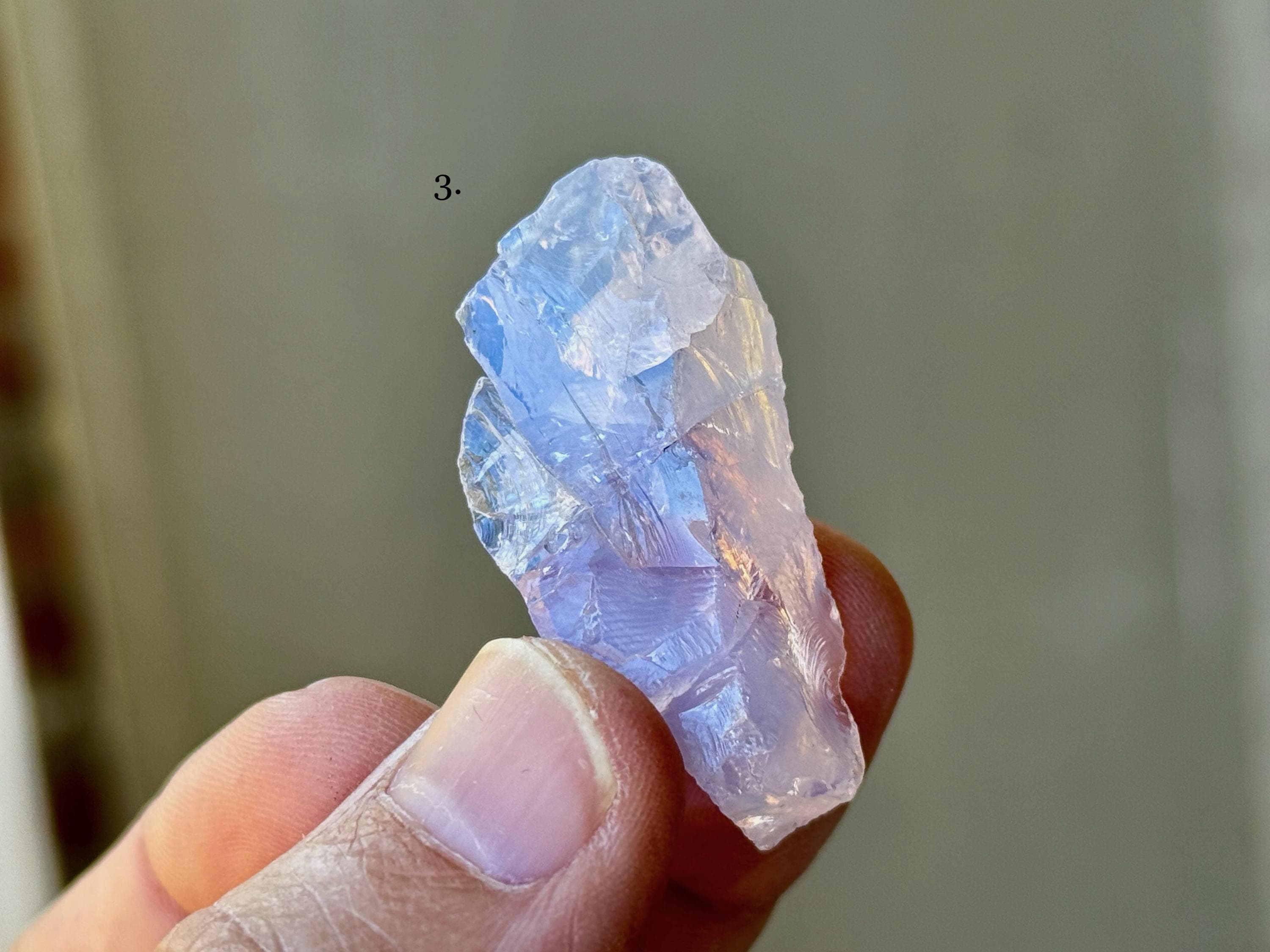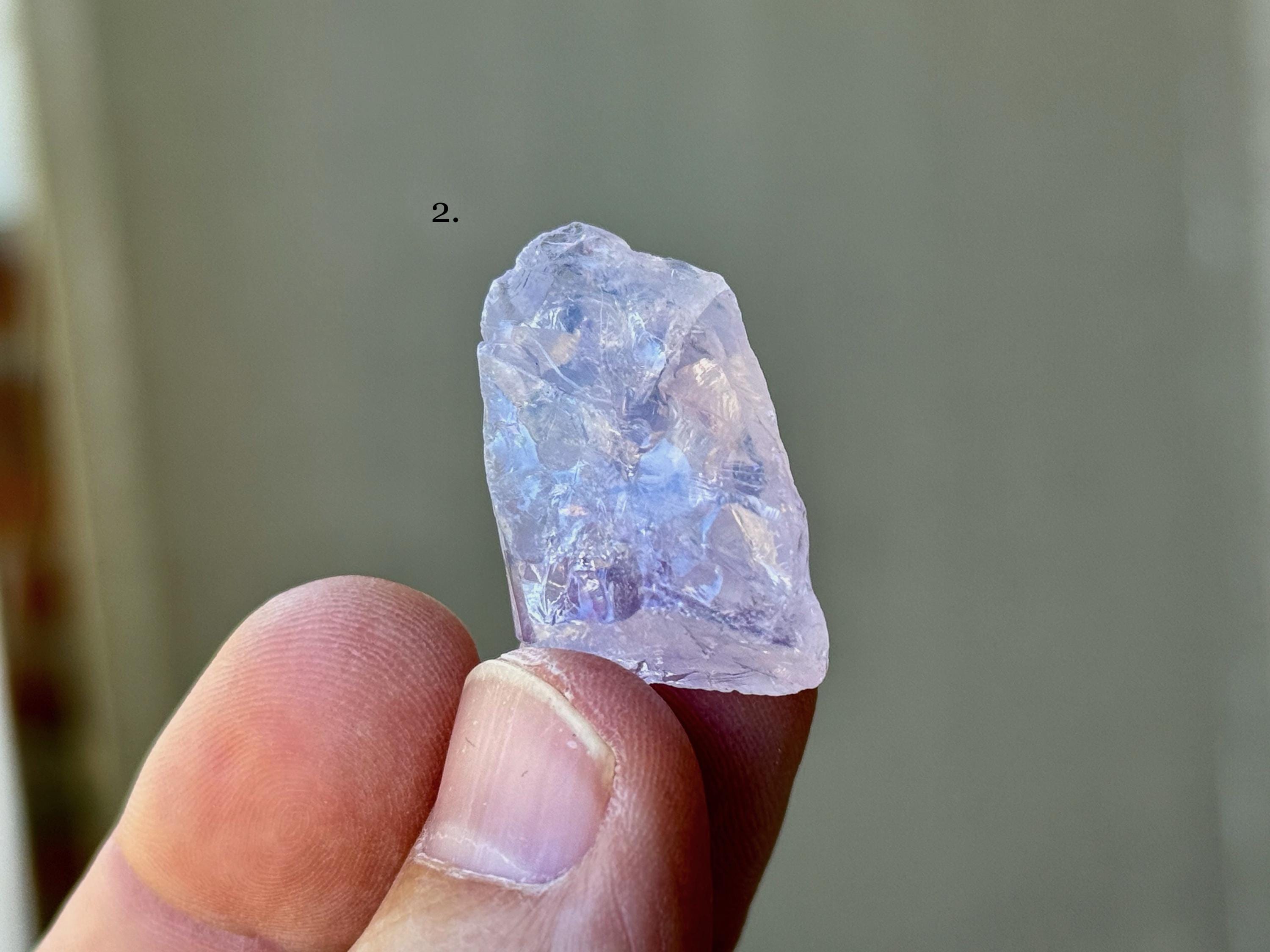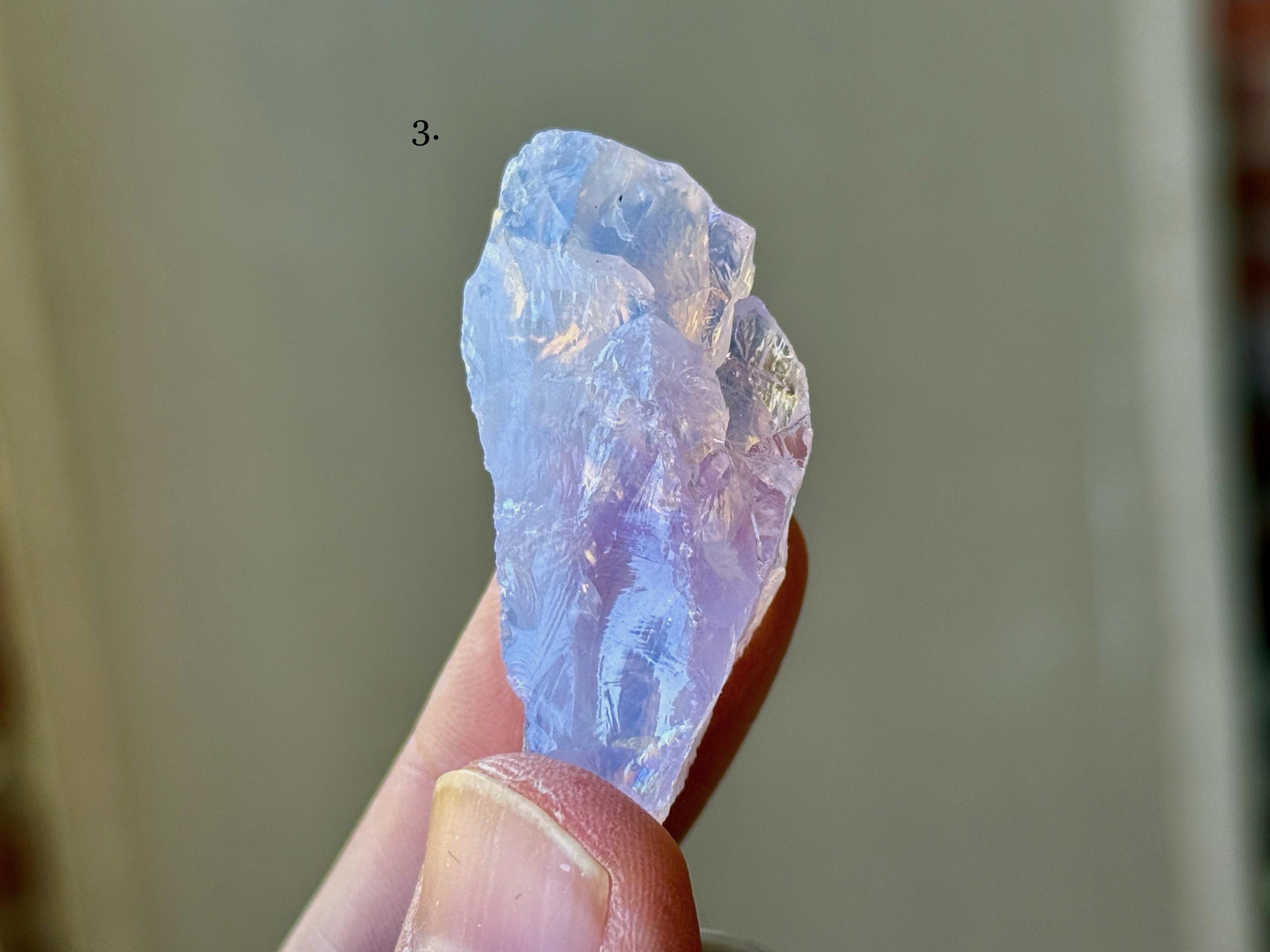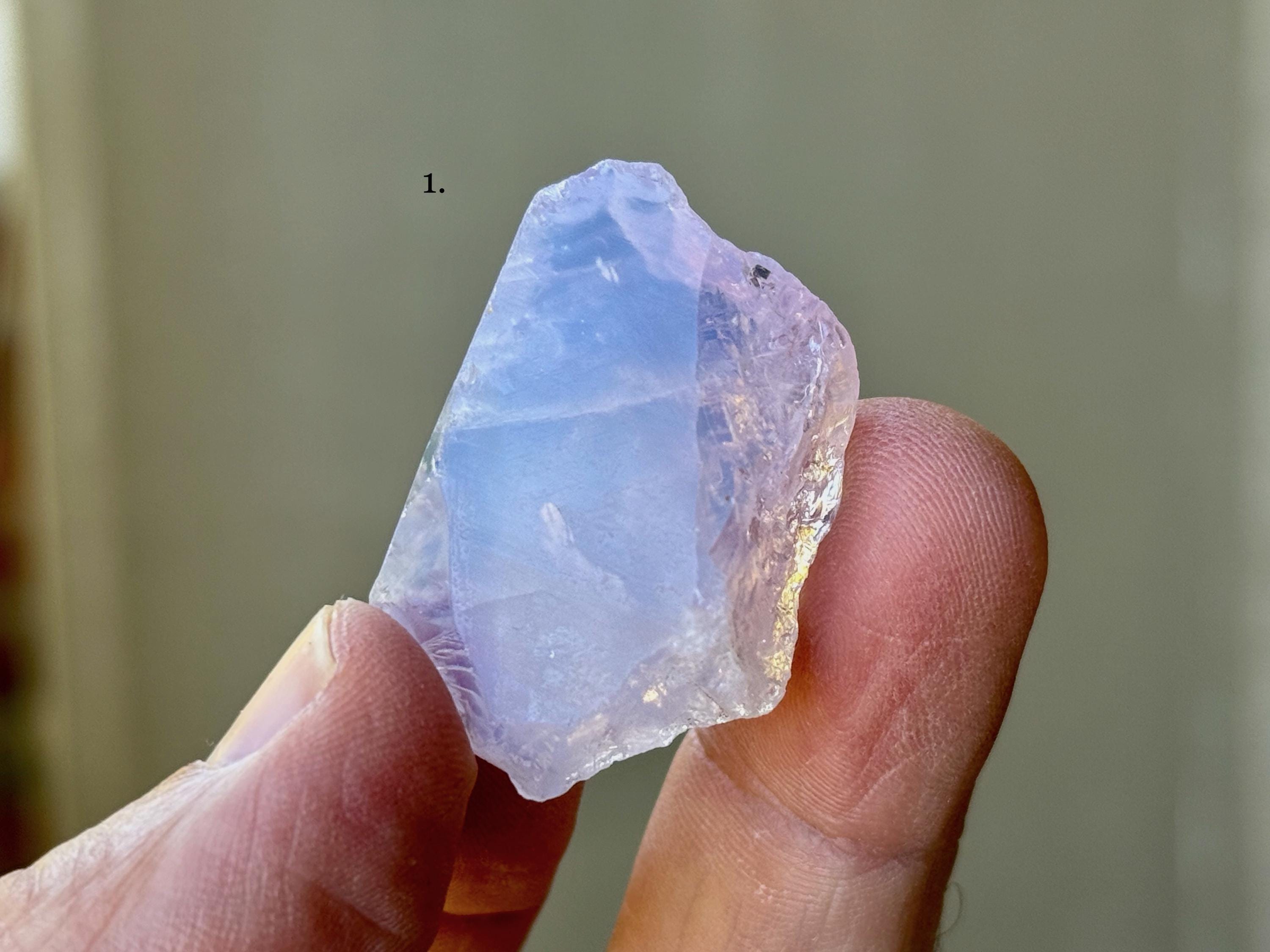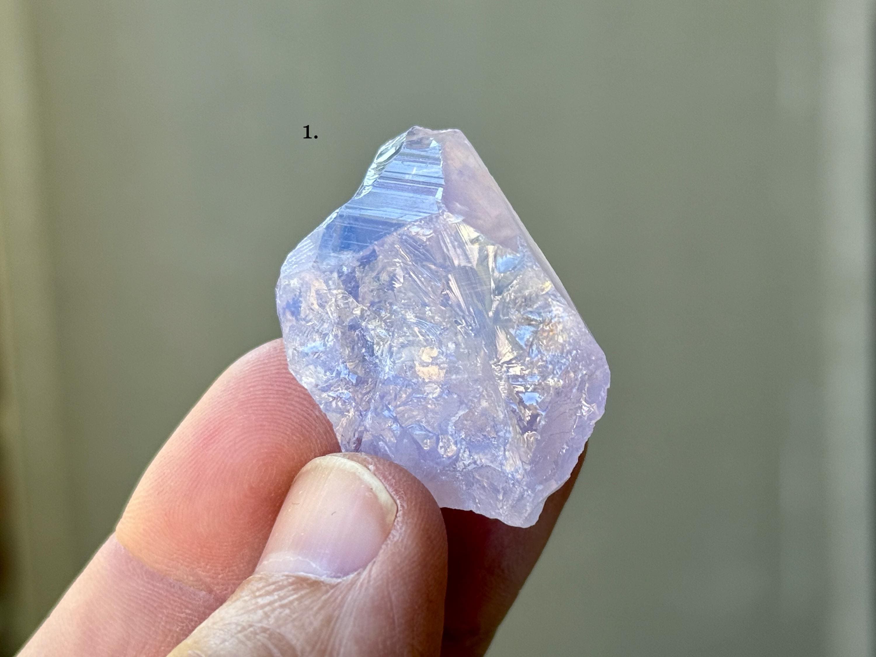 A gorgeous selection of natural Lavender Moon Quartz crystals with opalescent, pale purple hues! Please note that while some of these may have some terminated sides or edges, most edges are not terminated, as is the nature of this material. We've included photos here in natural light as well as backlit.