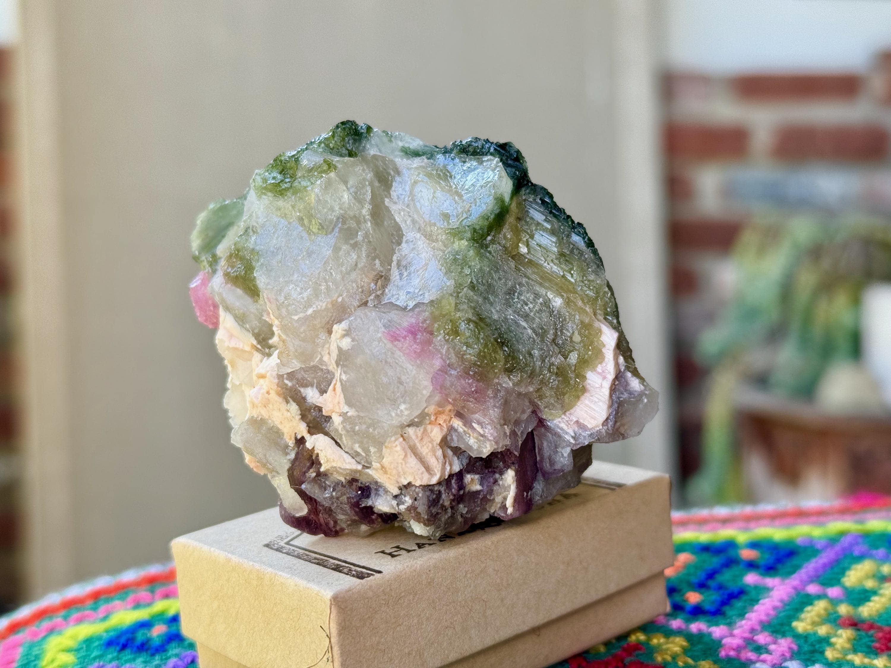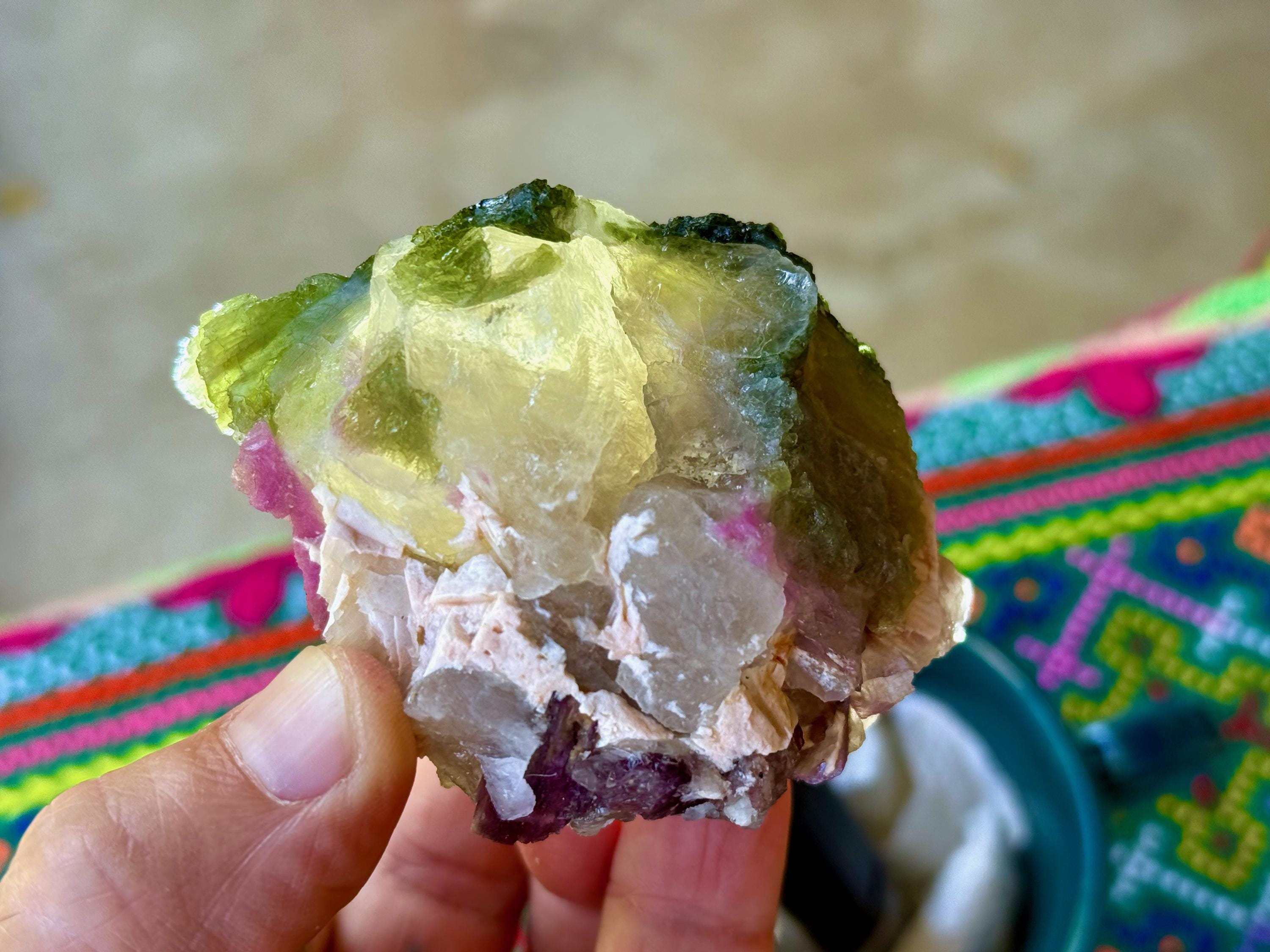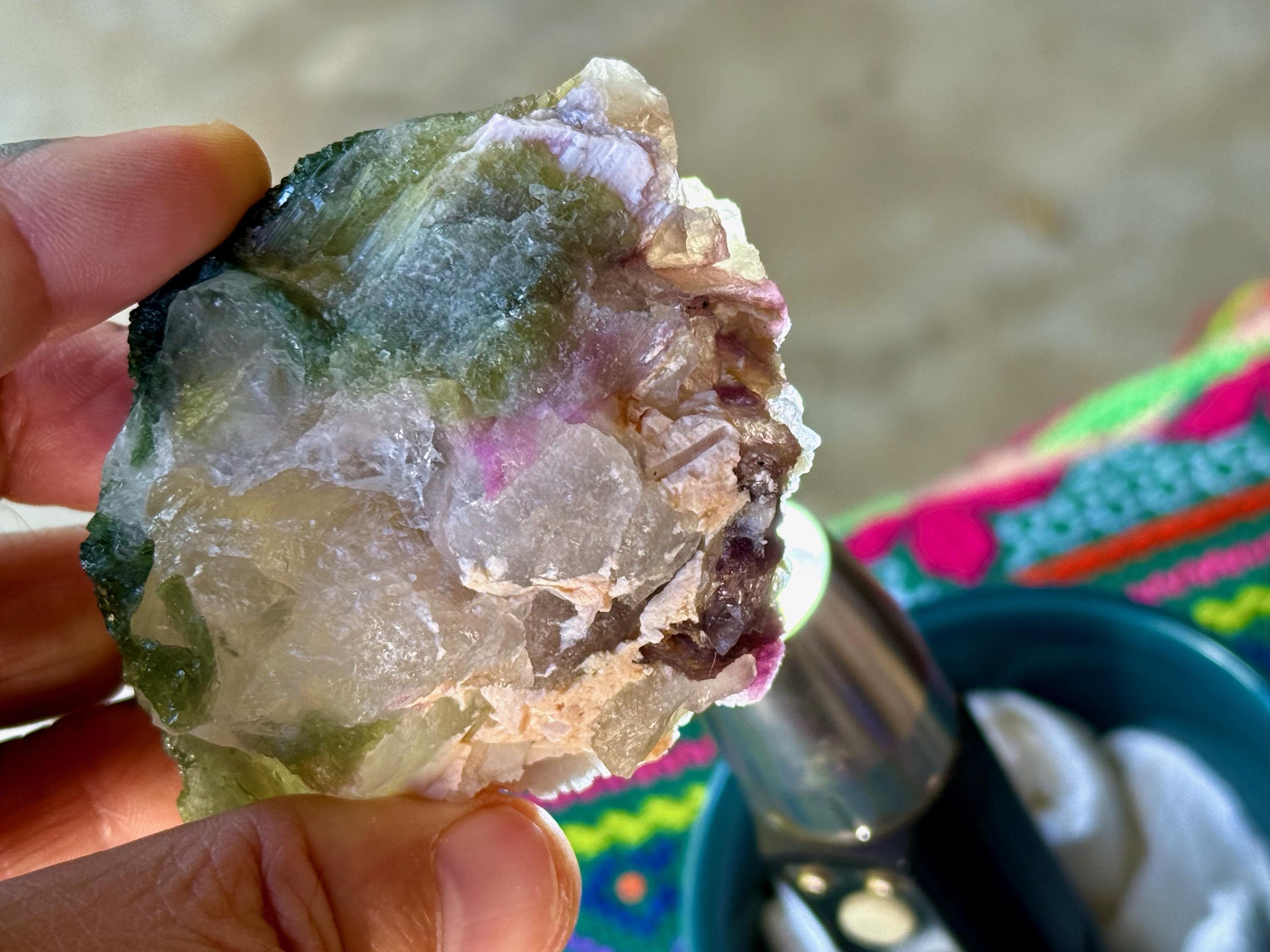 The crystals from this find include unique combinations of Quartz, Citrine, Lepidolite, Albite, Cleavelandite and Feldspar, with vividly colored Tourmalines in lovely hues of green, pink, purple and blue. Crystals with combinations of these minerals are sometimes referred to as "Unicorn Stones."