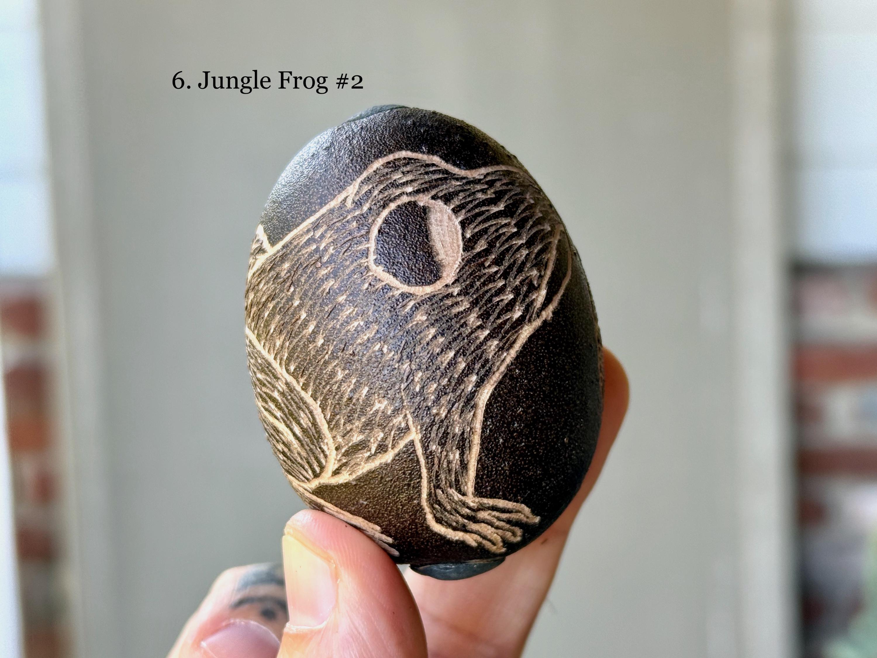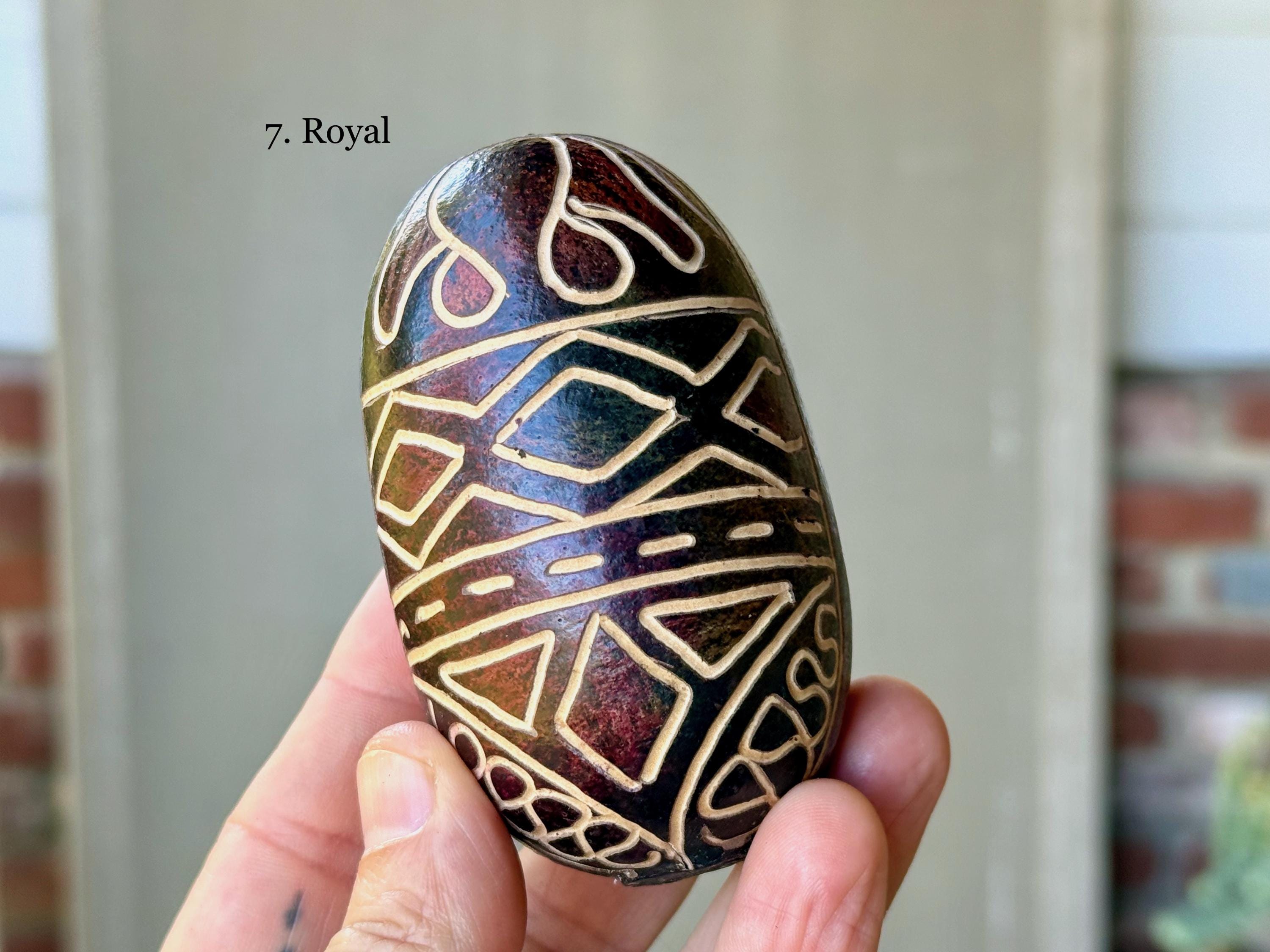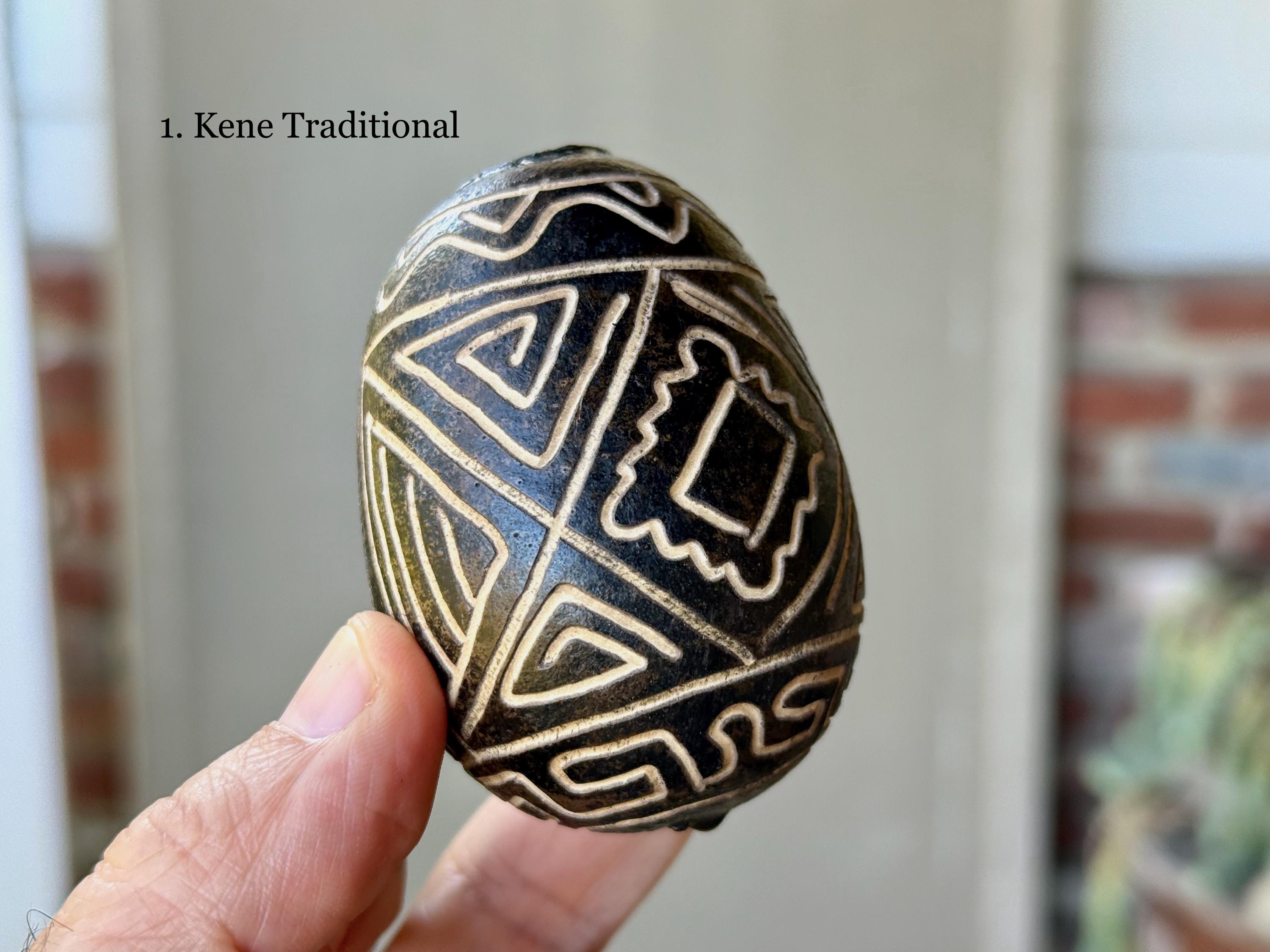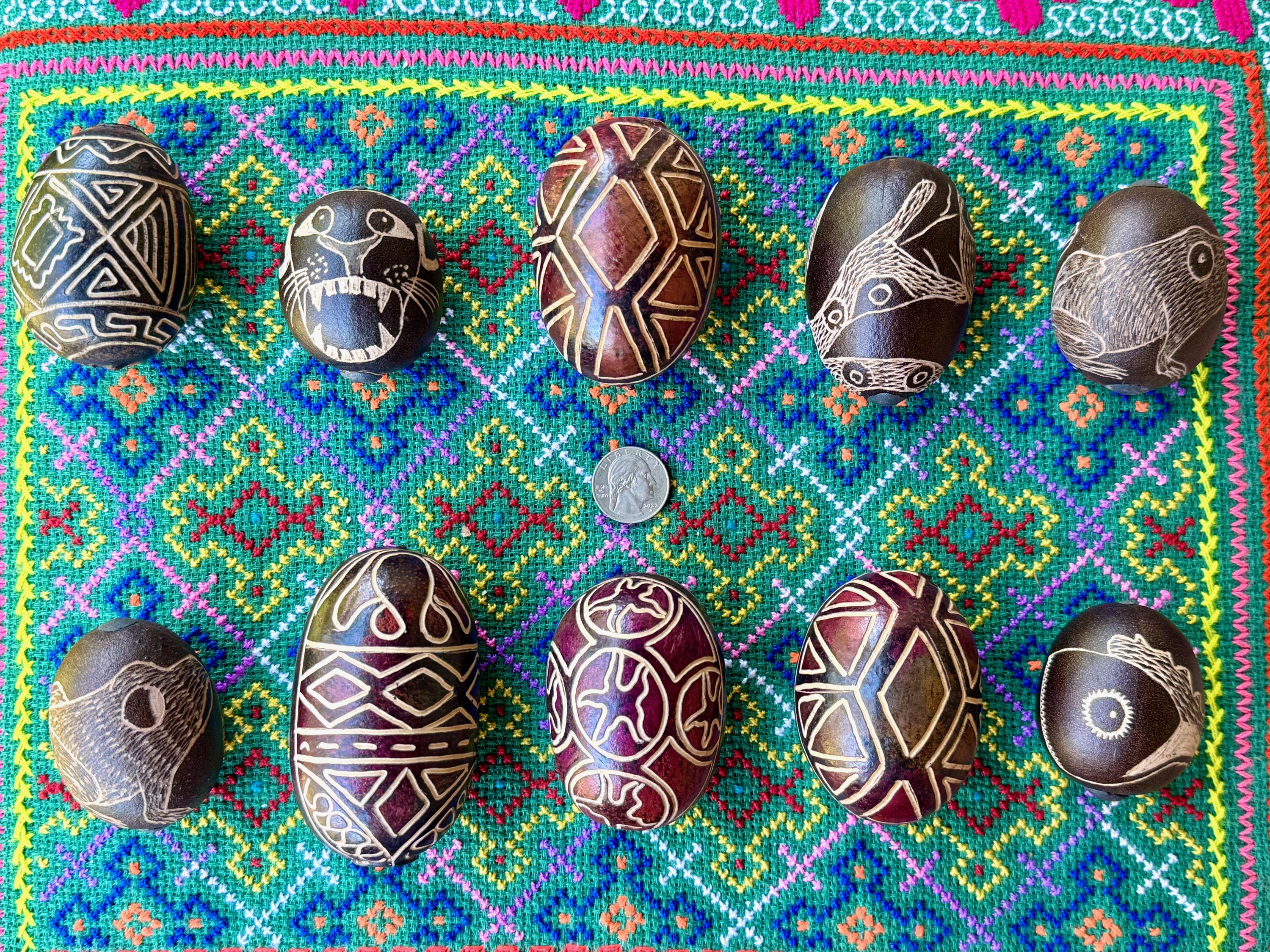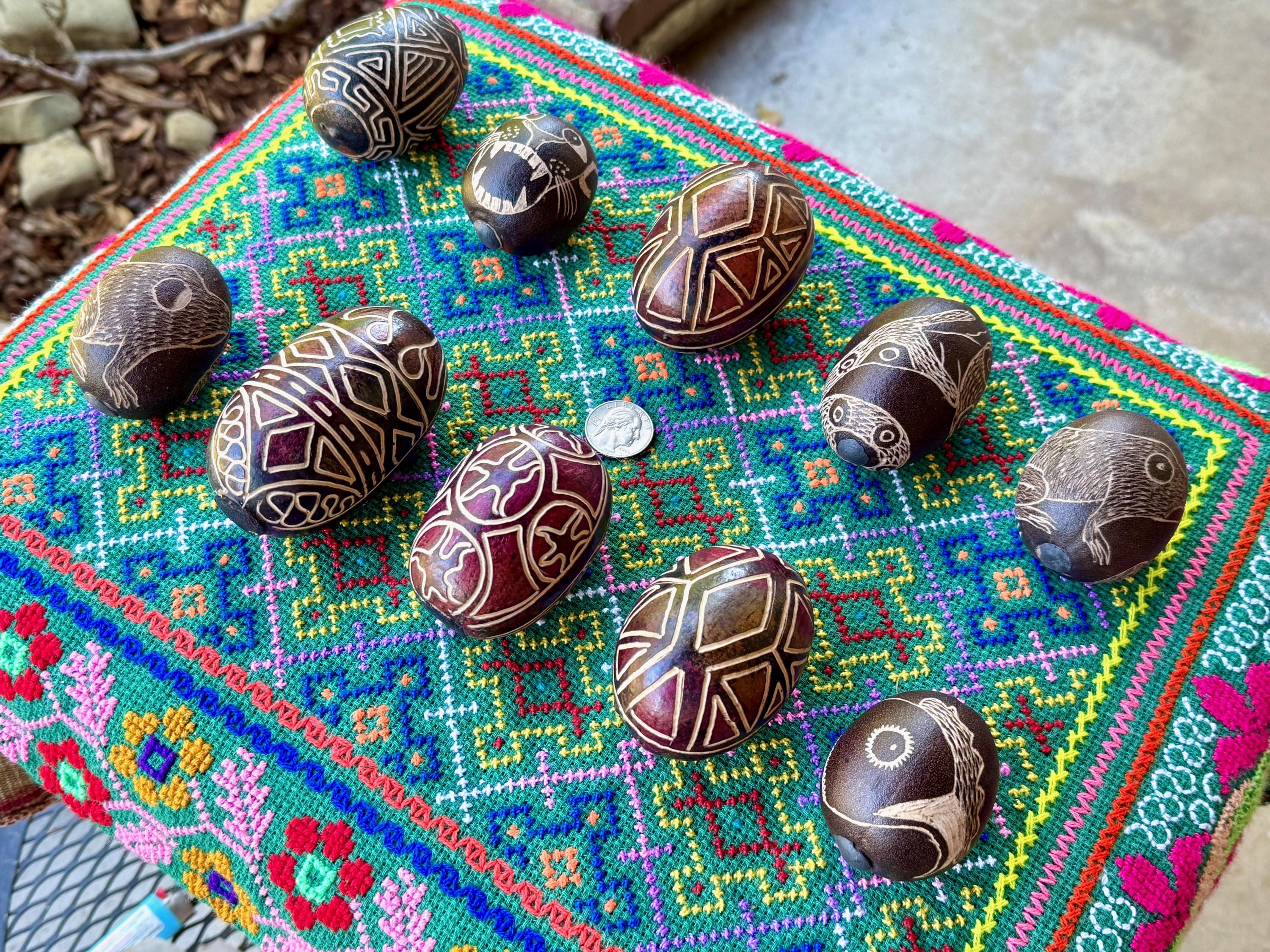 These traditional rattles/egg shakers are handcrafted from natural gourds collected from the rainforest floor. They are filled with seeds and/or beads and hand-etched in a variety of designs. The tone is gentle, rolling, rhythmic and pleasant, and much more rustic/organic than the traditional plastic egg shakers found in music shops. They are ideal for accompanying music and singing in or out of ceremony.