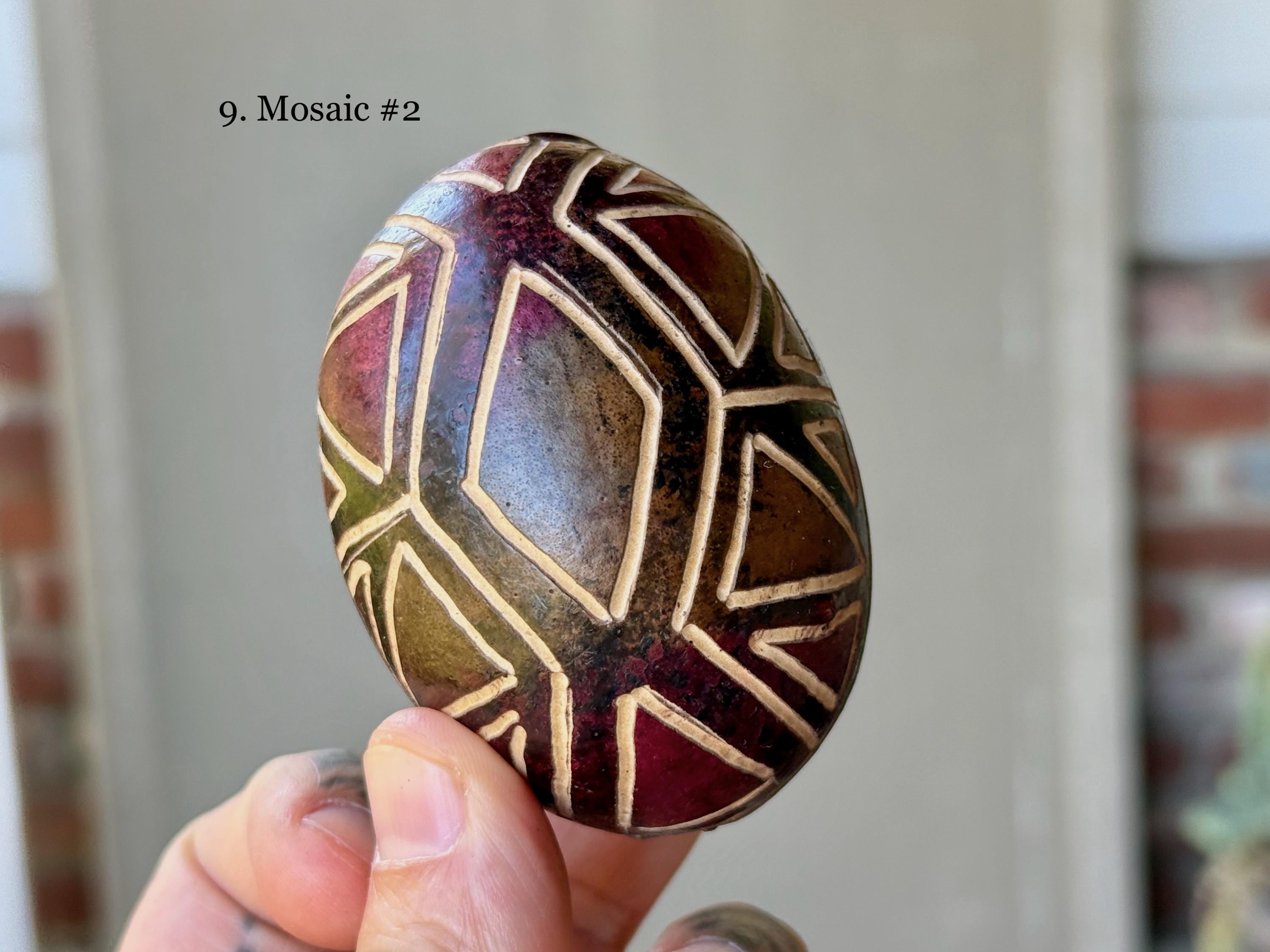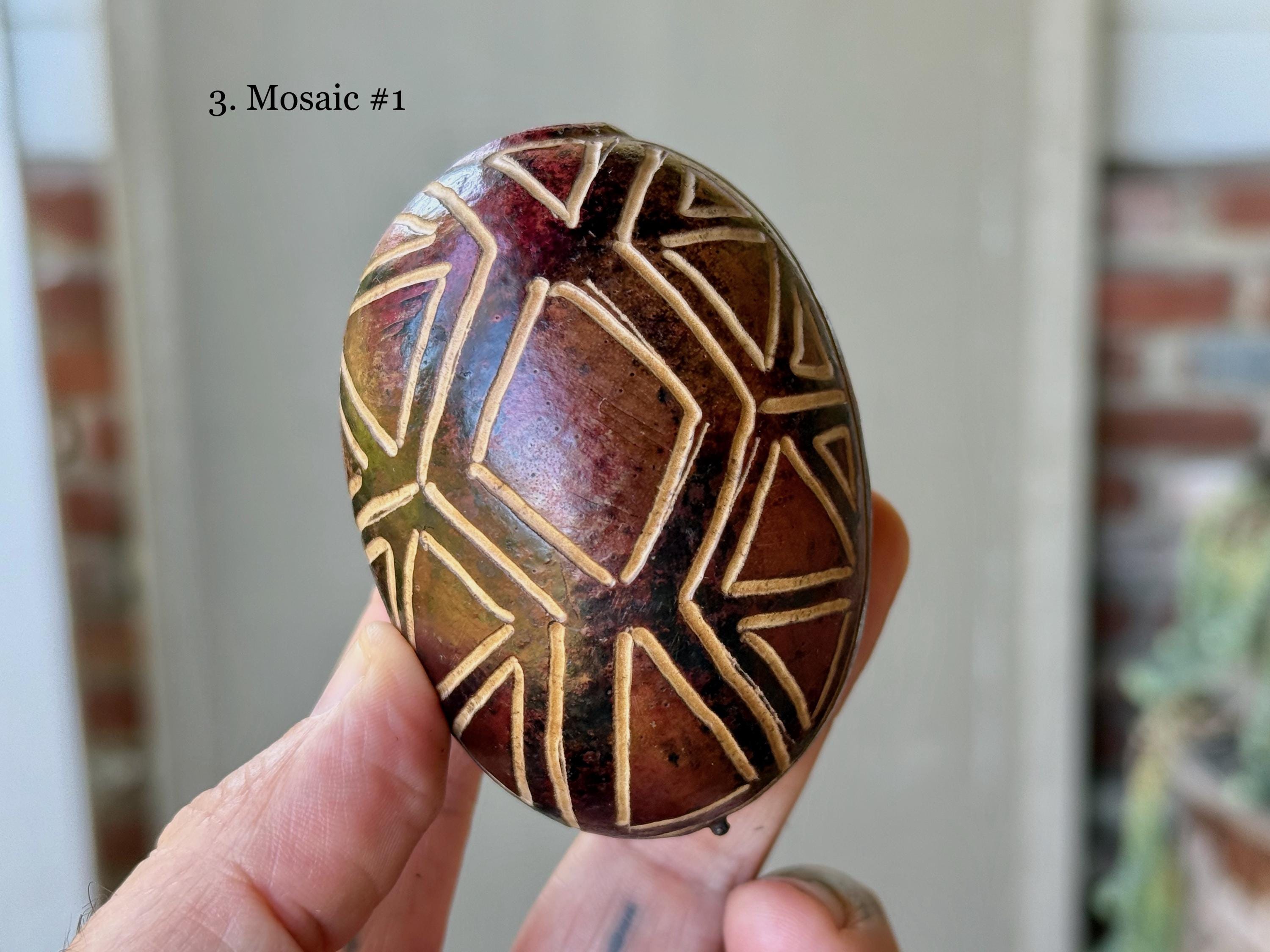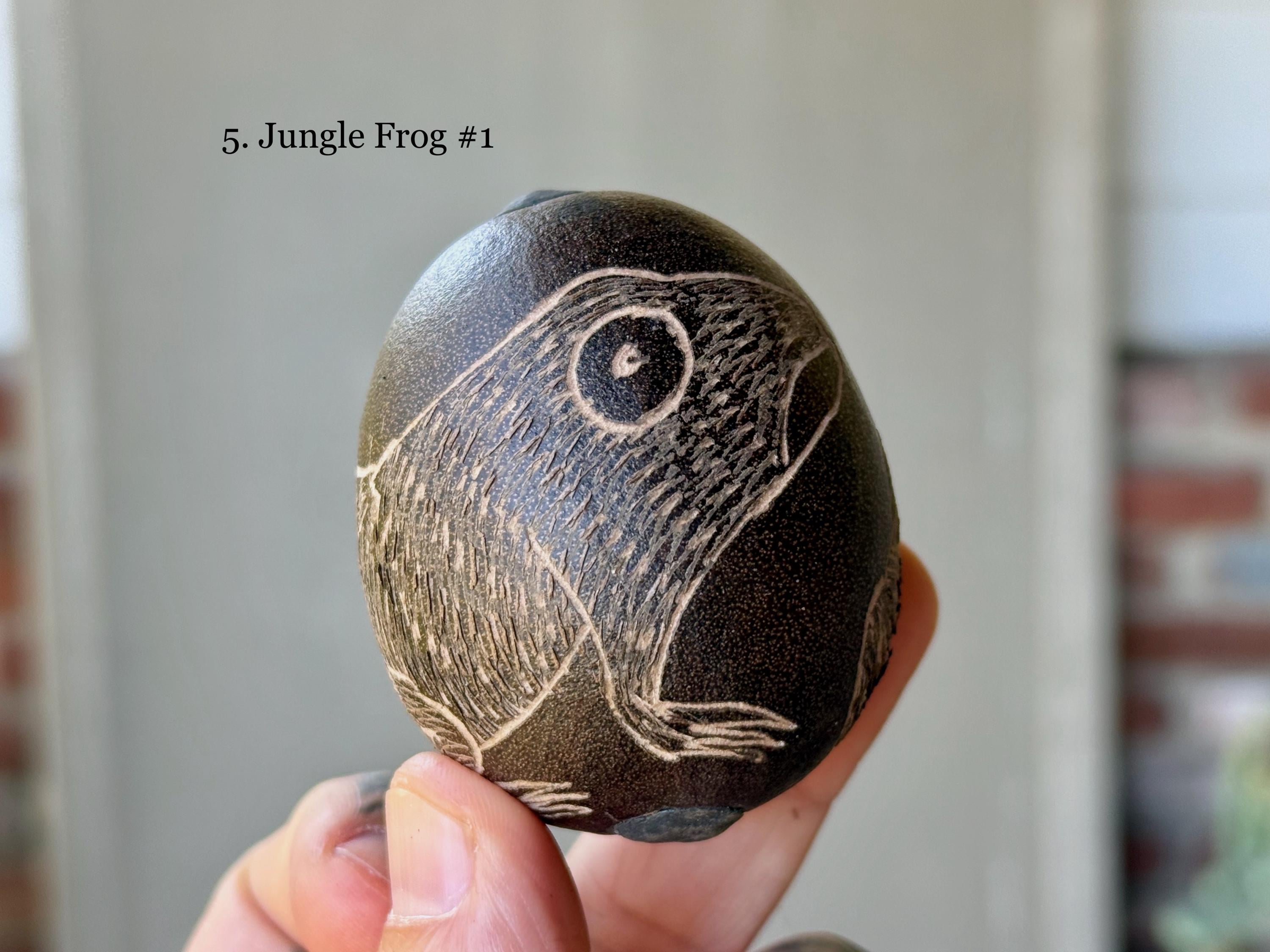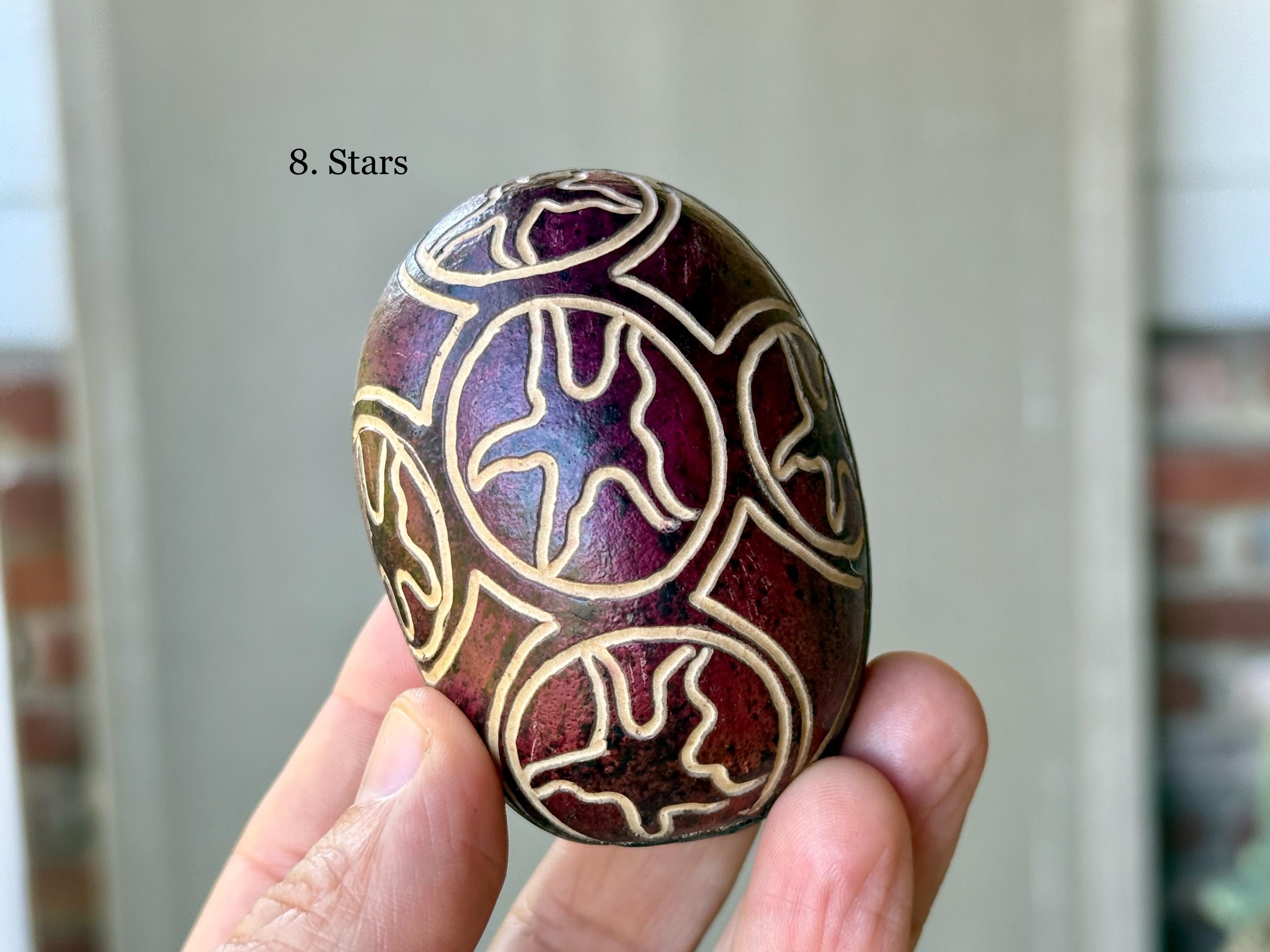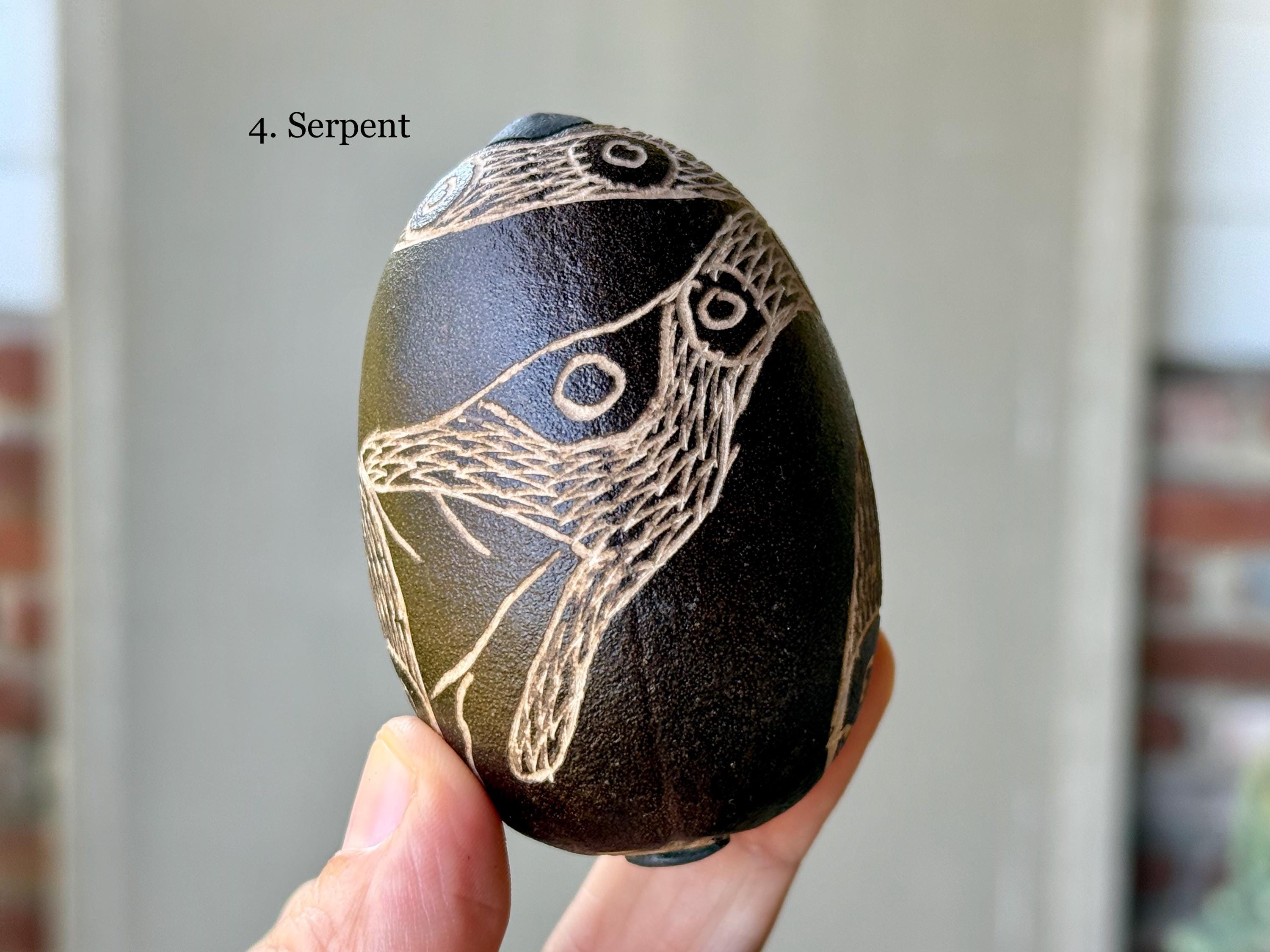 These traditional rattles/egg shakers are handcrafted from natural gourds collected from the rainforest floor. They are filled with seeds and/or beads and hand-etched in a variety of designs. The tone is gentle, rolling, rhythmic and pleasant, and much more rustic/organic than the traditional plastic egg shakers found in music shops. They are ideal for accompanying music and singing in or out of ceremony.