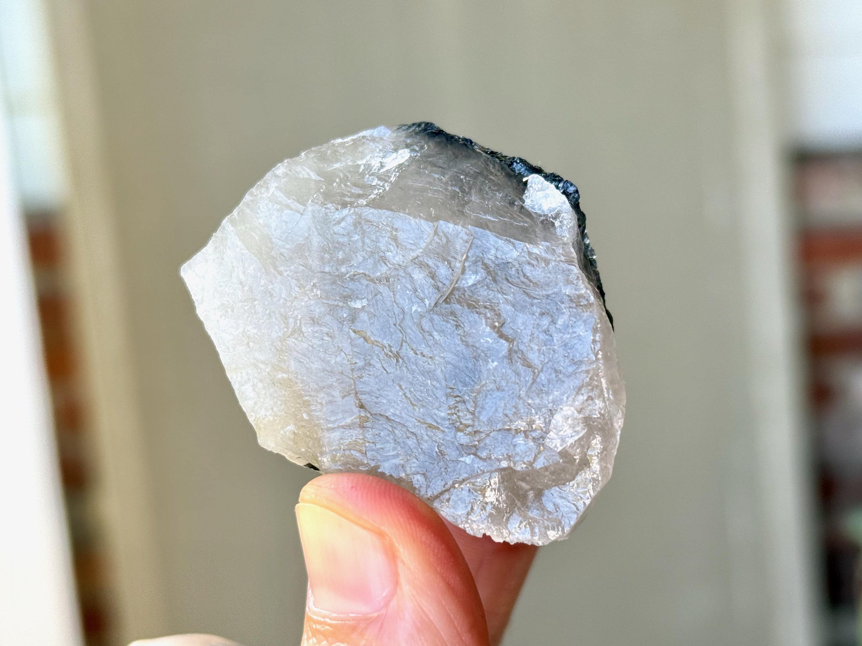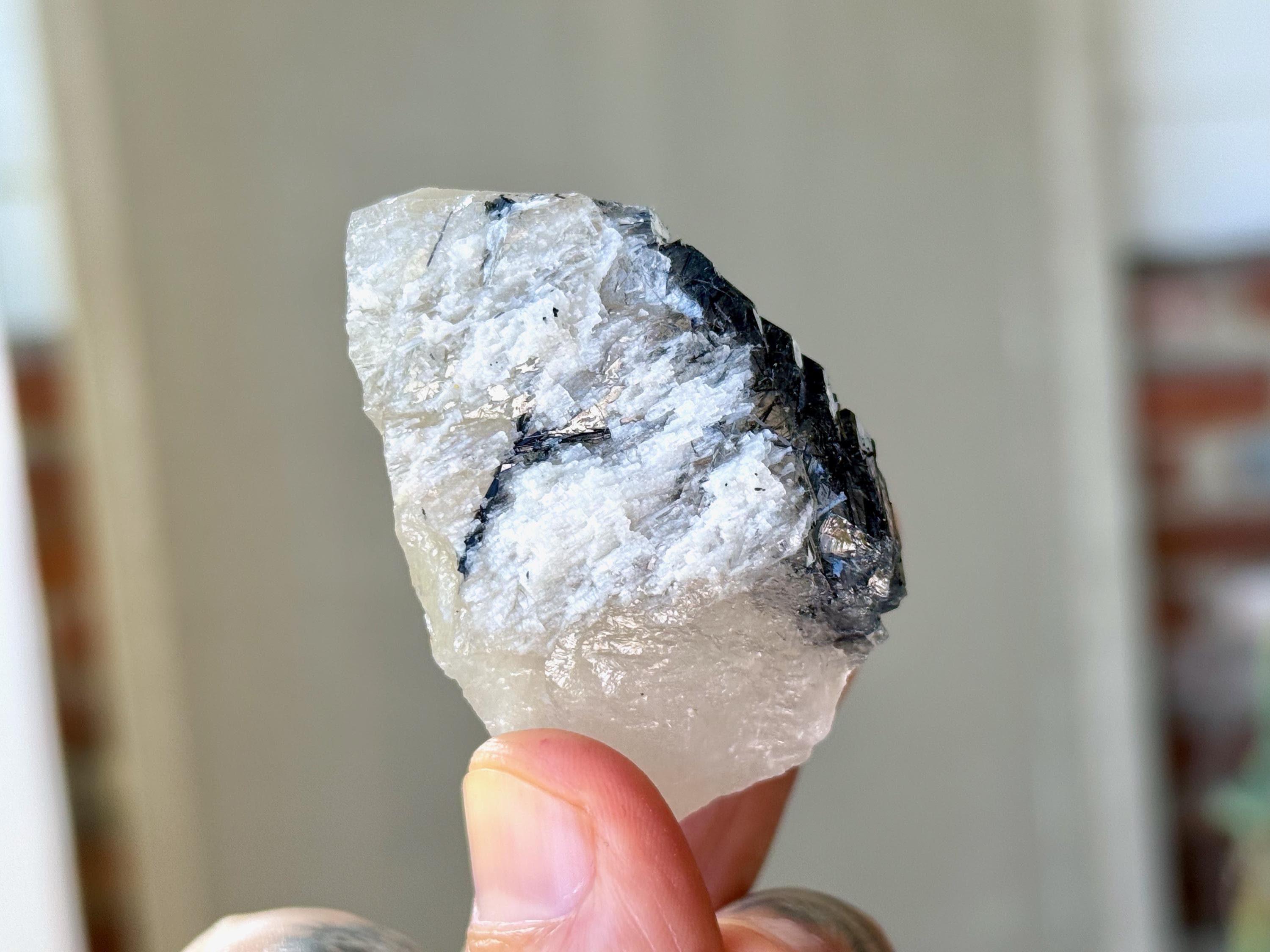 Superb luster to this Quartz crystal with beautiful inclusions of dark Blue Tourmaline embedded within the main facet. In natural light, these Tourmalines appear almost black, but when backlit, we can see tinges of dark blue (Photos 1 and 3). Absolutely beautiful!