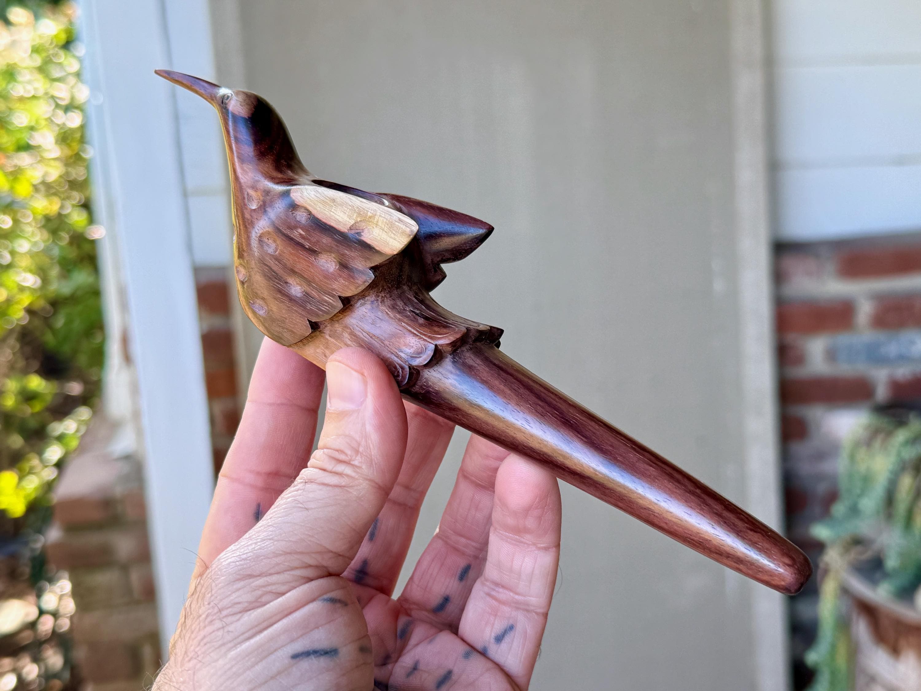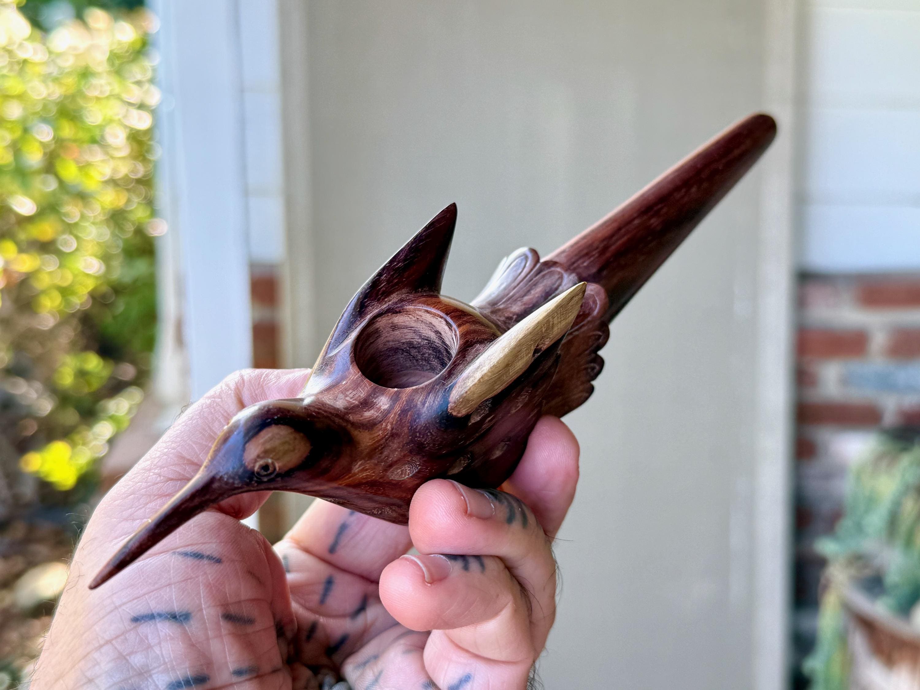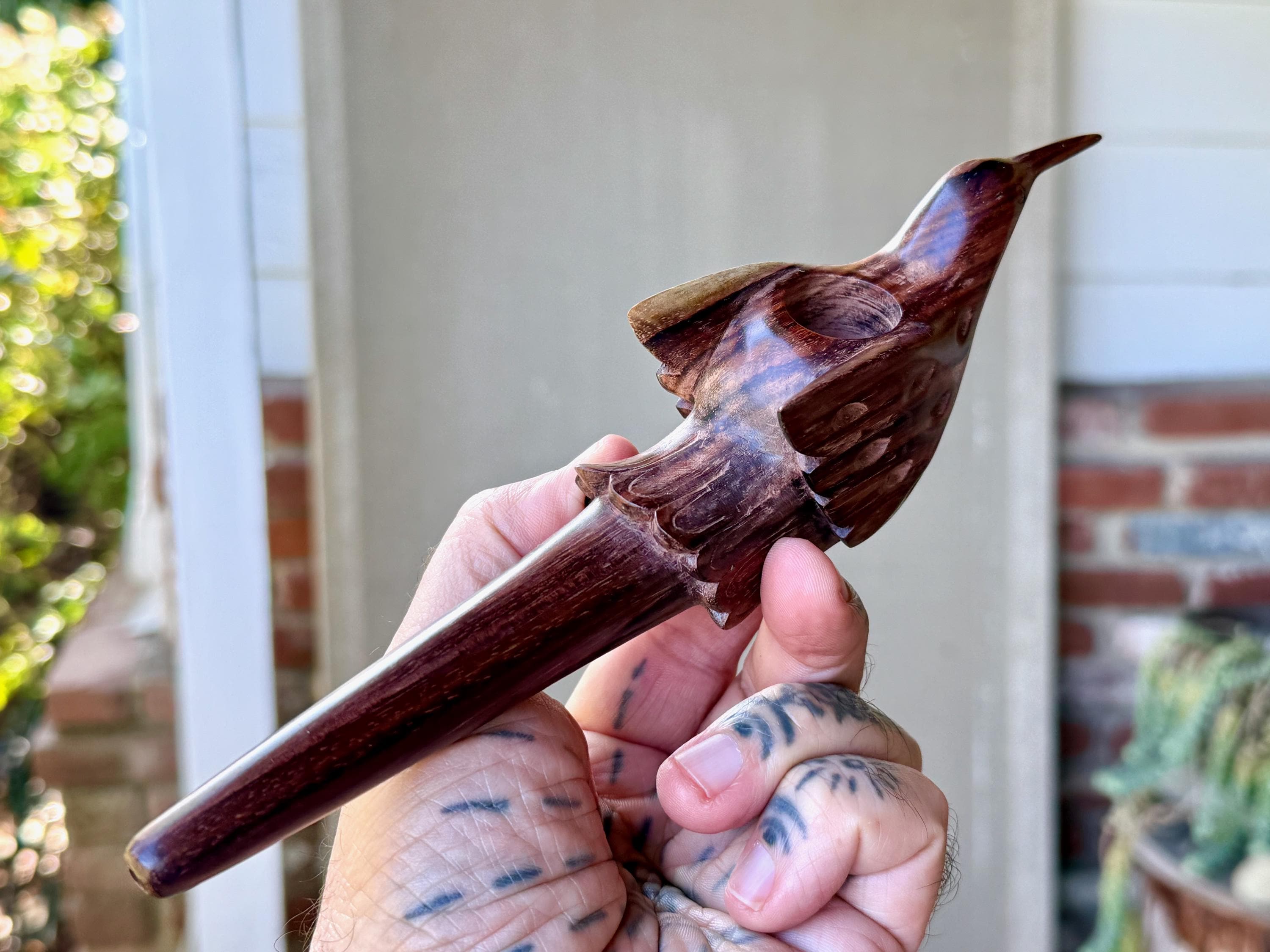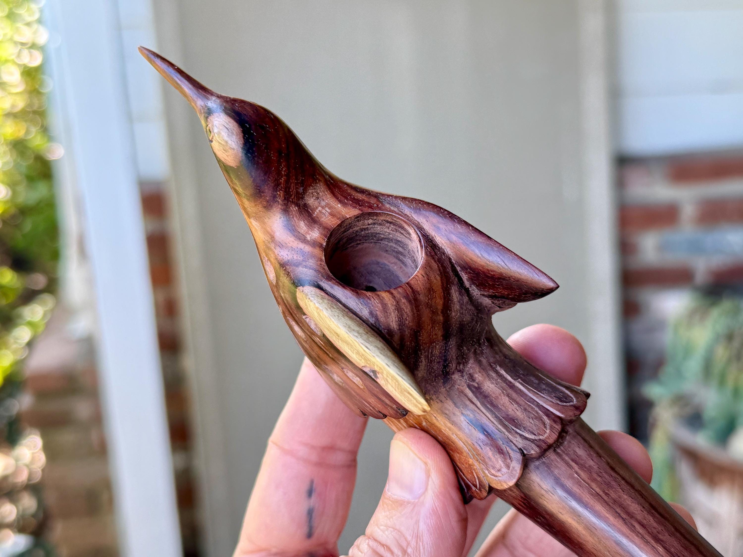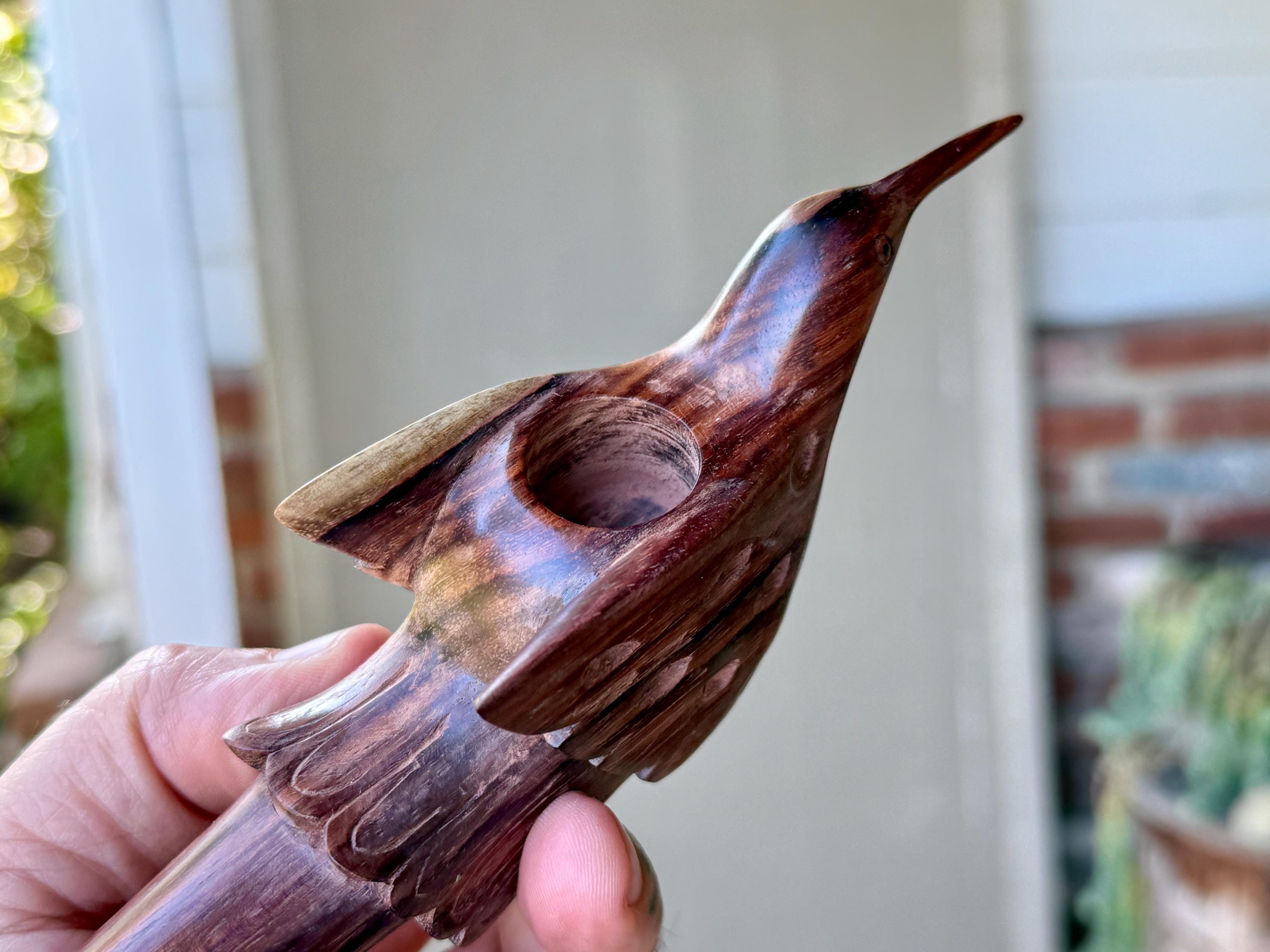 The joy and light of our most beloved animal ally, the Hummingbird, captured here in this beautiful tobacco pipe. We love the design and the beautiful grain and two-tone hue of the wood. The level of craftsmanship is impressive! A beautiful and powerful tool for shamanic ceremony.