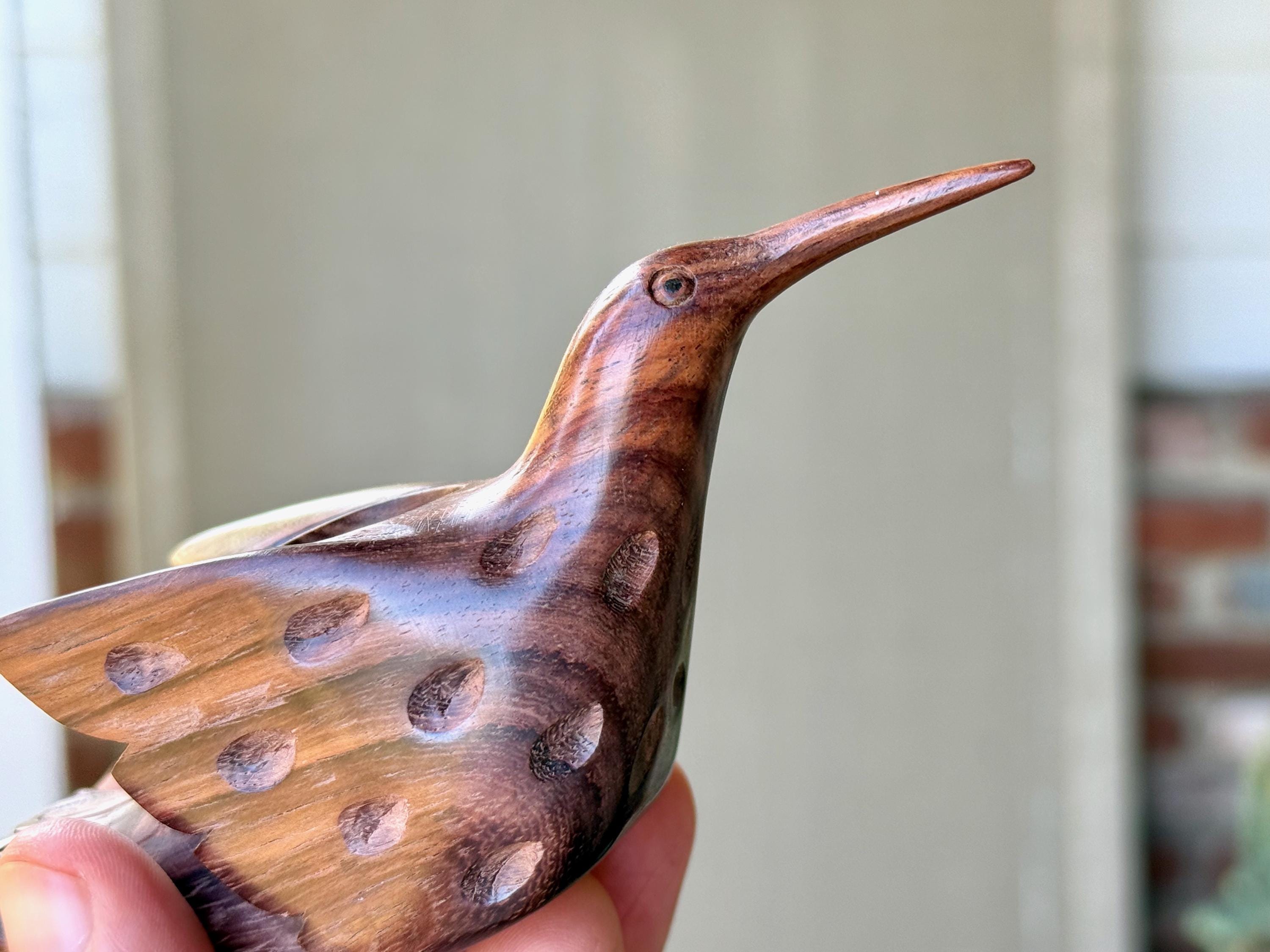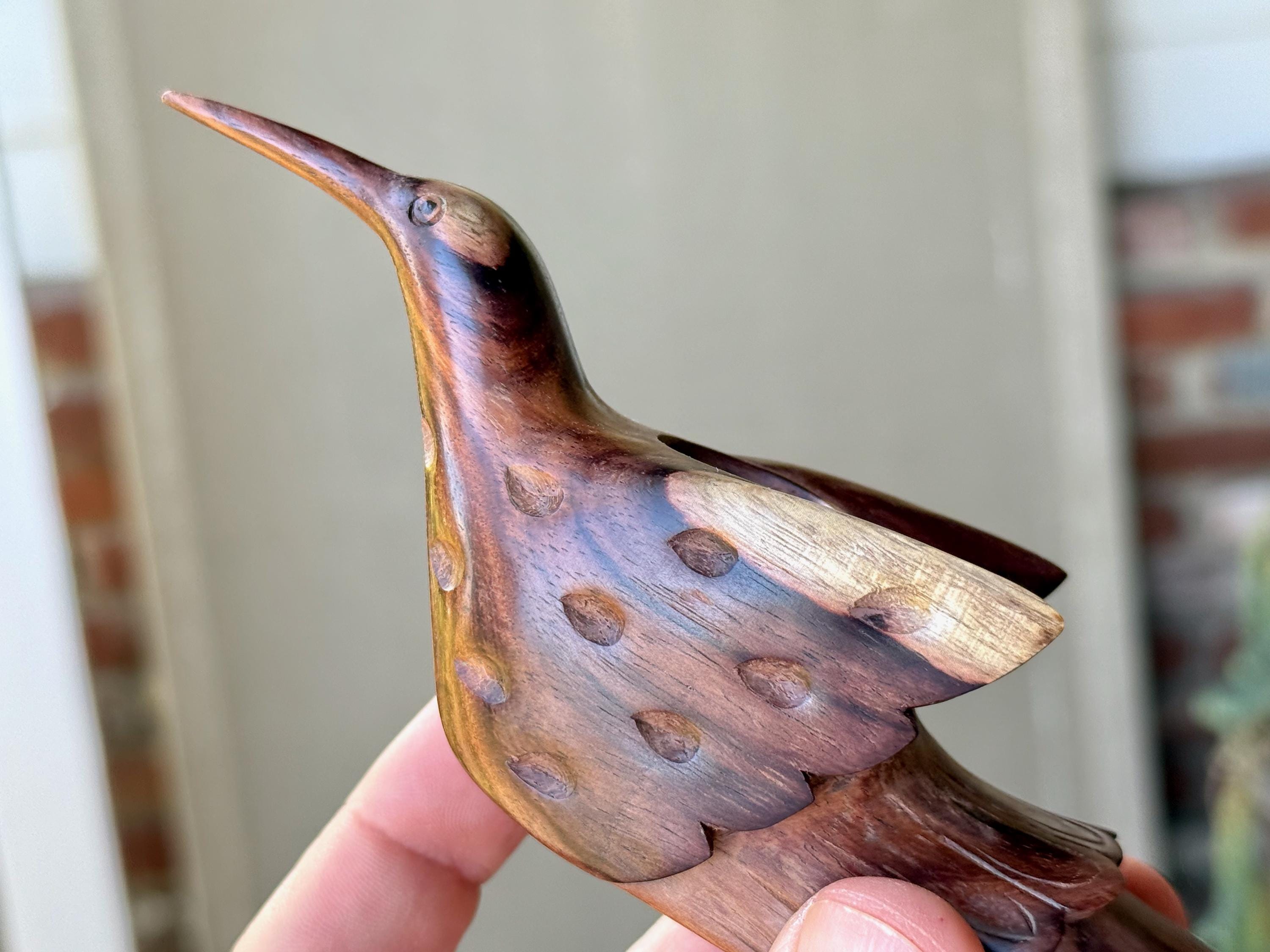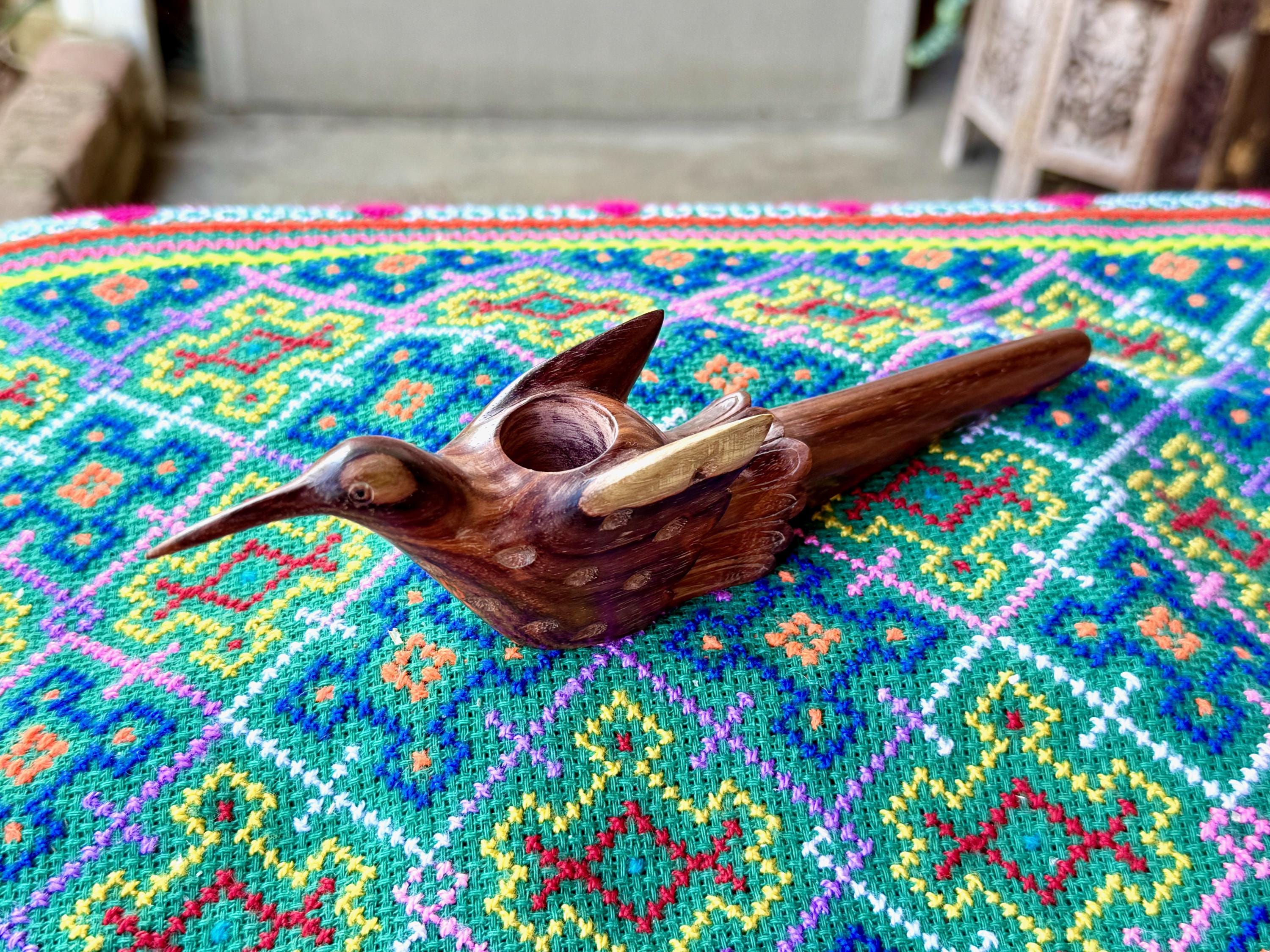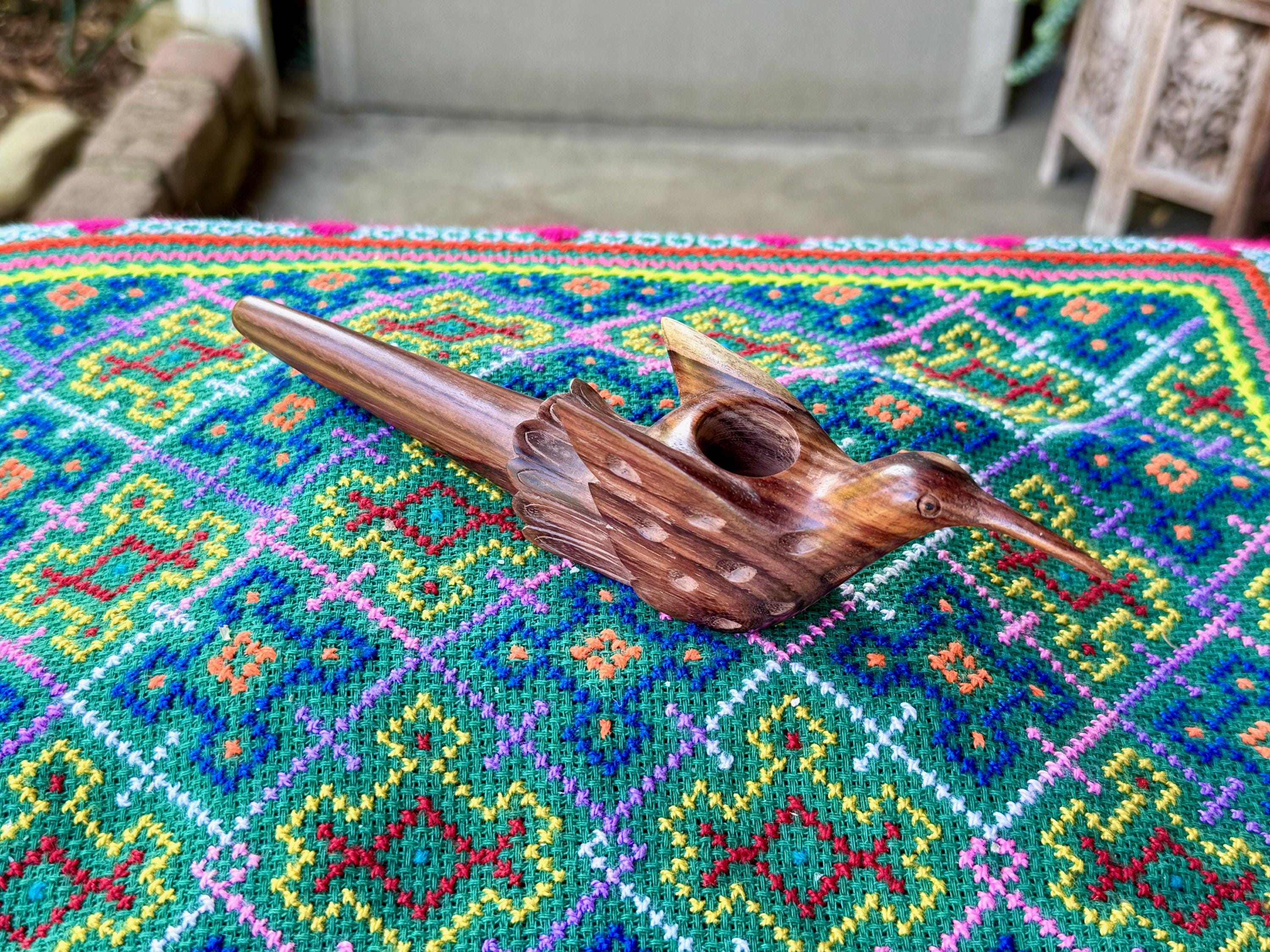 This glorious Hummingbird Pipe for tobacco and mapacho was hand carved from solid, natural tropical hardwood. This pipe is intended for use in shamanic healing ceremonies or for other energy healing applications.