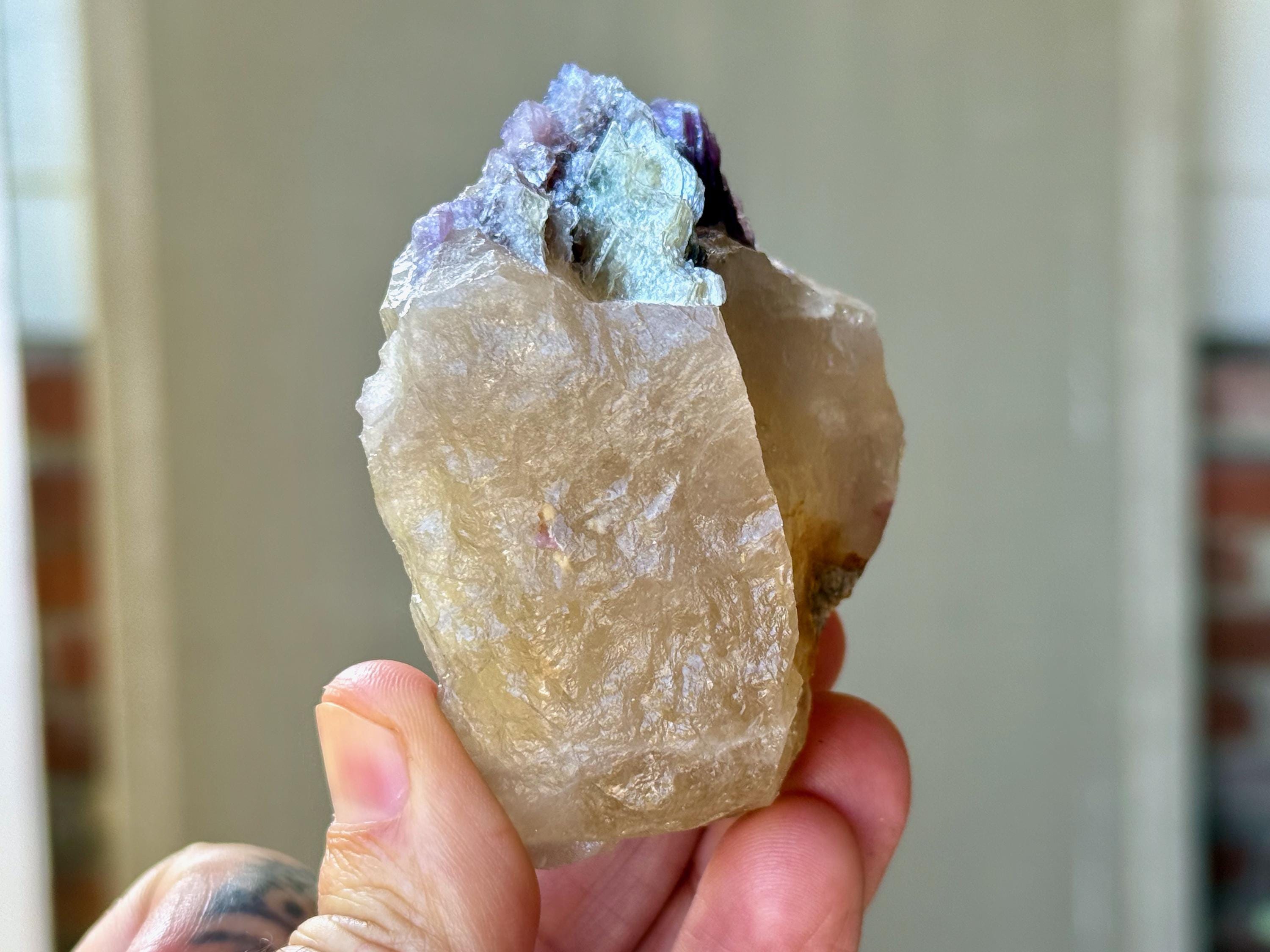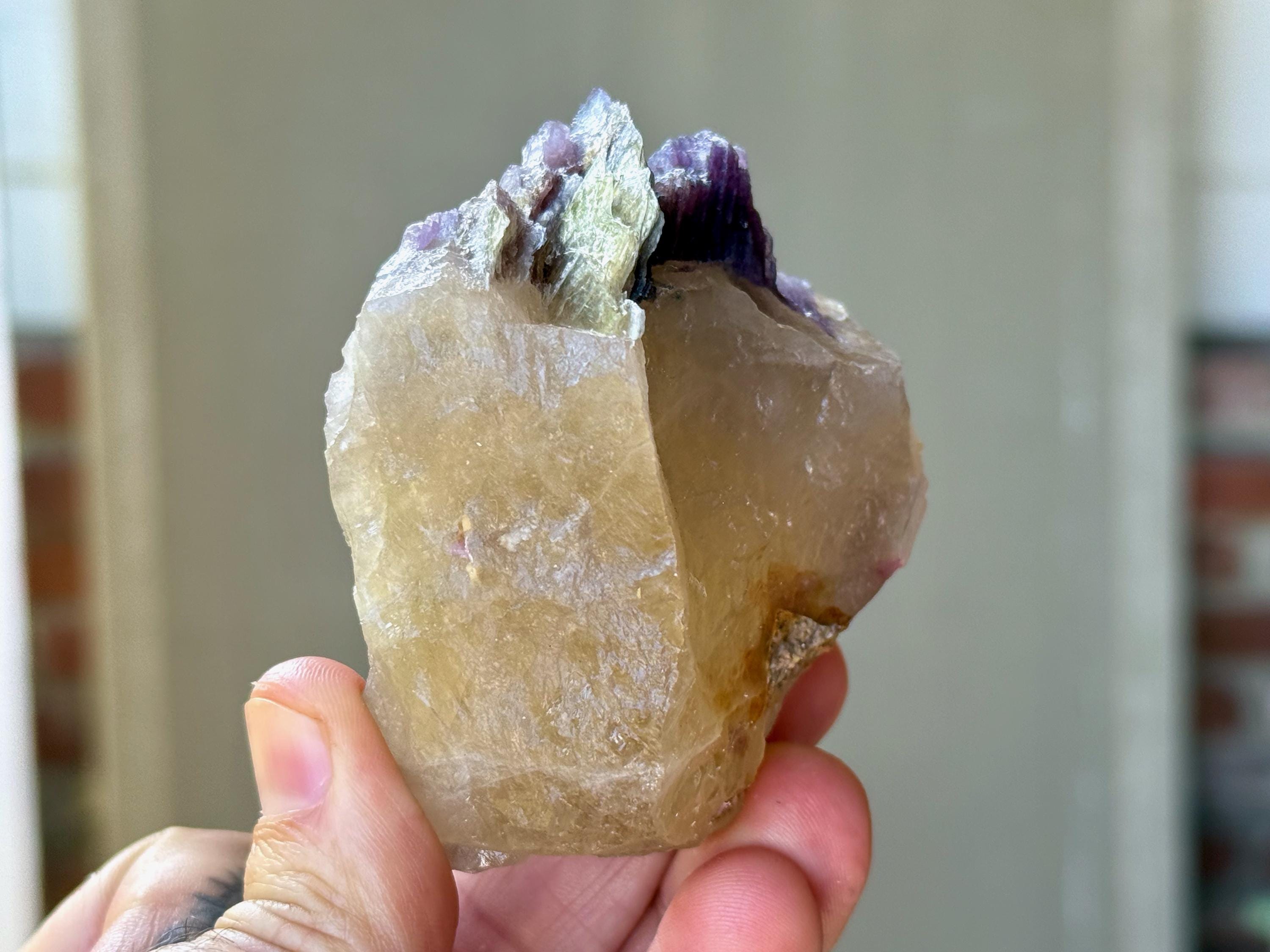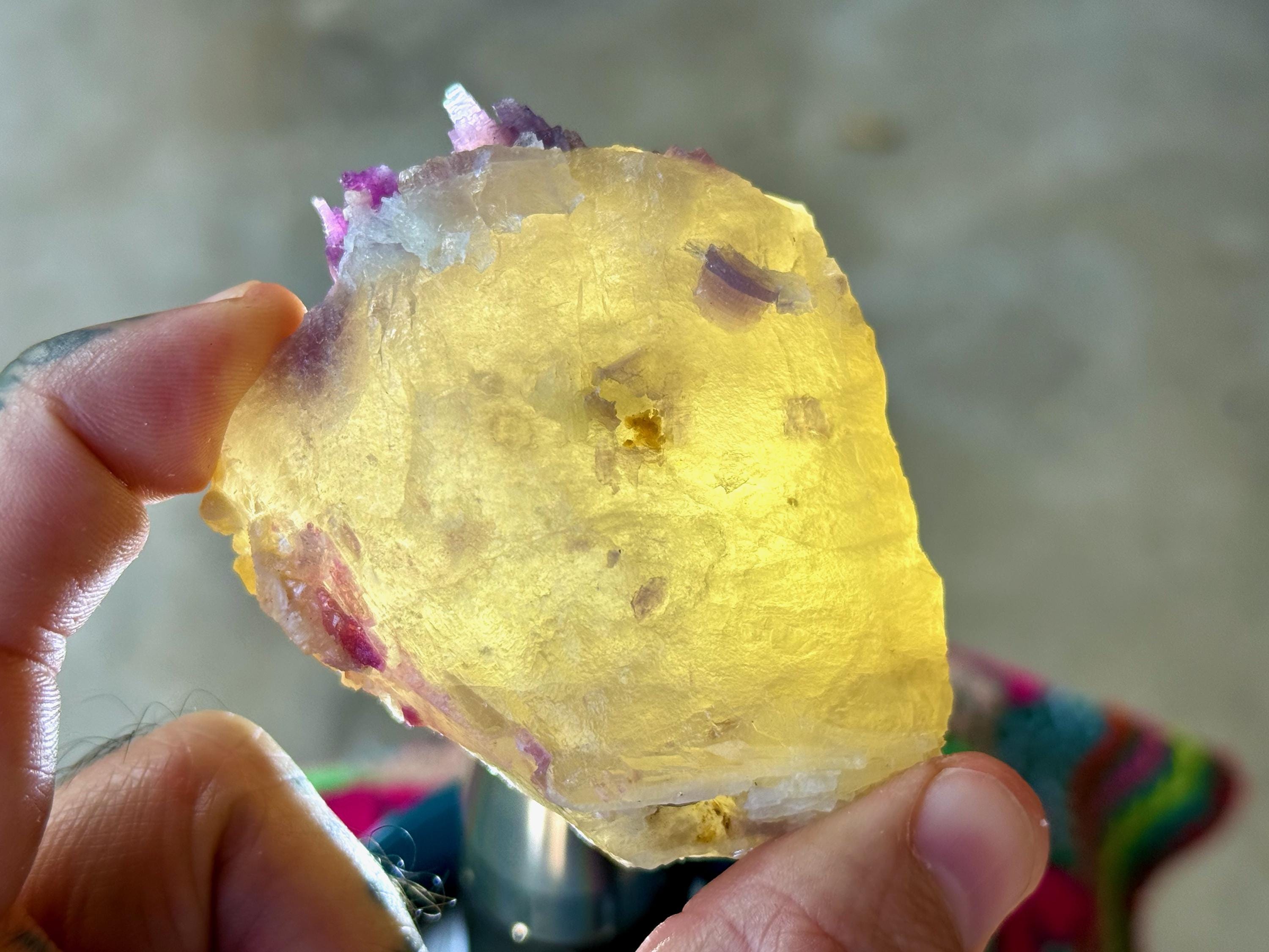 A glorious golden color to this chunky, natural Citrine crystal with a crest of Purple Lepidolite embedded at the top. When backlit, we can see just how brilliantly this piece passes light, especially the Lepidolite (Photos 3-5).