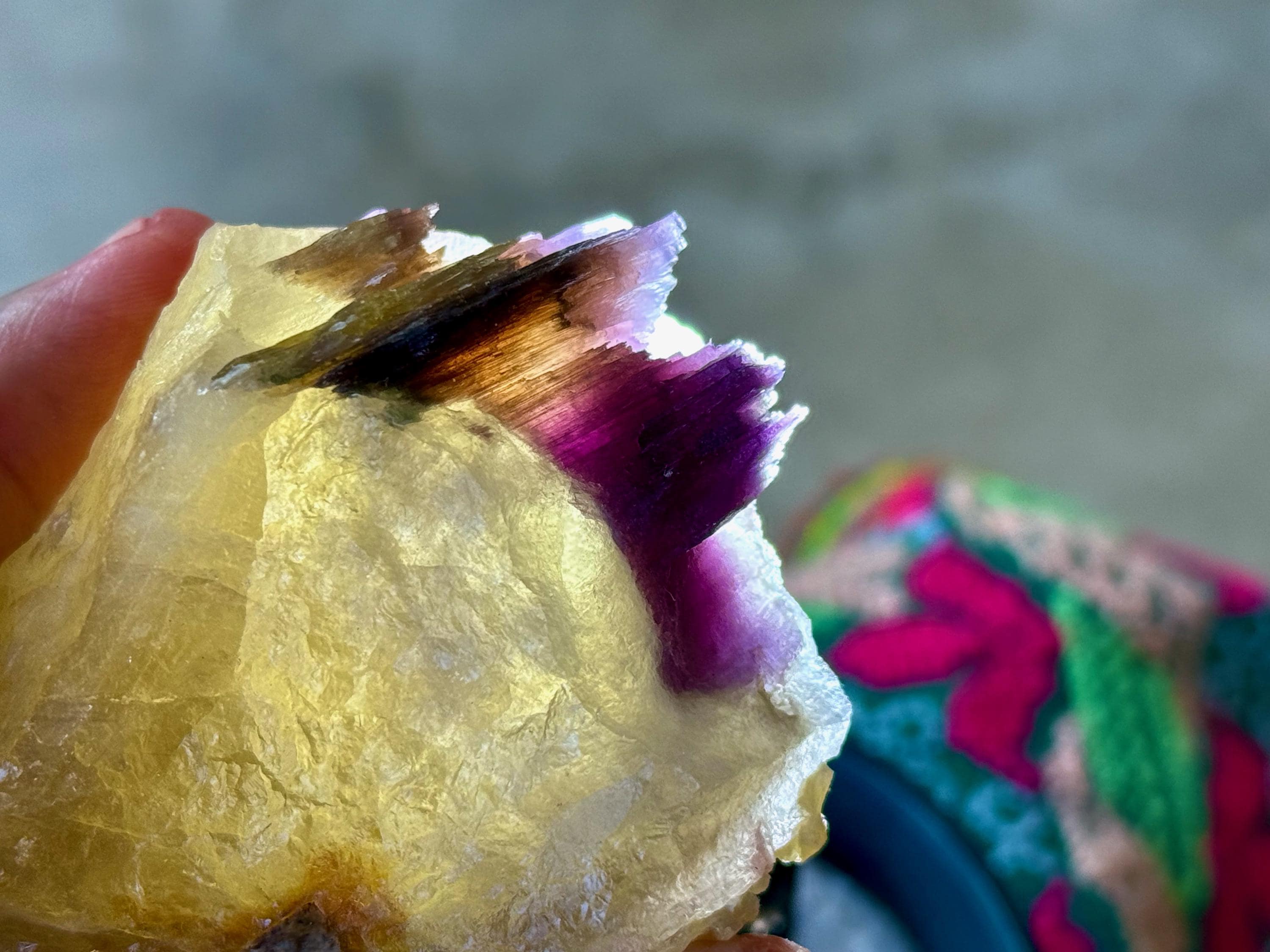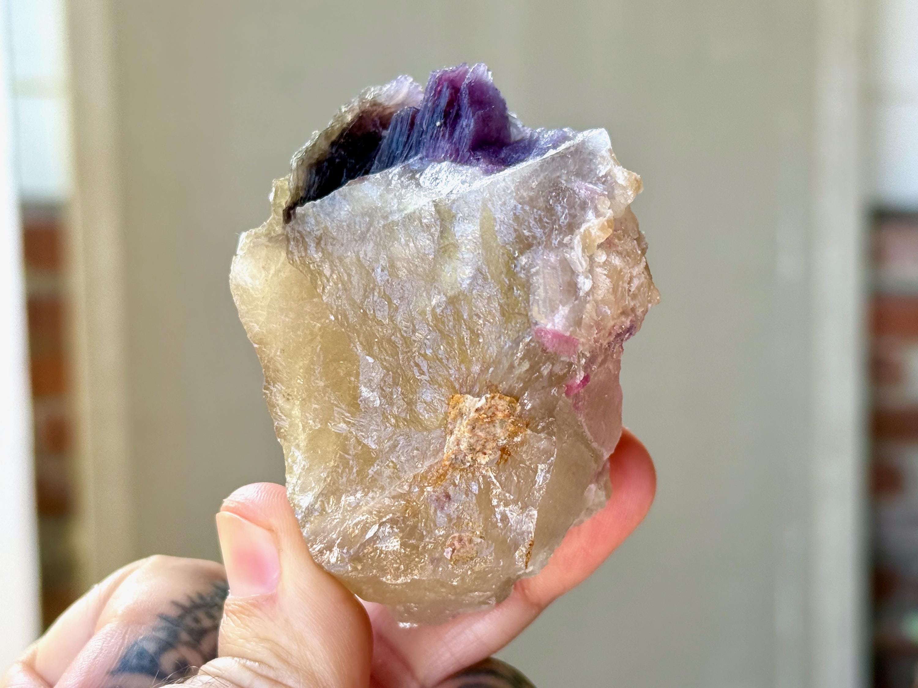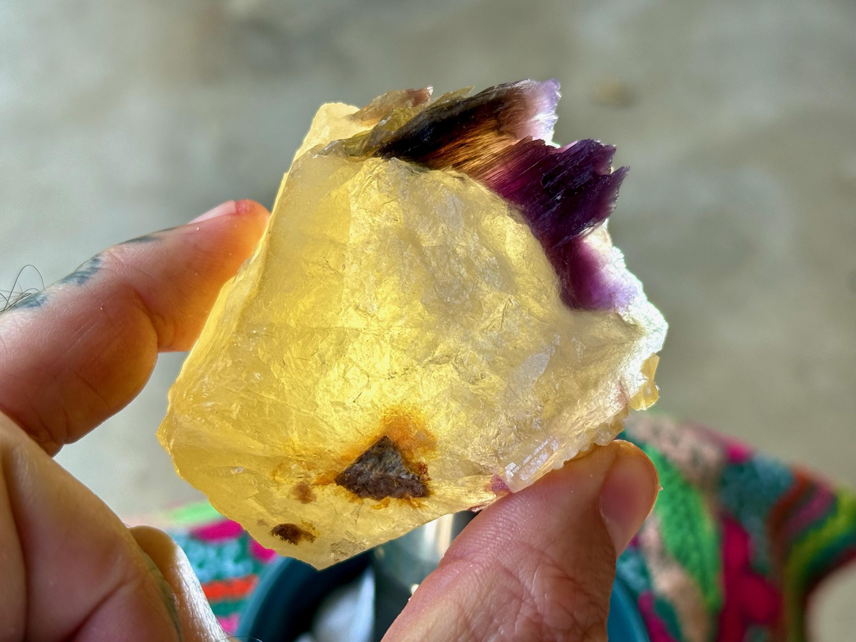 A glorious golden color to this chunky, natural Citrine crystal with a crest of Purple Lepidolite embedded at the top. When backlit, we can see just how brilliantly this piece passes light, especially the Lepidolite (Photos 3-5).