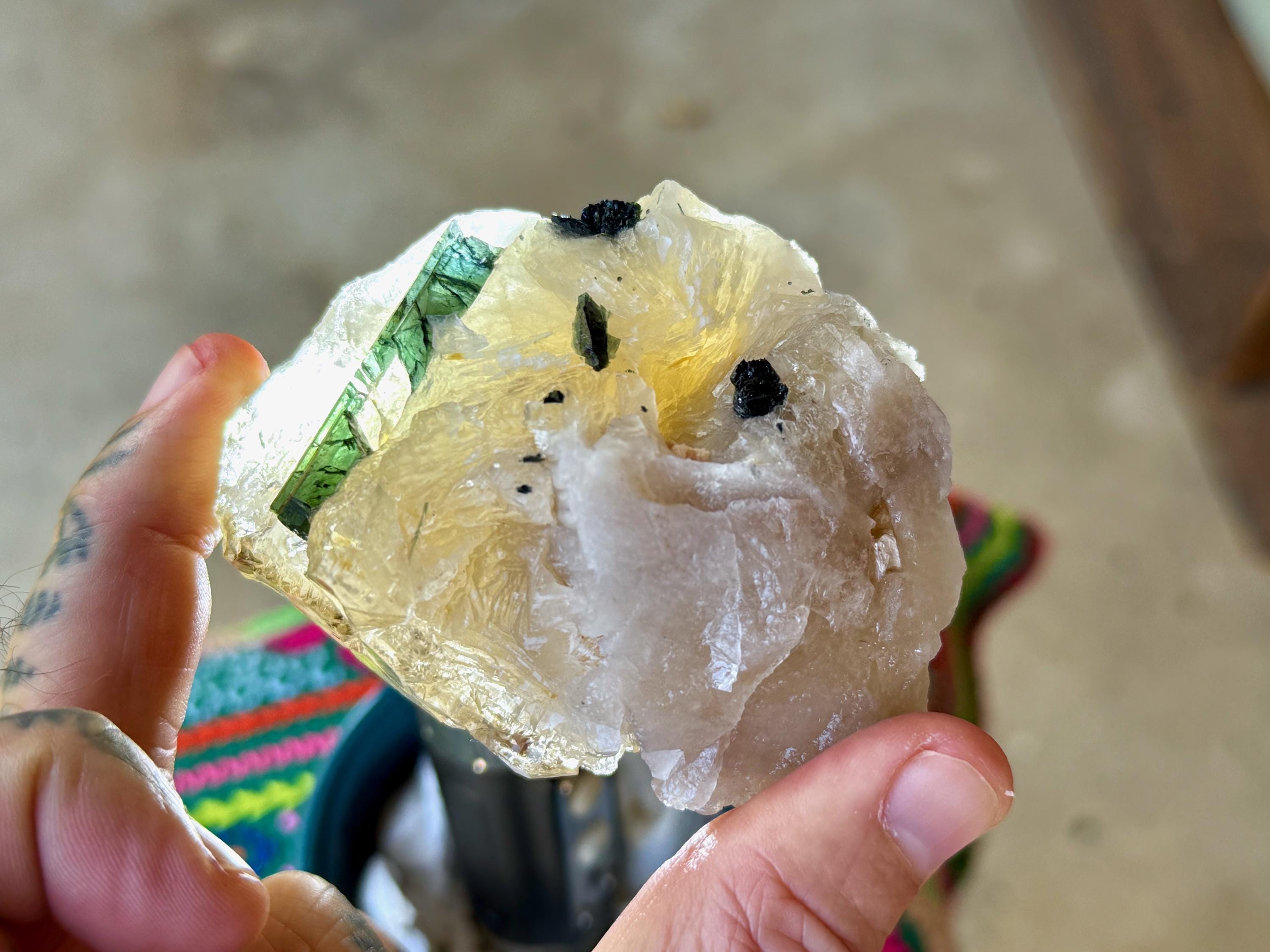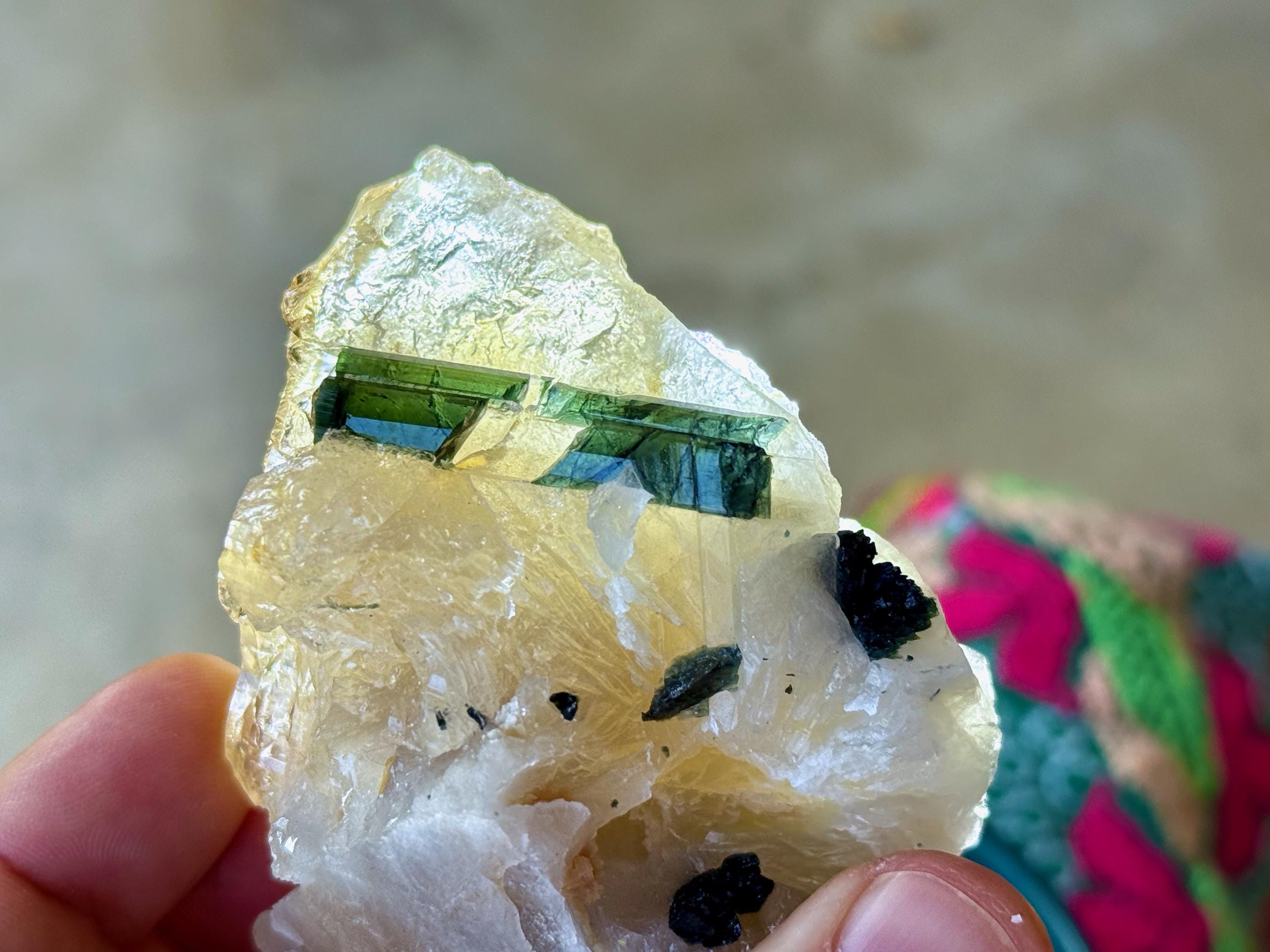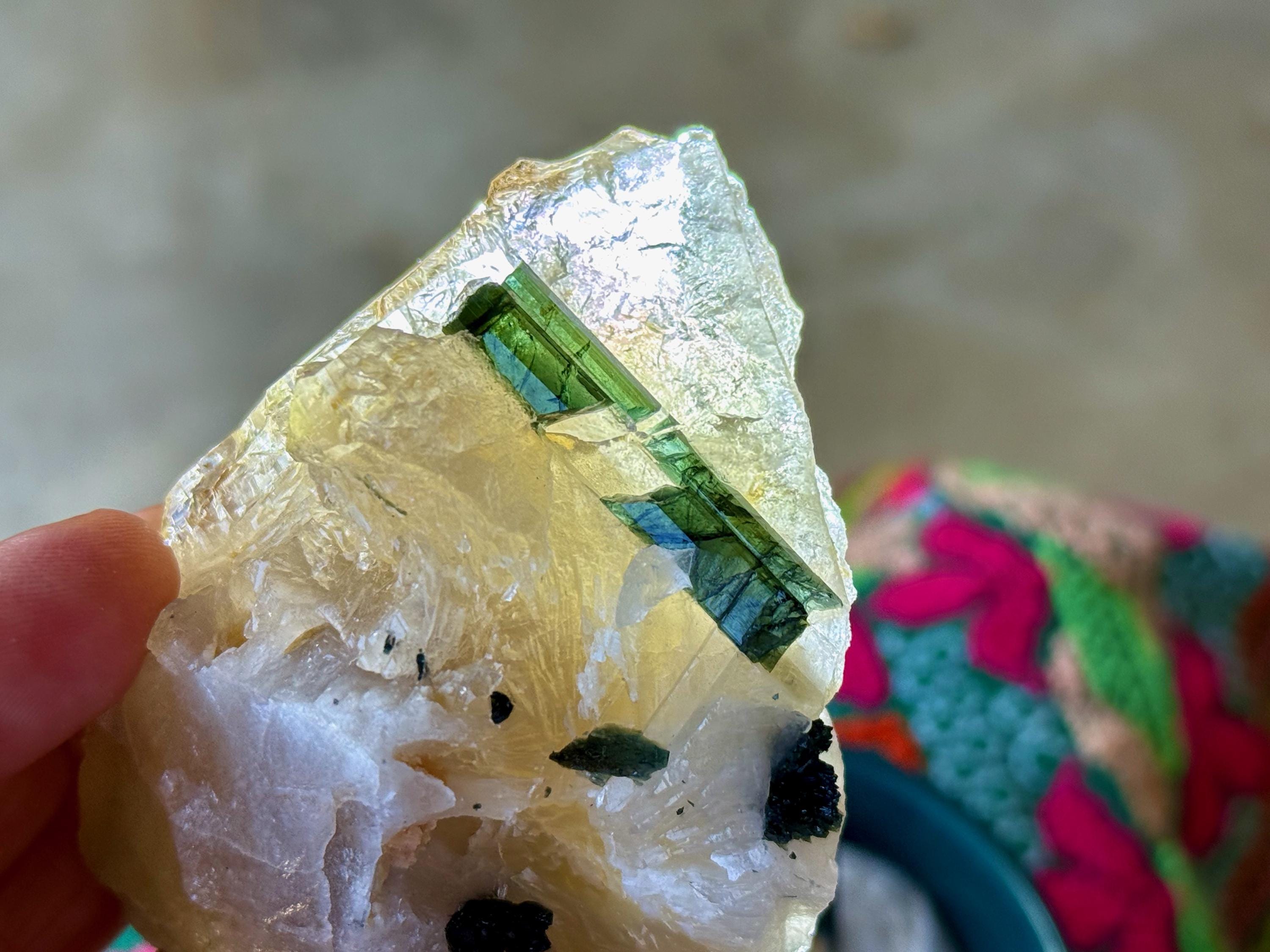 This is a large and chunky Citrine crystal with a mild golden color. When backlit, we can see more of those golden colors come through, and also see just how vibrant and gemmy the Green Tourmalines are (Photos 2-4). The pinkish-white Feldspar on the exterior offers another color and texture to the piece.