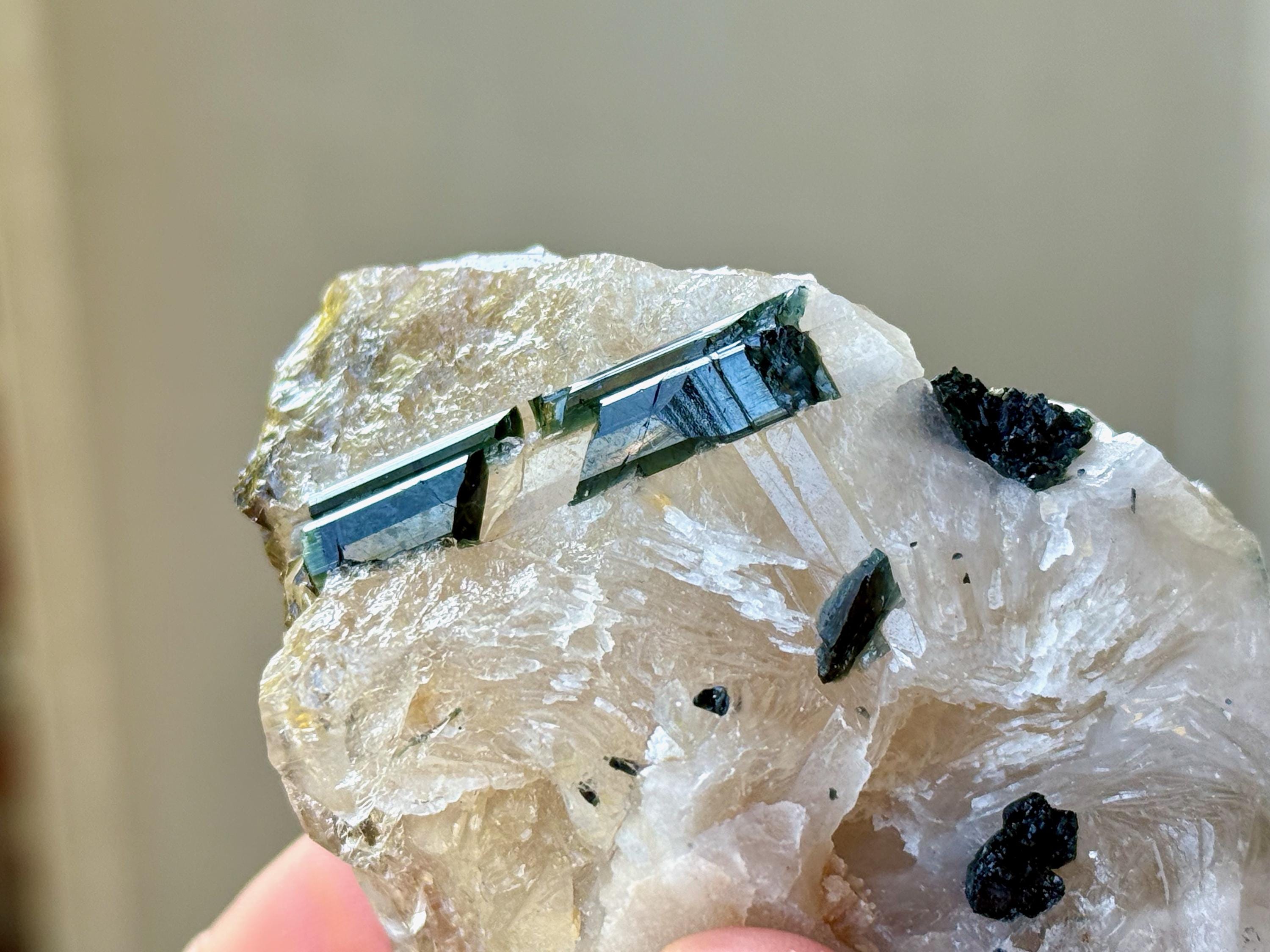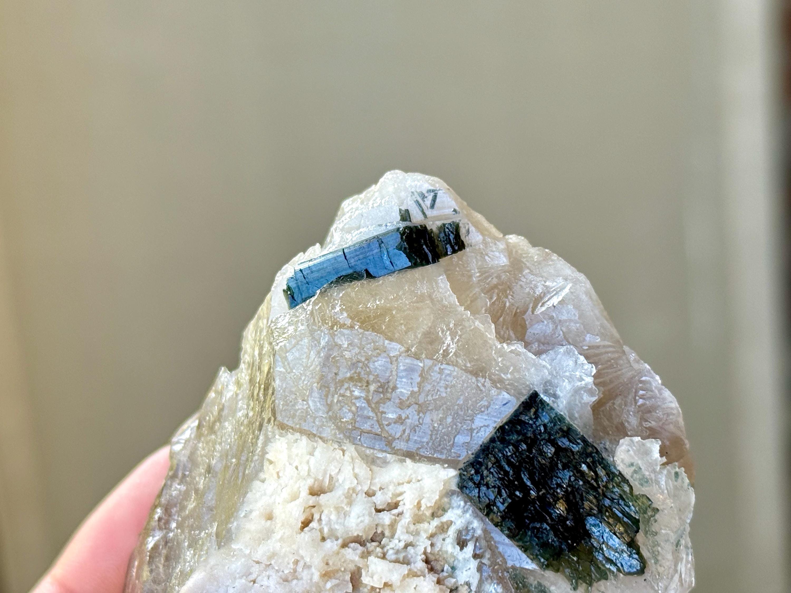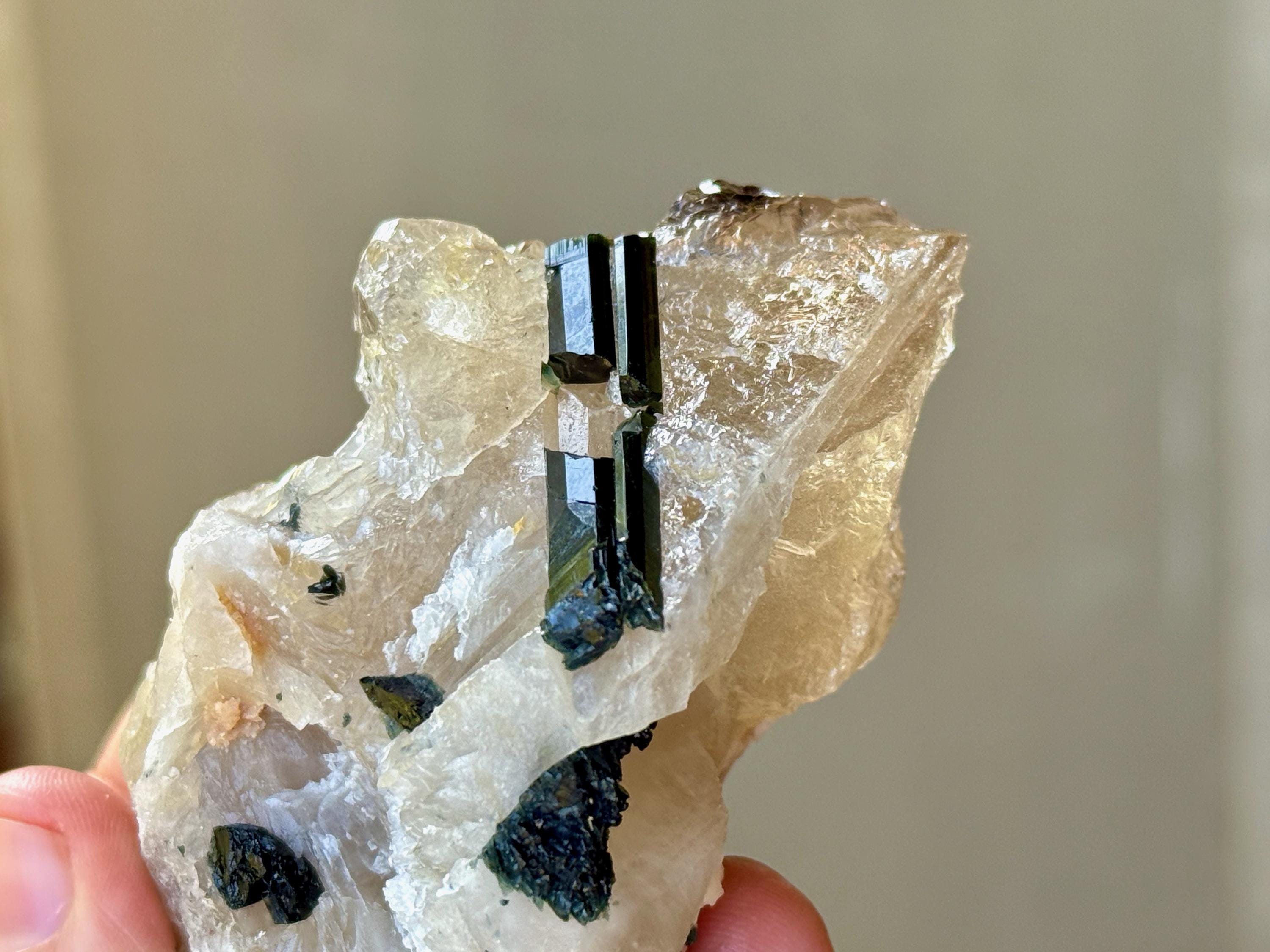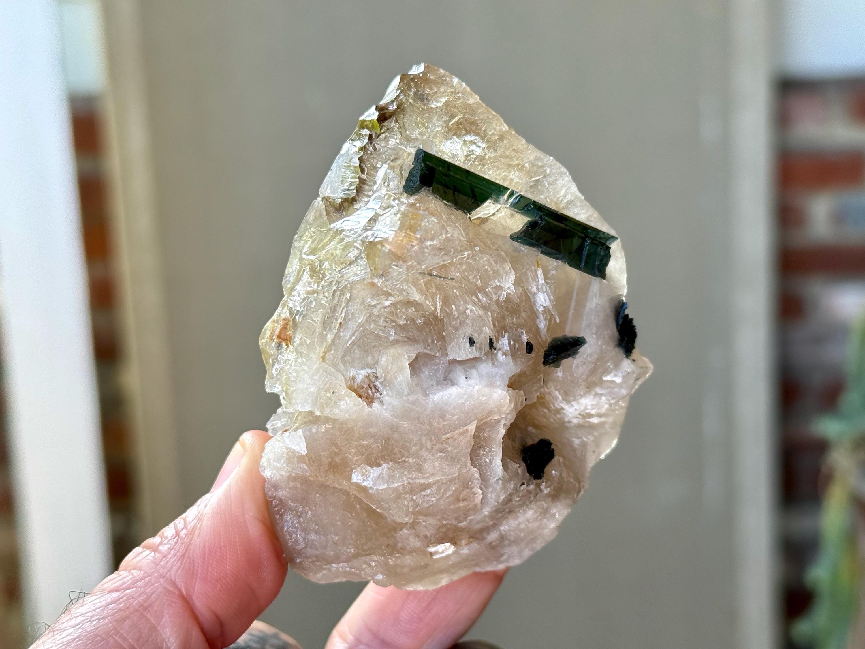 This is a large and chunky Citrine crystal with a mild golden color. When backlit, we can see more of those golden colors come through, and also see just how vibrant and gemmy the Green Tourmalines are (Photos 2-4). The pinkish-white Feldspar on the exterior offers another color and texture to the piece.