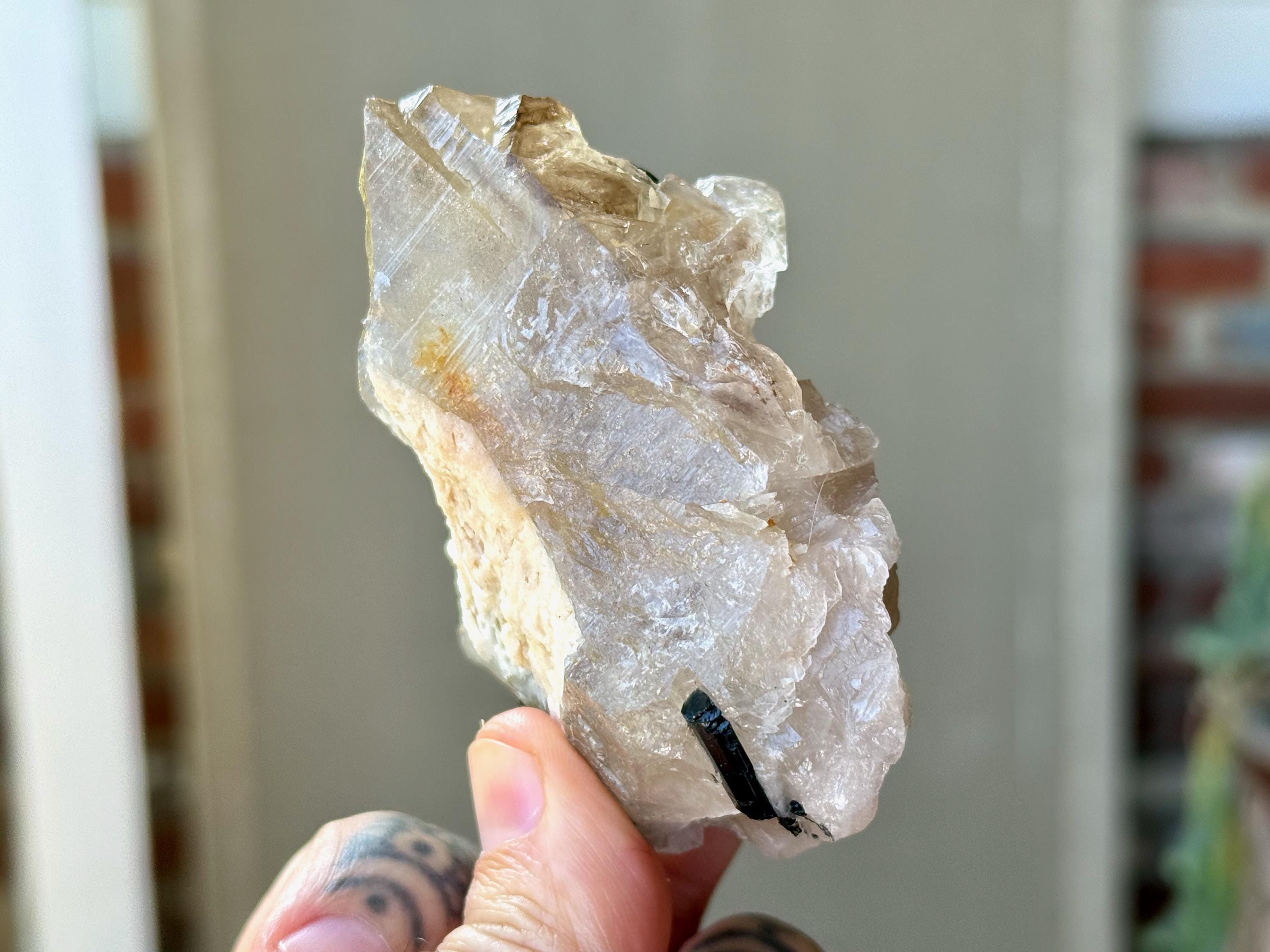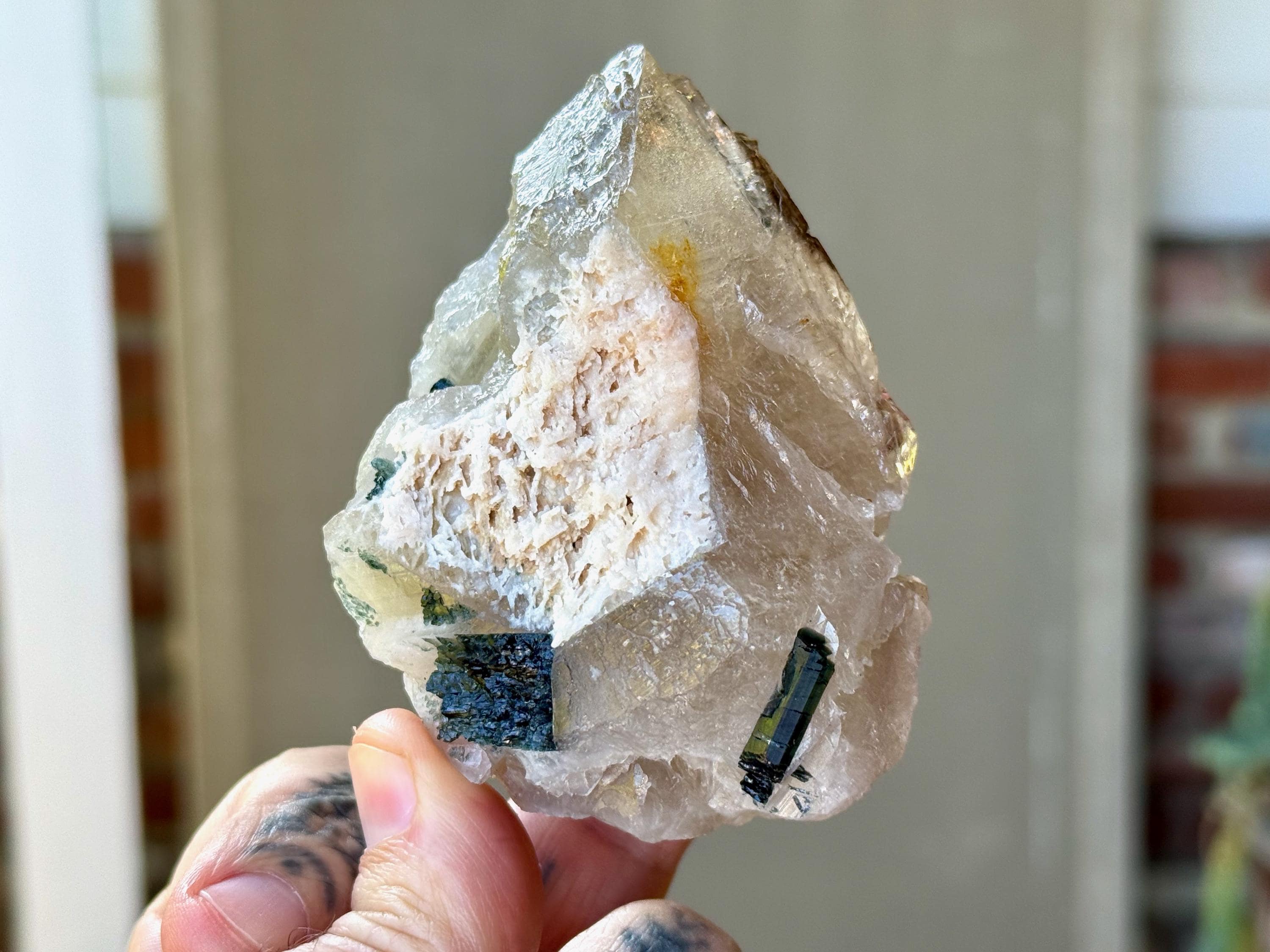 A marvelous combination of colors and energies to this Unicorn Stone crystal with a matrix of Citrine and inclusions of Green Tourmaline and Feldspar throughout!