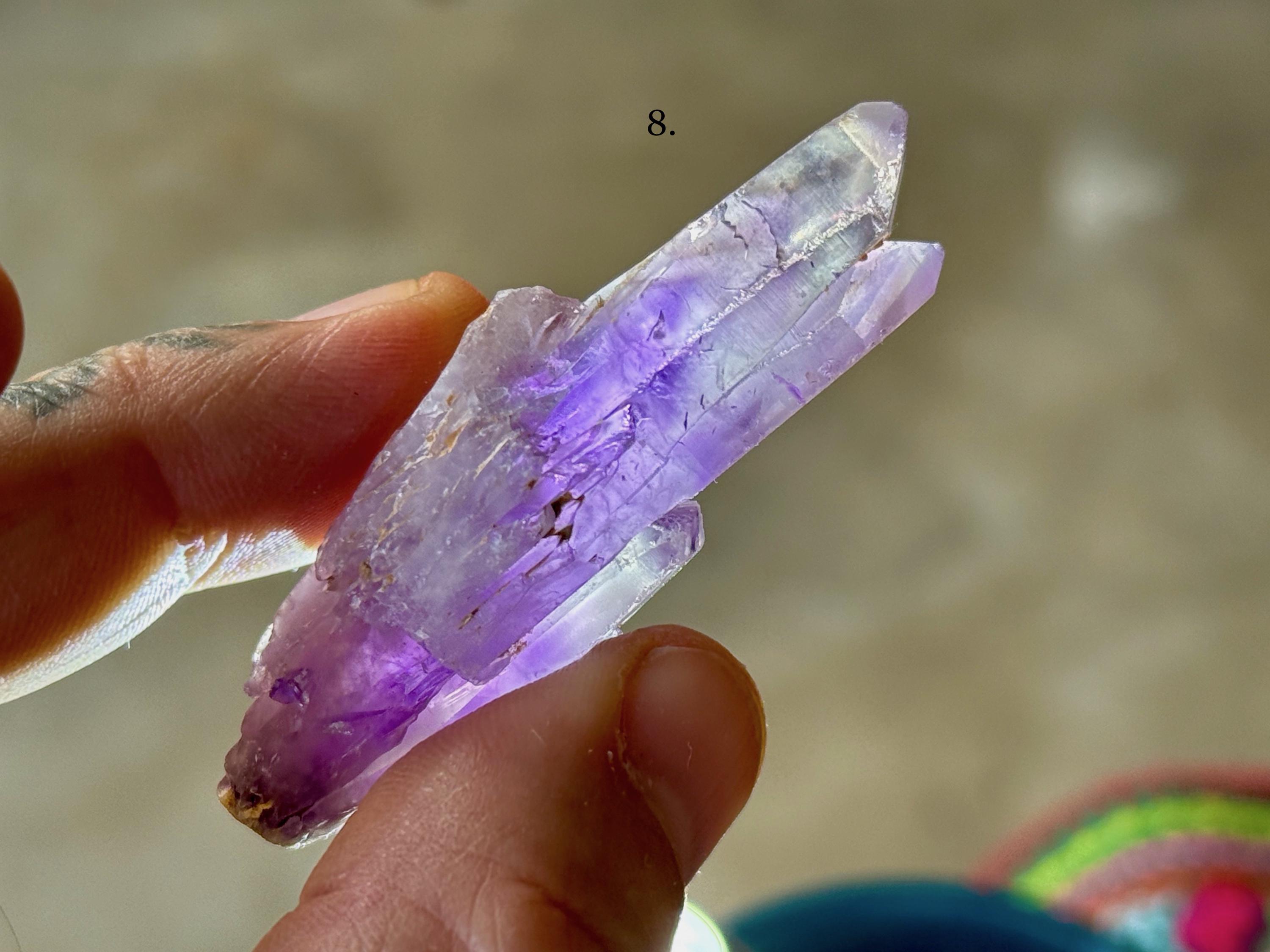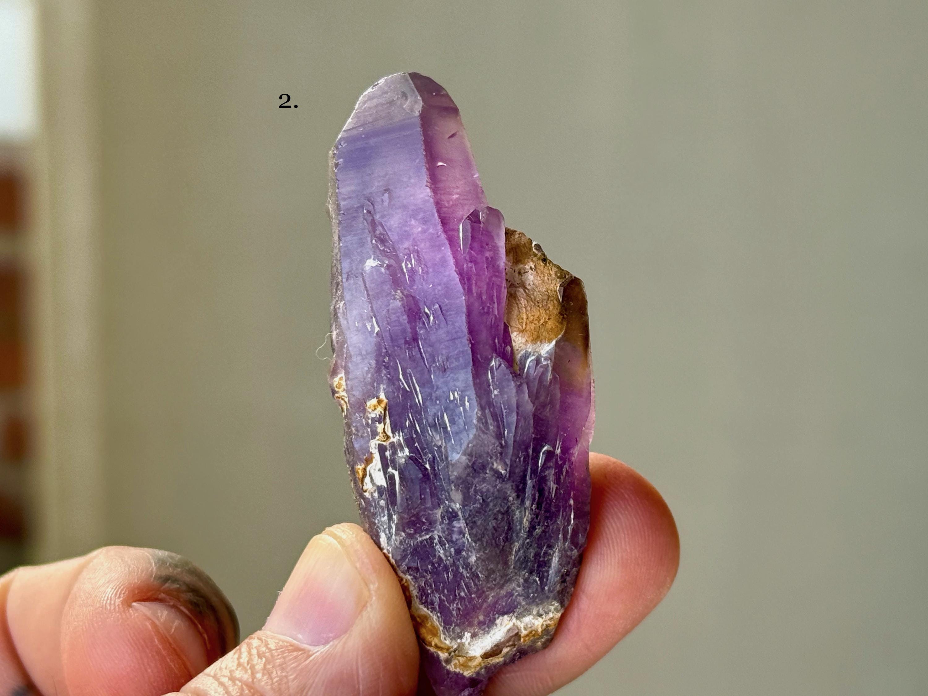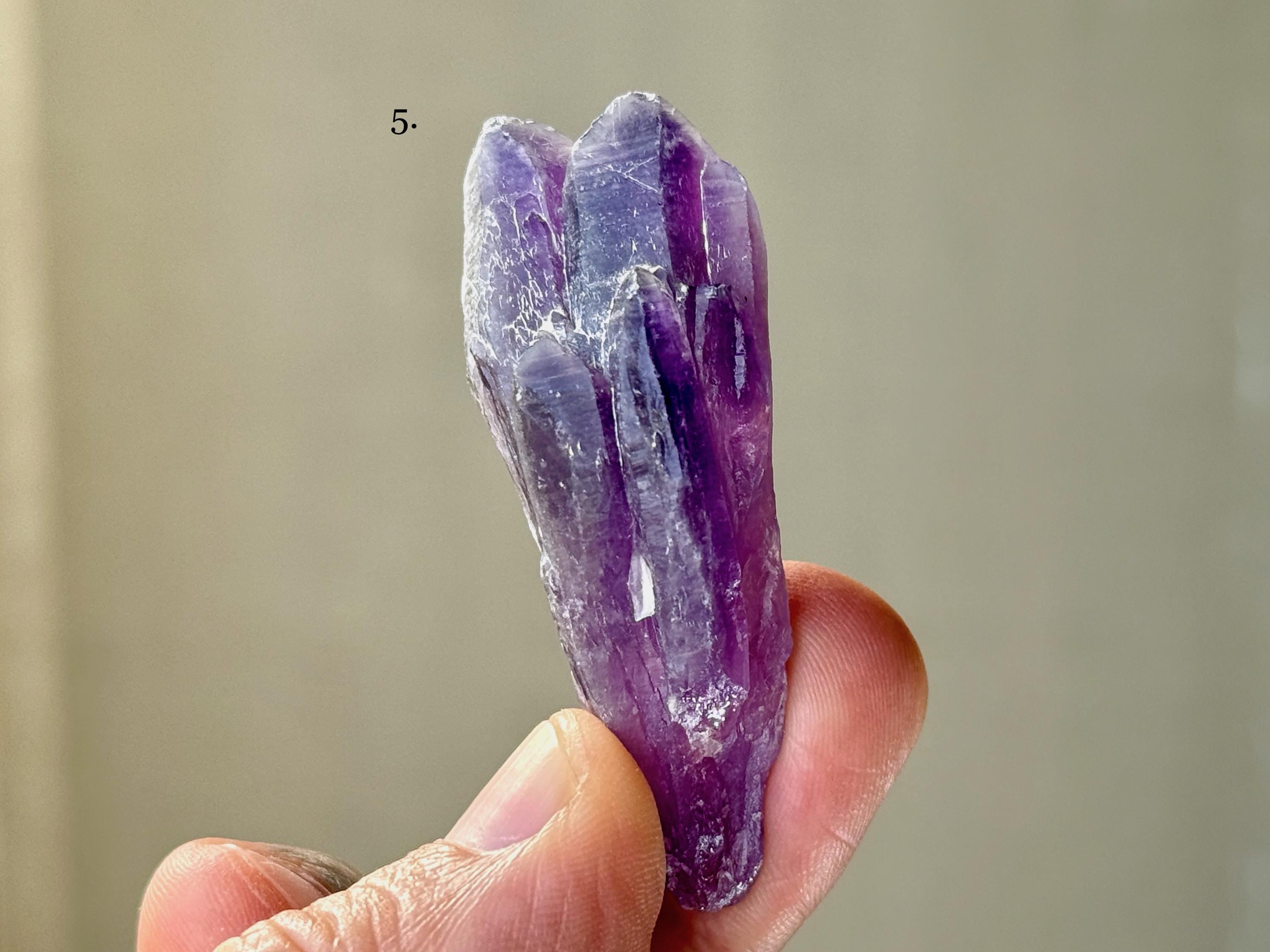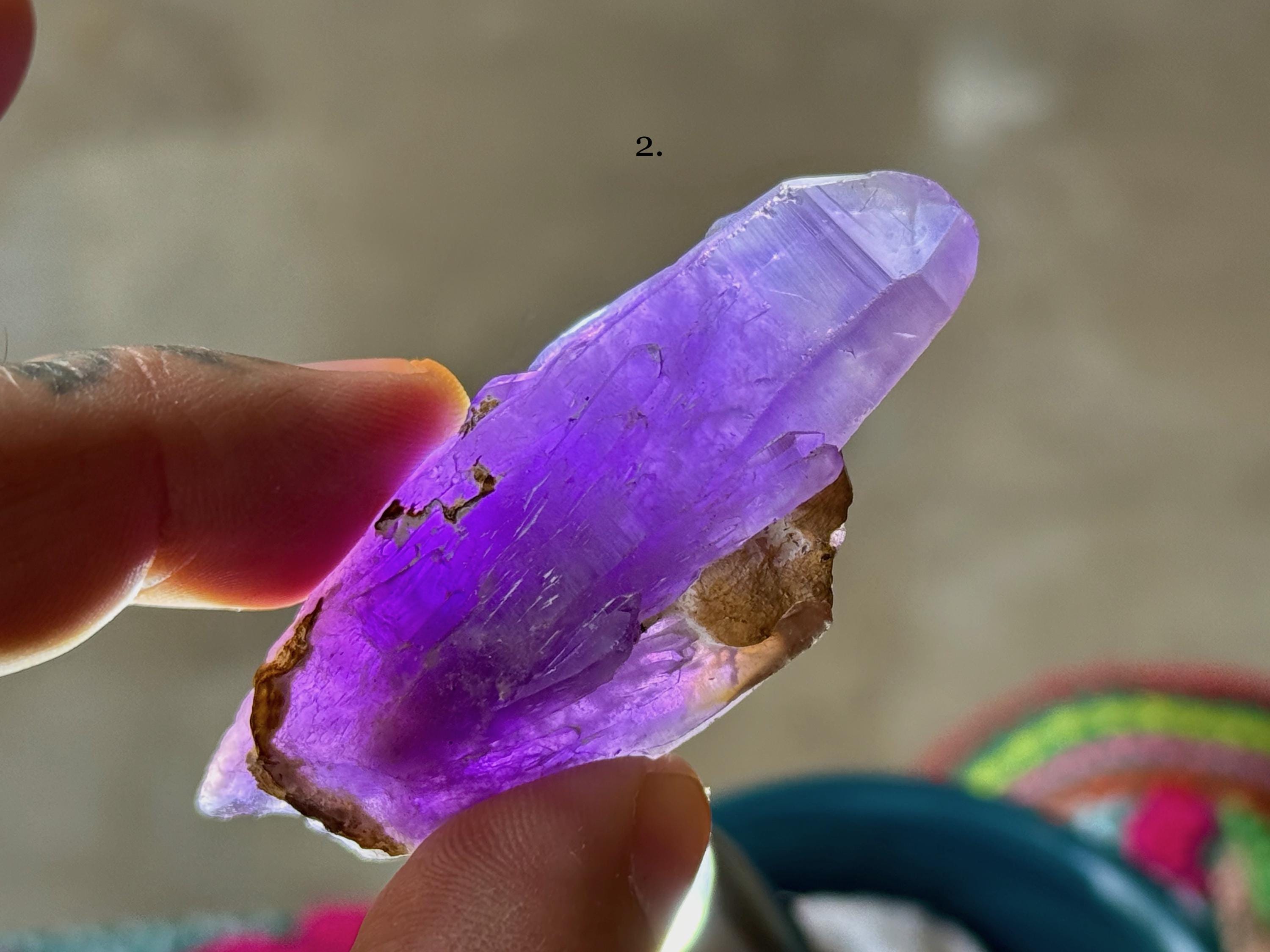 Gorgeous color to these natural Tutu Amethyst crystals in a variety of formations. We've included photos of each in natural light and backlit so you can see their beautiful translucency.