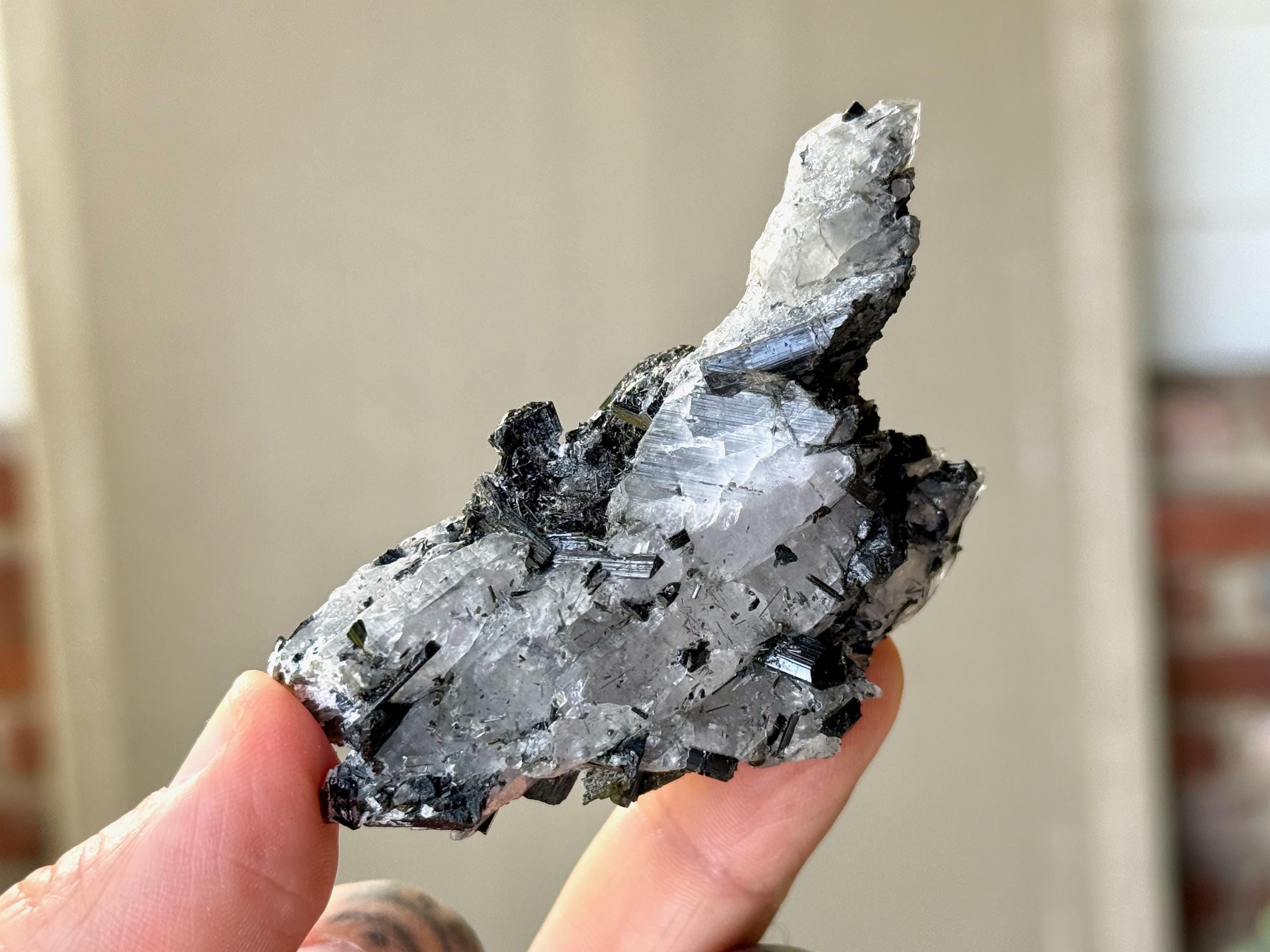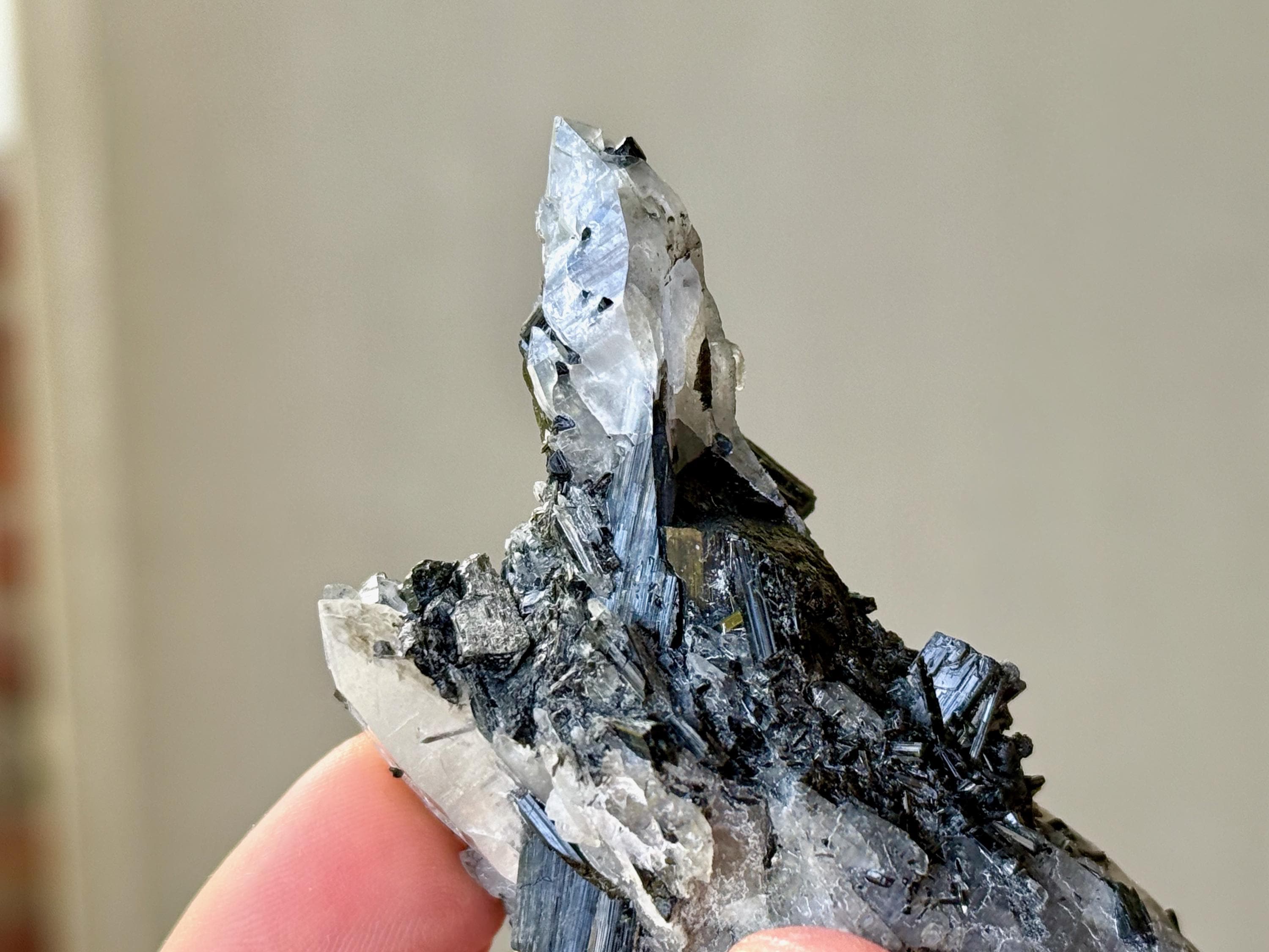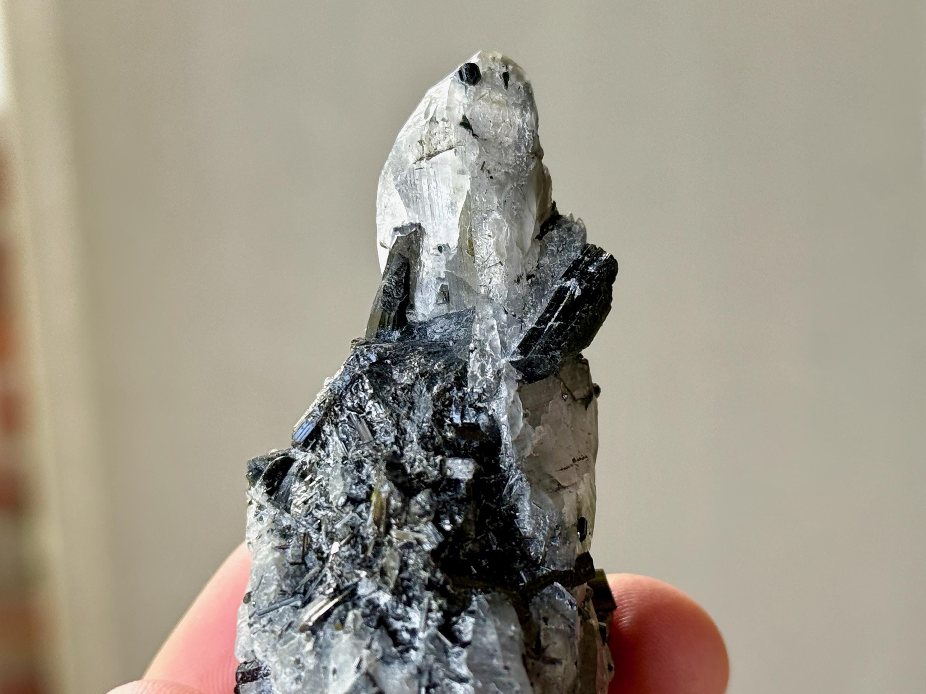 Absolutely beautiful! This is one of the larger pieces from this collection, featuring a very lustrous Quartz cluster with ample Black Tourmaline inclusions growing inside of it, through it, and on the exterior embedded as well. The exterior is simply filled with beautiful Black Tourmaline growing in every crevice and contrasting beautifully with the quartz underneath. The terminations are excellent. Really a marvelous crystal from this small find.