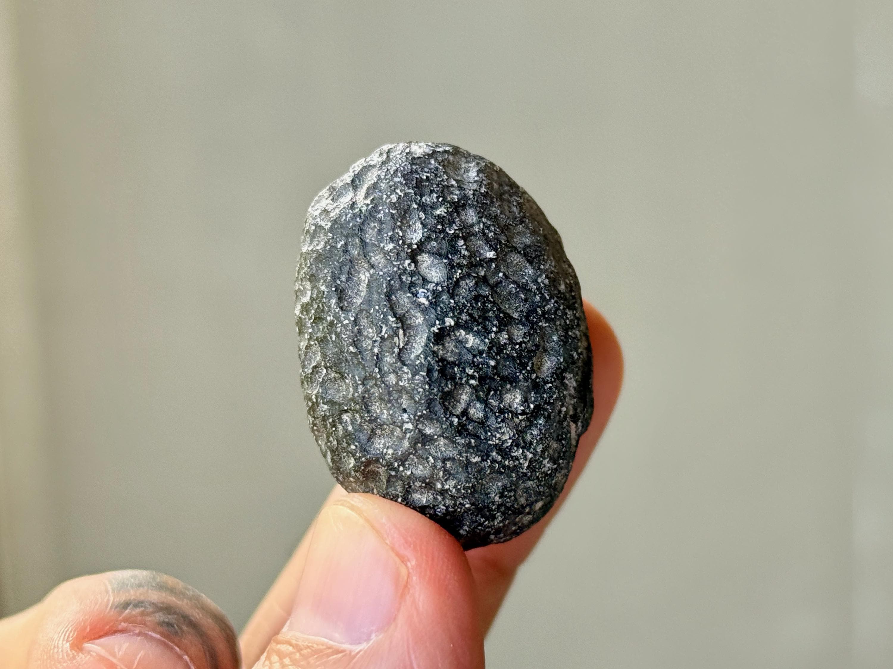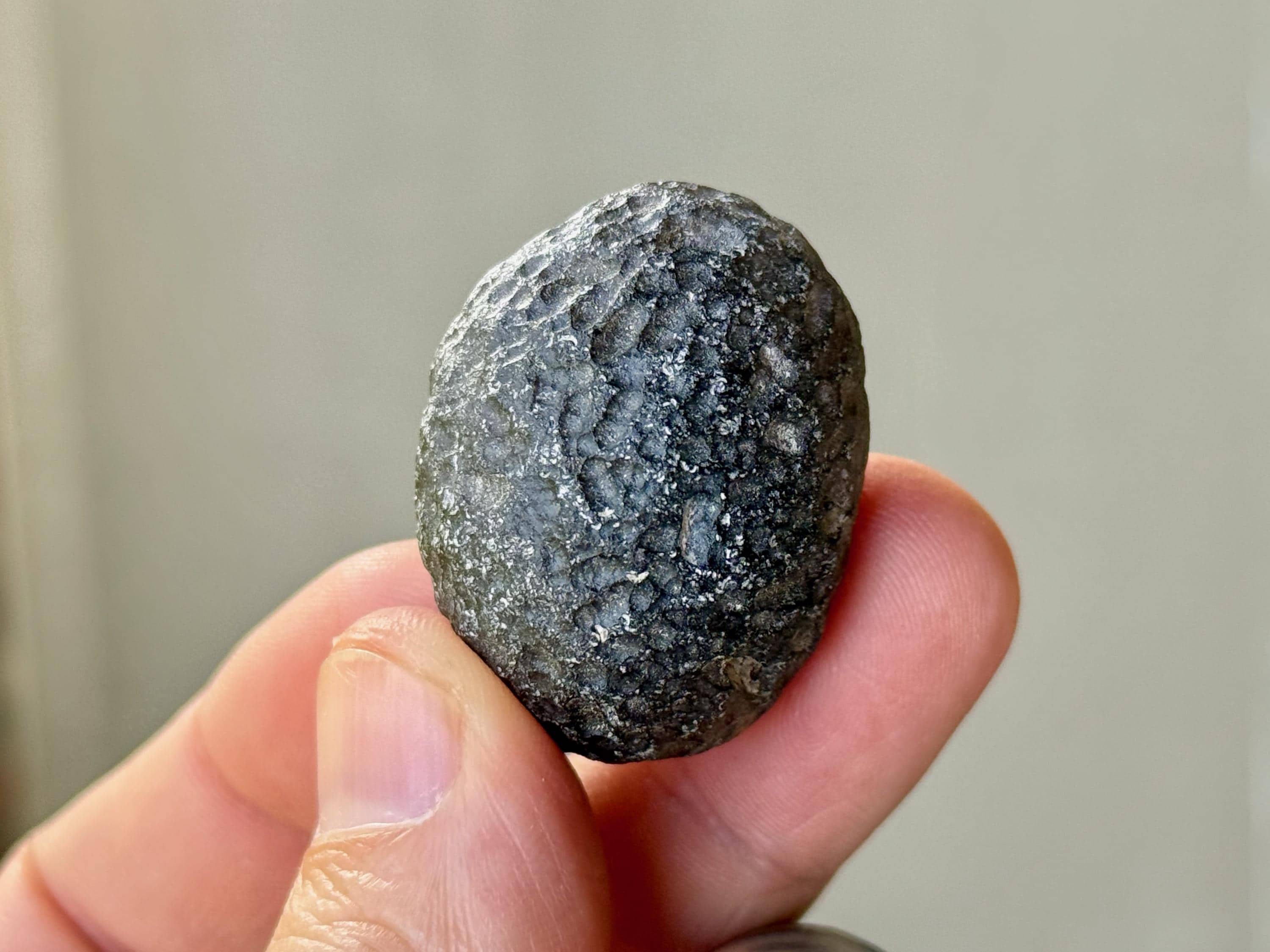 This piece features an ovular formation, very well-rounded and symmetrical. It displays consistent pitted markings throughout its entire exterior. It doesn't have a very high luster, perhaps due to a mild frosting of white minerals on the exterior (this may be able to be cleaned if you wish to try).