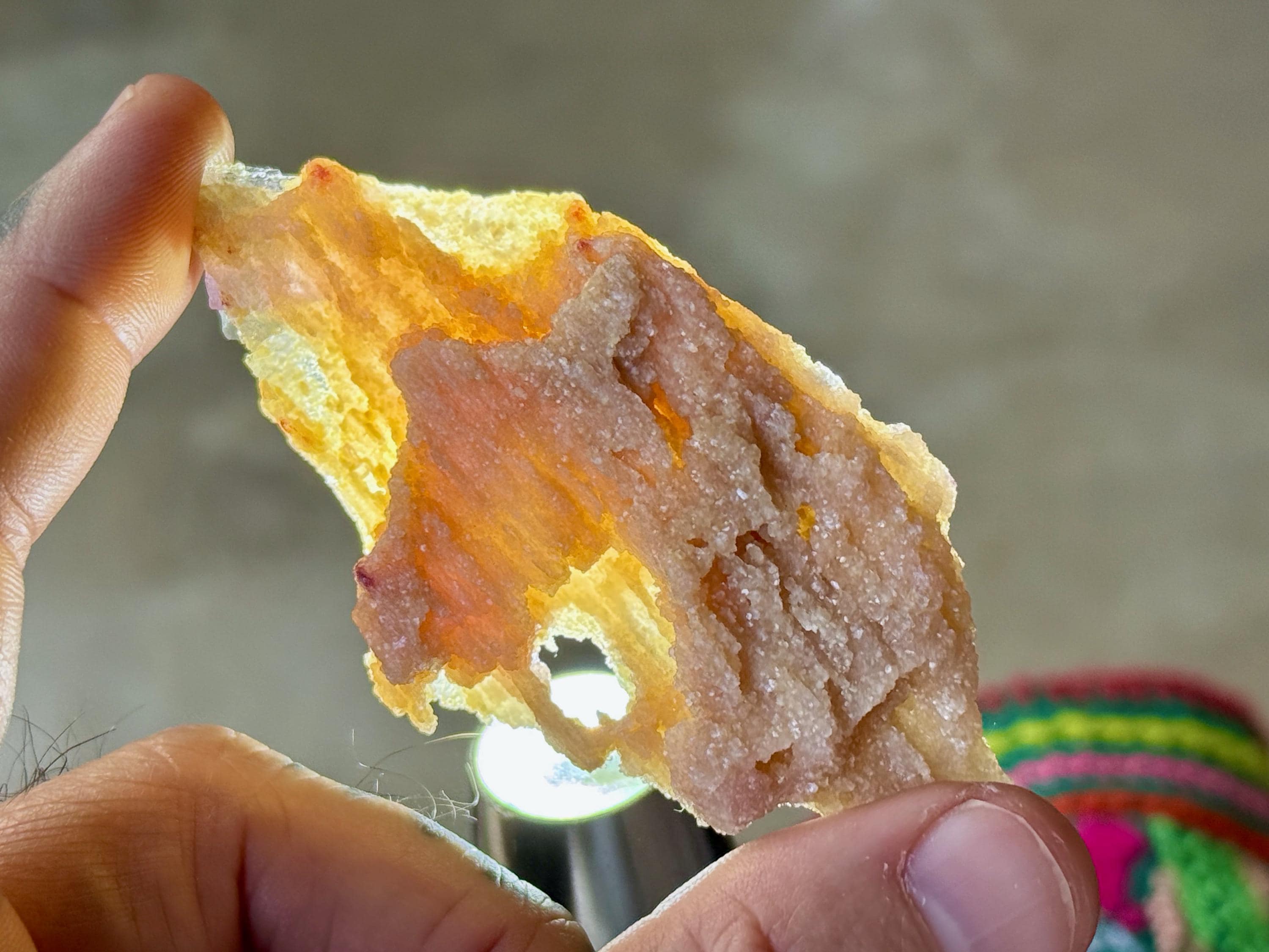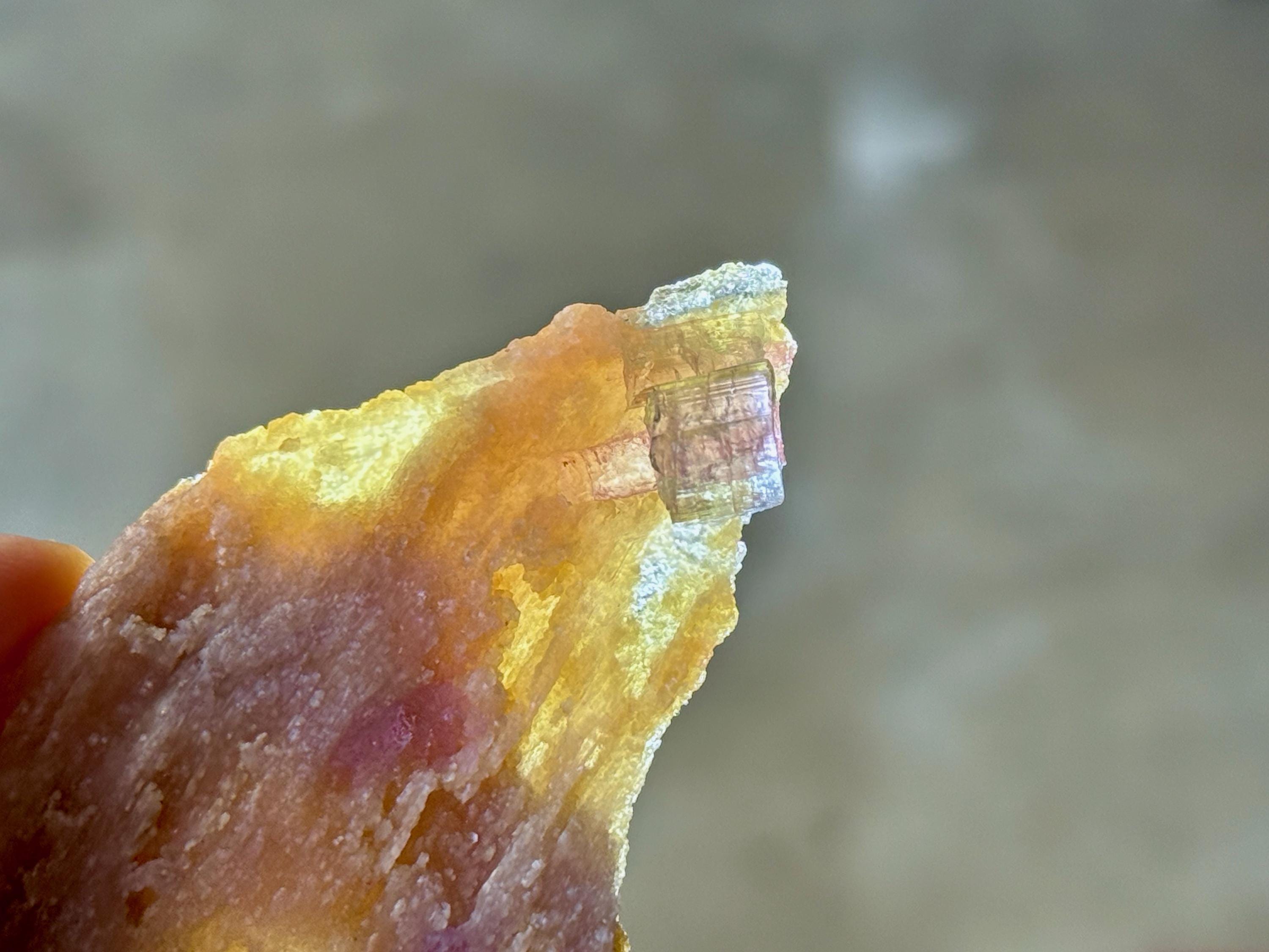 A very unique broad, flat and textured formation to this stunning Golden Mica that reminds us a bit of a coral reef! Embedded at the tip is a very clear, gemmy Bicolor Tourmaline with a pink core and a nearly clear exterior with just a hint of pale blue-green. When backlit, the entire piece passes light beautifully. Super pretty!