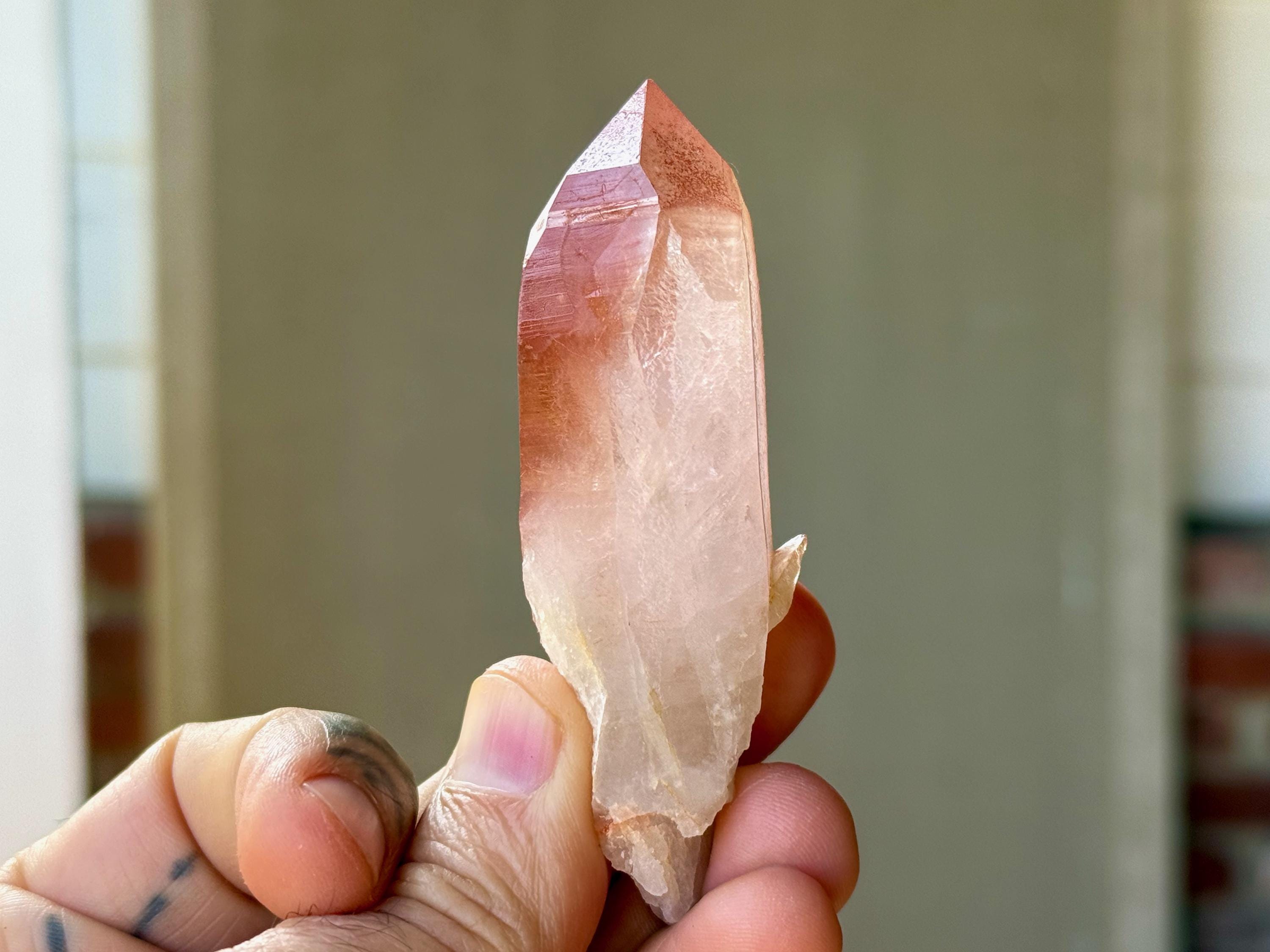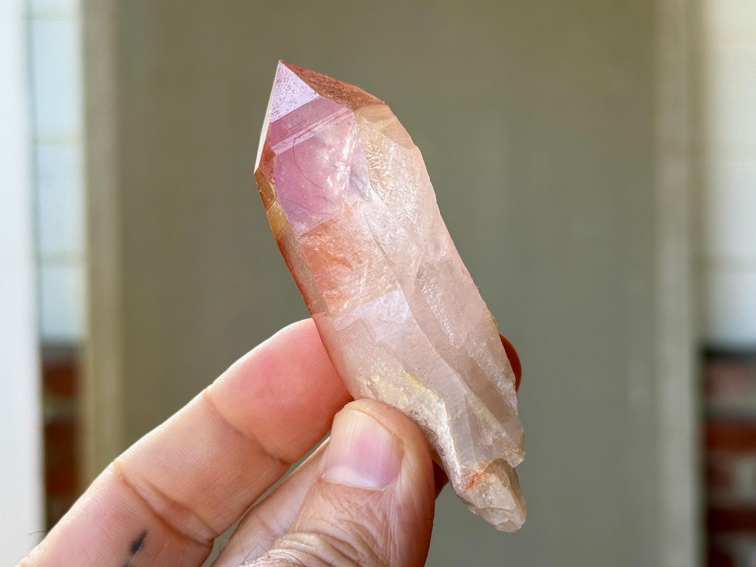 Vibrant pink color to this superb Scarlet Temple Lemurian Quartz crystal in an elongated point formation. We love how in this crystal, there's a gradient pink hue that starts nearly white at the base and becomes more and more saturated toward the top.