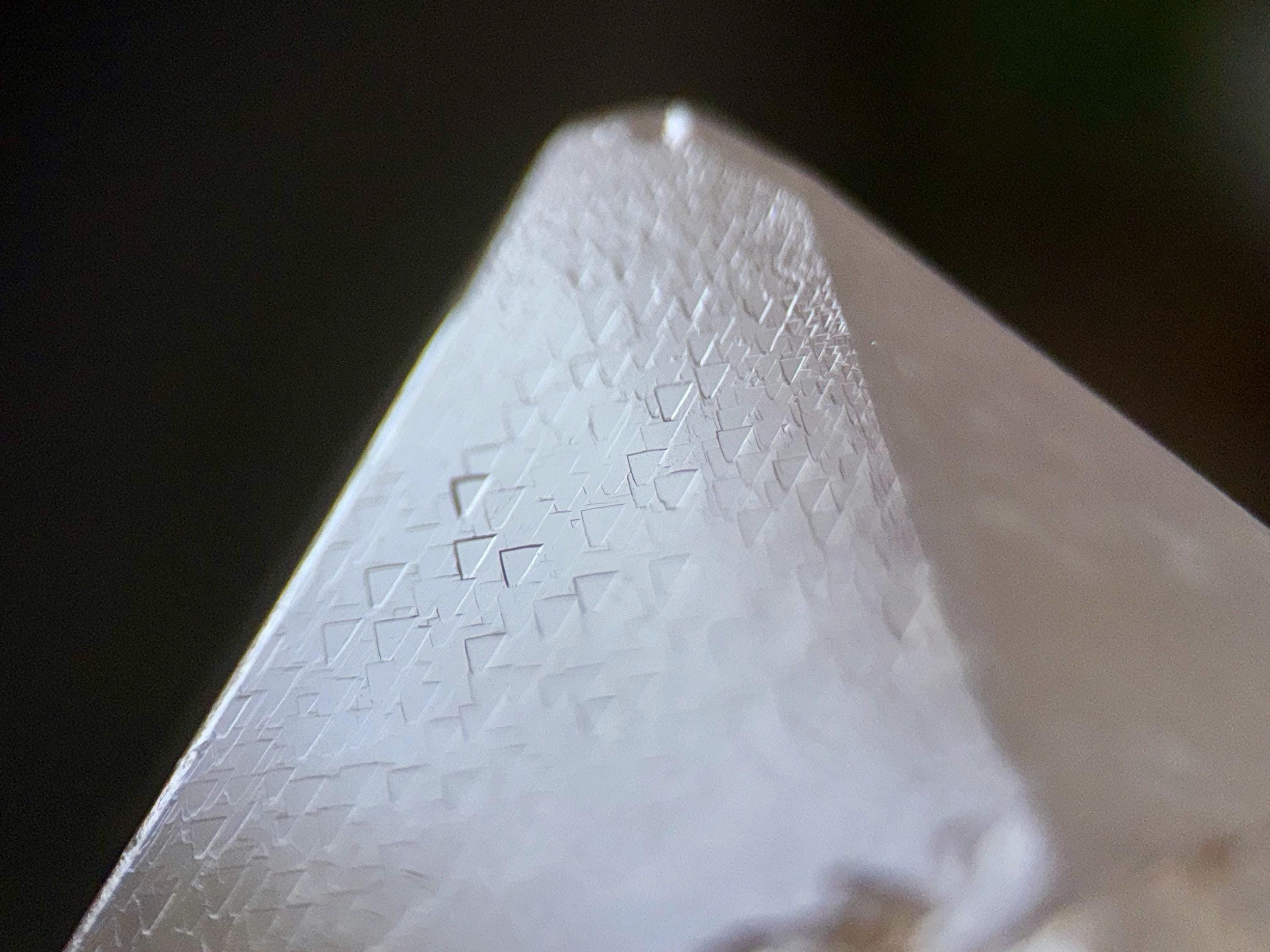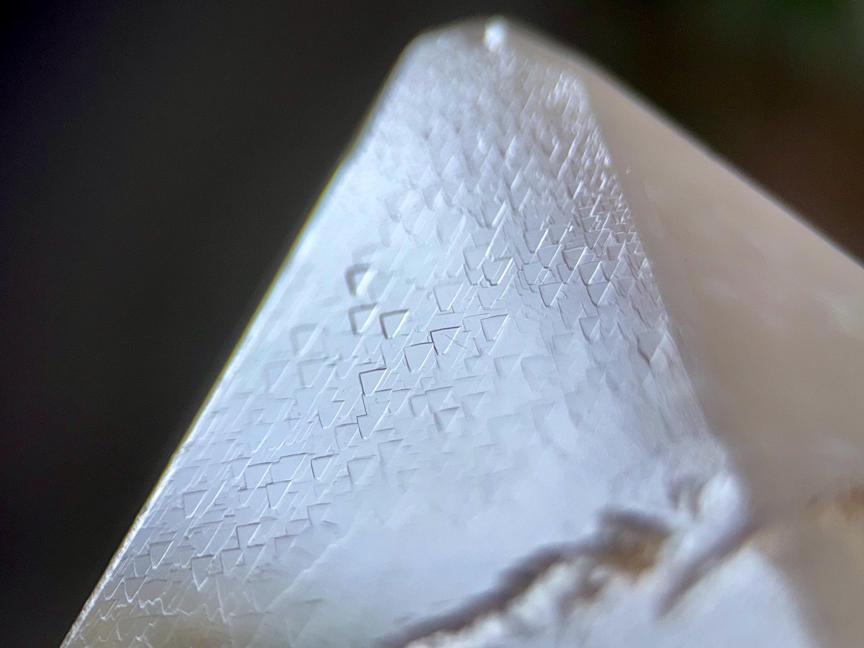 Of course what is most special about this piece is the multitude trigons on each of the main facets. These trigonic imprints range in size and depth, with the ones on the back left facet being the largest and deepest (Photo 1). The other facets display smaller and milder trigons, but all are visible. The smaller ones are best appreciated with a jeweler's loupe or magnifying glass. We've included a few photos taken with a macro lens to show them off in detail (Photos 5-9).