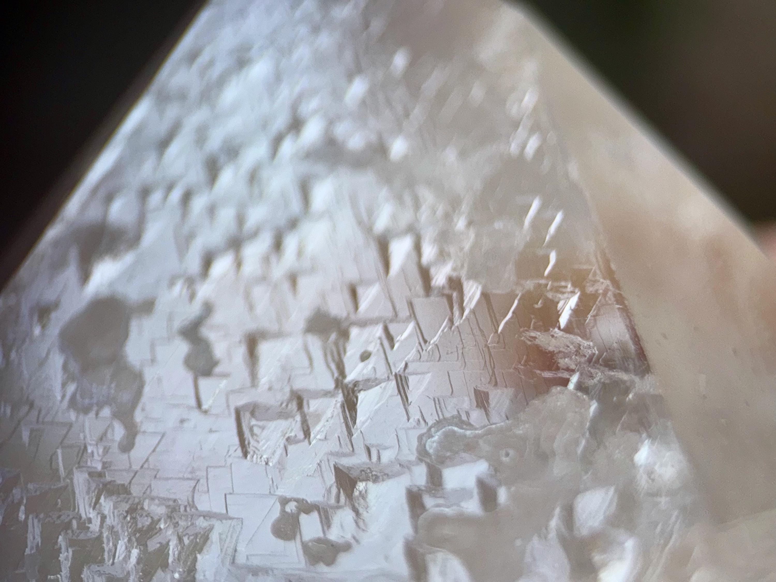 Dissolution crystals have unique natural etchings and formations due to their creation and evolution process. They form in the ground as crystals, just as any other, but then at some point in the later stages of their development, a hydrothermal solution at their source (in the form of very hot, flowing, mineralized water most likely) comes through and actually pulls molecules away, creating beautiful natural etchings and distinct formations. These kinds of crystals are essentially carved by underground water flow over millions of years!
