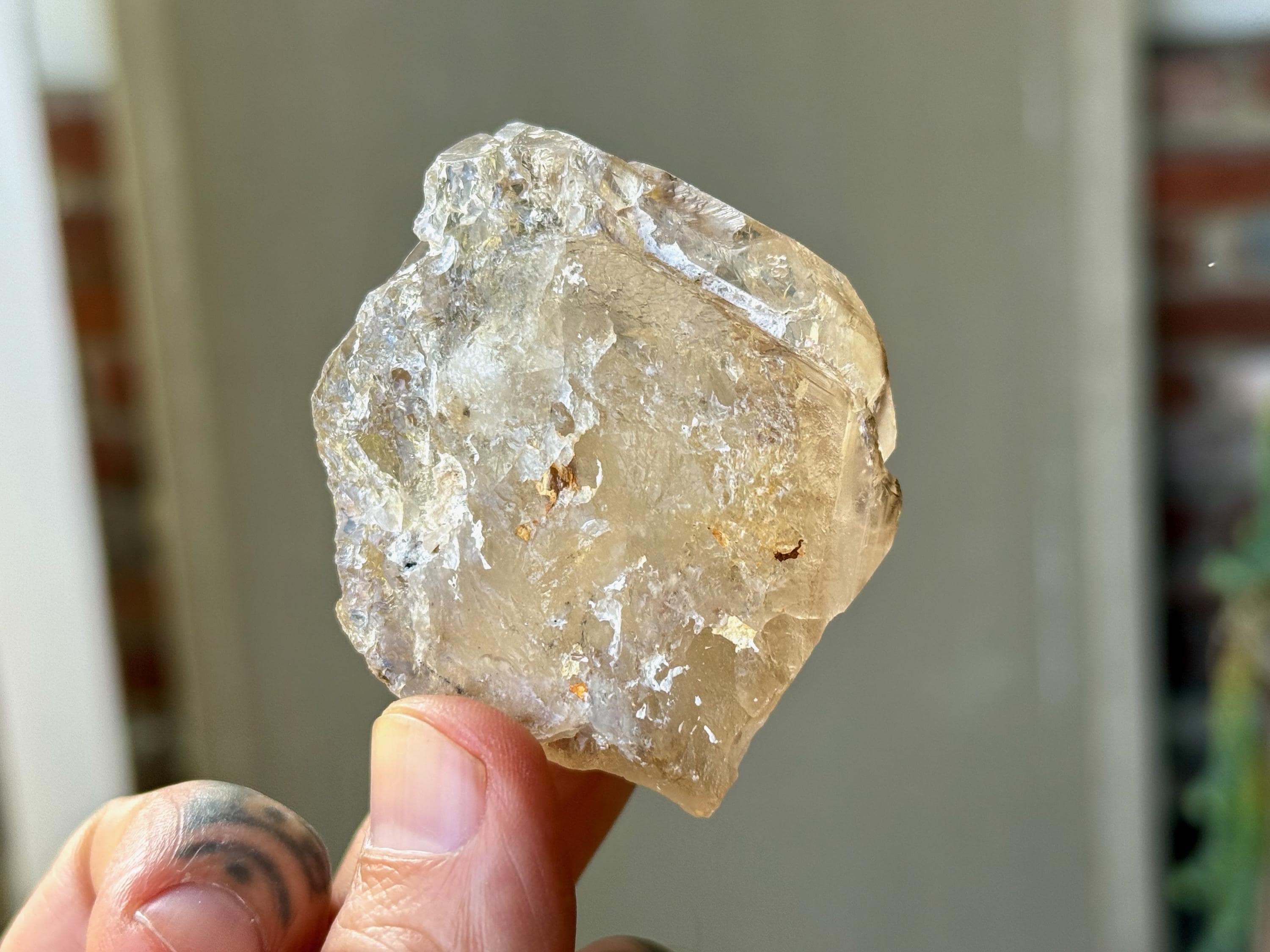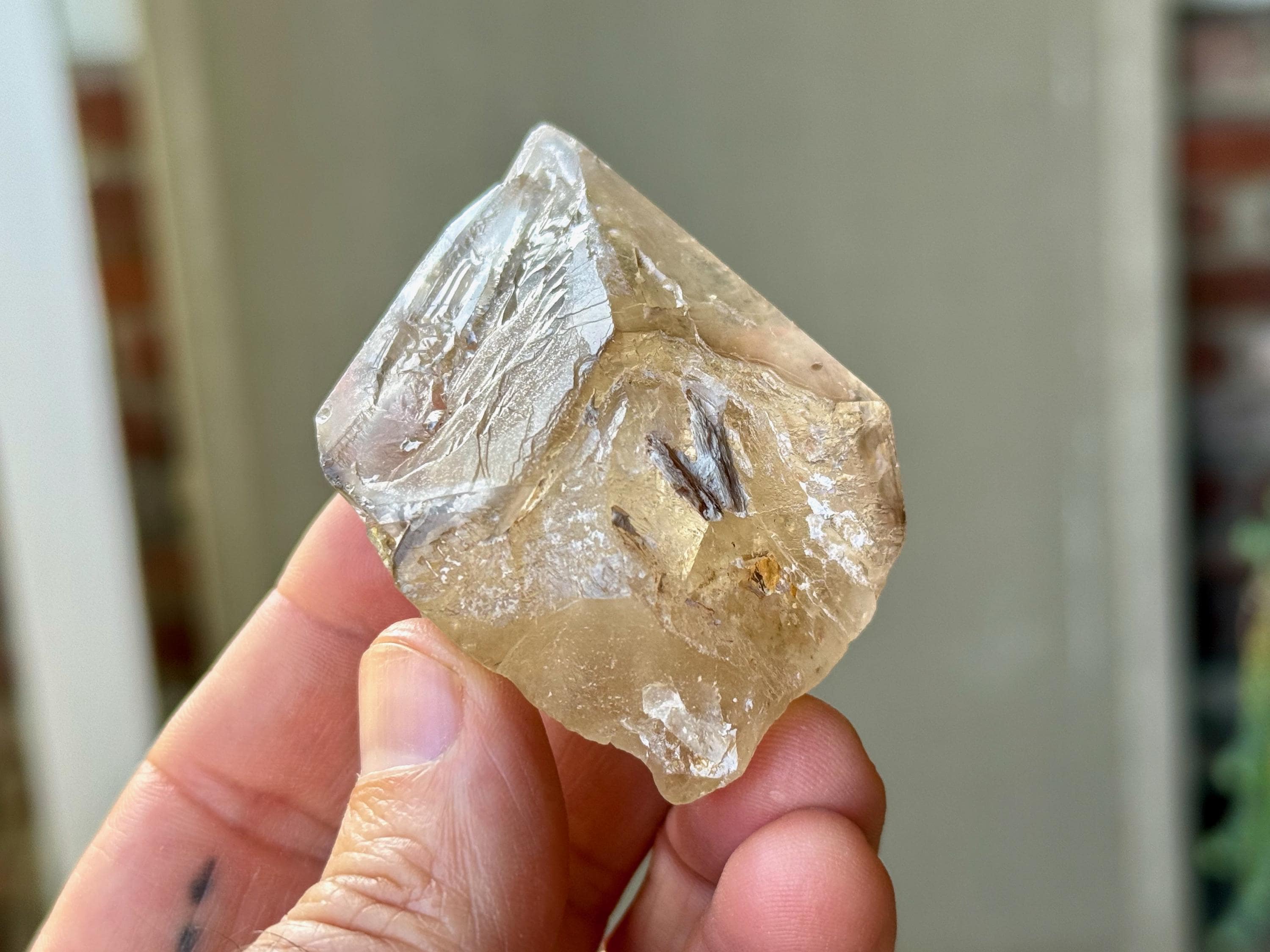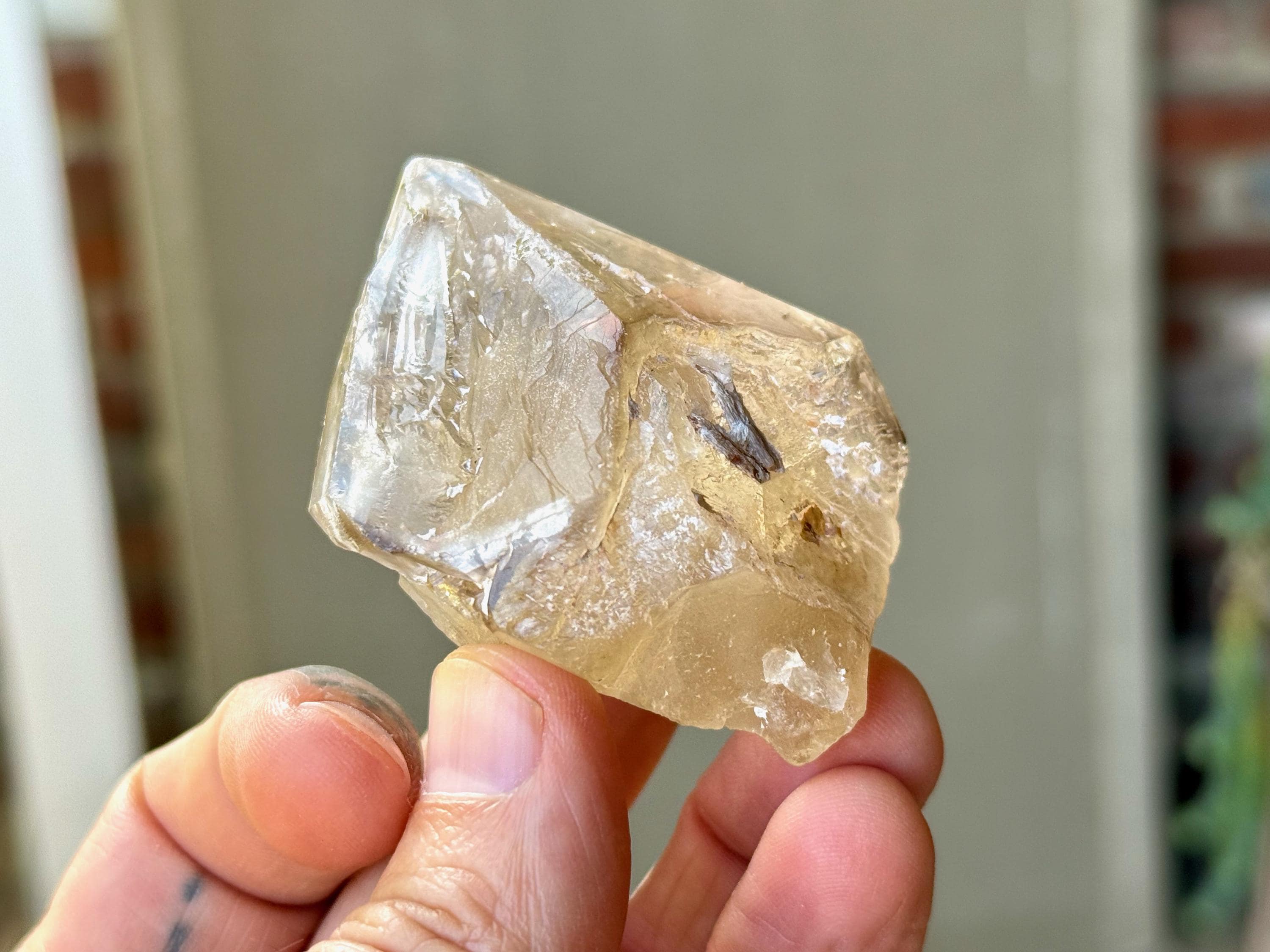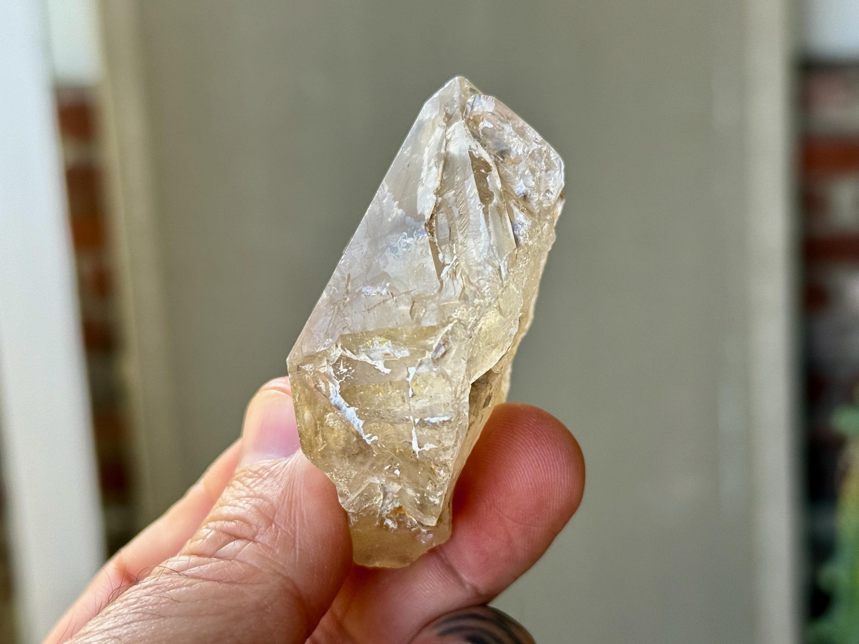 Brilliant luster and magnificent clarity to this stunning Elestial Citrine with a giant main facet and a mild golden color. The main facet displays some beautiful etched impressions. And when backlit, this piece lights up beautifully (Photos 4-5).