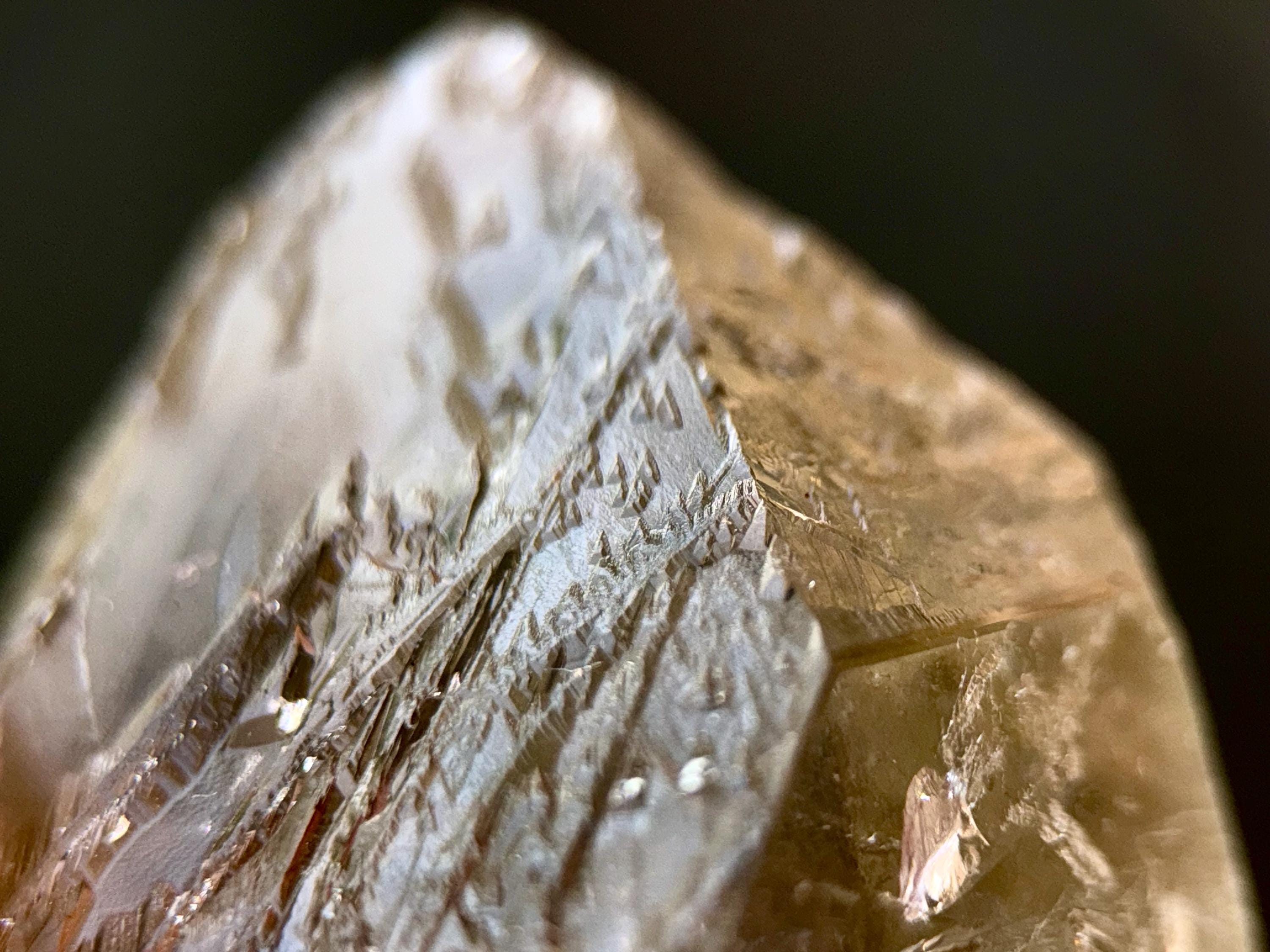 The main facets of both crystals are heavily etched, and when we take a close look, we uncover several *very* tiny raised Record Keeper triangles on the right side of the main facet. These Record Keepers are very small and barely visible with the naked eye, so they are best appreciated with a jeweler's loupe or magnifying glass. We've included a few photos here taken with a macro lens to show them up close (Photos 4-5).