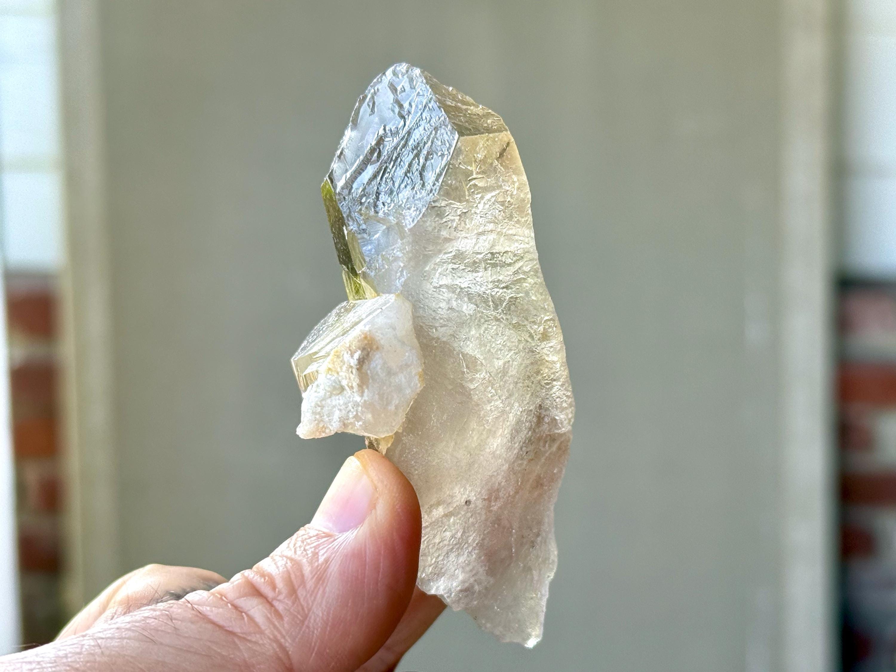 Outstanding clarity and luster to this superb Quartz Crystal with inclusions of dark Green Chlorite running up its back right side. This crystal is a "Mother and Child" formation, with a smaller "child" embedded on the back of the "mother" (see more on this formation below).