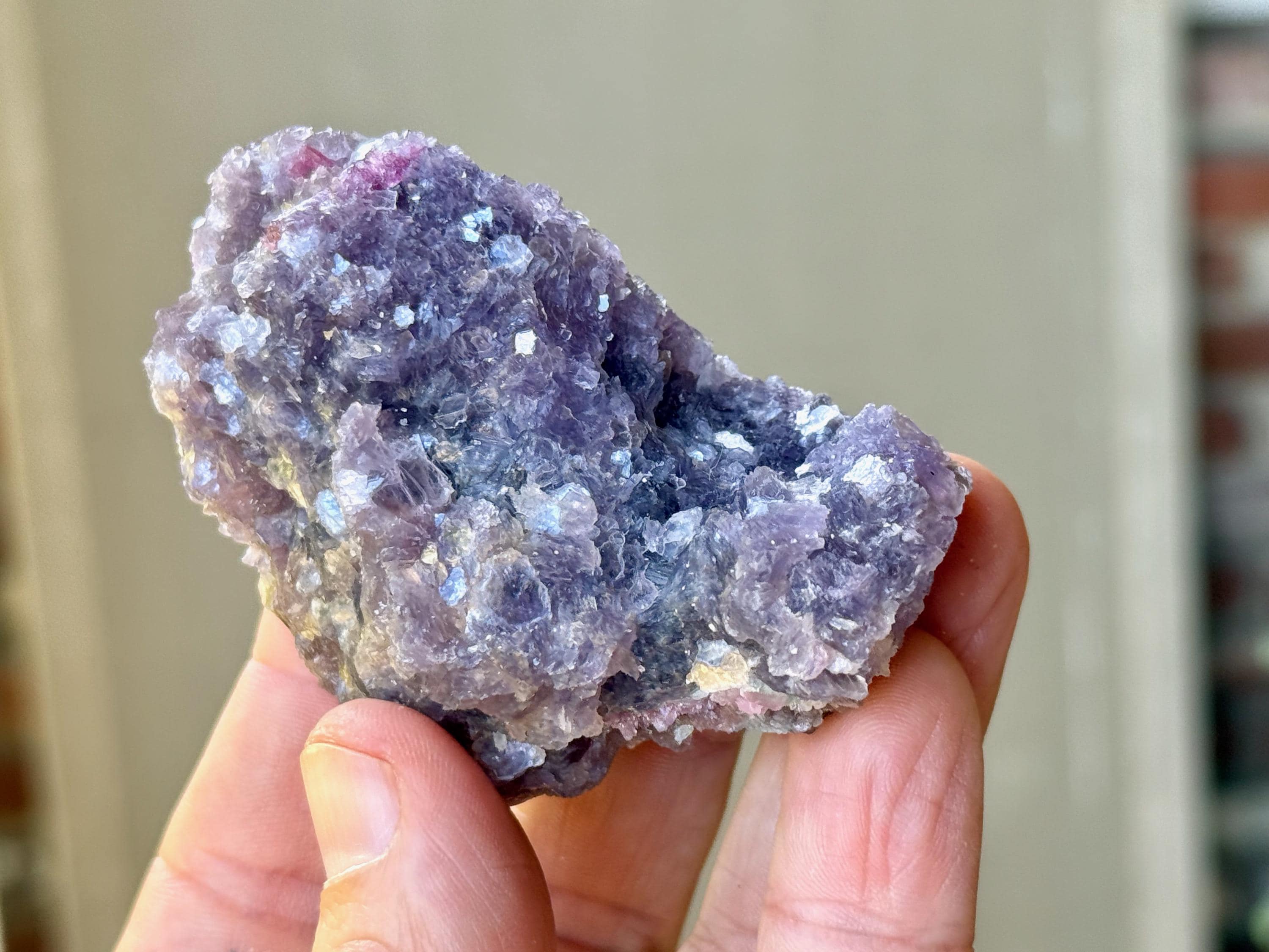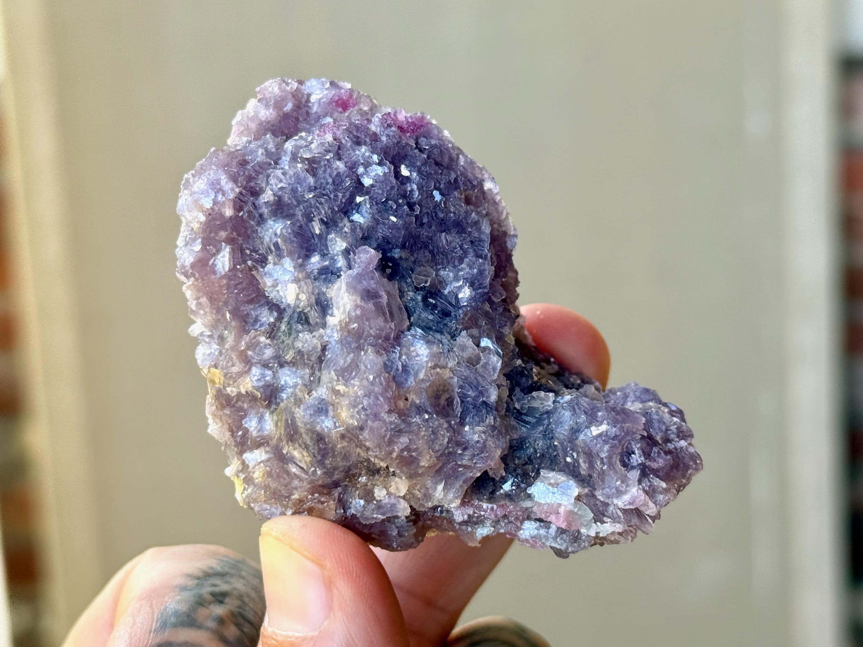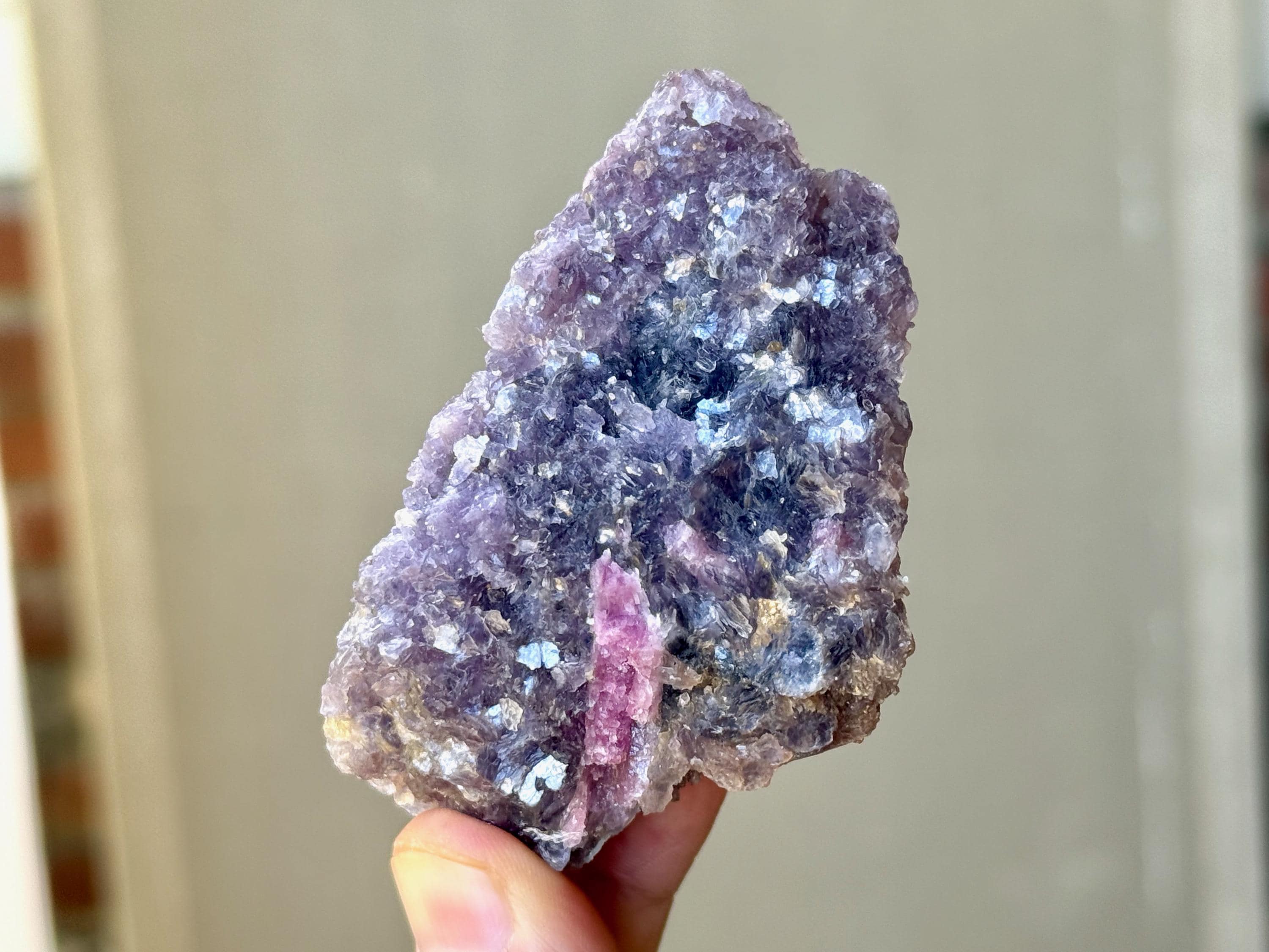 Gorgeous, dark purple color to this natural Lepidolite crystal with so much sparkle! This sparkle comes from the individual crystallizations of Lepidolite Mica throughout the piece. We also see some vivid inclusions of Pink Tourmaline near the base and at the top.
