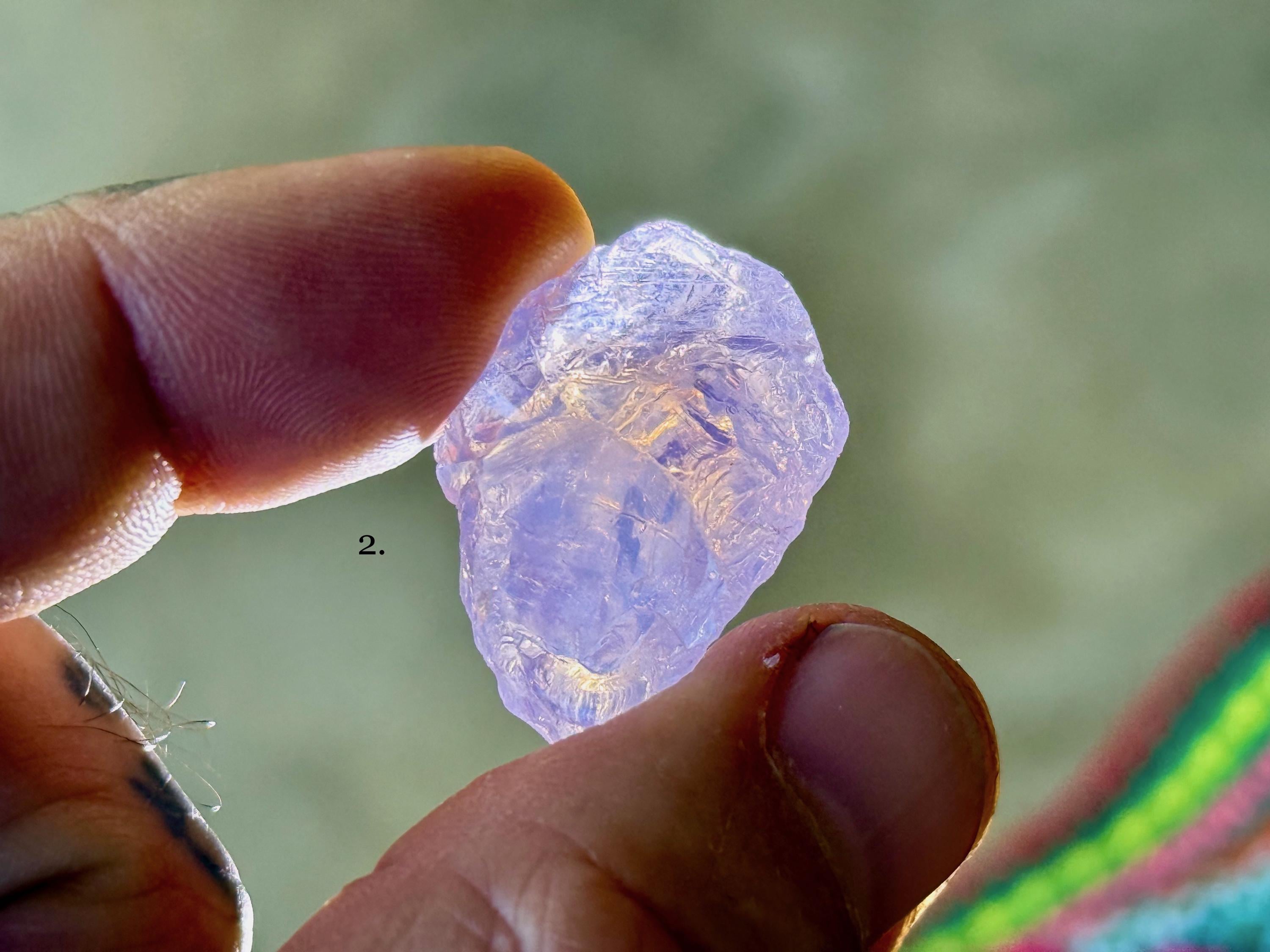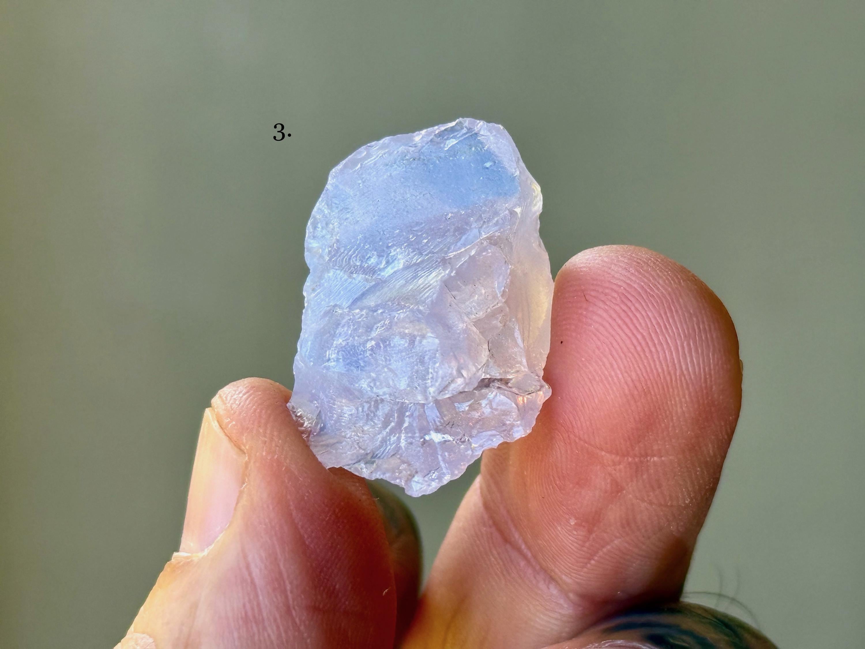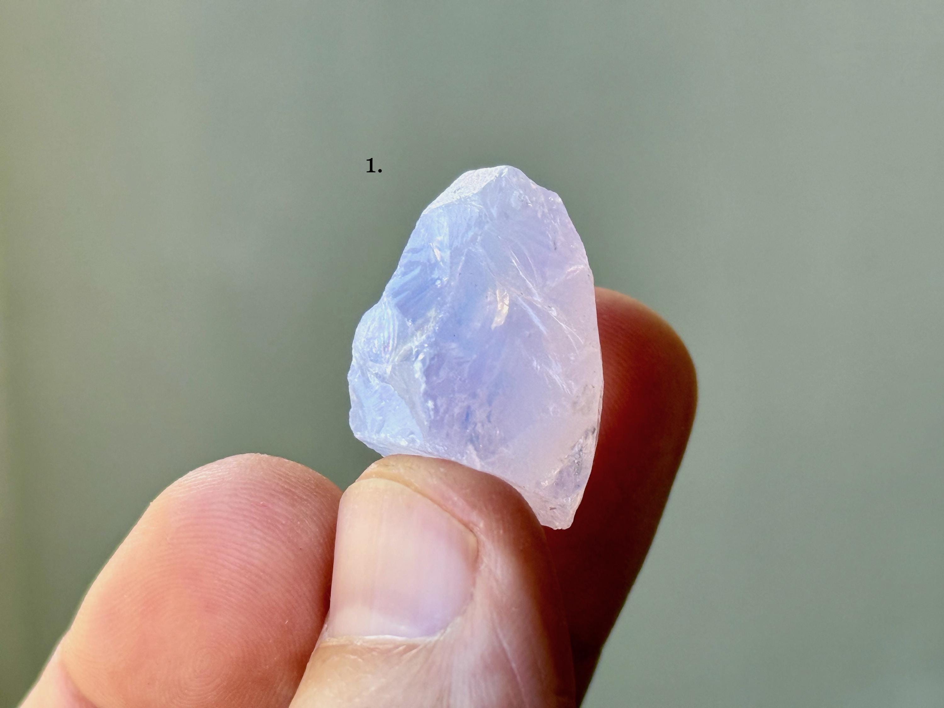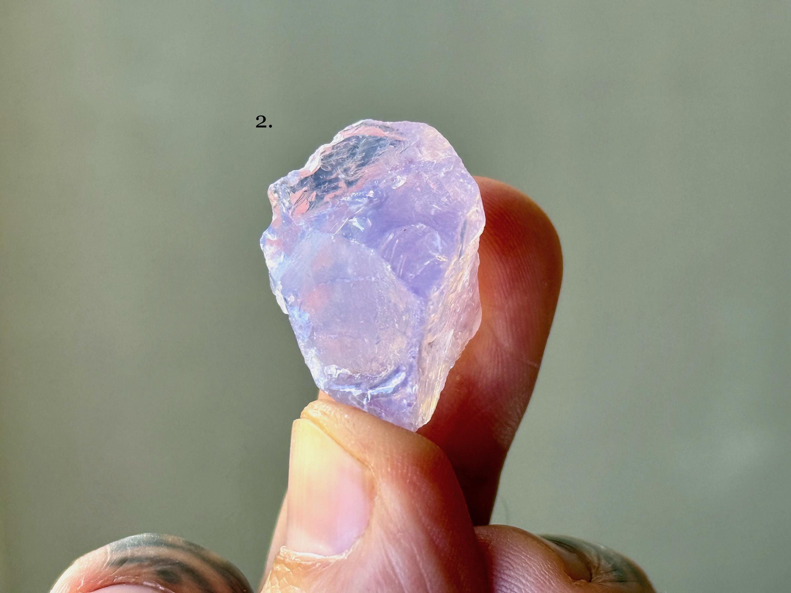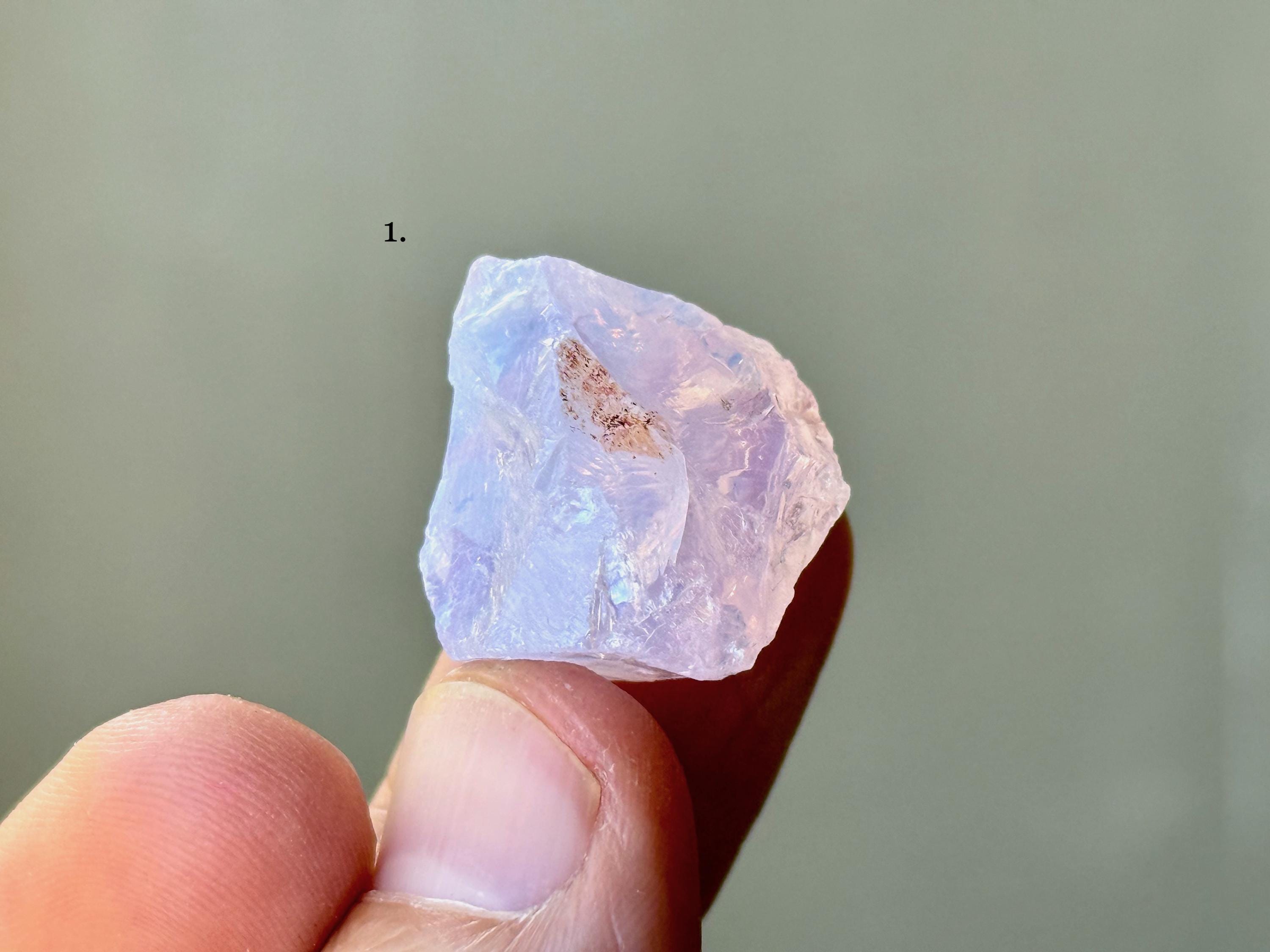 A gorgeous selection of natural Lavender Moon Quartz crystals with opalescent, pale purple hues! Please note that while some of these may have some terminated sides or edges, most edges are not terminated, as is the nature of this material. We've included photos here in natural light as well as backlit.