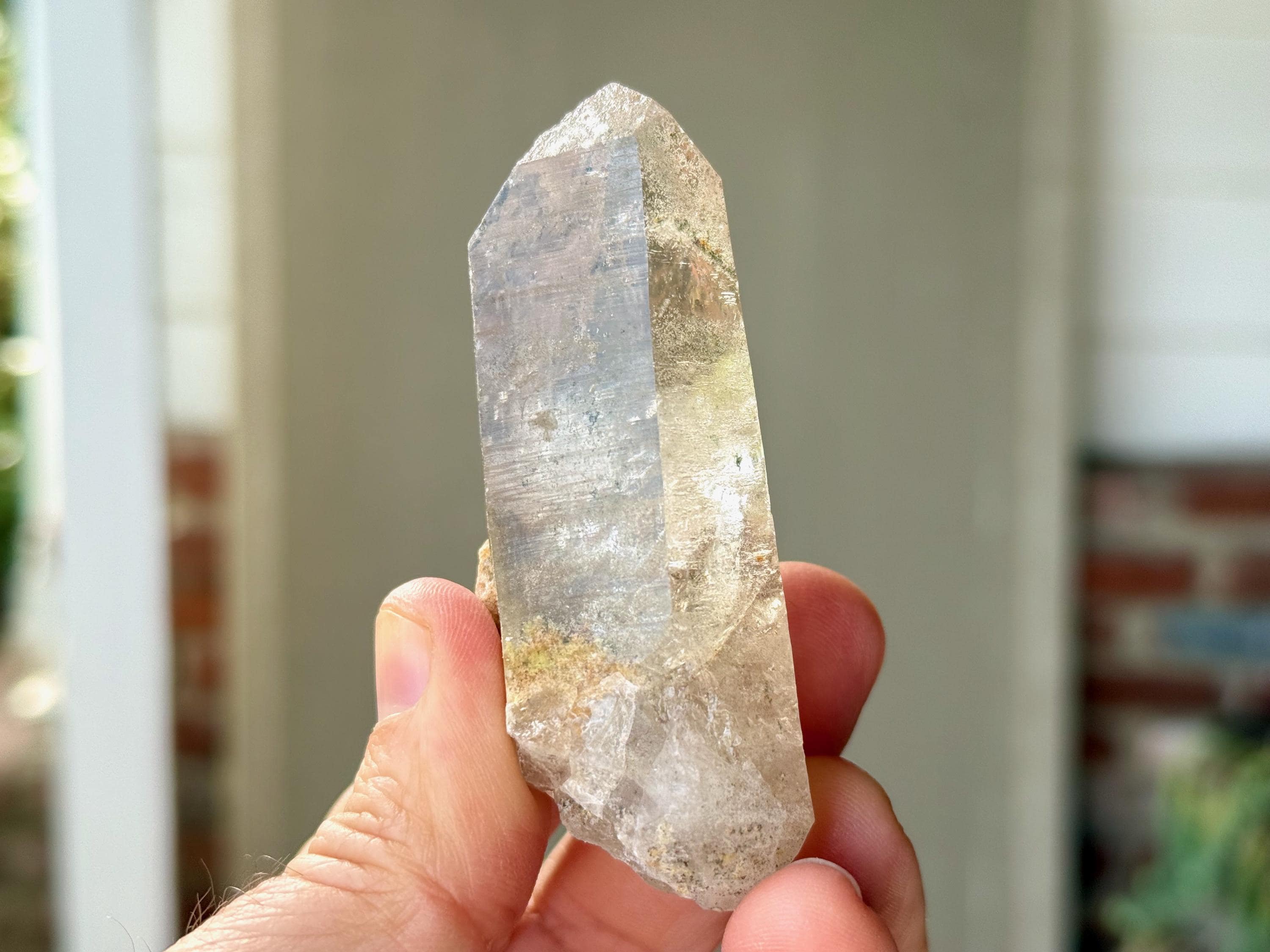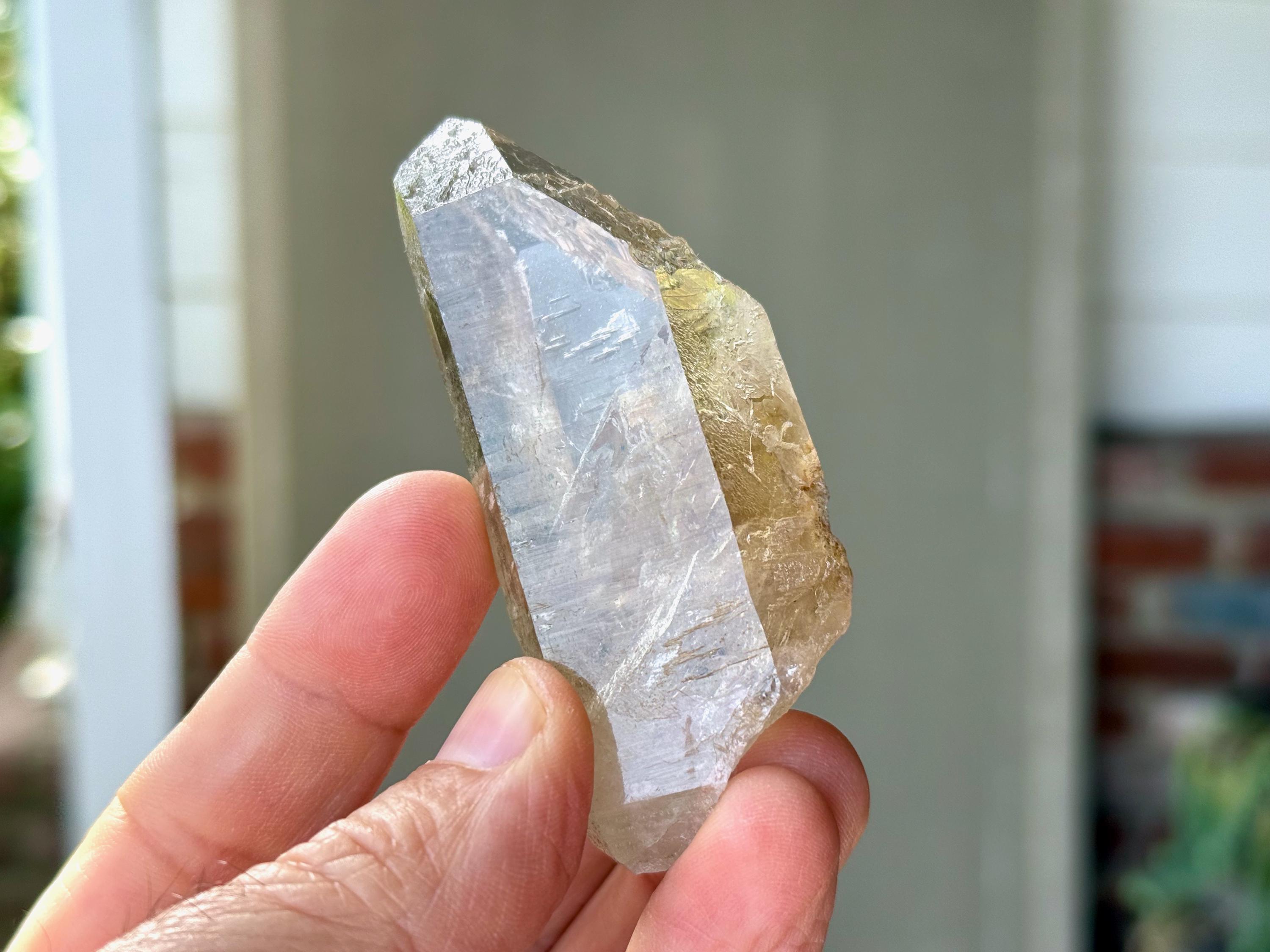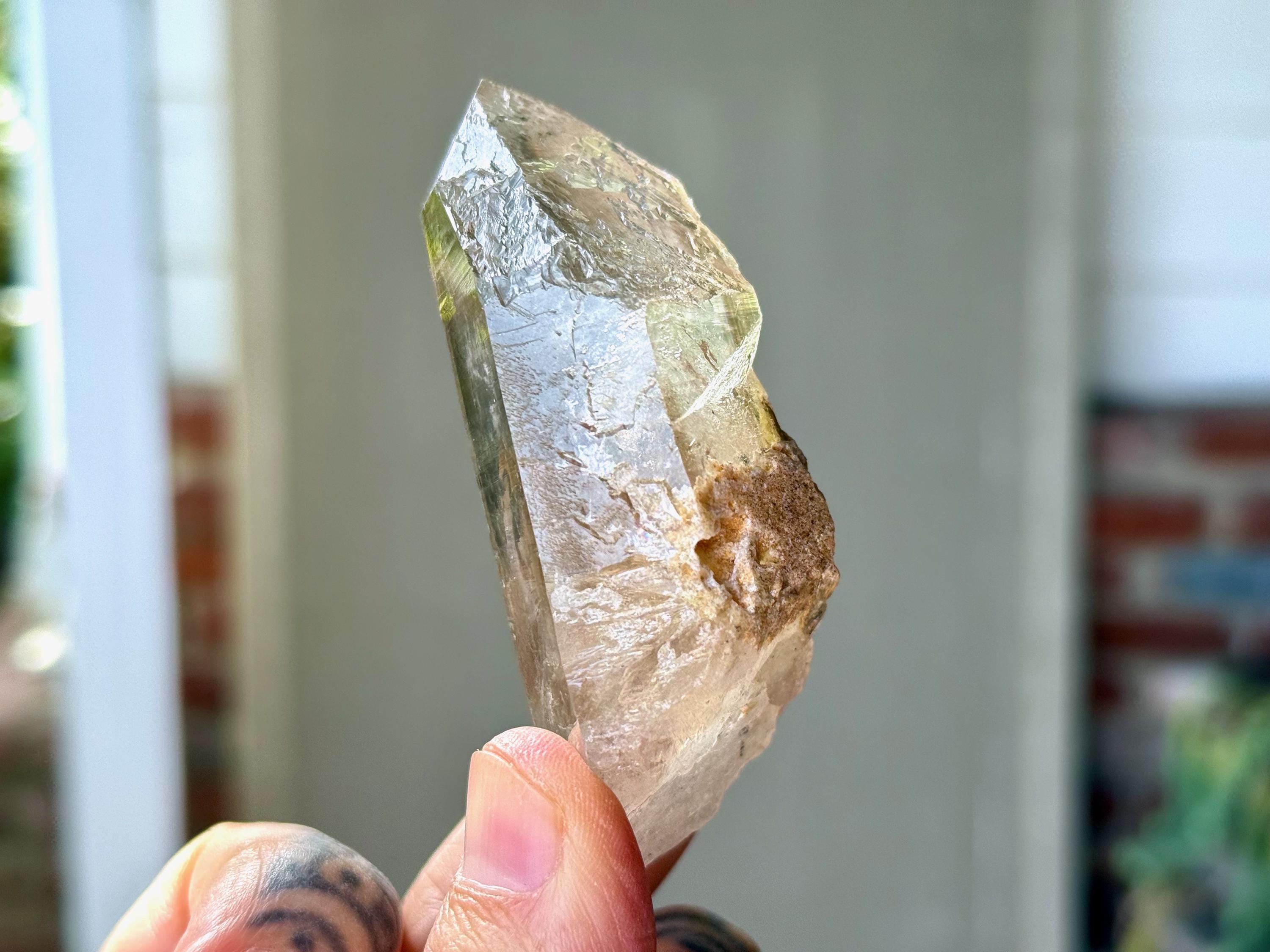 Water clear clarity and vitreous luster to this stunning Golden Healer Starbrary Quartz with a mild tinge of smoky golden hue. This crystal exhibits the highest quality and features unique etchings on its sides and main facets.