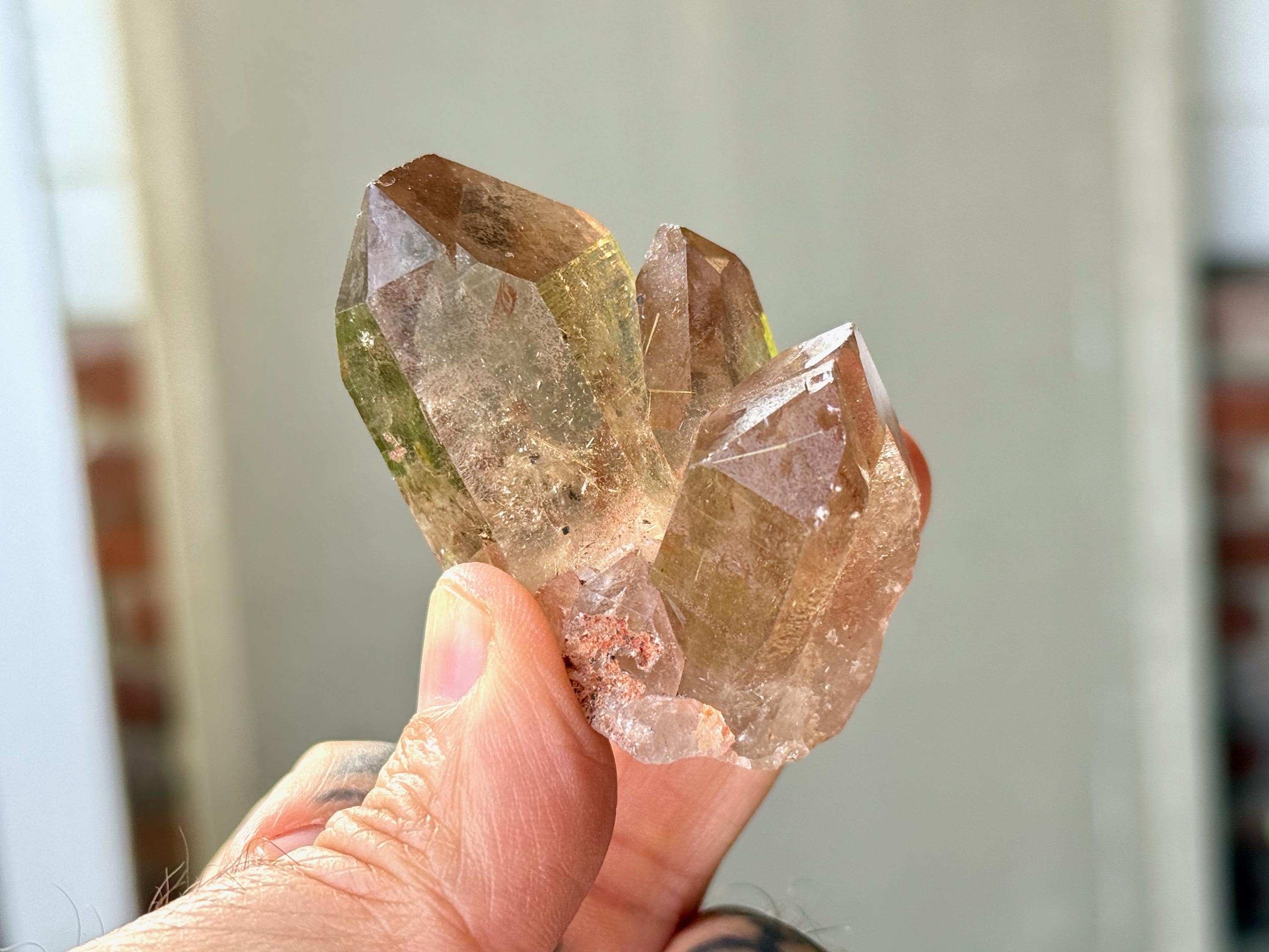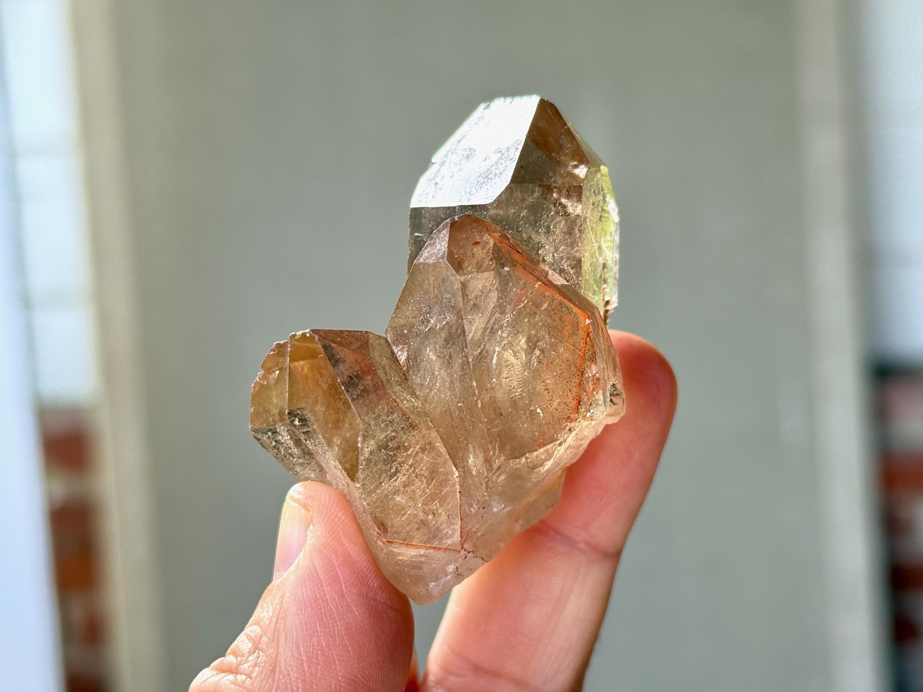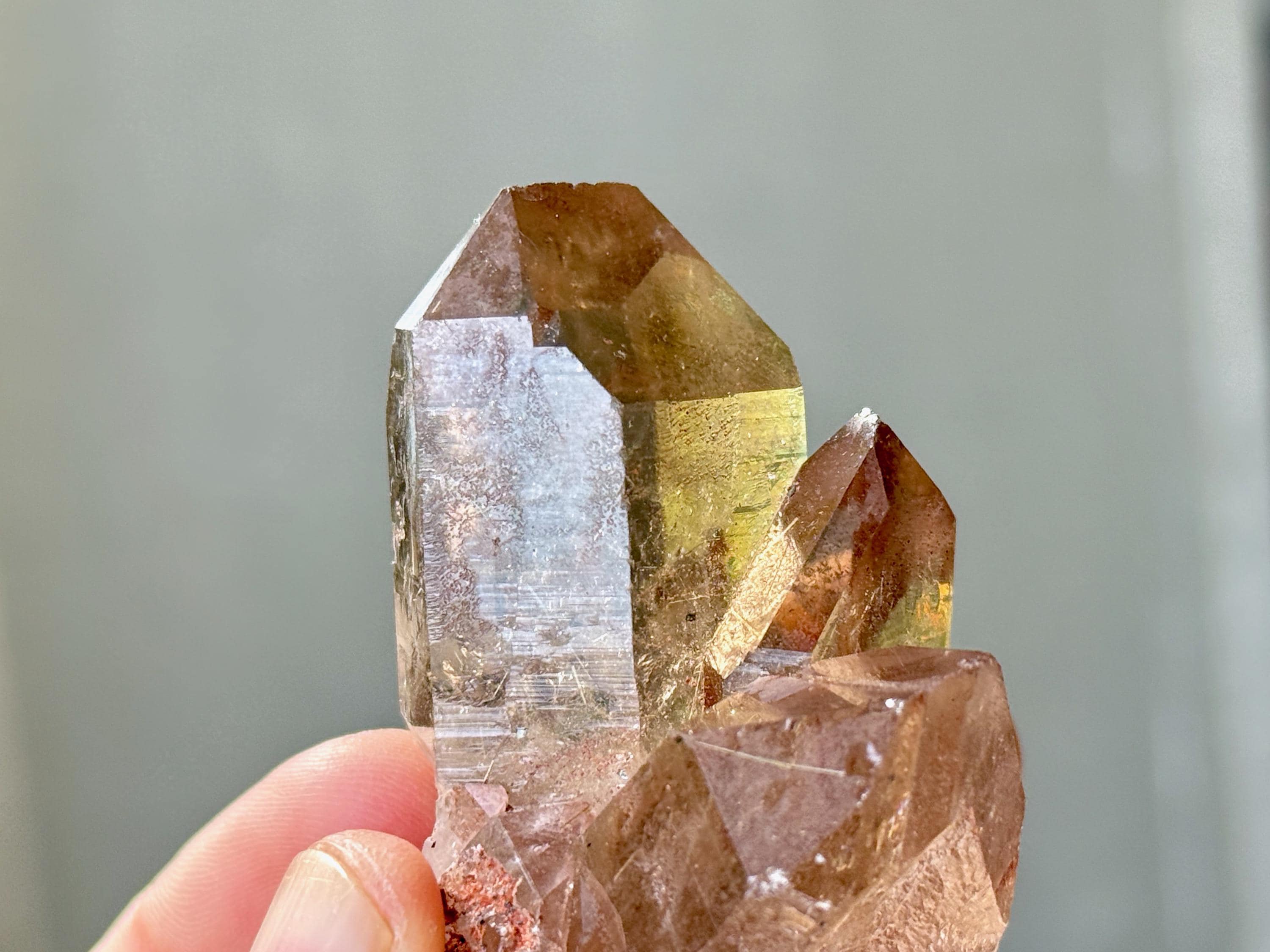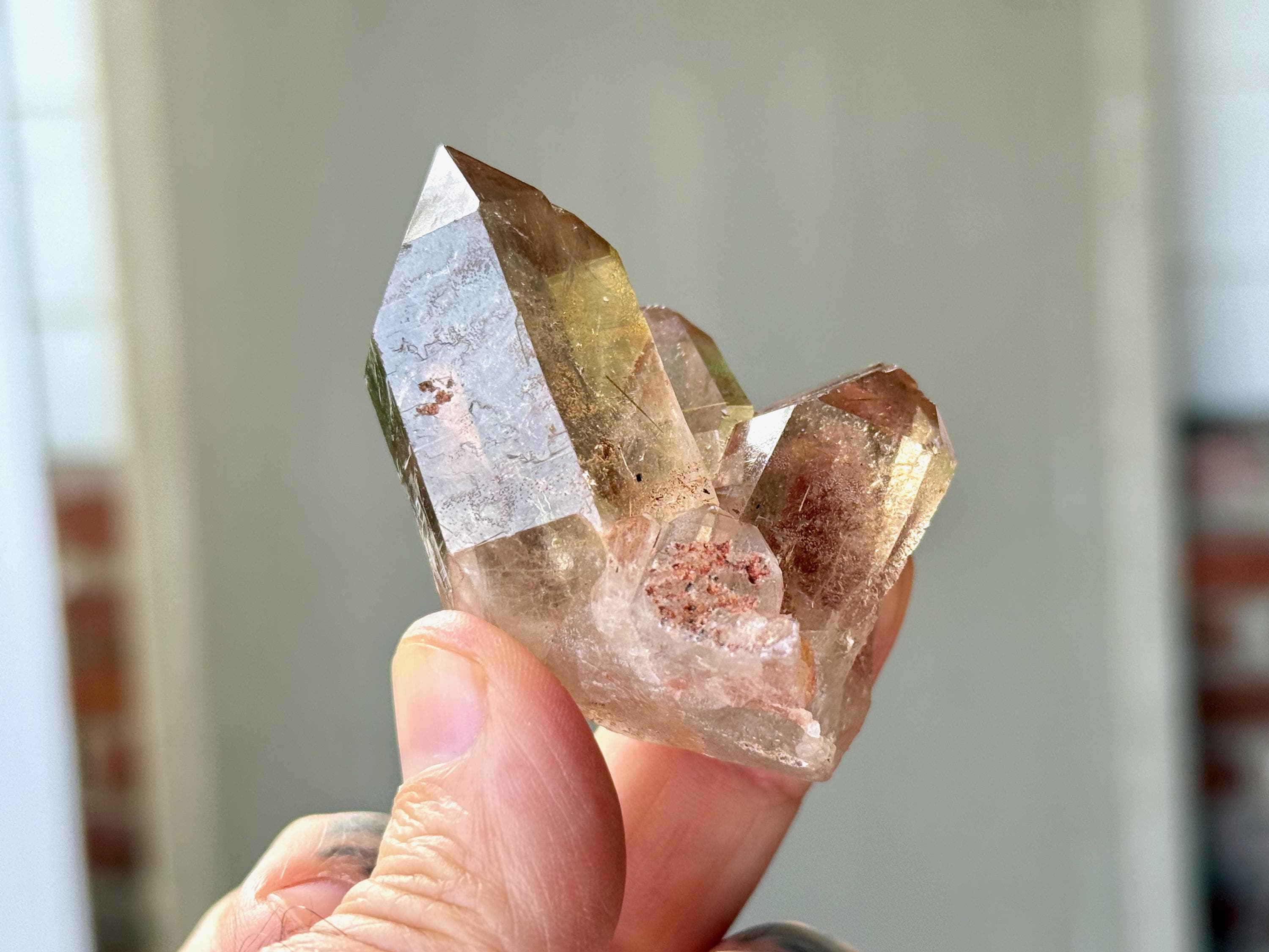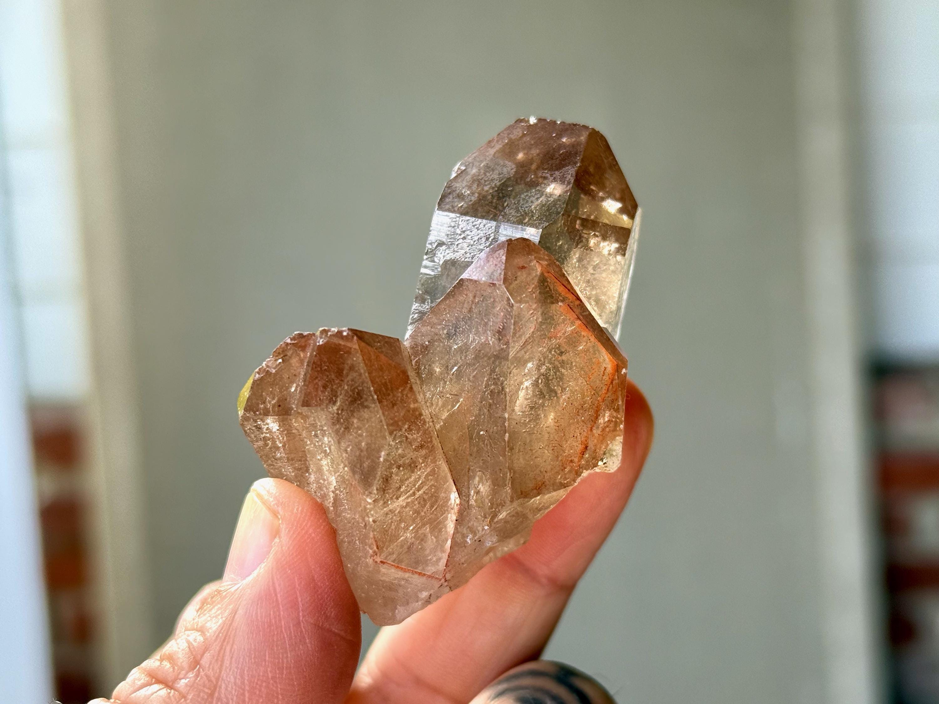 Exquisite quality to this highly lustrous Smoky Quartz Cluster with mild inclusions of fibrous Golden Rutile throughout. This crystal is super clear and has both a mild golden tinge, as well as a reddish hue from Hematite inclusion. The contrast between all the colors and textures is sublime!