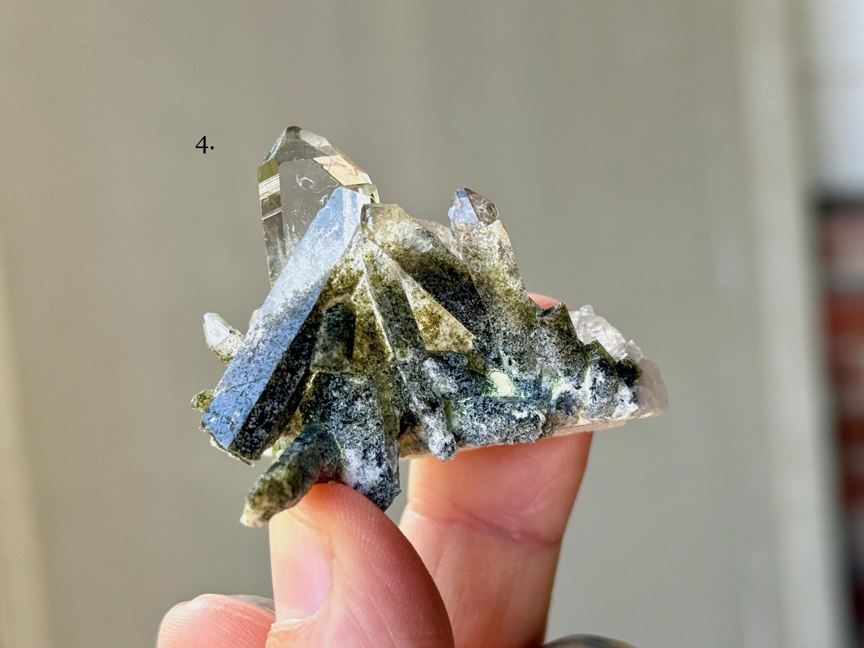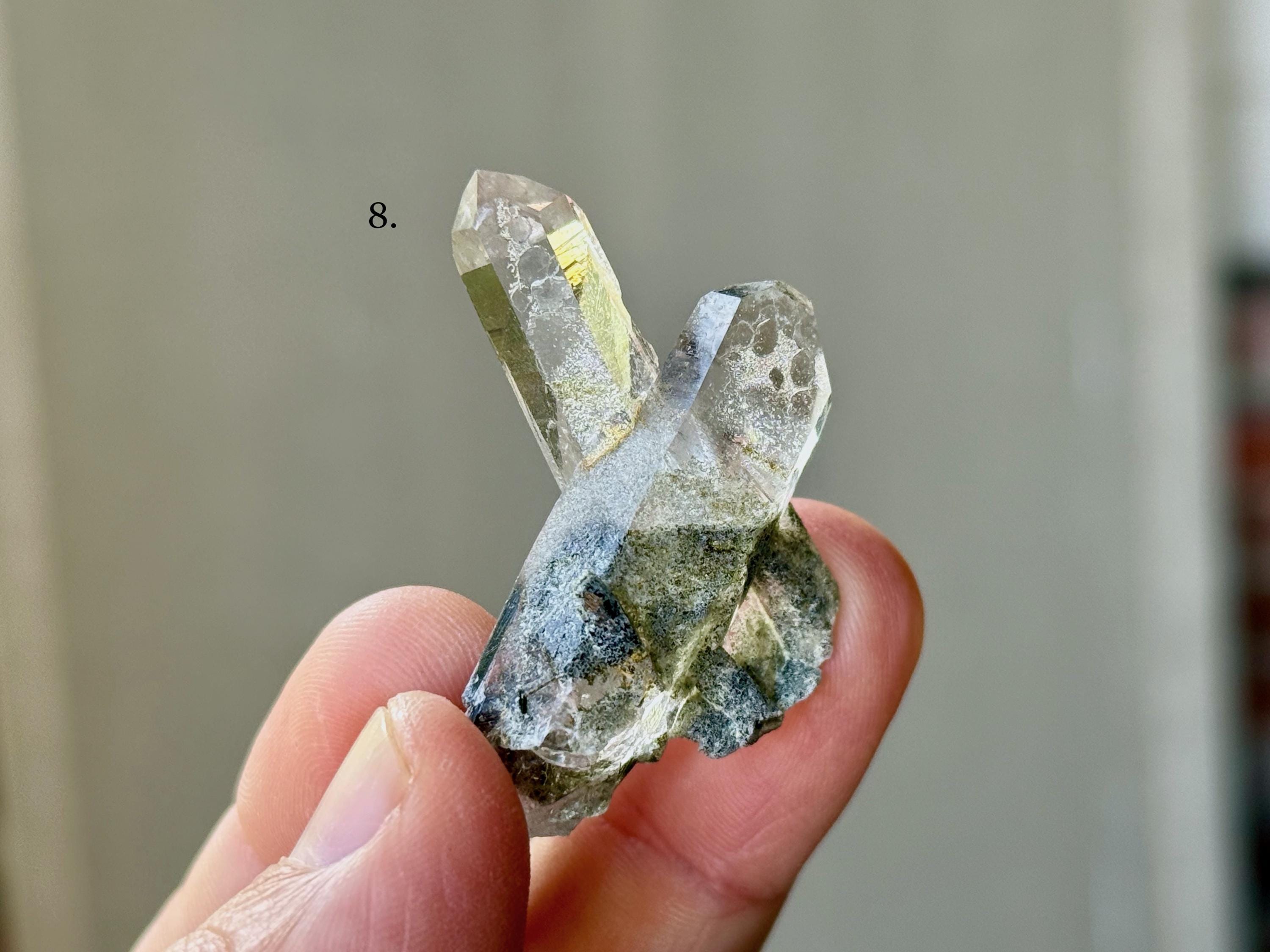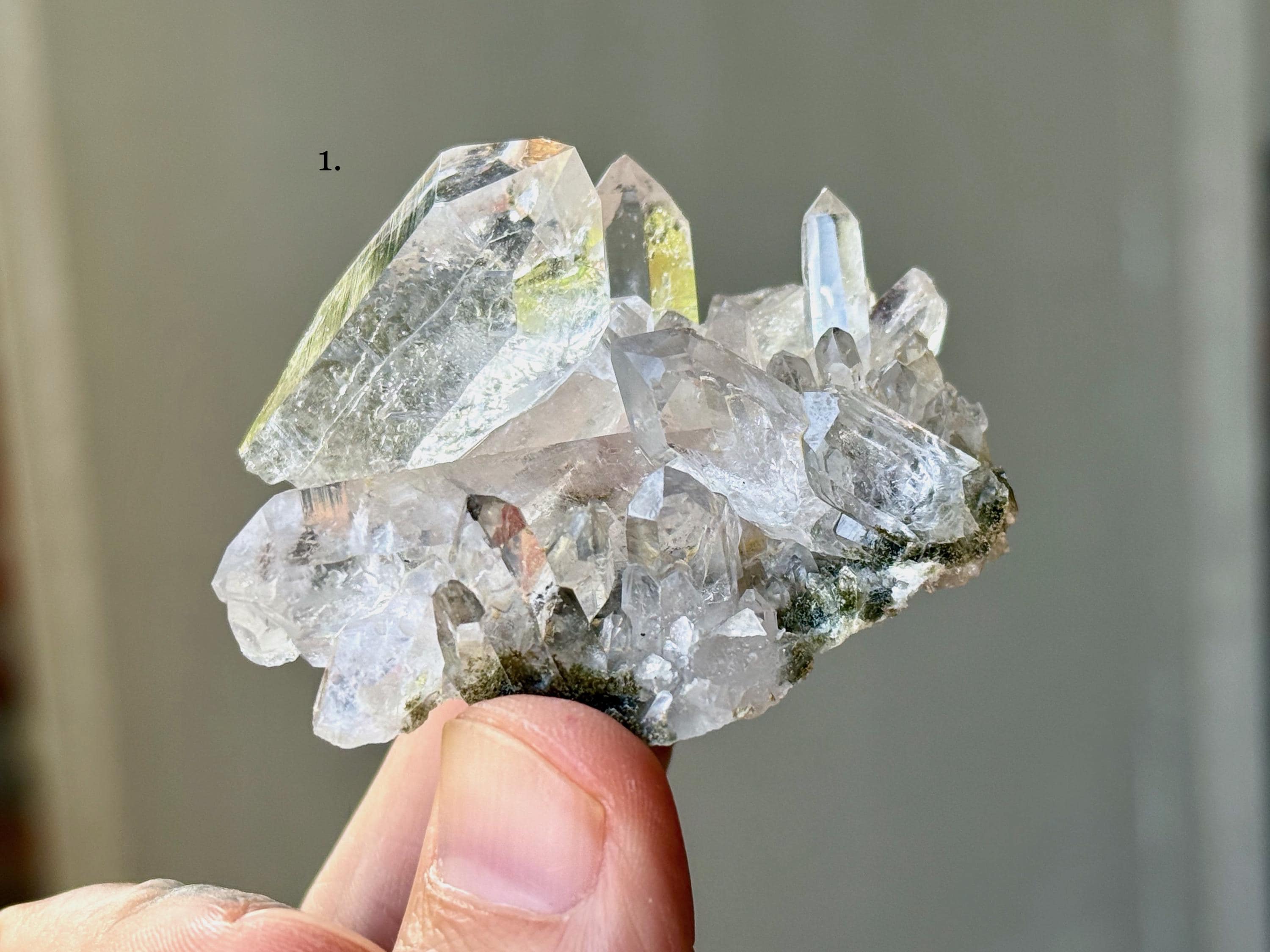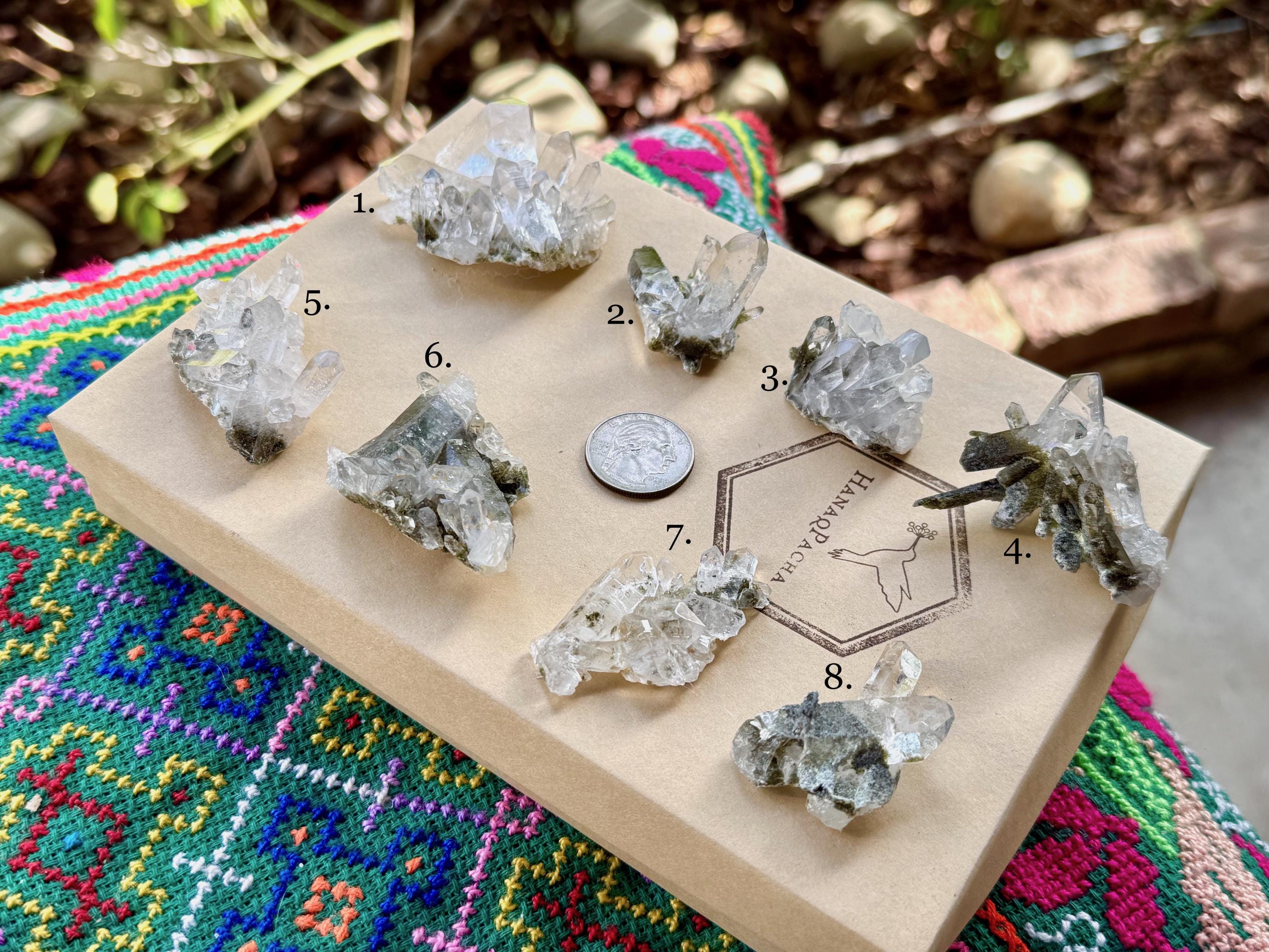 These stunning Green Chlorite Quartz crystals come from an old find in the famed Zeca de Souza Mine, Corinto, Minas Gerais, Brazil. Each selection is numbered, simply select the one(s) you'd like from the dropdown menu.