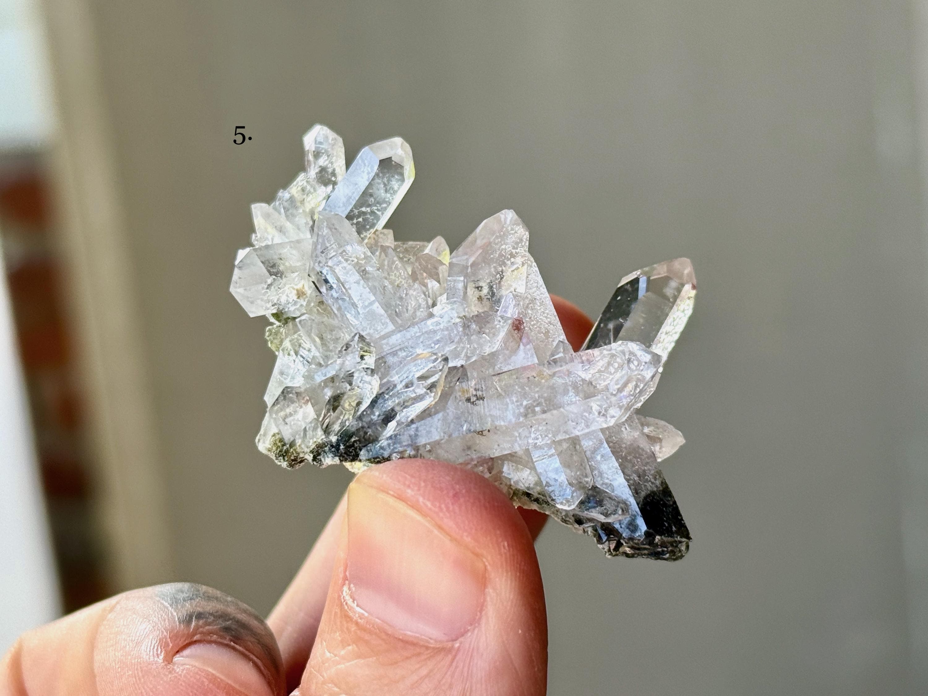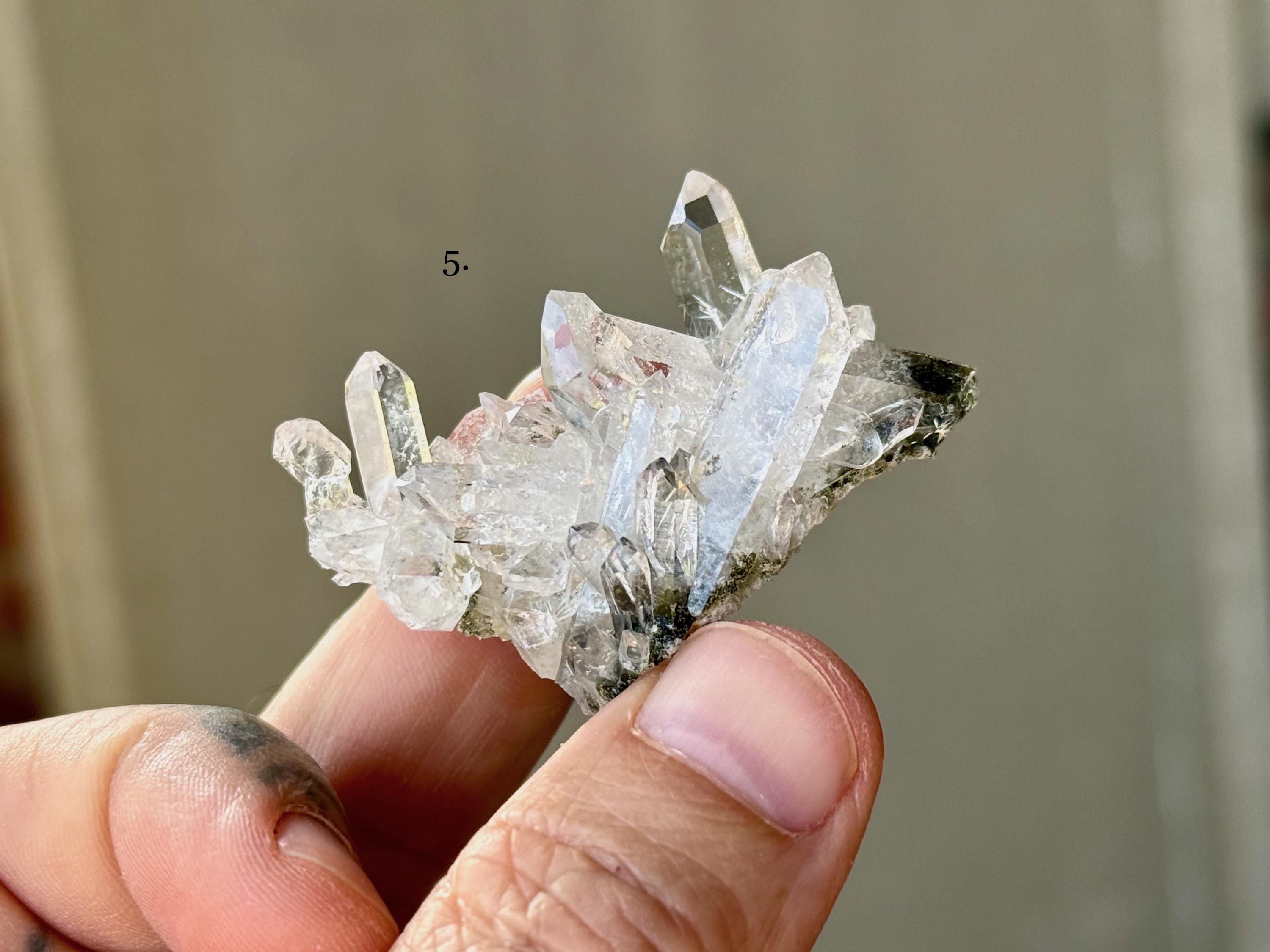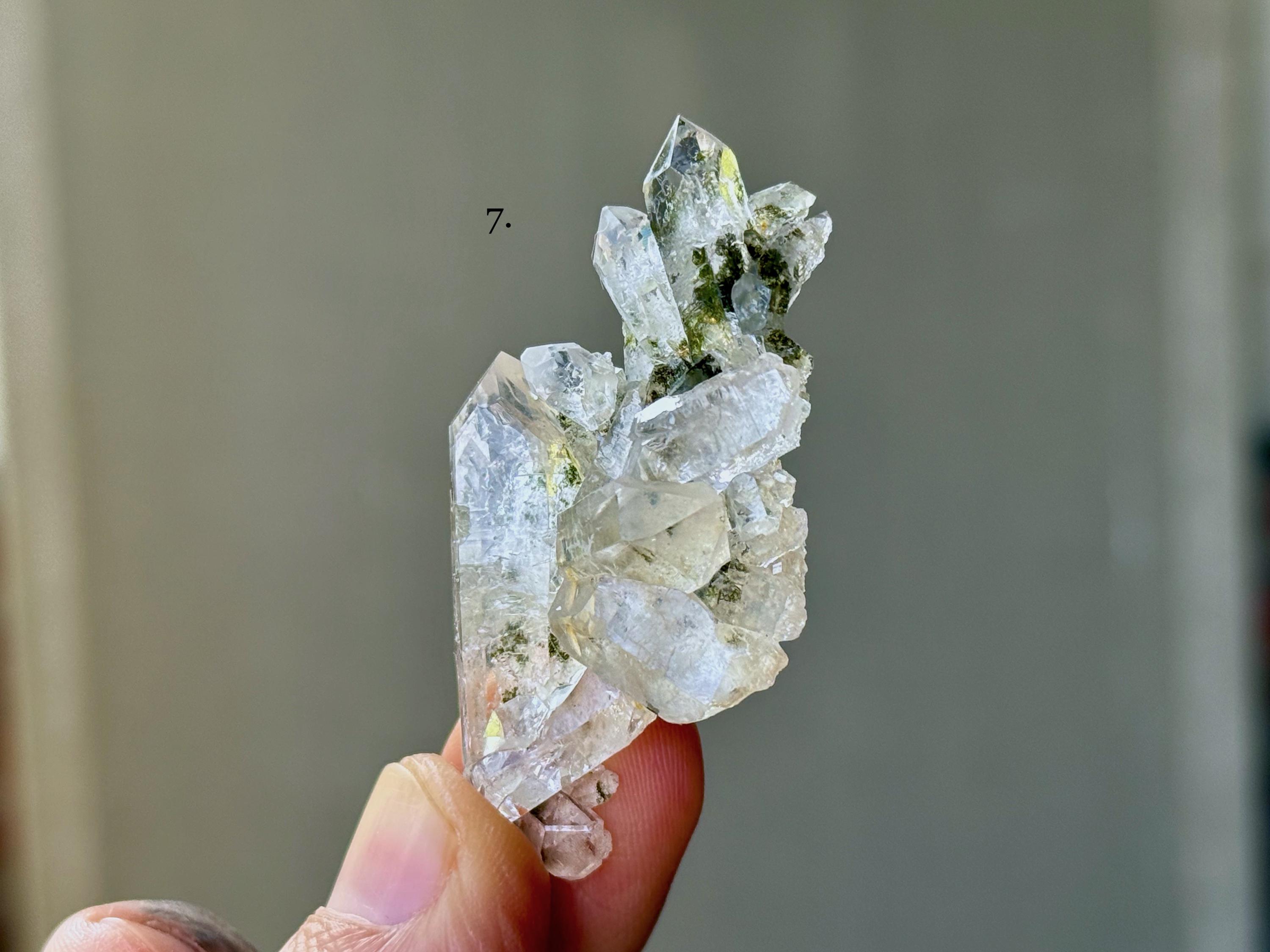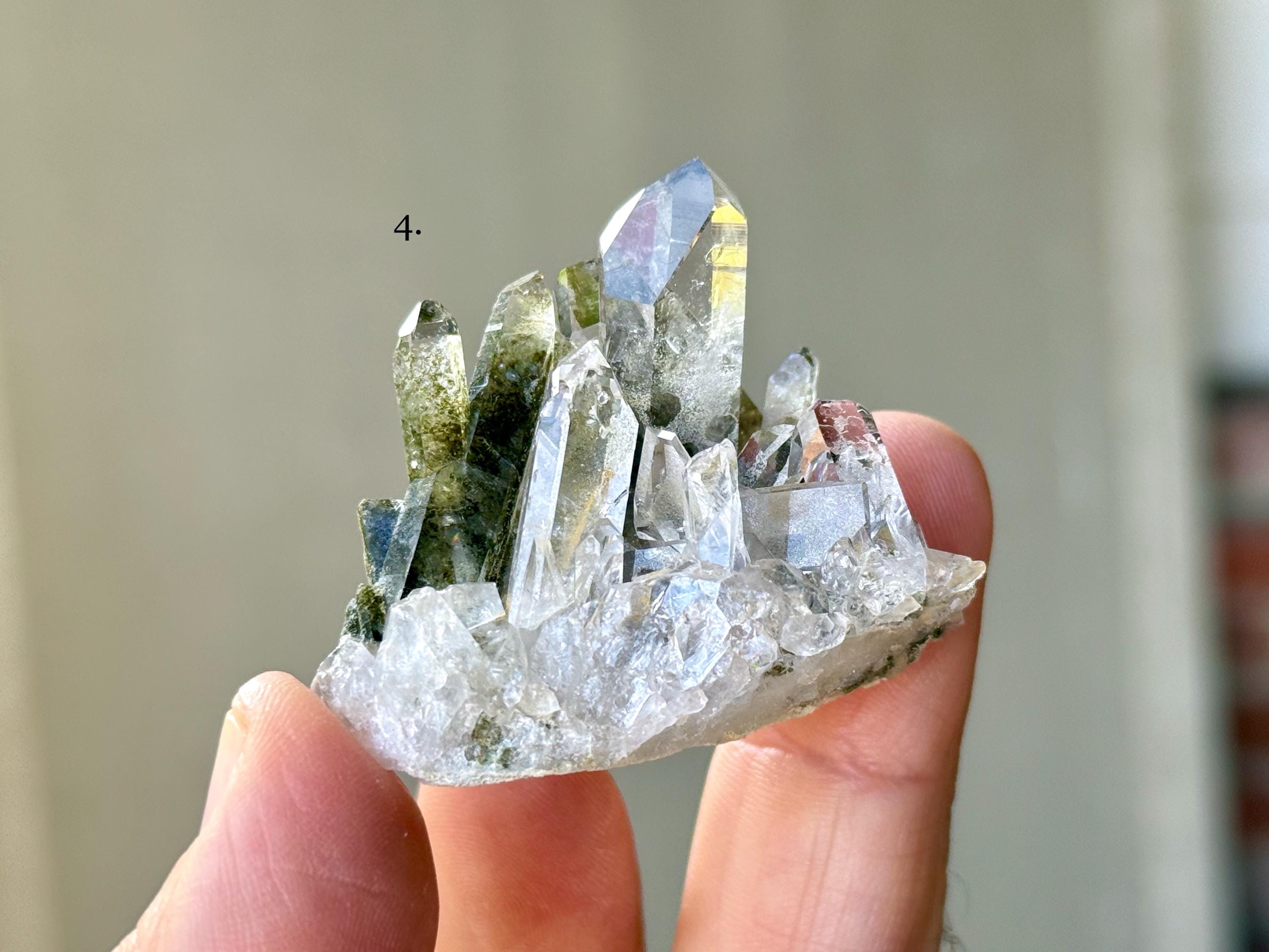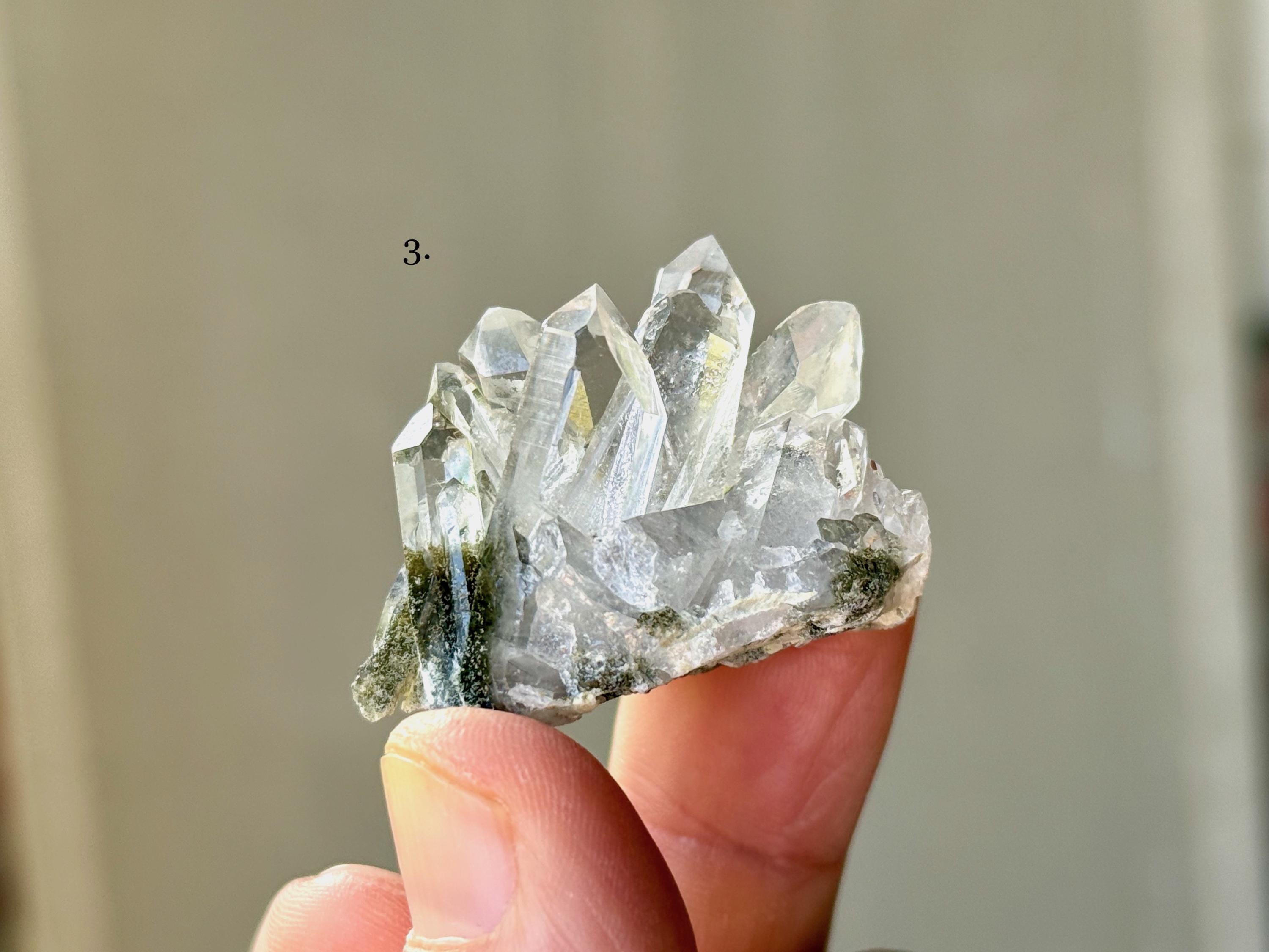 These stunning Green Chlorite Quartz crystals come from an old find in the famed Zeca de Souza Mine, Corinto, Minas Gerais, Brazil. Each selection is numbered, simply select the one(s) you'd like from the dropdown menu.