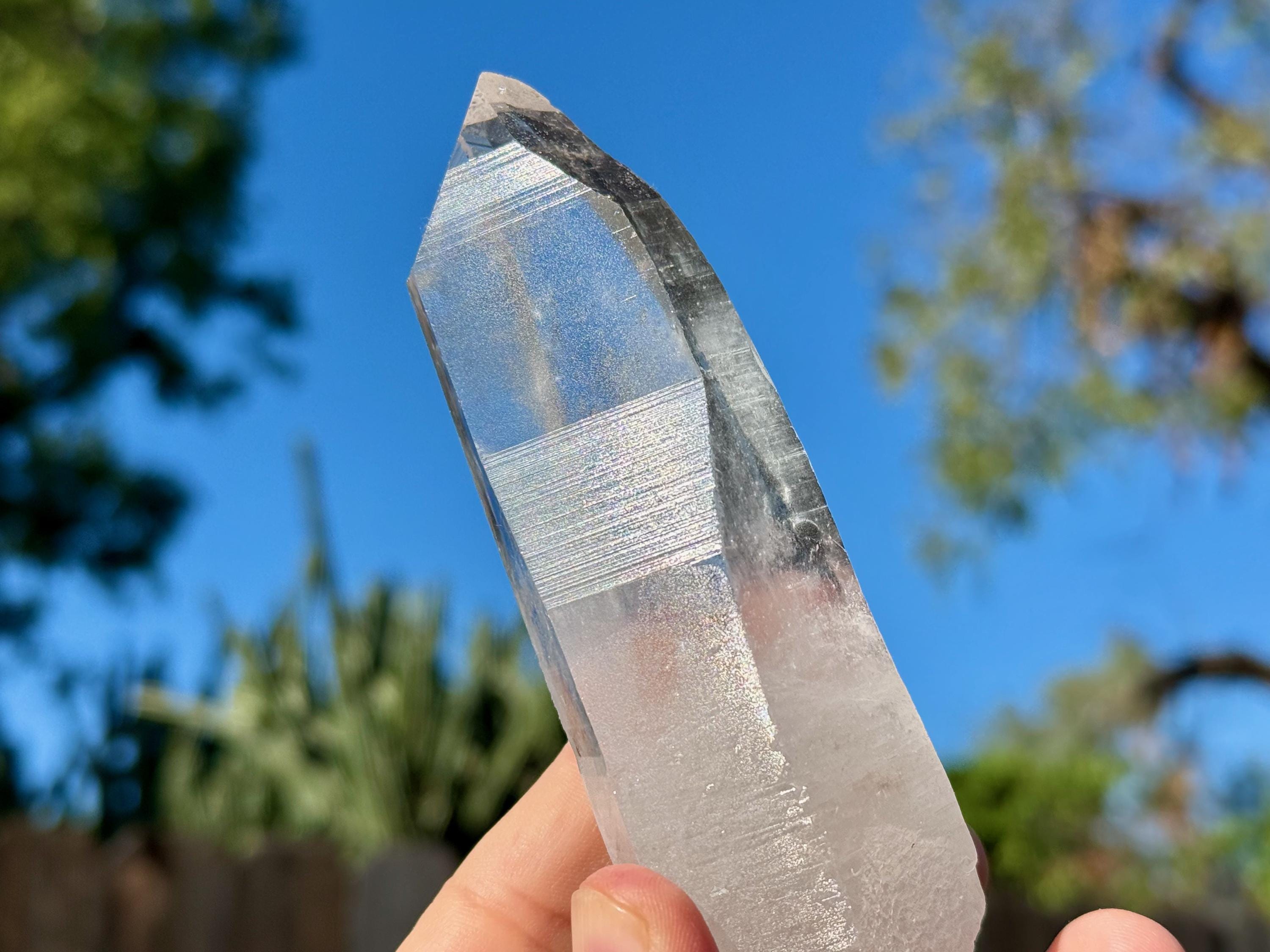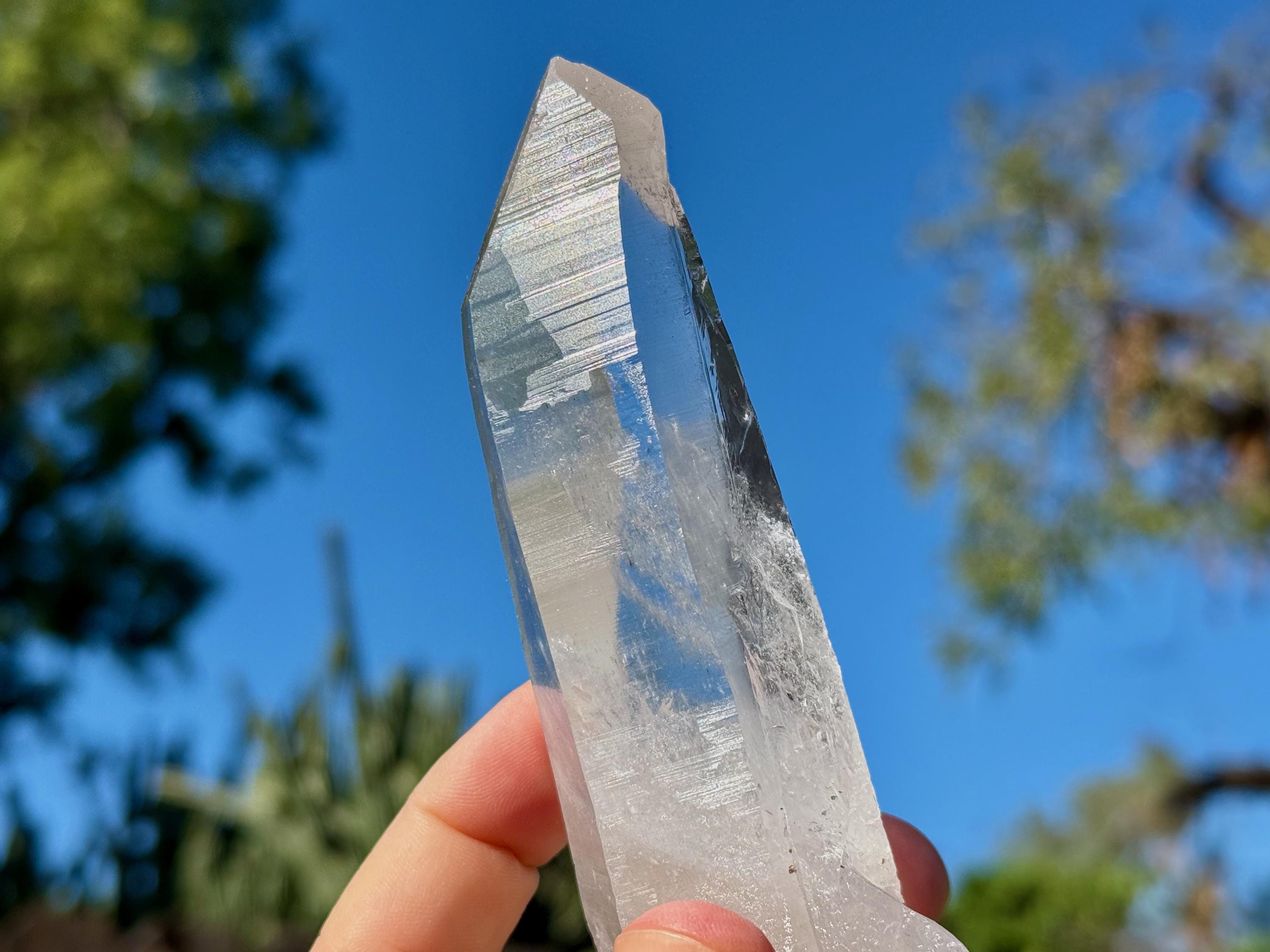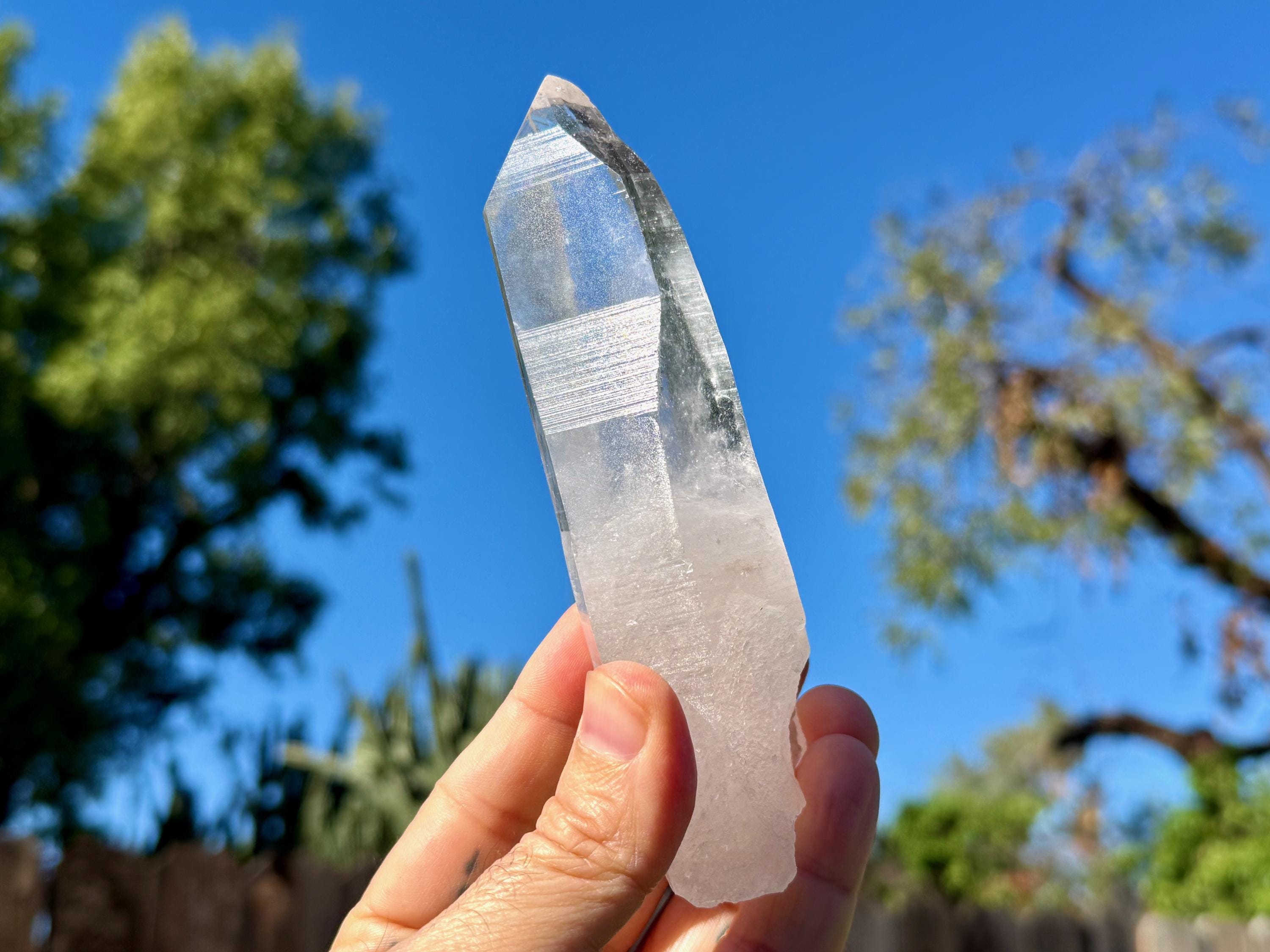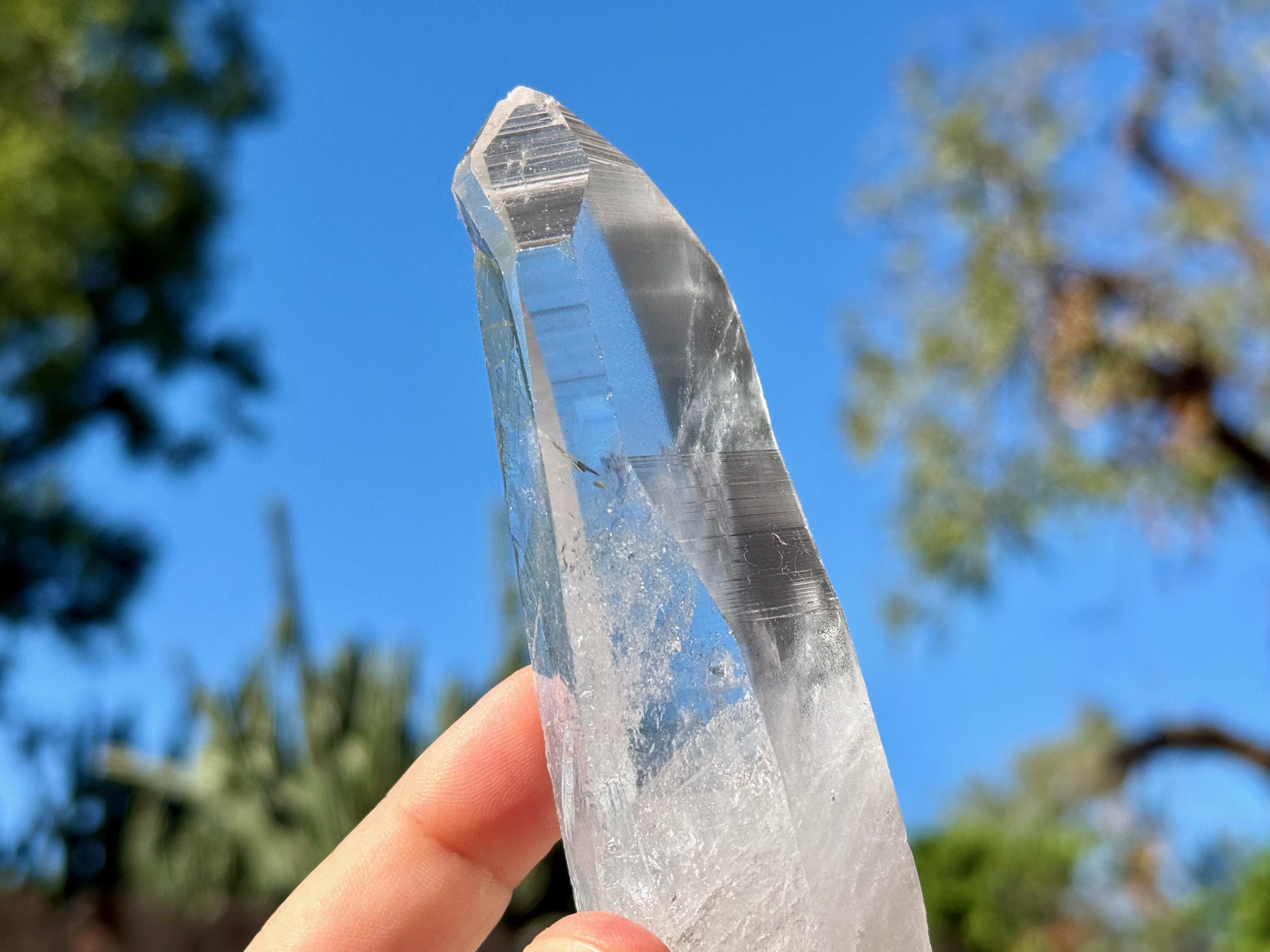 Exceptional quality to this superb Blue Needle Lemurian Quartz featuring an elongated formation, water-clear clarity and glassy luster. This crystal displays very well-defined striations on its sides, and a complexion that begins cloudy at the base, blending up into marvelous clarity at the top.