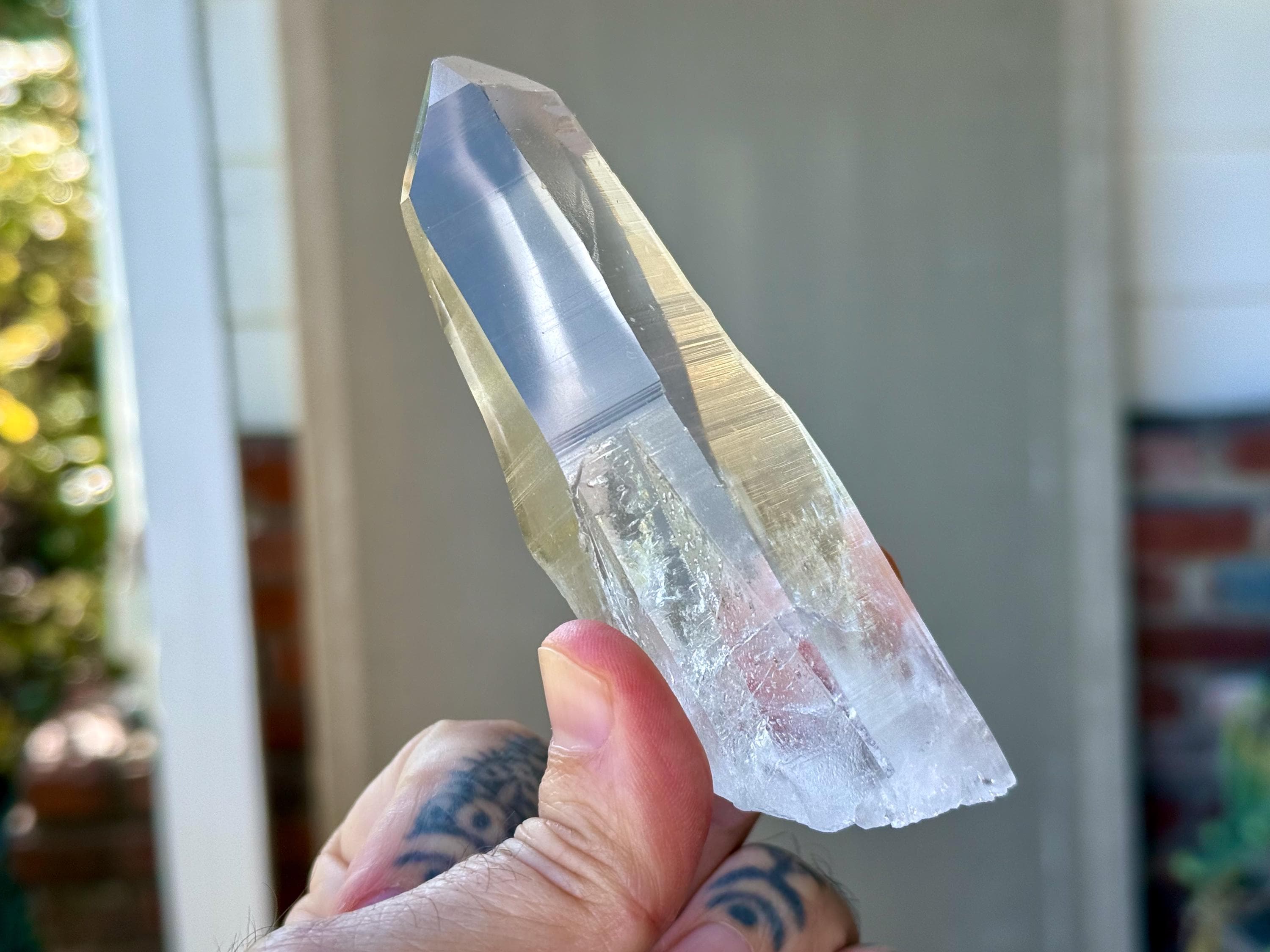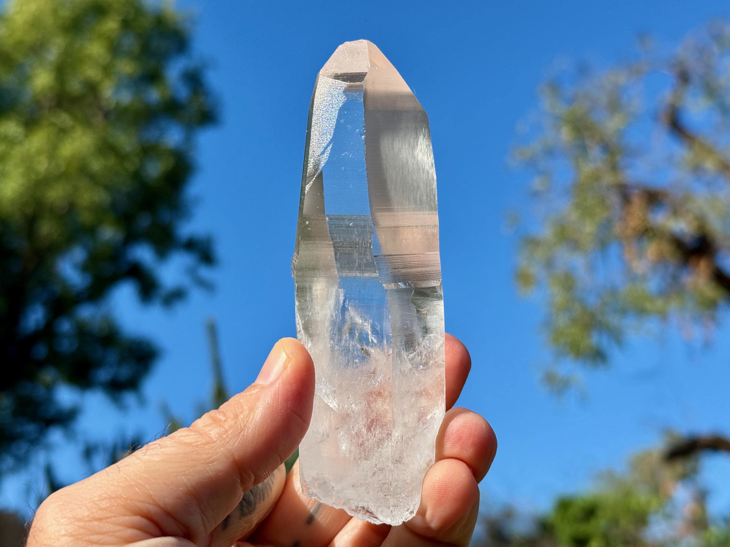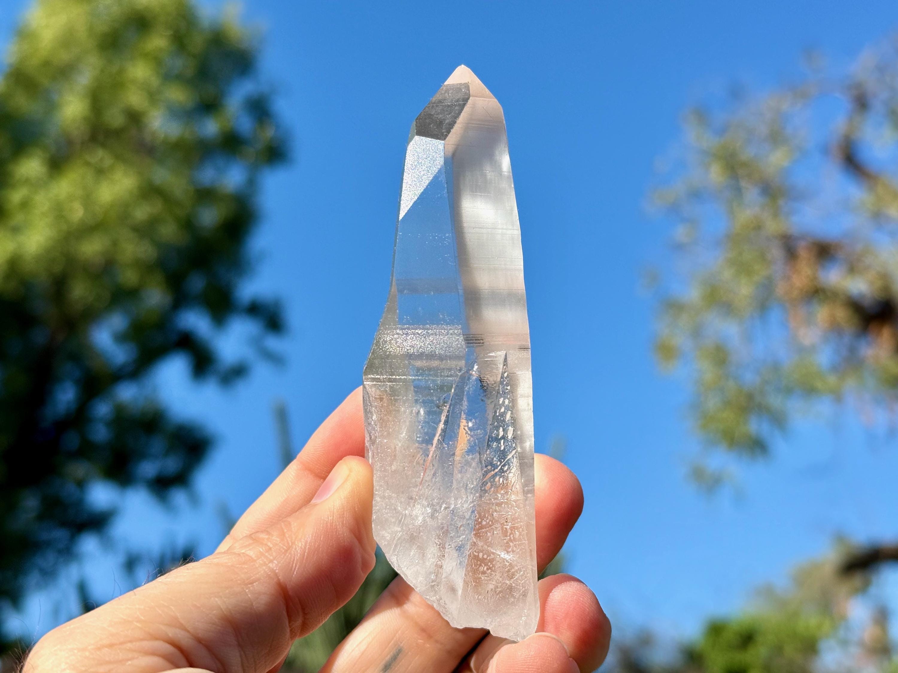 Exceptional quality to this superb Blue Needle Lemurian Quartz featuring an elongated formation, water-clear clarity and glassy luster. This crystal displays very well-defined striations on its sides. In natural light, and at certain angles, you may notice the *slightest* tinge of pink in the top portion.
