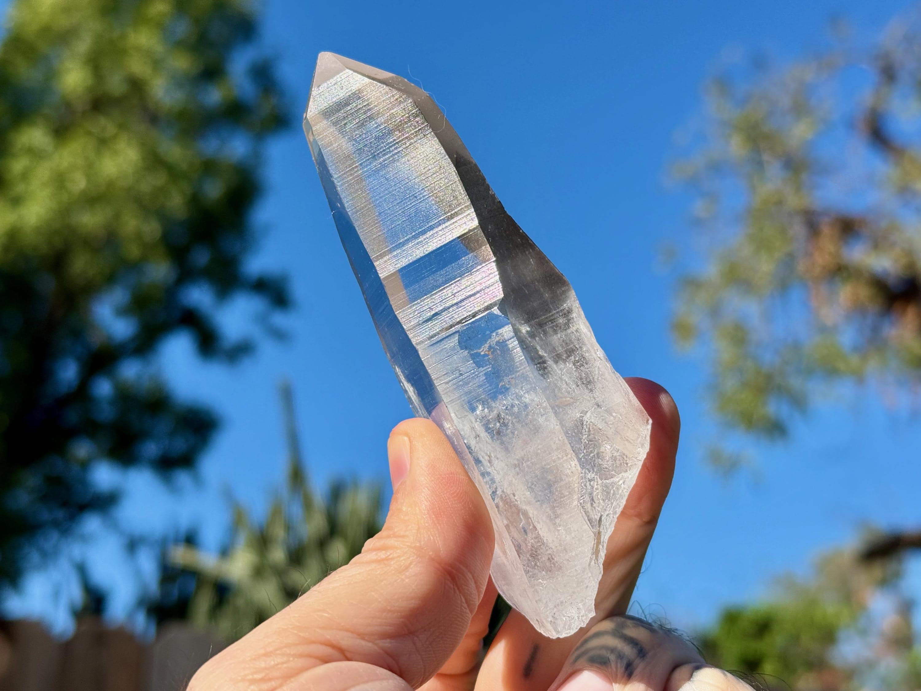 Lemurian Quartz resonates with all chakras, but primarily the Crown Chakra. It has one of the highest vibrations of any crystal and is a beautiful companion for meditation and to realign energies in the body. It can assist in clearing blockages in one's energy field and/or chakras, dispelling heavy energies from the body. If there is stagnant energy in the body, it can help to increase Prana (life force) energy to get things moving properly again. Meditating with Lemurian Crystals can allow us to connect with higher-dimensional spirit guides and connect to Divine realms, as well as to decode the information they contain within.