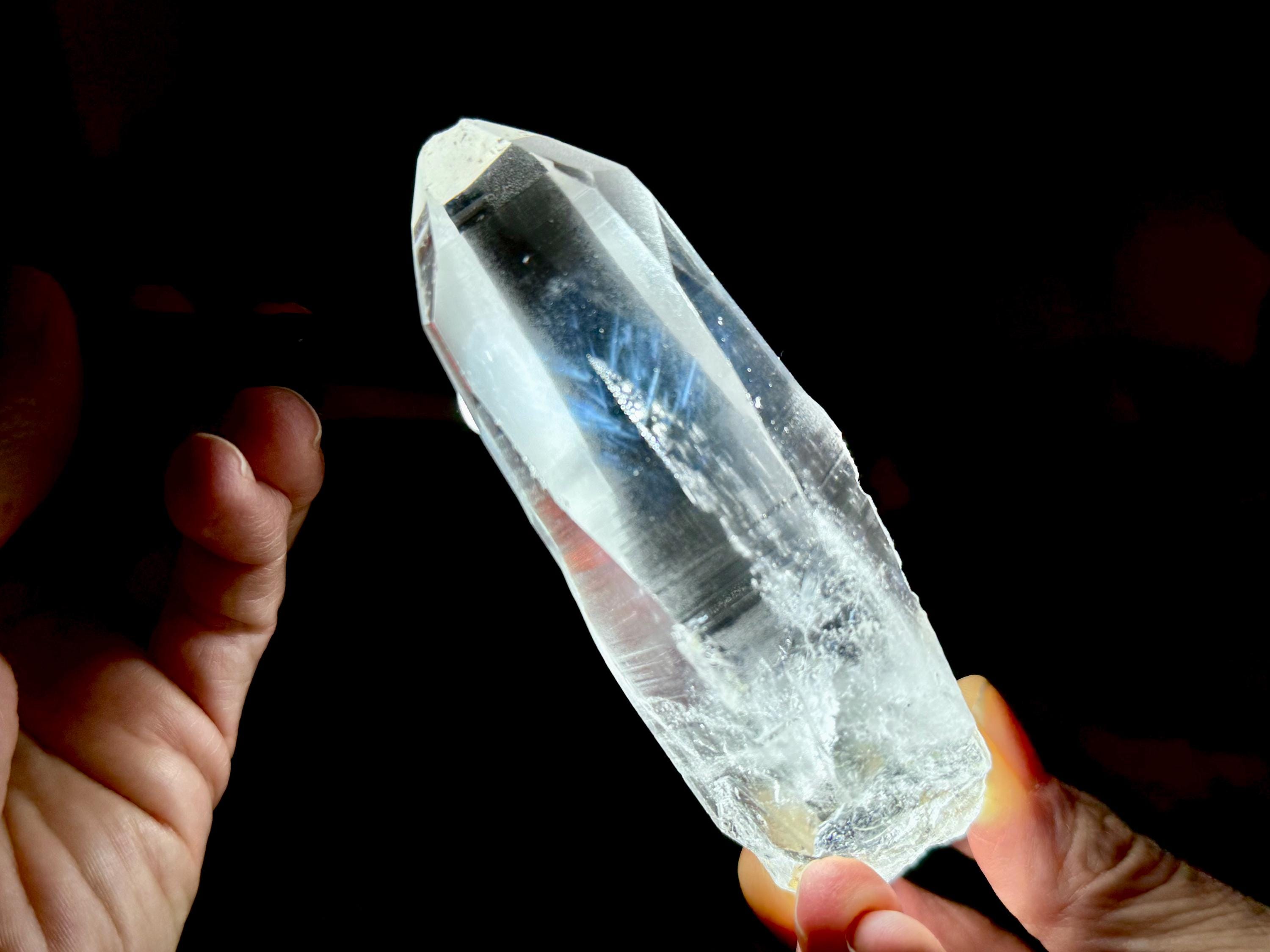 These crystals exhibit a unique phenomenon that causes the appearance of blue needle-like inclusions within. In actuality, these are not physical inclusions, but instead thin tubes of gas suspended within, formed naturally inside the crystal over hundreds of millions of years during the crystal's formation. When light is shone on them from the exact right angle, they glow a ghostly blue color (some say due to the Tyndall Effect).