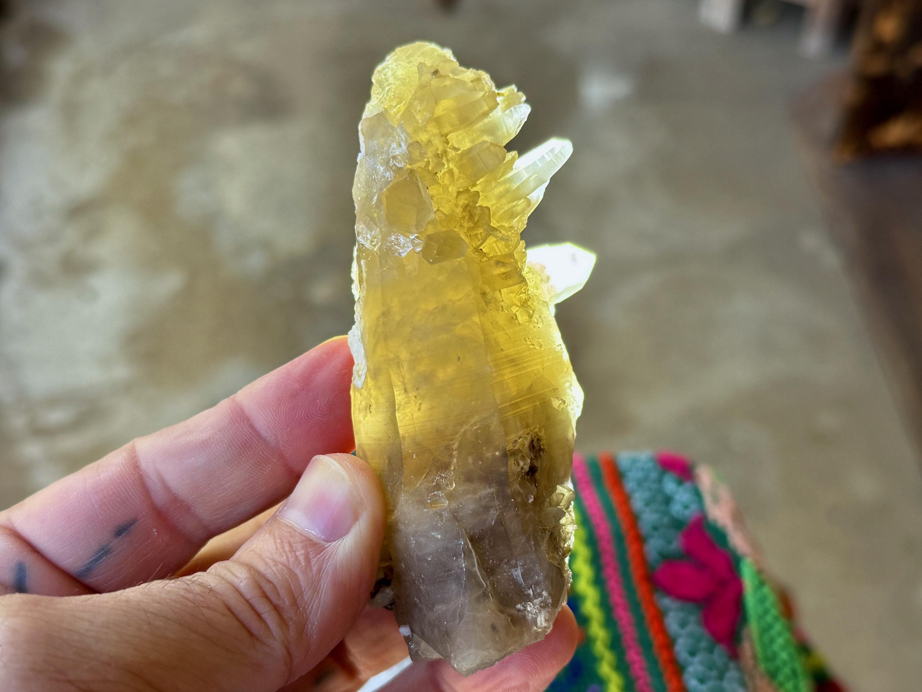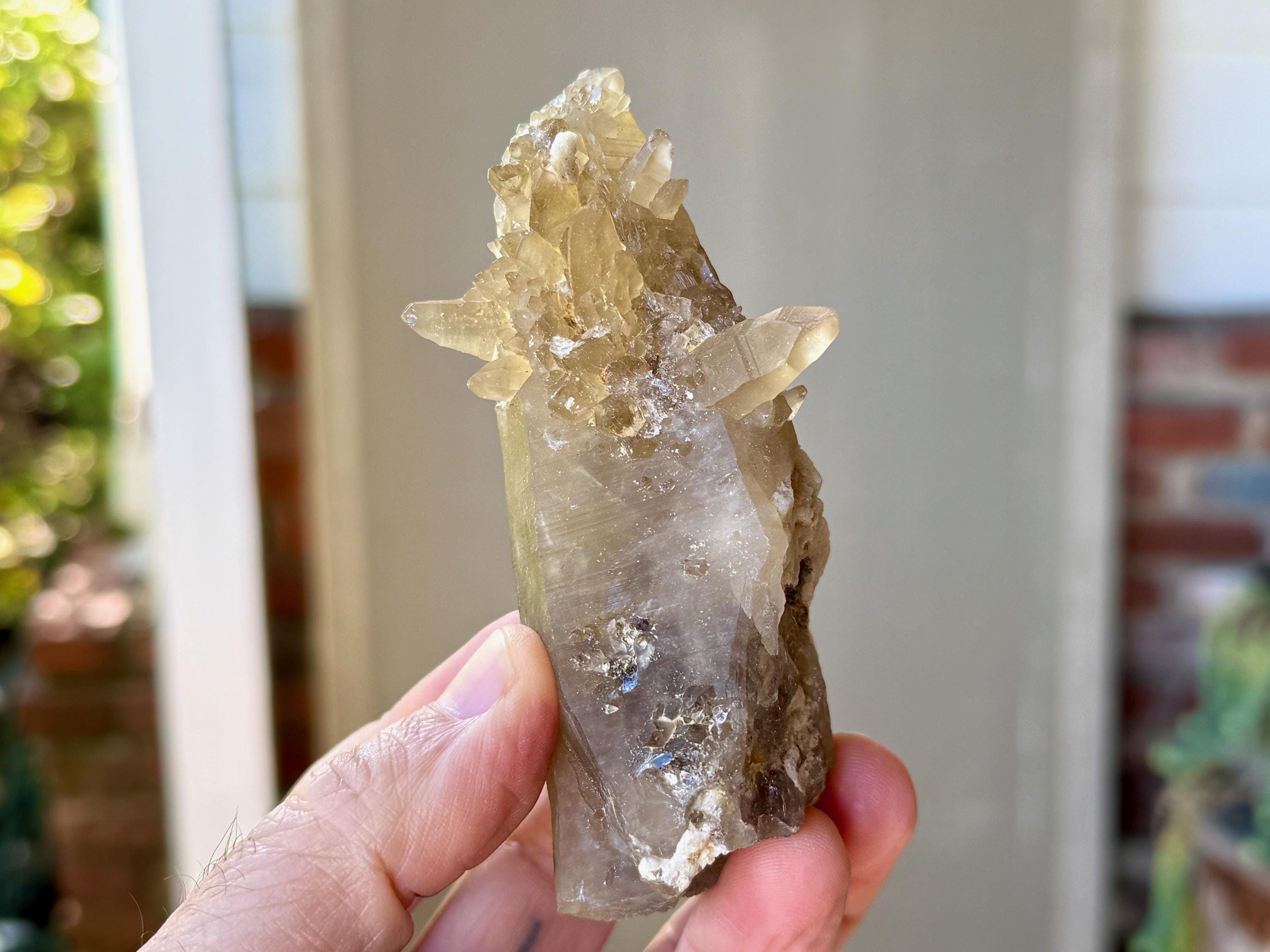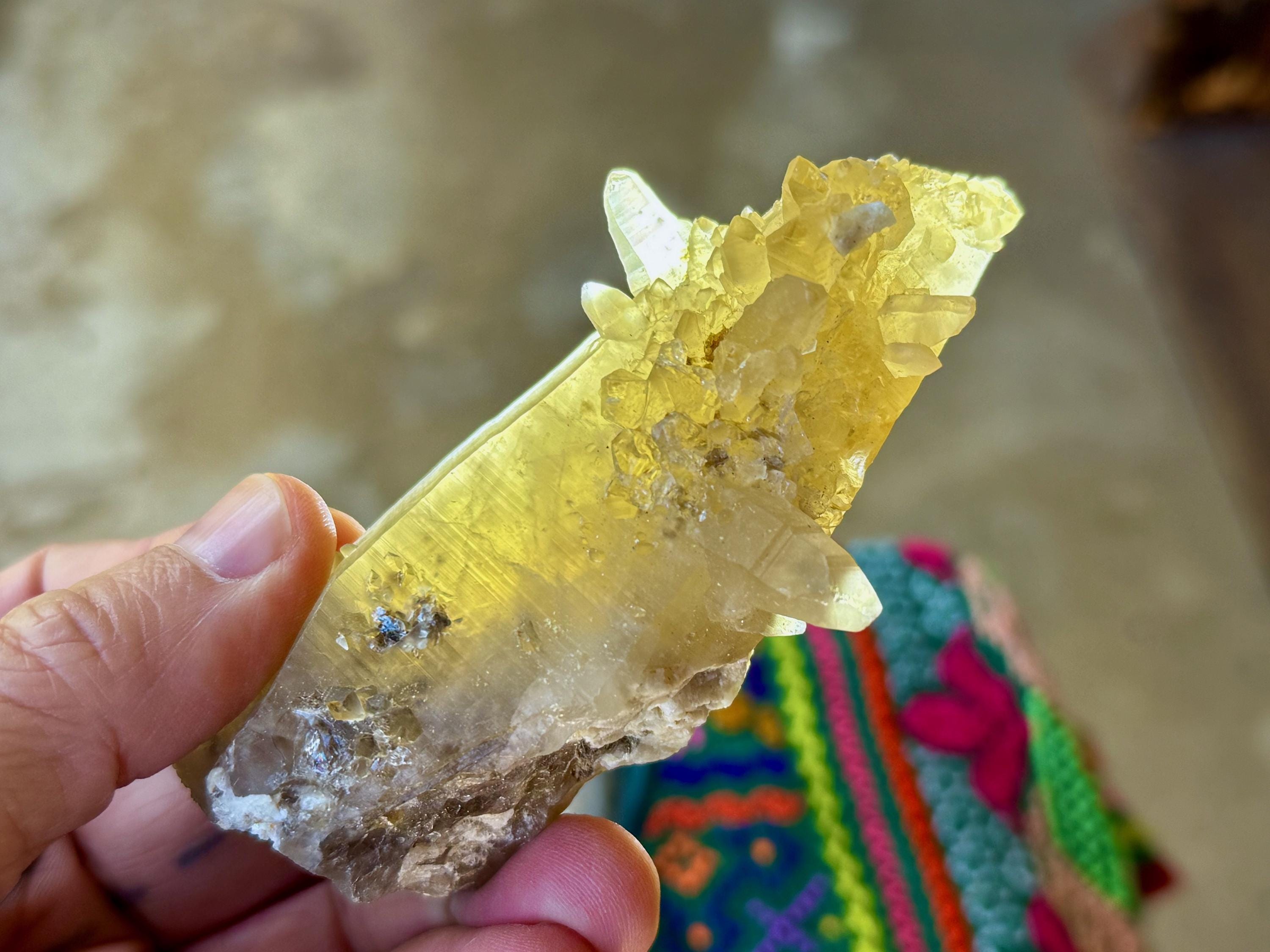 A very unique formation to this natural Citrine crystal with a vibrant yellow-golden color. This crystal possesses an elongated tapered formation, as is characteristic of the crystals from this locale. However, this crystal also features a multitude of smaller "penetrator" crystals growing outward from the primary crystal (see more on this formation below). When backlit, this piece glows brilliantly (Photos 4-6).