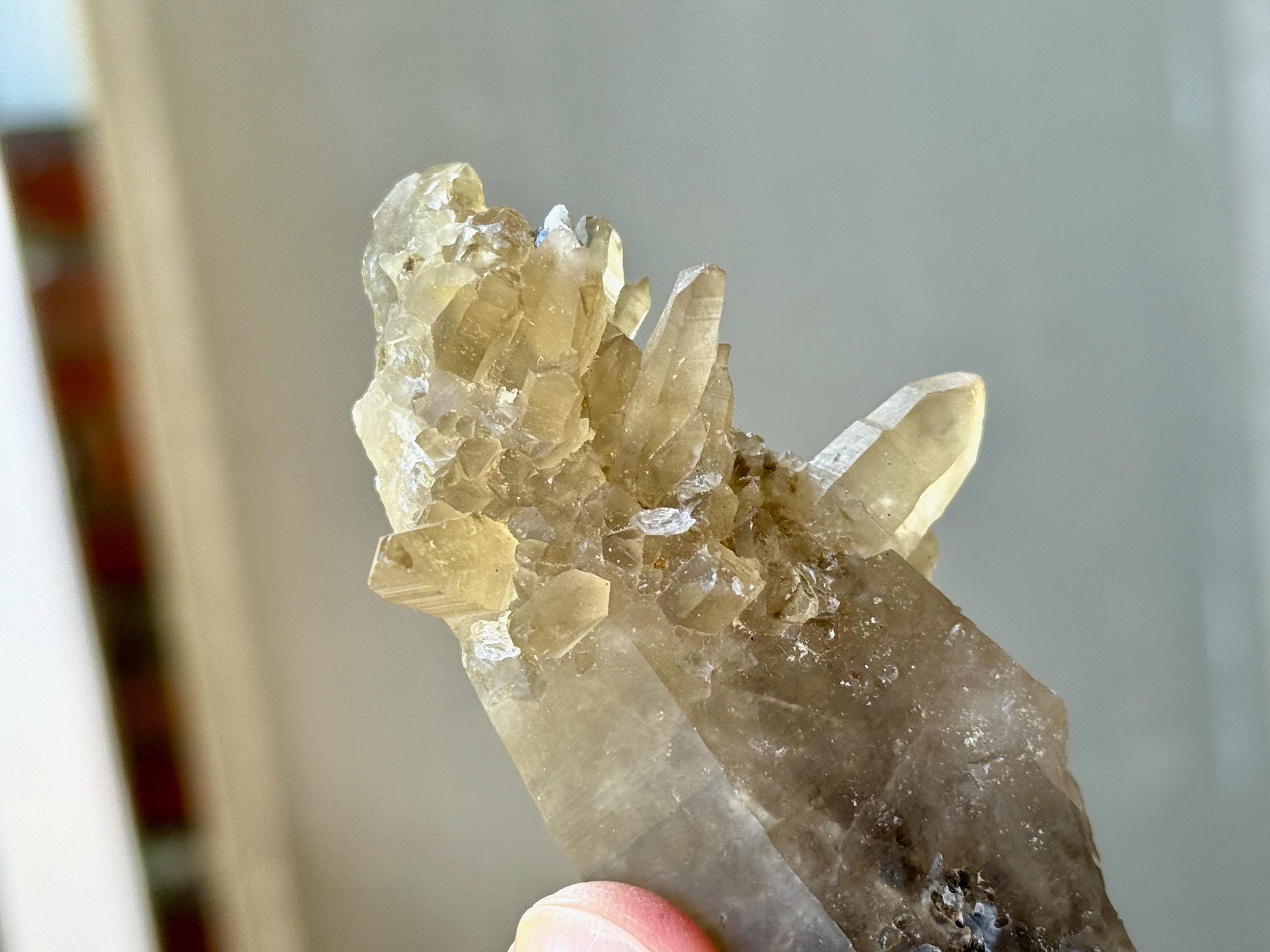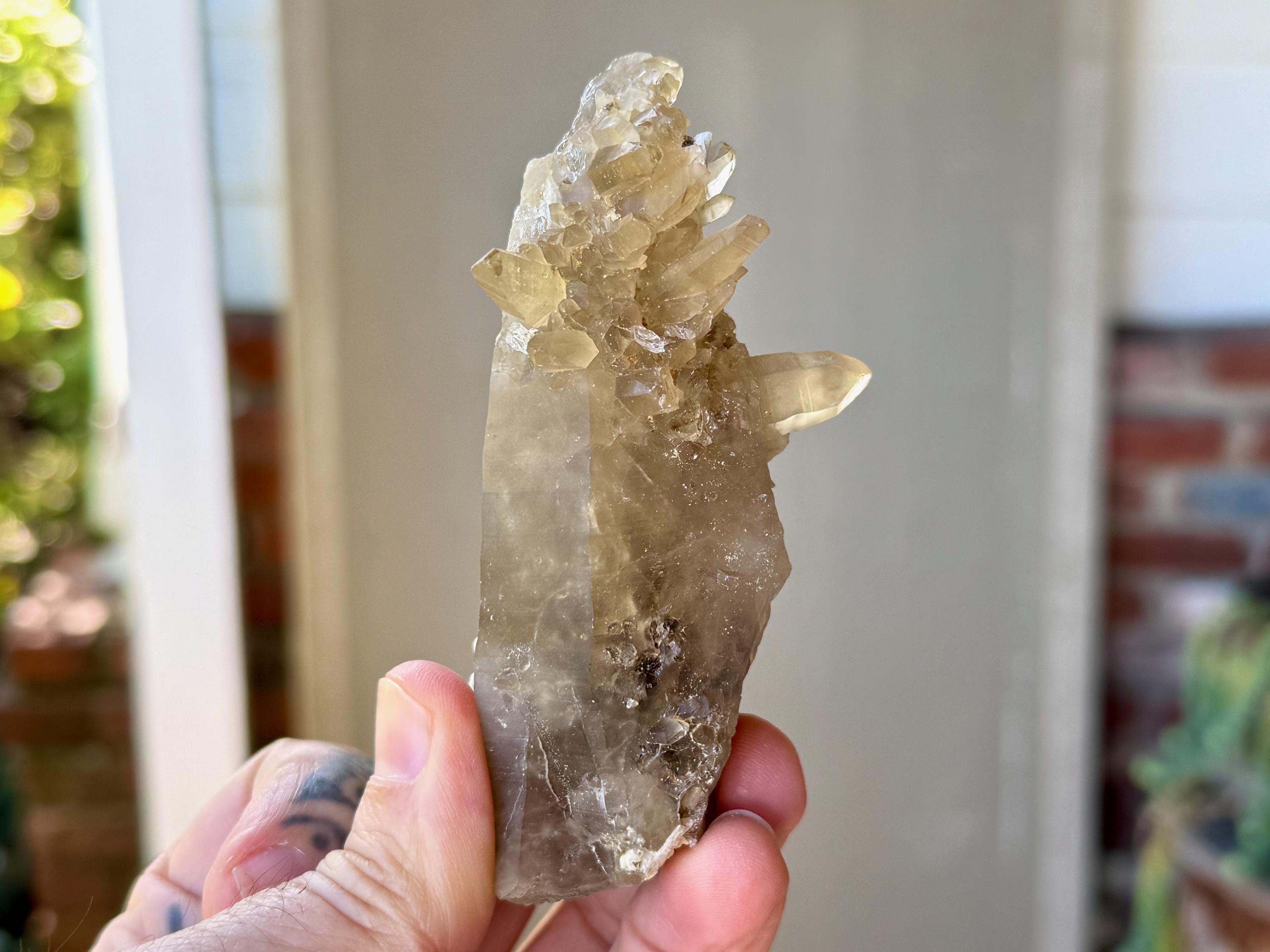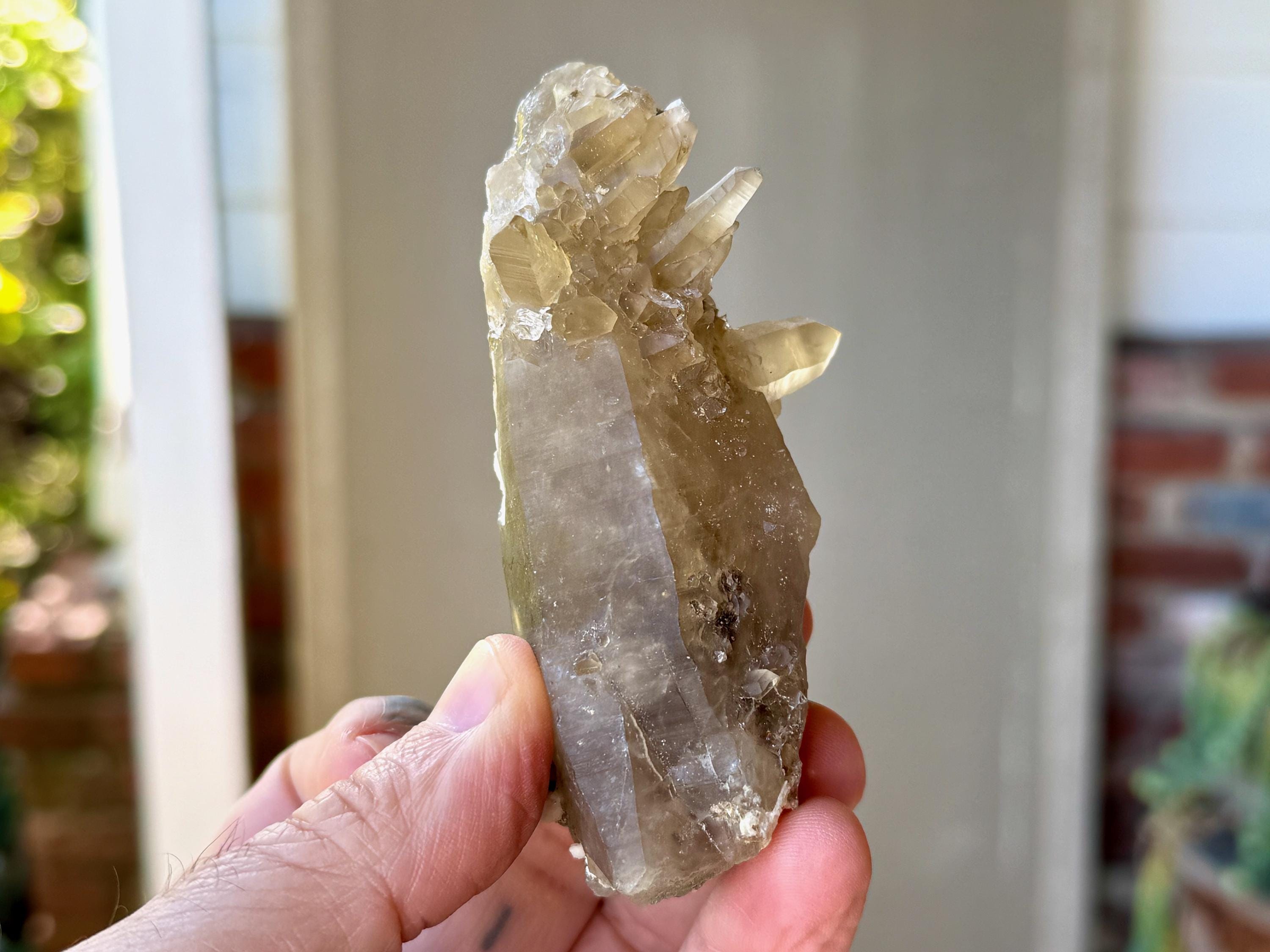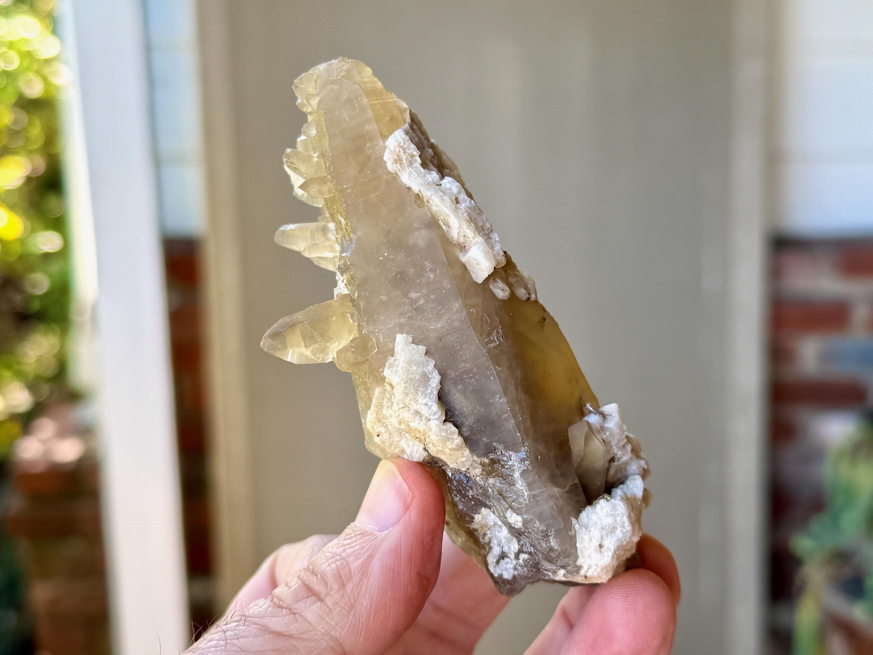 A very unique formation to this natural Citrine crystal with a vibrant yellow-golden color. This crystal possesses an elongated tapered formation, as is characteristic of the crystals from this locale. However, this crystal also features a multitude of smaller "penetrator" crystals growing outward from the primary crystal (see more on this formation below). When backlit, this piece glows brilliantly (Photos 4-6).