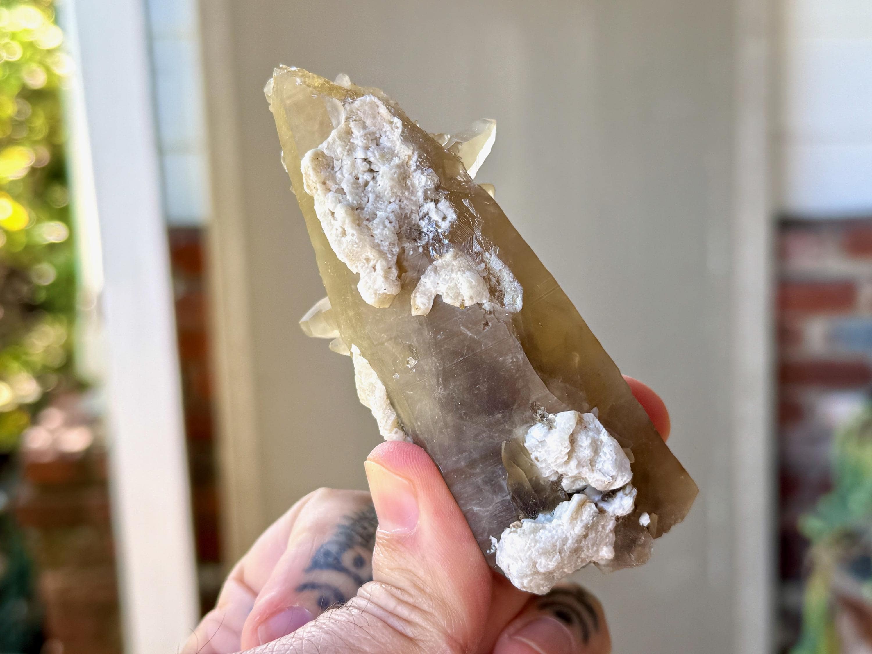 Throughout this crystal we see white inclusions that may be either Albite, Feldspar or White Mica. The termination is natural and self-healed.