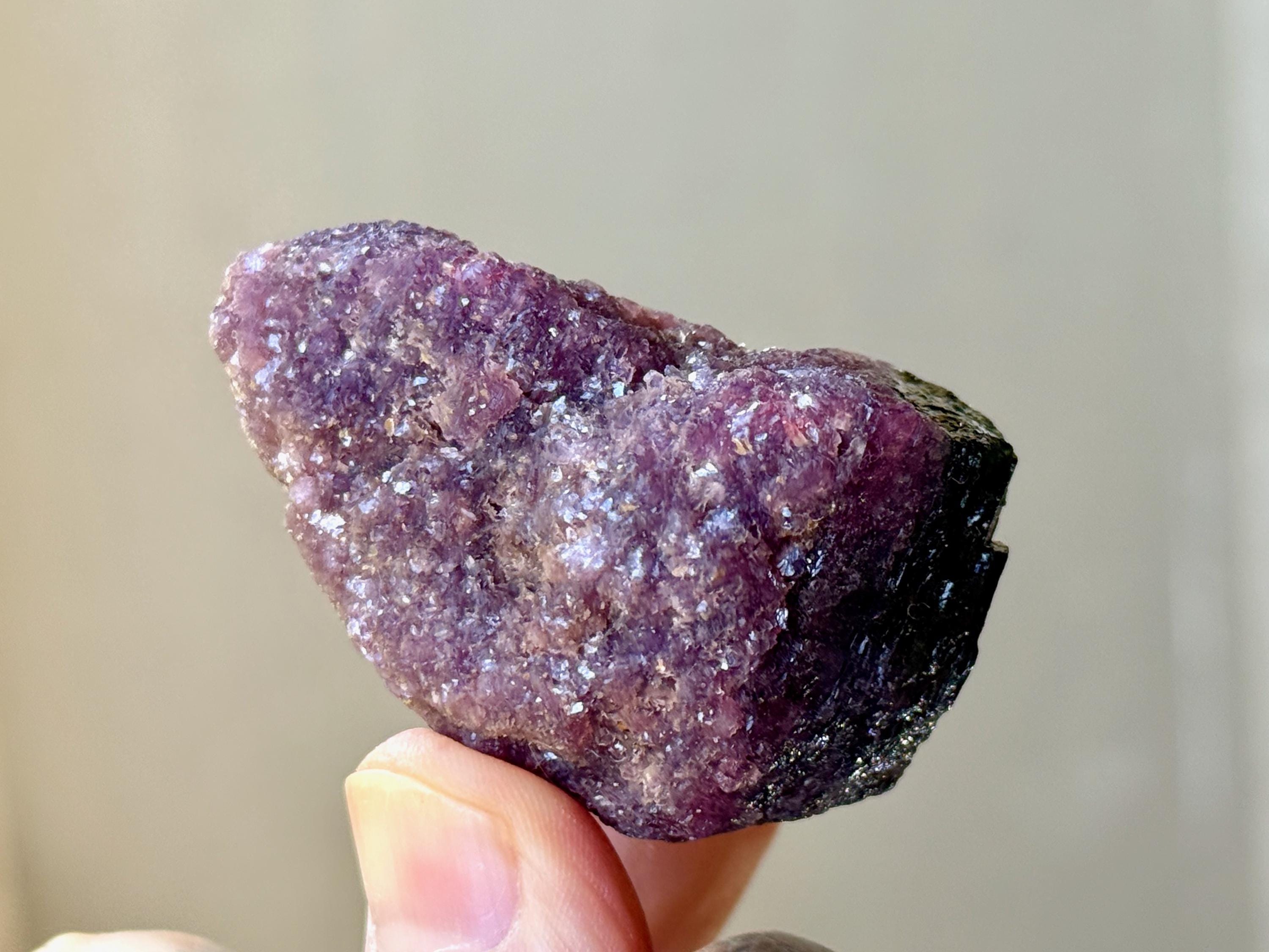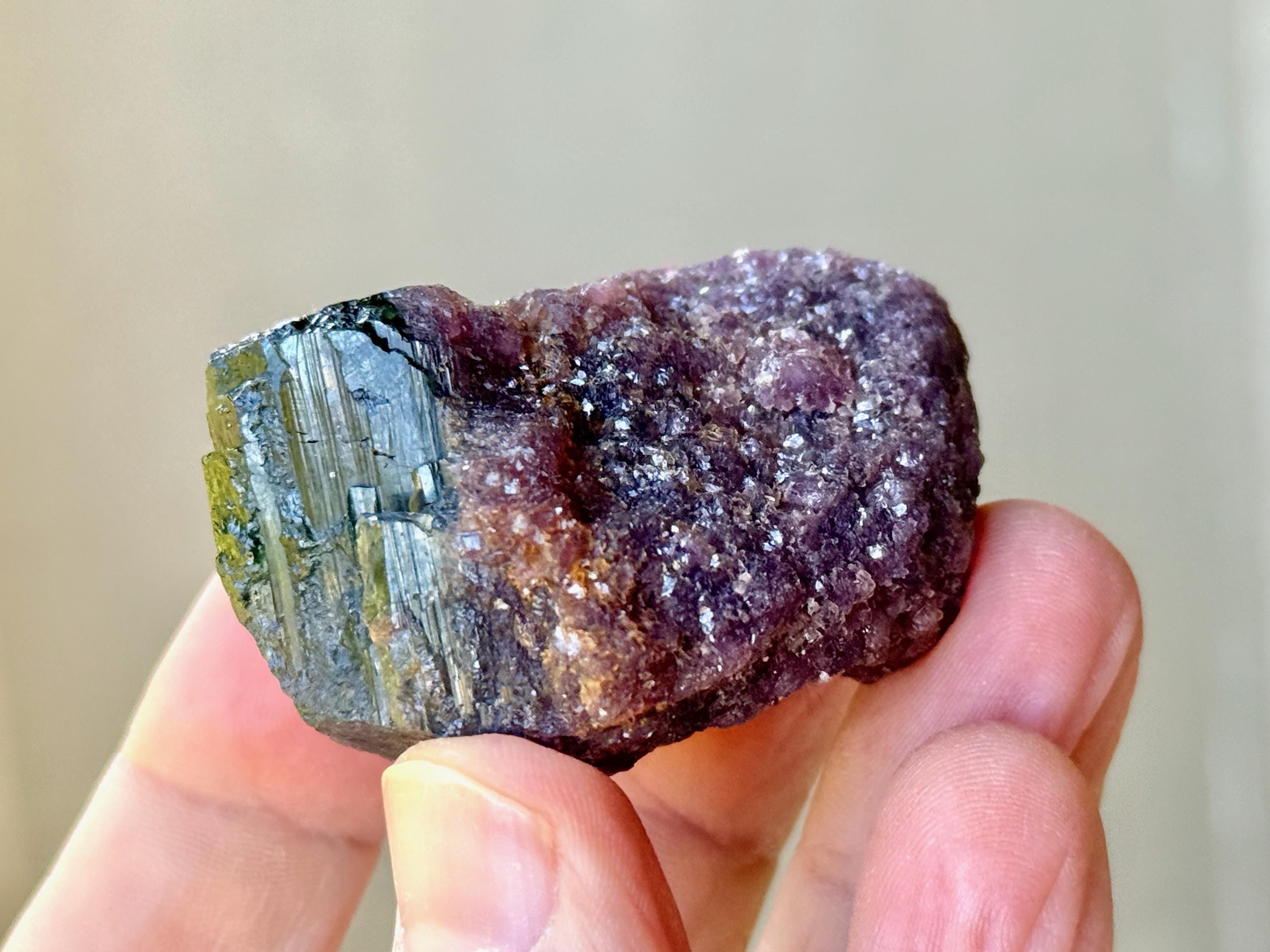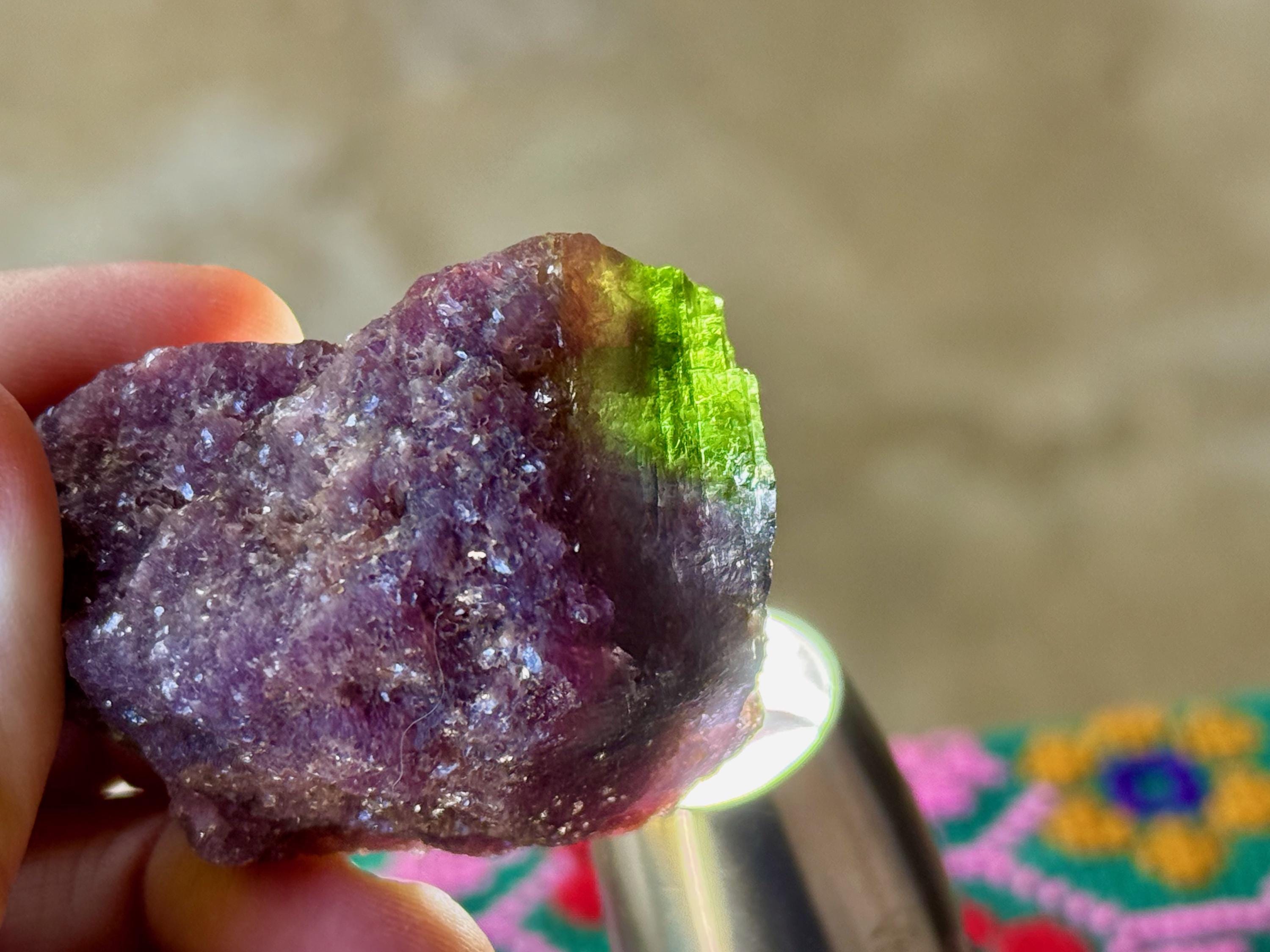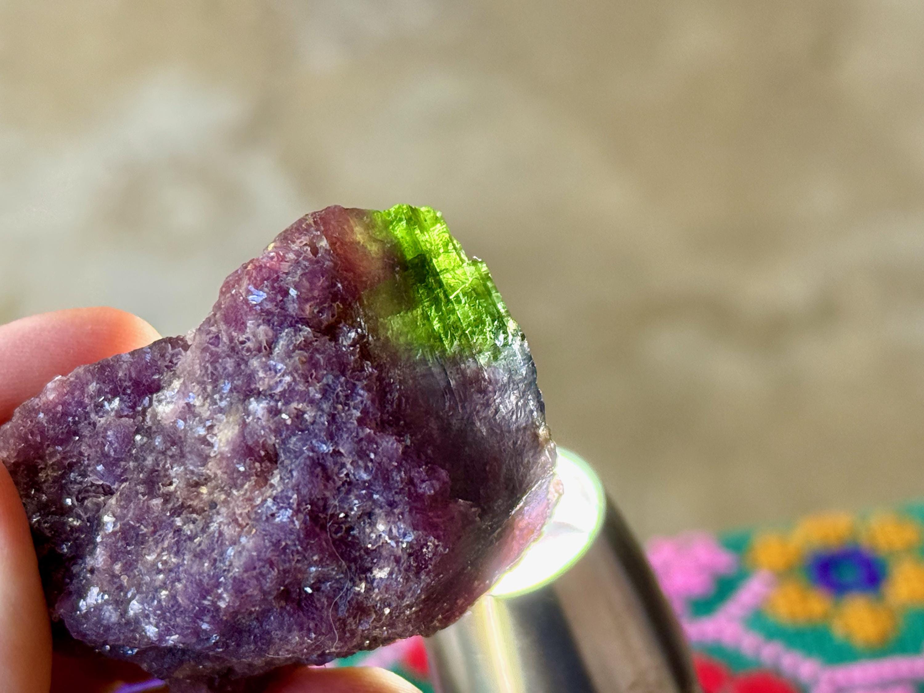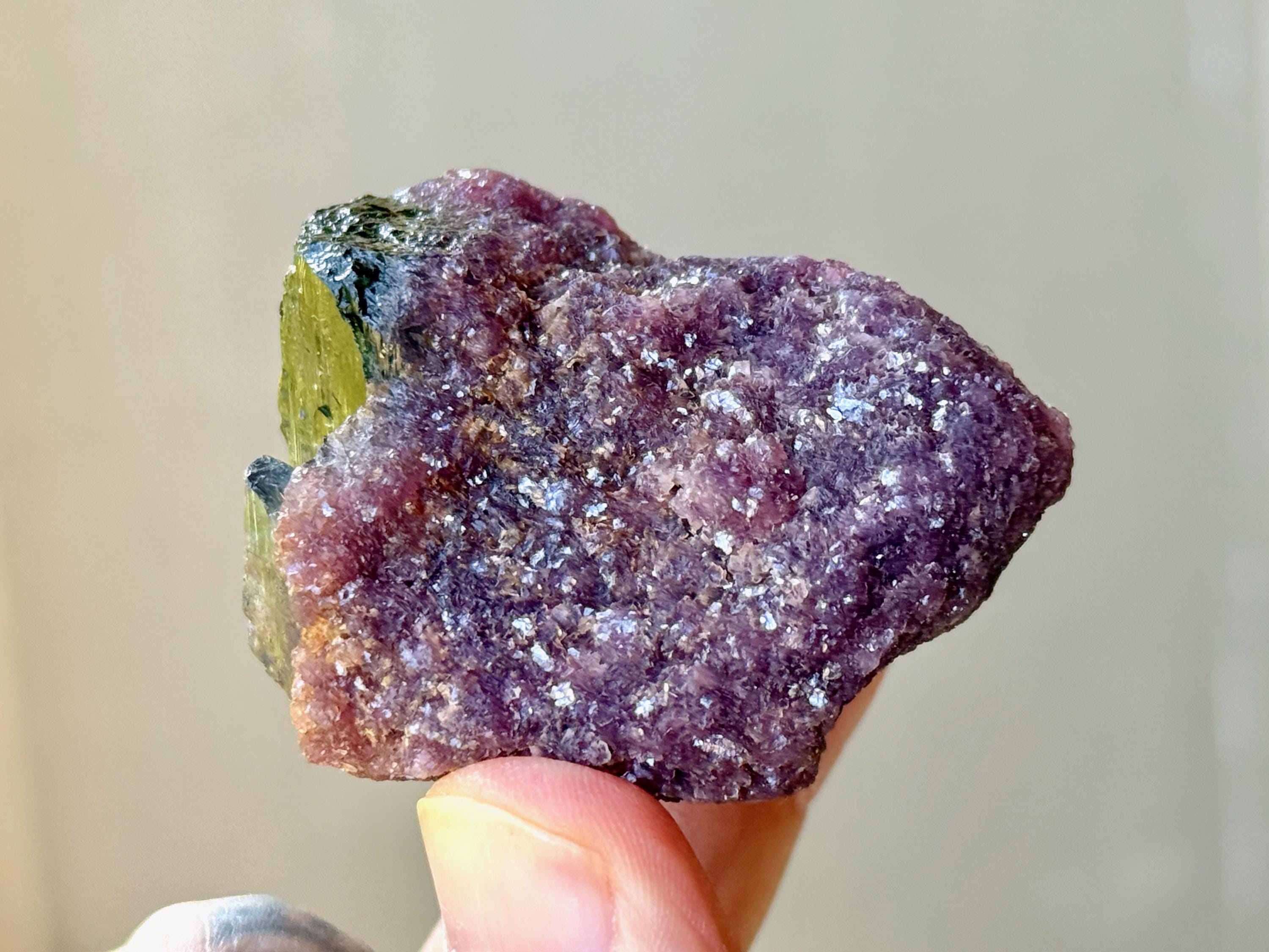 A vibrant array of colors to this sparkling Purple Lepidolite crystal with a large inclusion of gemmy Green Tourmaline embedded within. The crystallized Mica really does make this piece sparkle quite a bit!
