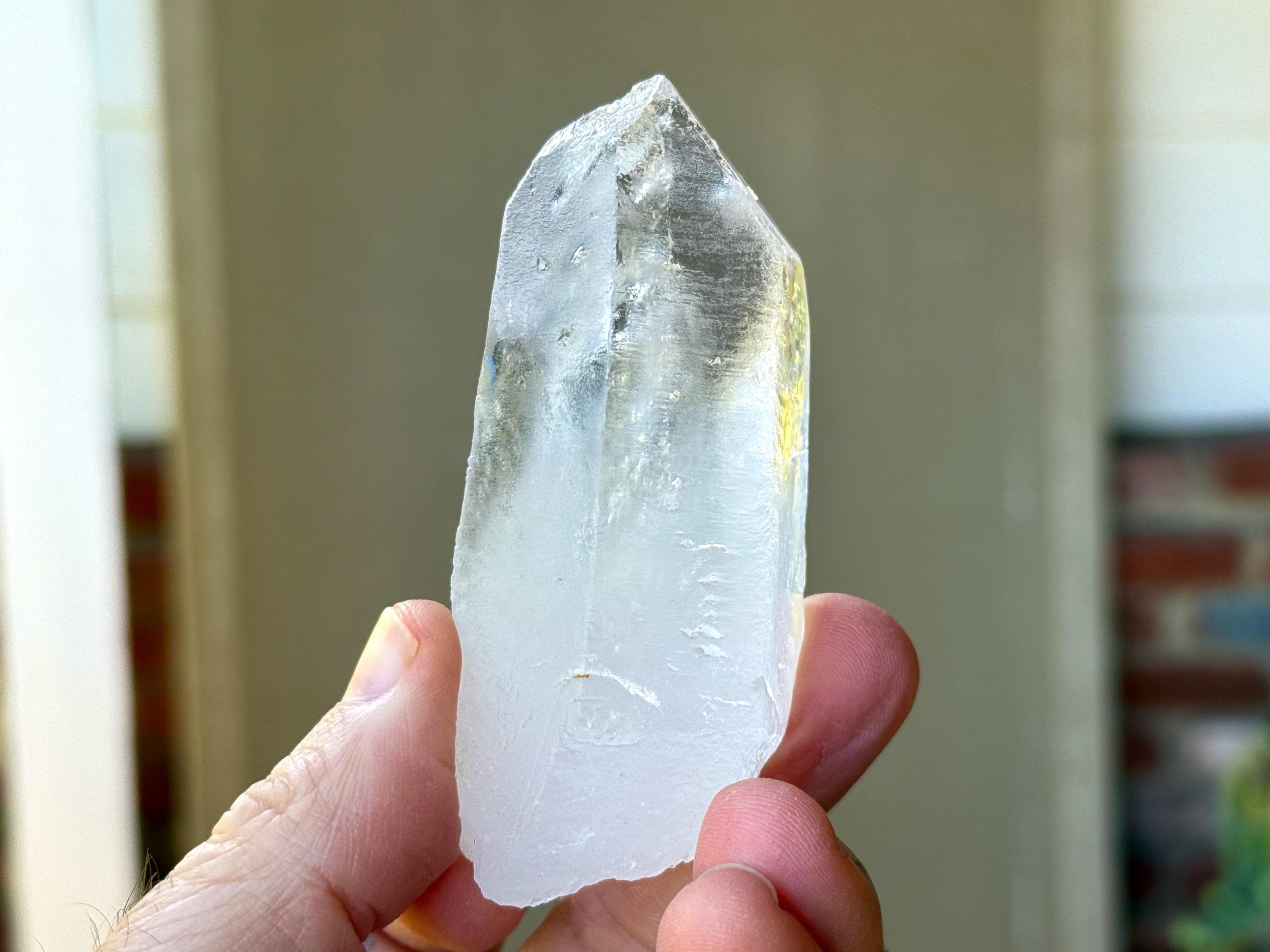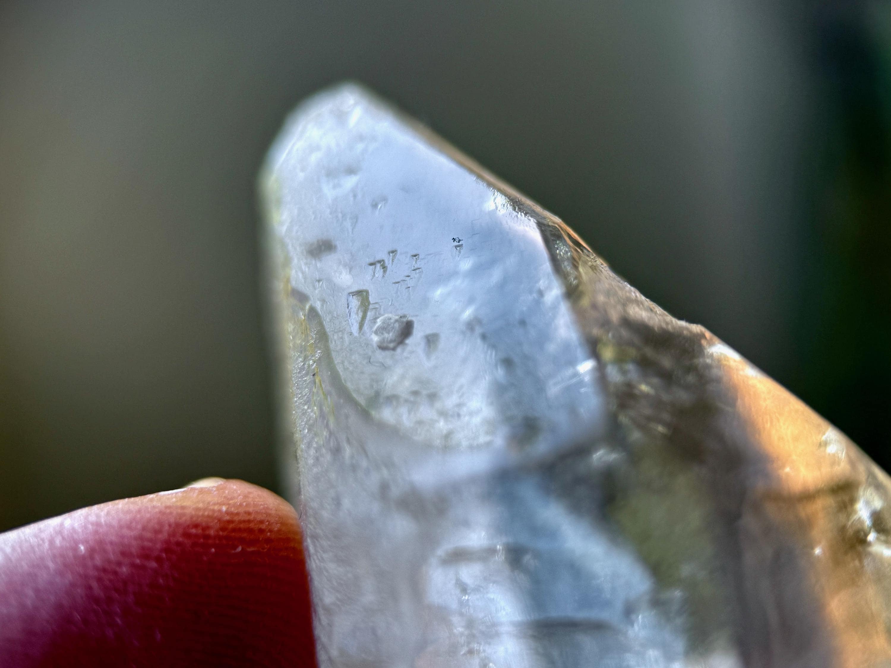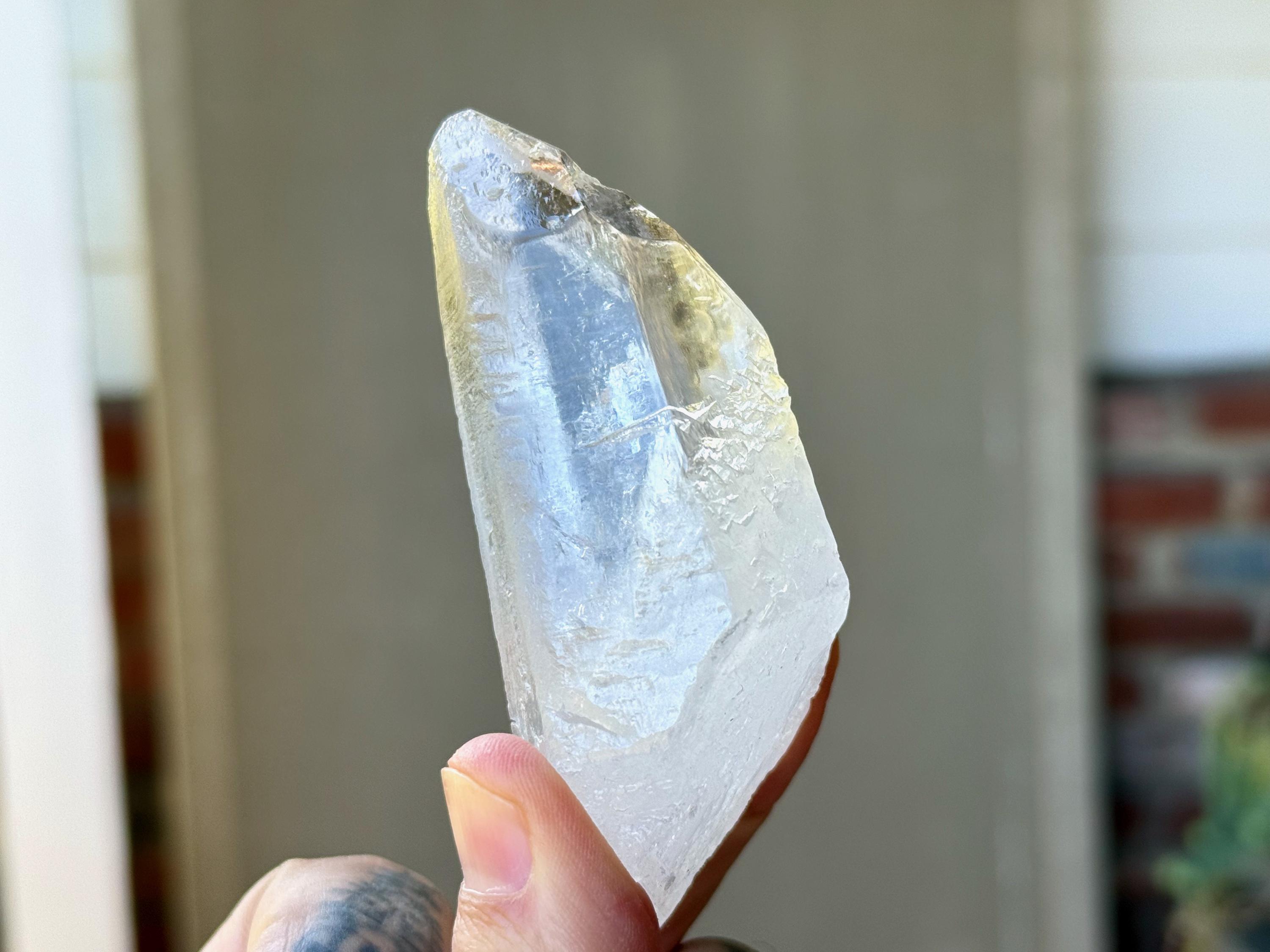 Superb clarity and an ethereal, icy complexion to this Trigonic Dissolution Quartz crystal. This crystal features an array of etched and feathered textures on its left side, as well as some slightly rounded edges on the body, a result of the hydrothermal conditions where it grew in the earth. There's a natural contact "key" imprint on the lower part of the front.