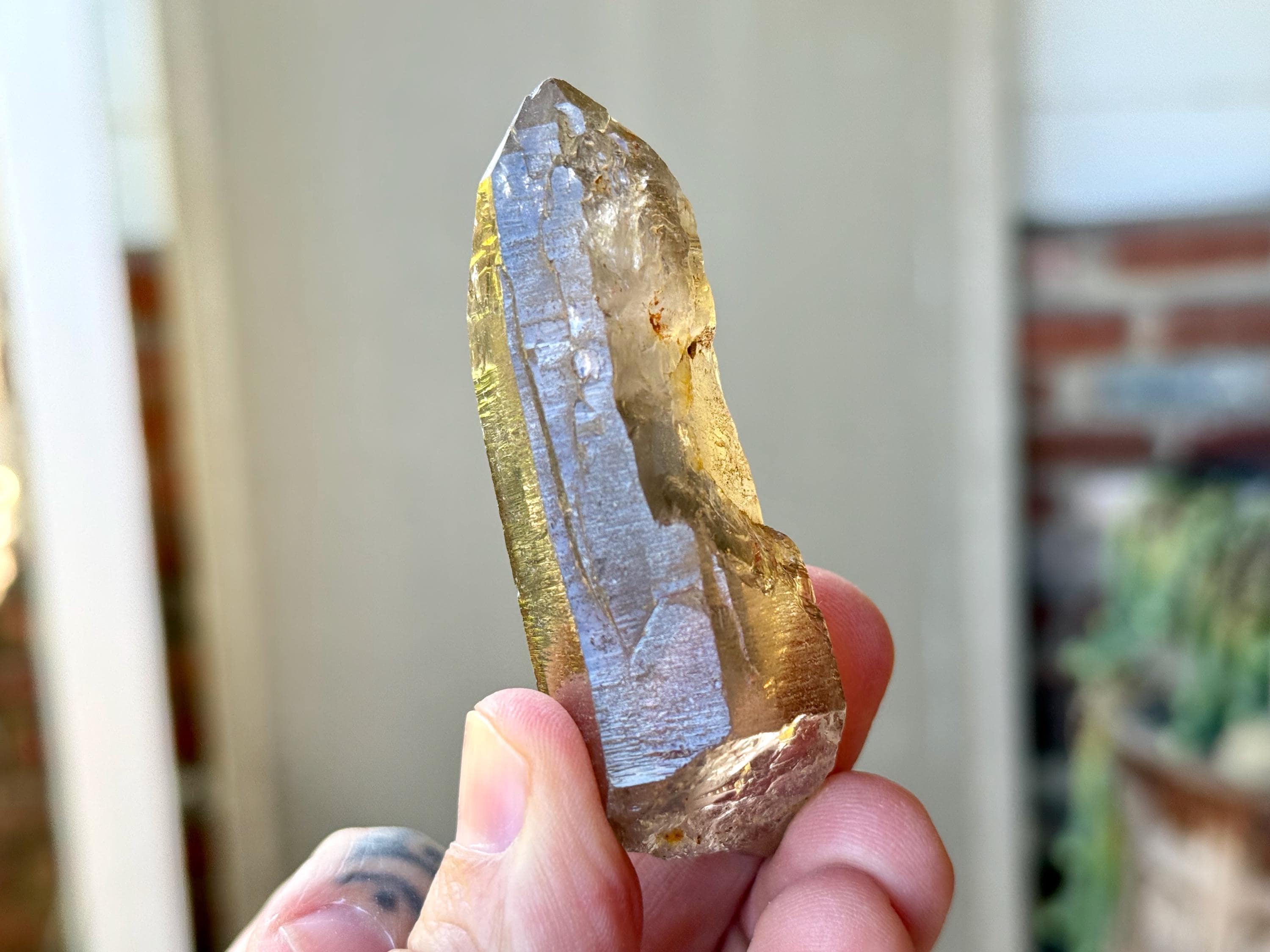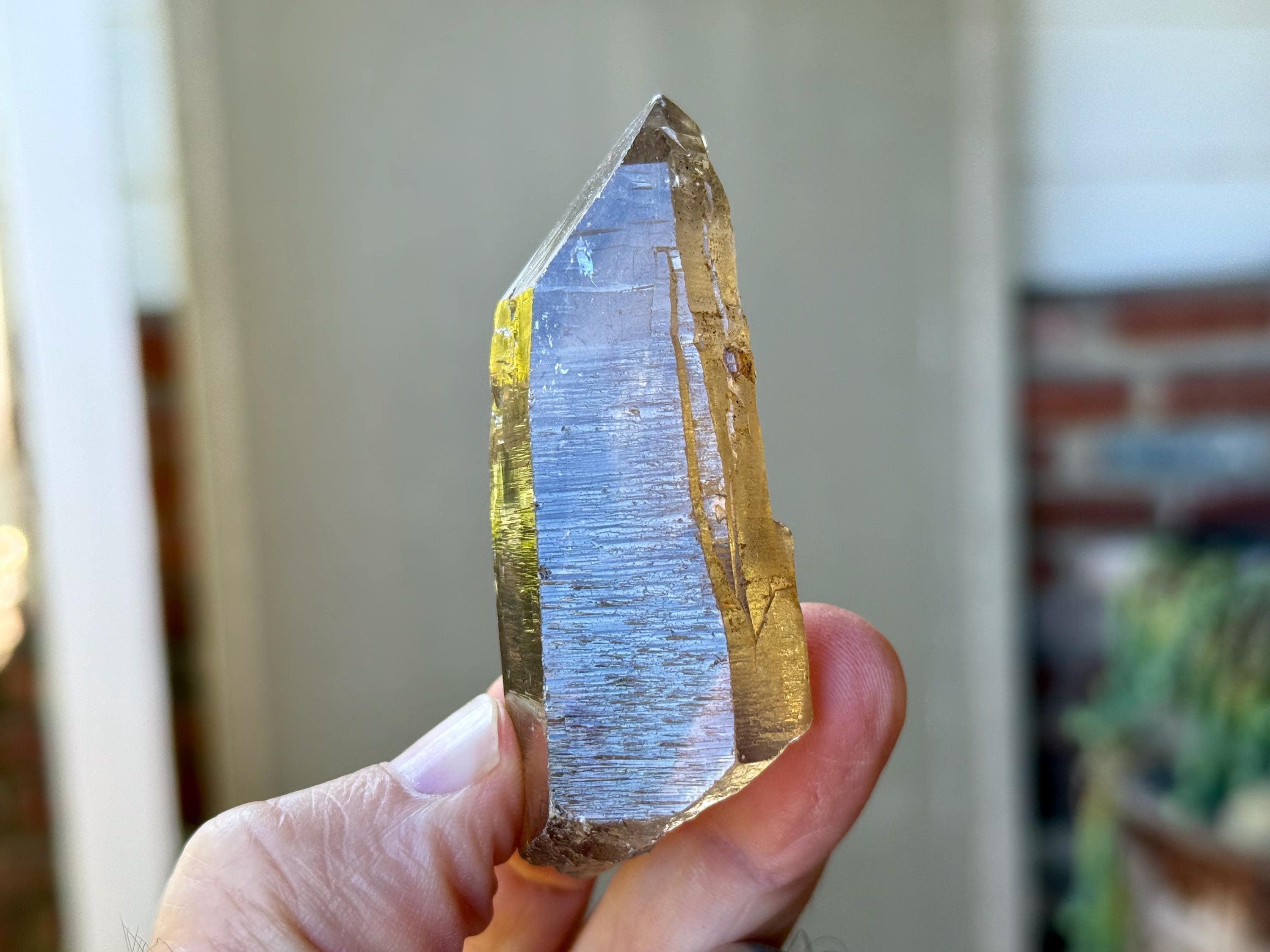 One of the nicest quality pieces from this collection, this is a gorgeous Cathedral Quartz with exquisite clarity and a mild smoky hue with tinges of gold. The luster is phenomenal! This piece has magnificent "barcode" cathedral textures on its sides. There's a large contact imprint on the backside that has some mild chips surrounding it. However the main facet and termination are excellent.