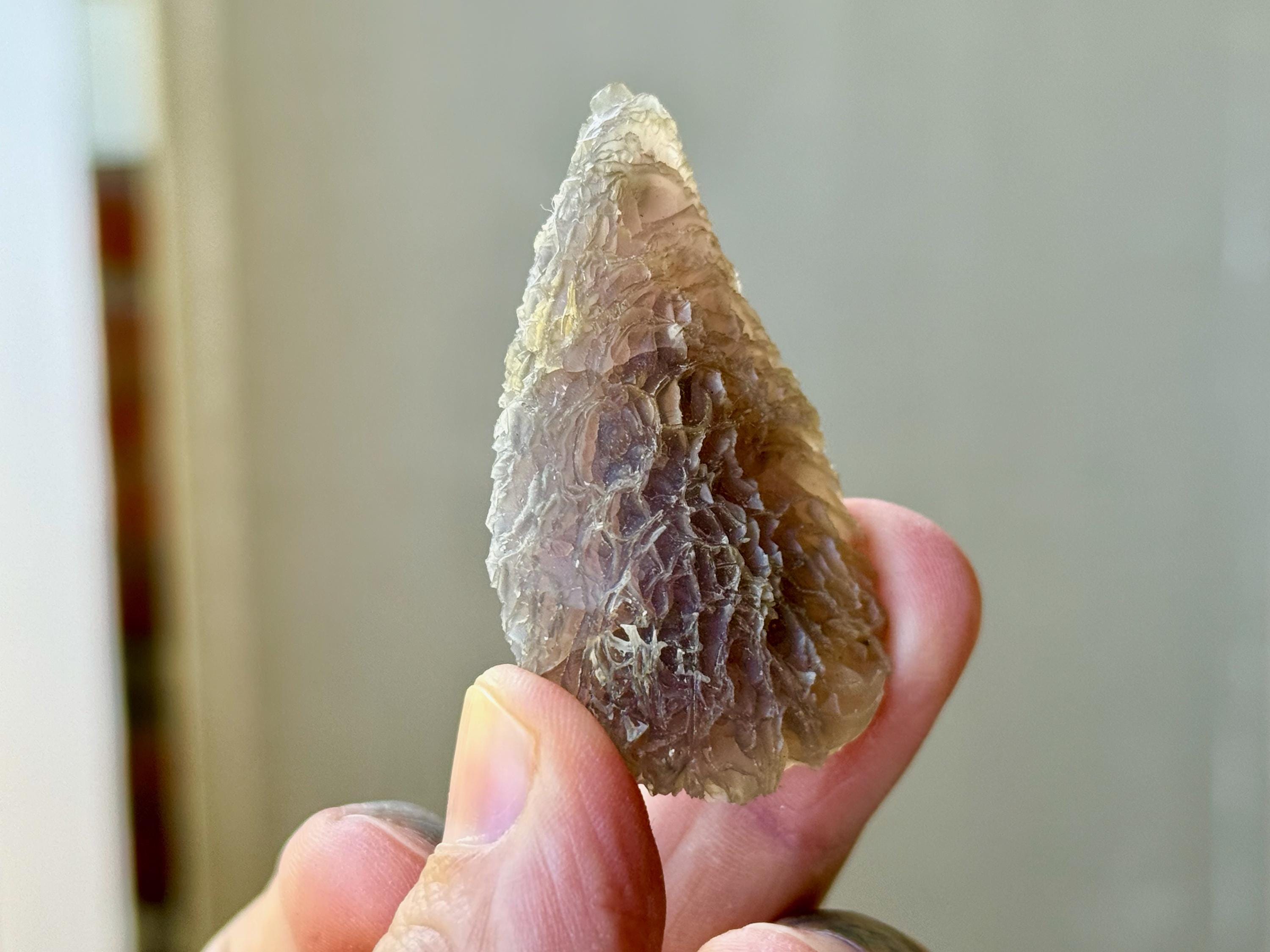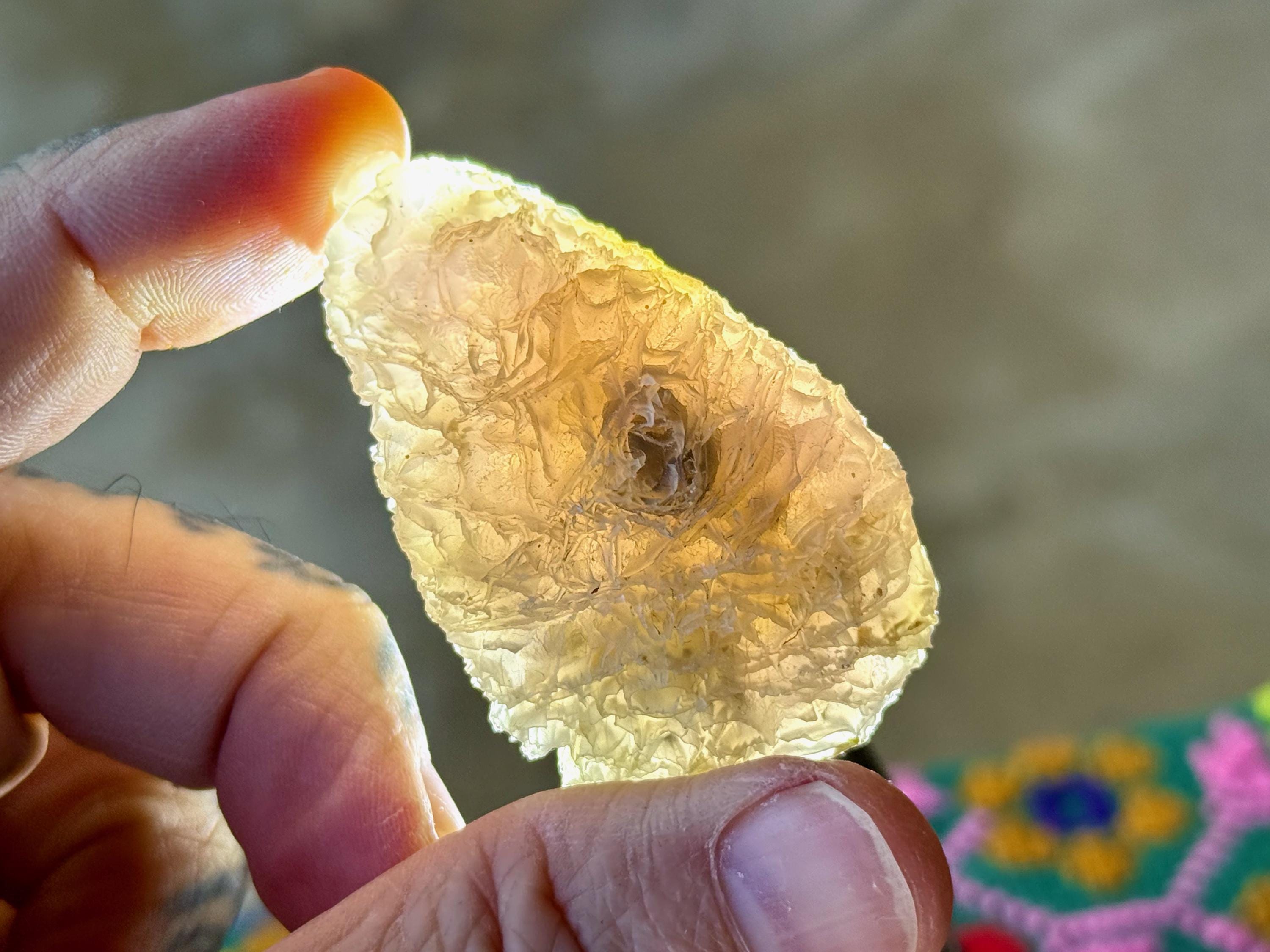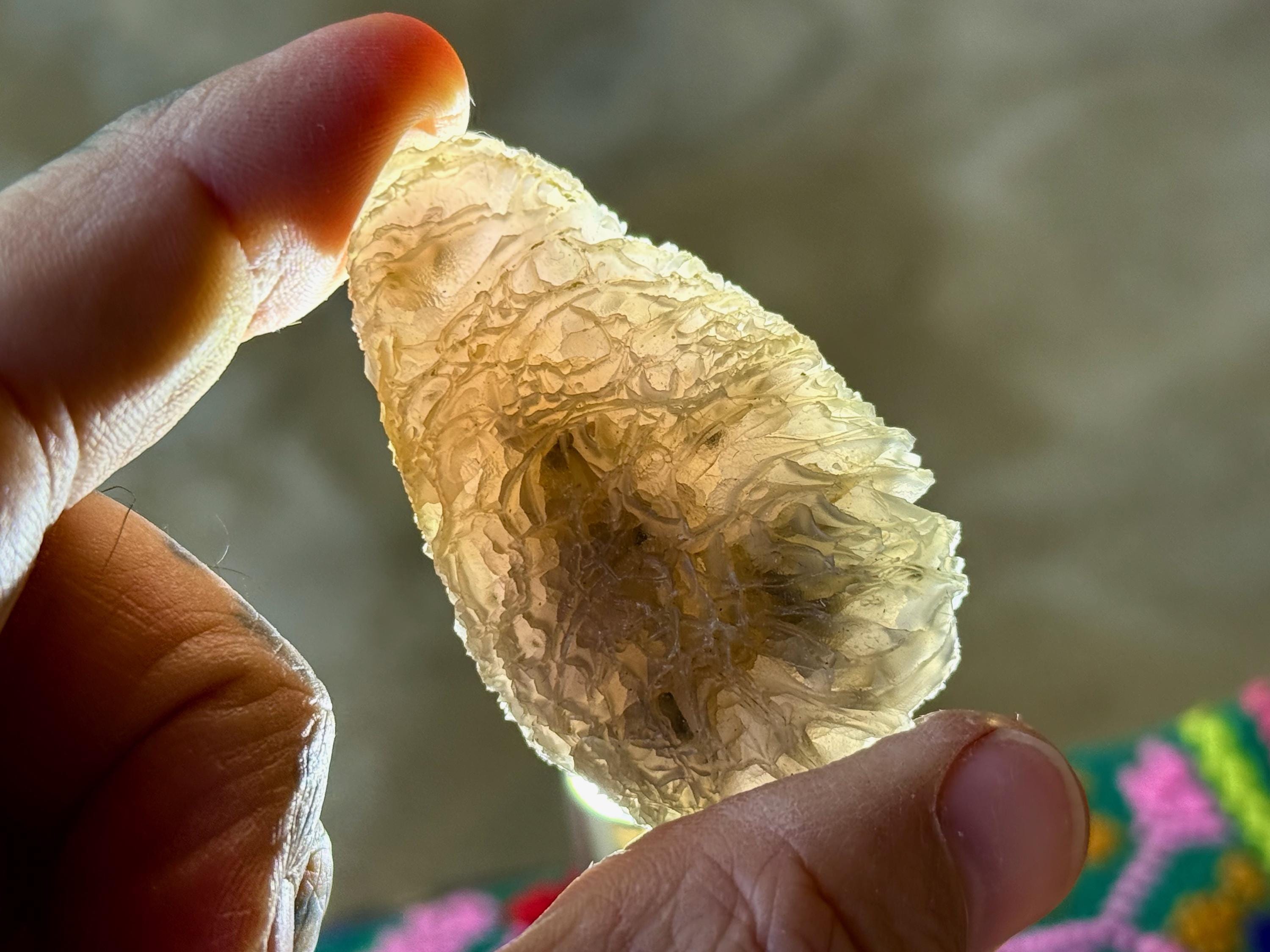 In natural light, this stone has a smoky grayish-gold color with intricate patterning throughout. When backlit, this stone lights up brilliantly! (Photos 2-3, 5-6). Outstanding!