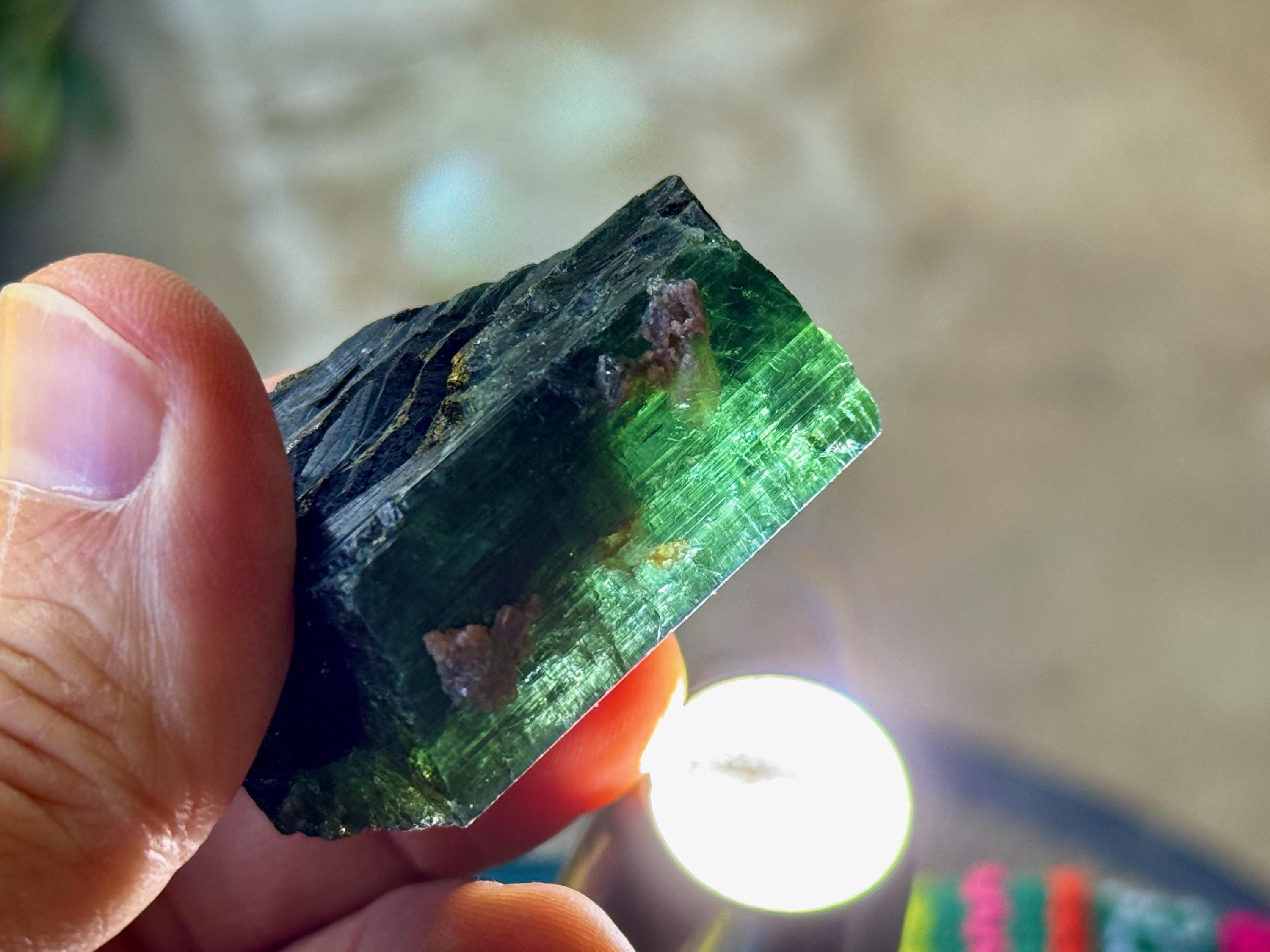 Green Tourmaline purifies and strengthens, allowing one to energetically carry greater amounts of Life Force (Prana Energy). As more energy is carried within the physical body, higher degrees of consciousness can be maintained. It is a wonderful protection stone, deal for sealing holes in the aura that leave one vulnerable to negativity.