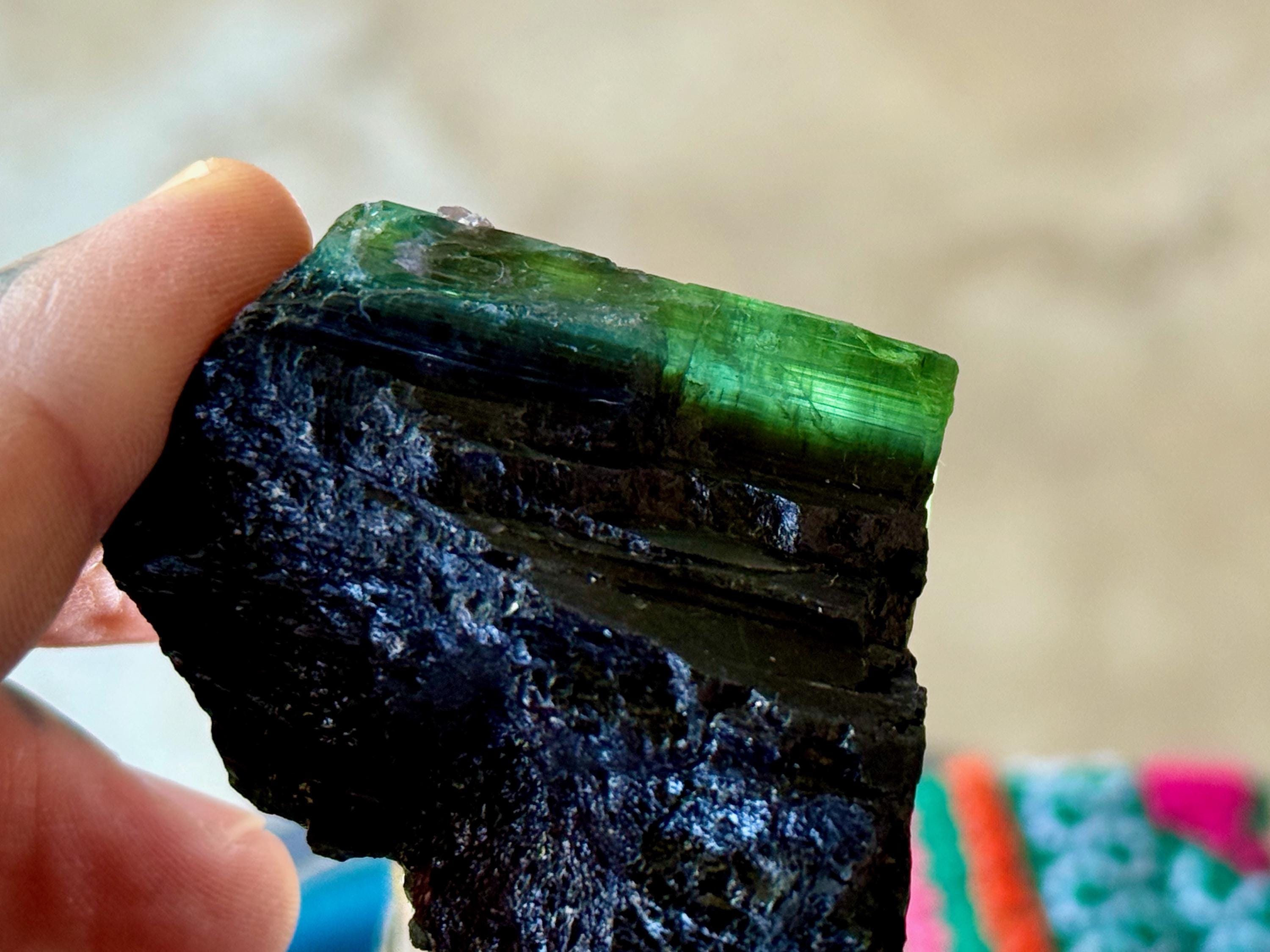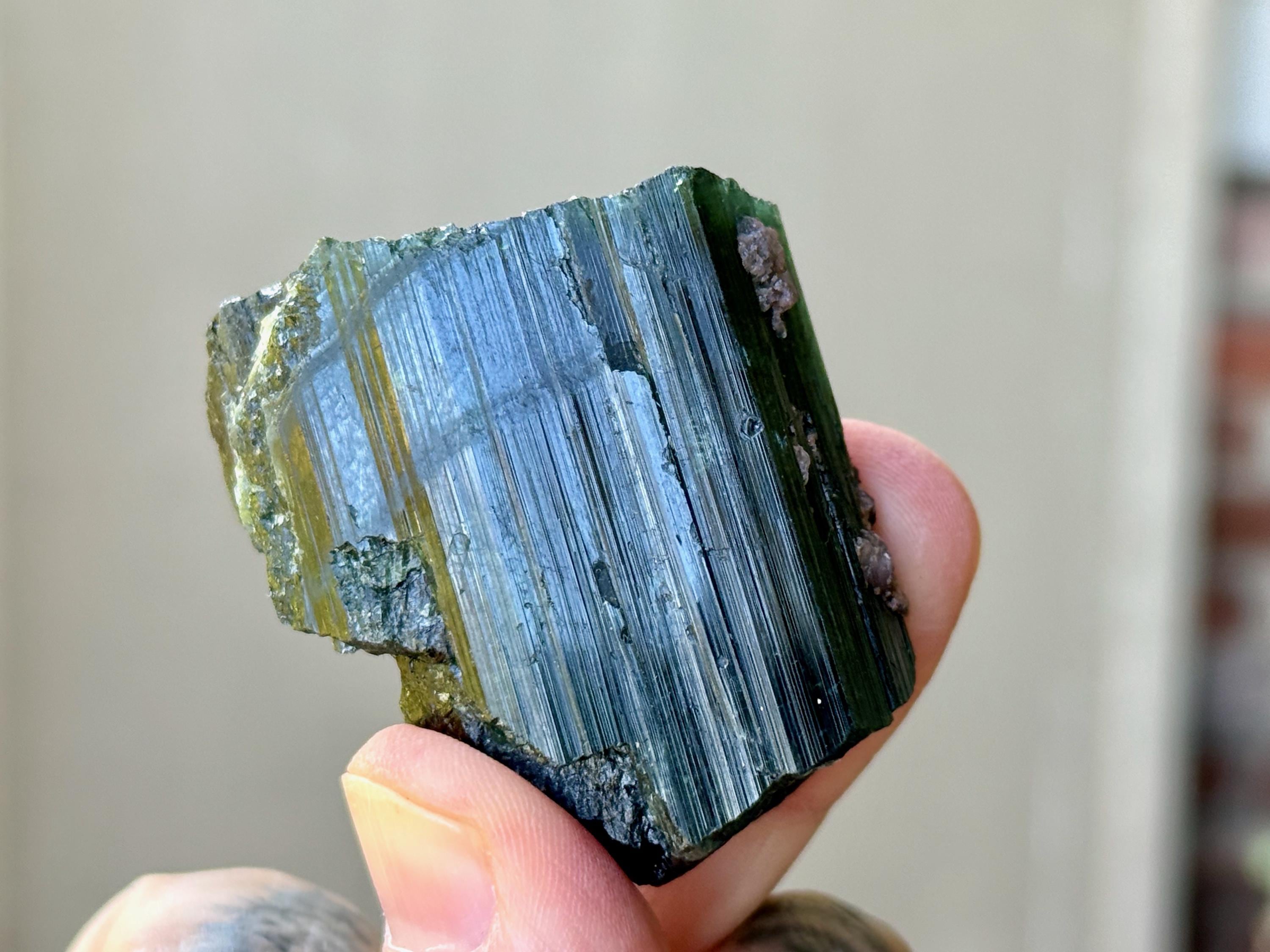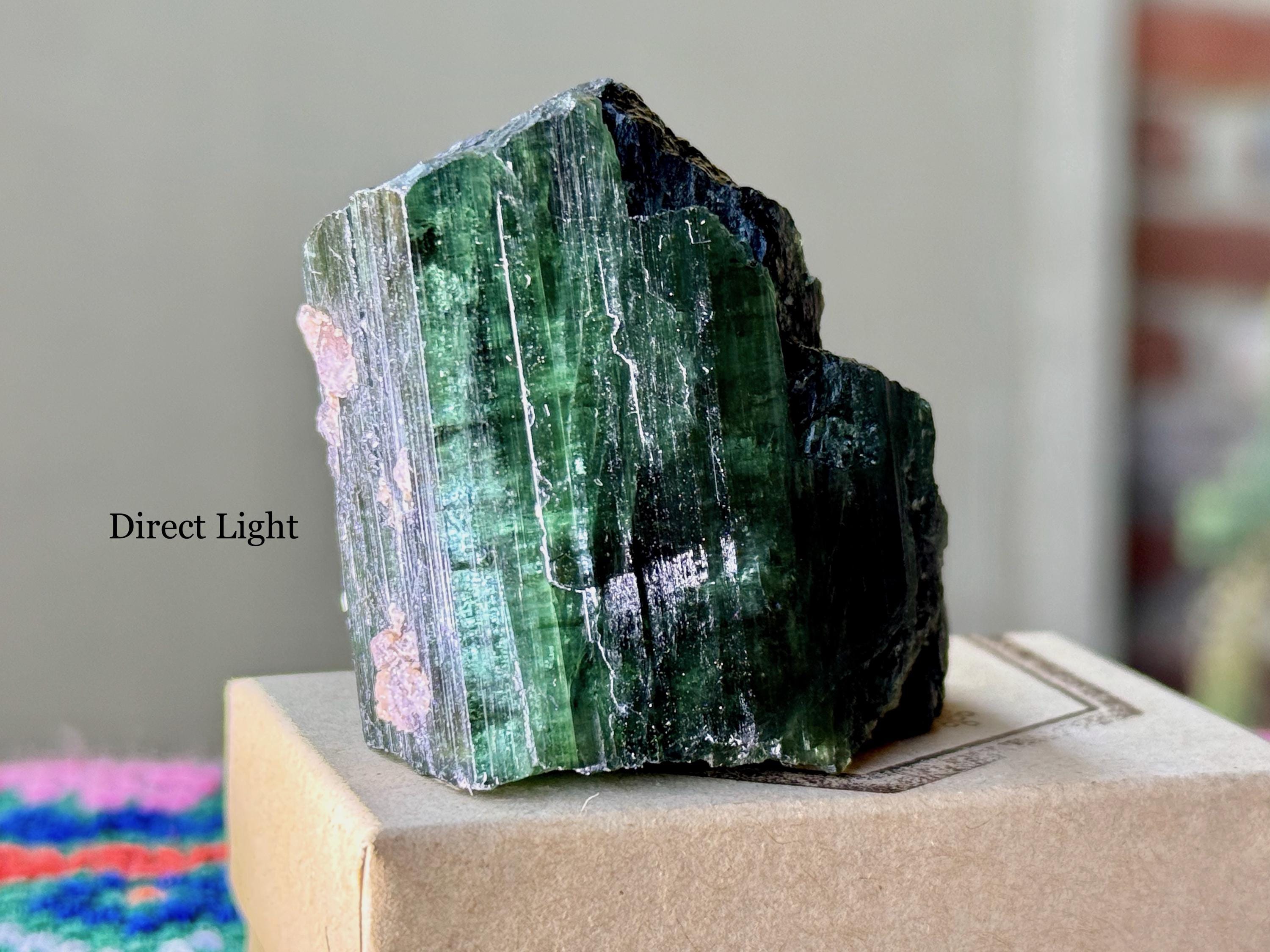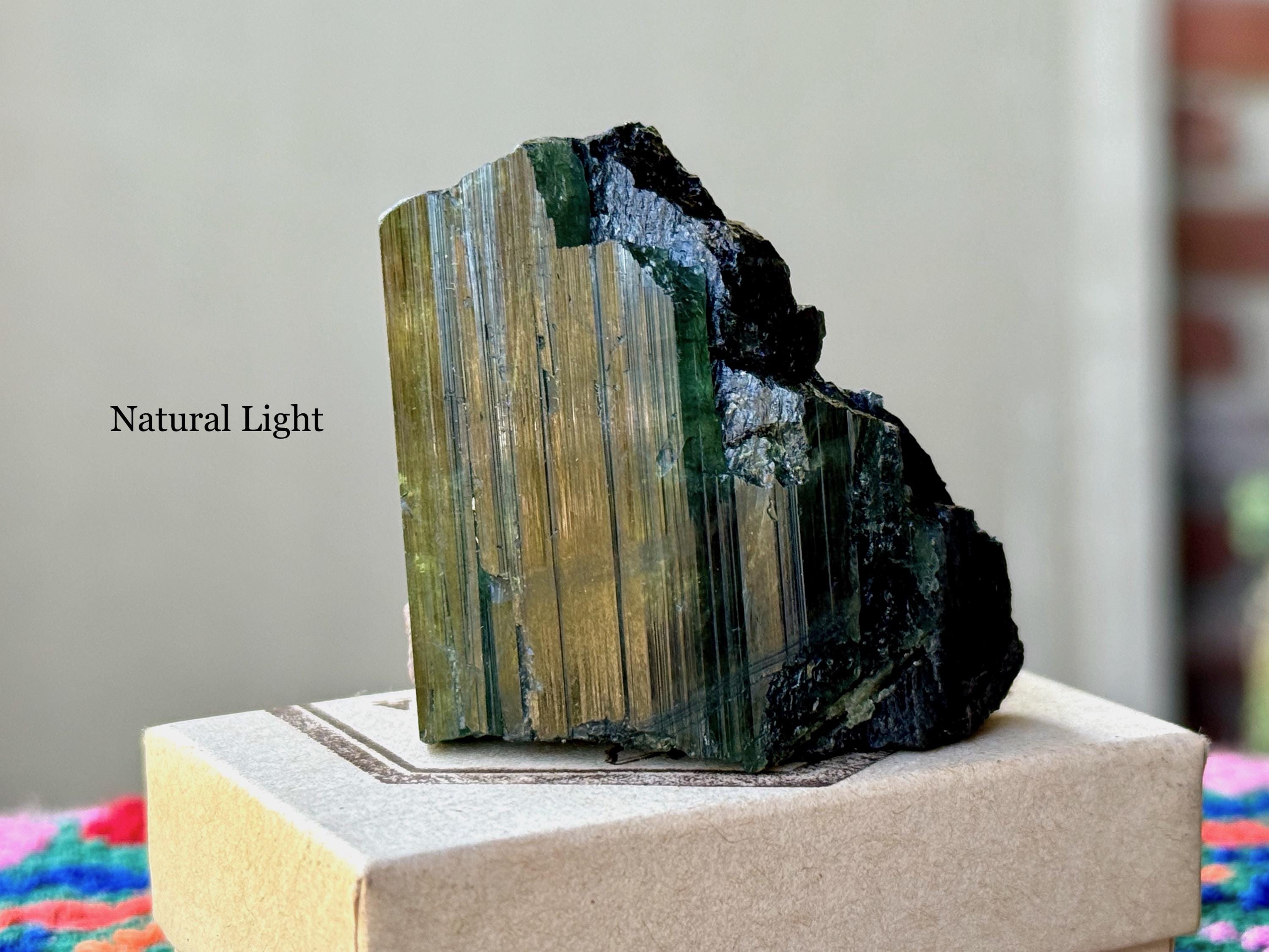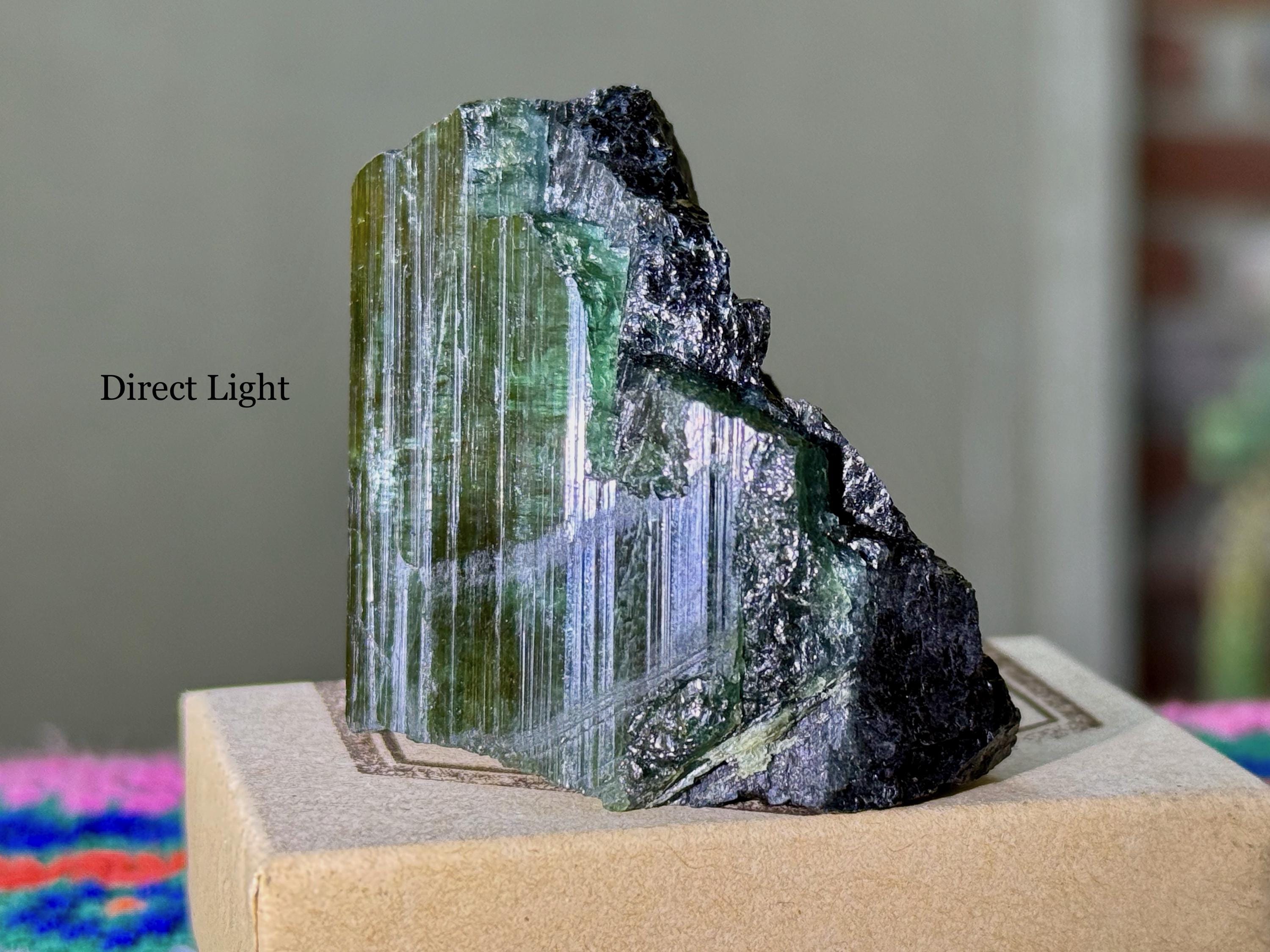 In natural light, this crystal appears to black, with just hints of green throughout. However, when backlit around one side, it displays sublime translucency and bright blue-green color (Photos 1, 5-7 -- the blues are more present in person). And when directly lit at the right angle, this also brings out its marvelous green color (Photos 3-4).