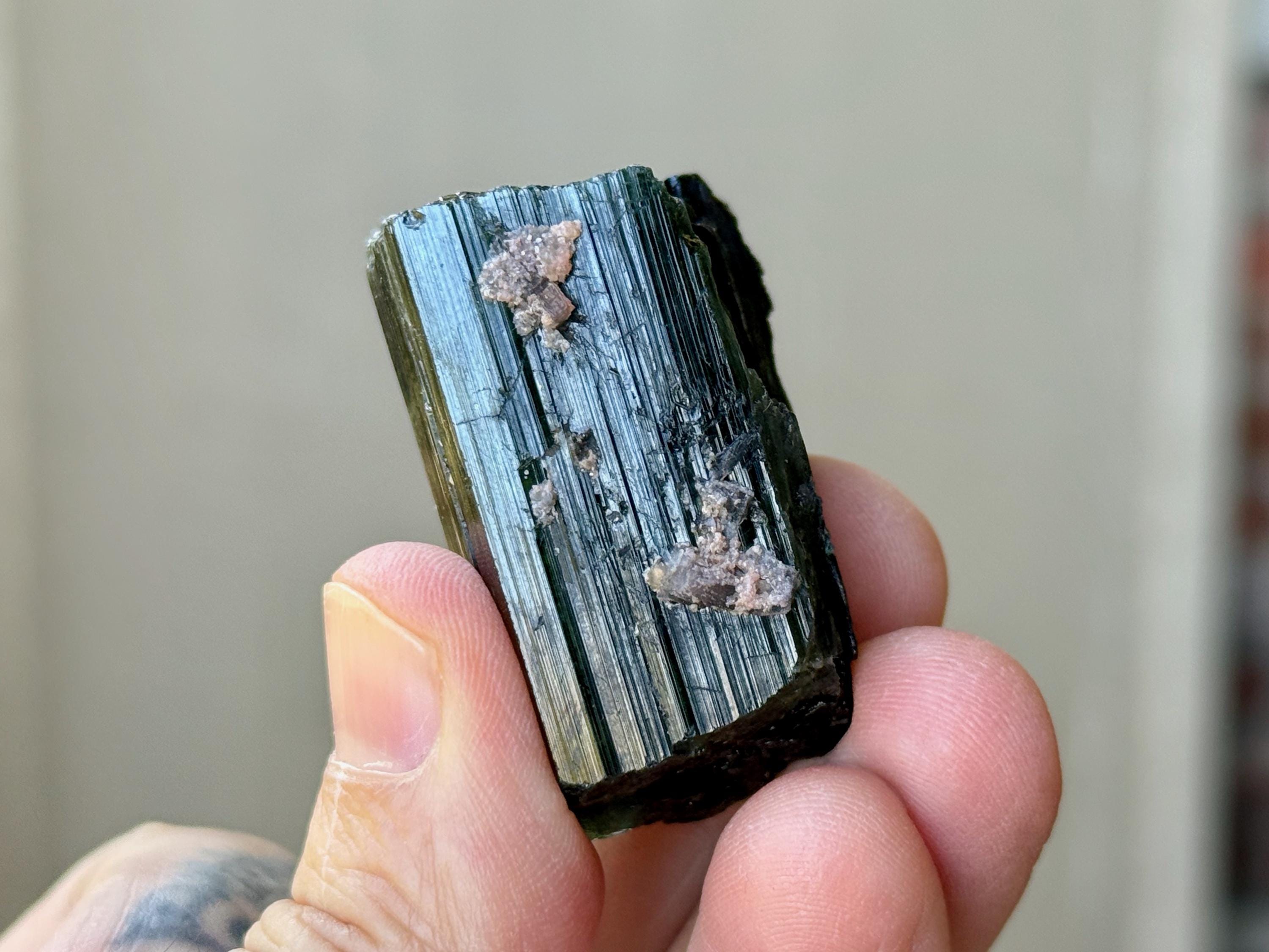 Dark elegance to this large and lustrous Green Tourmaline crystal!